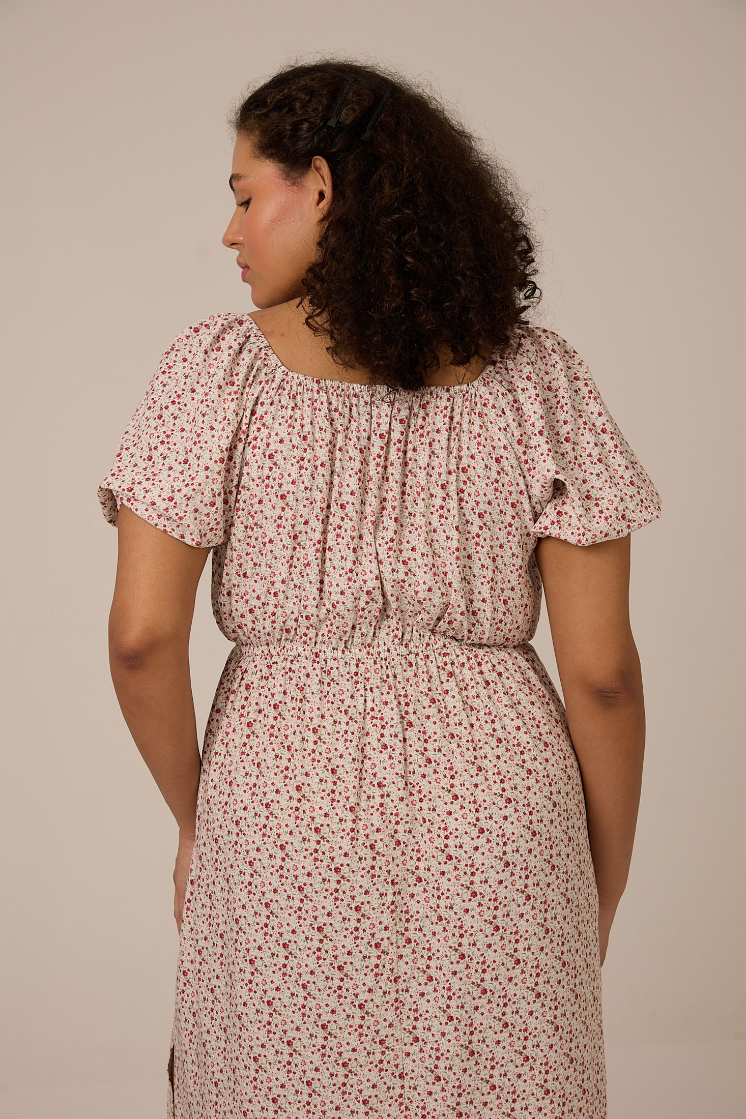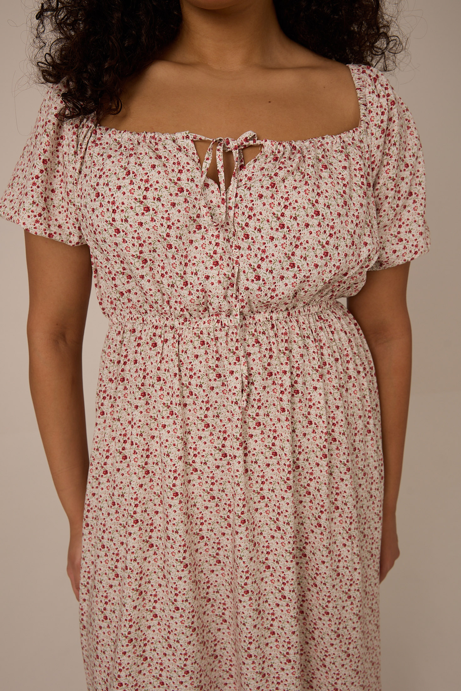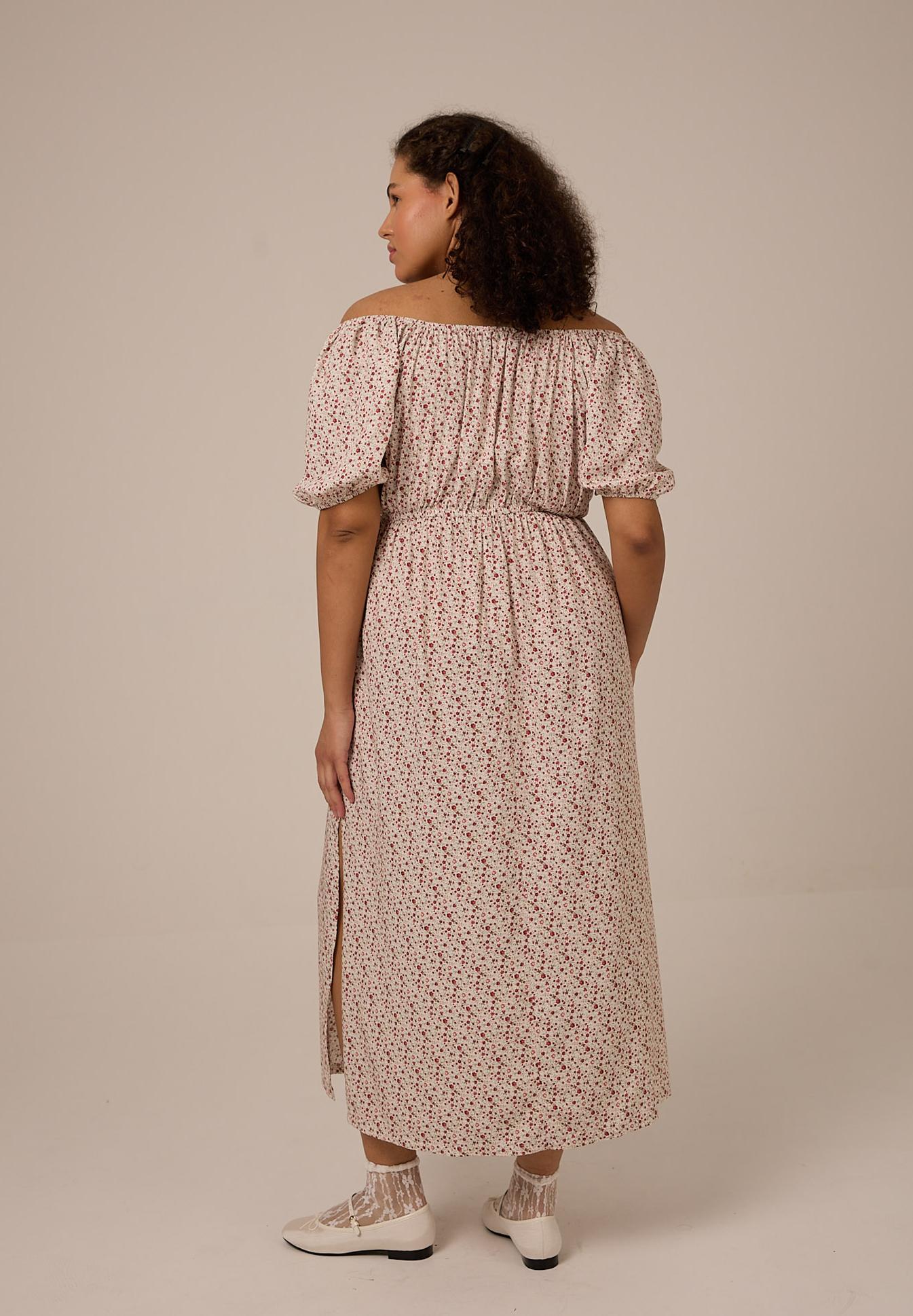 Платье полуприлегающее, с широкими рукавами-фонариками. Горловина собрана на шнур и может регулироваться по глубине. По линии талии платье собрано на резинку. В боковых швах выполнены разрезы. Изделие выполнено из струящейся вискозы в двух вариантах: синий принт и молочный принт.