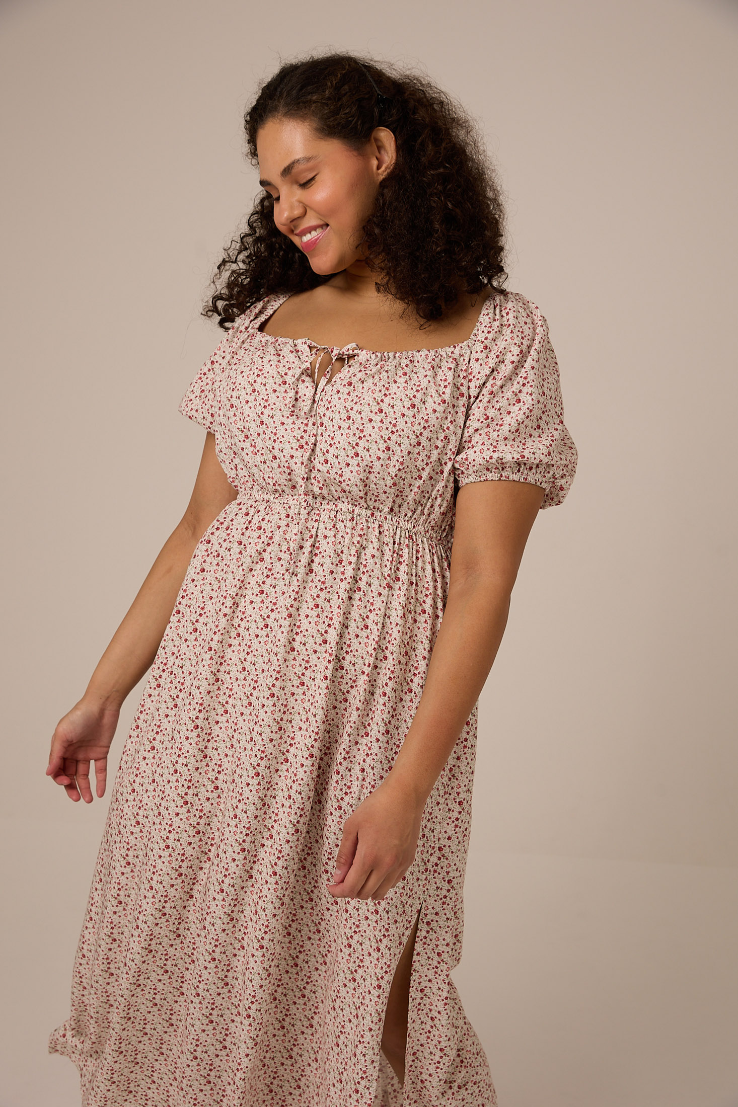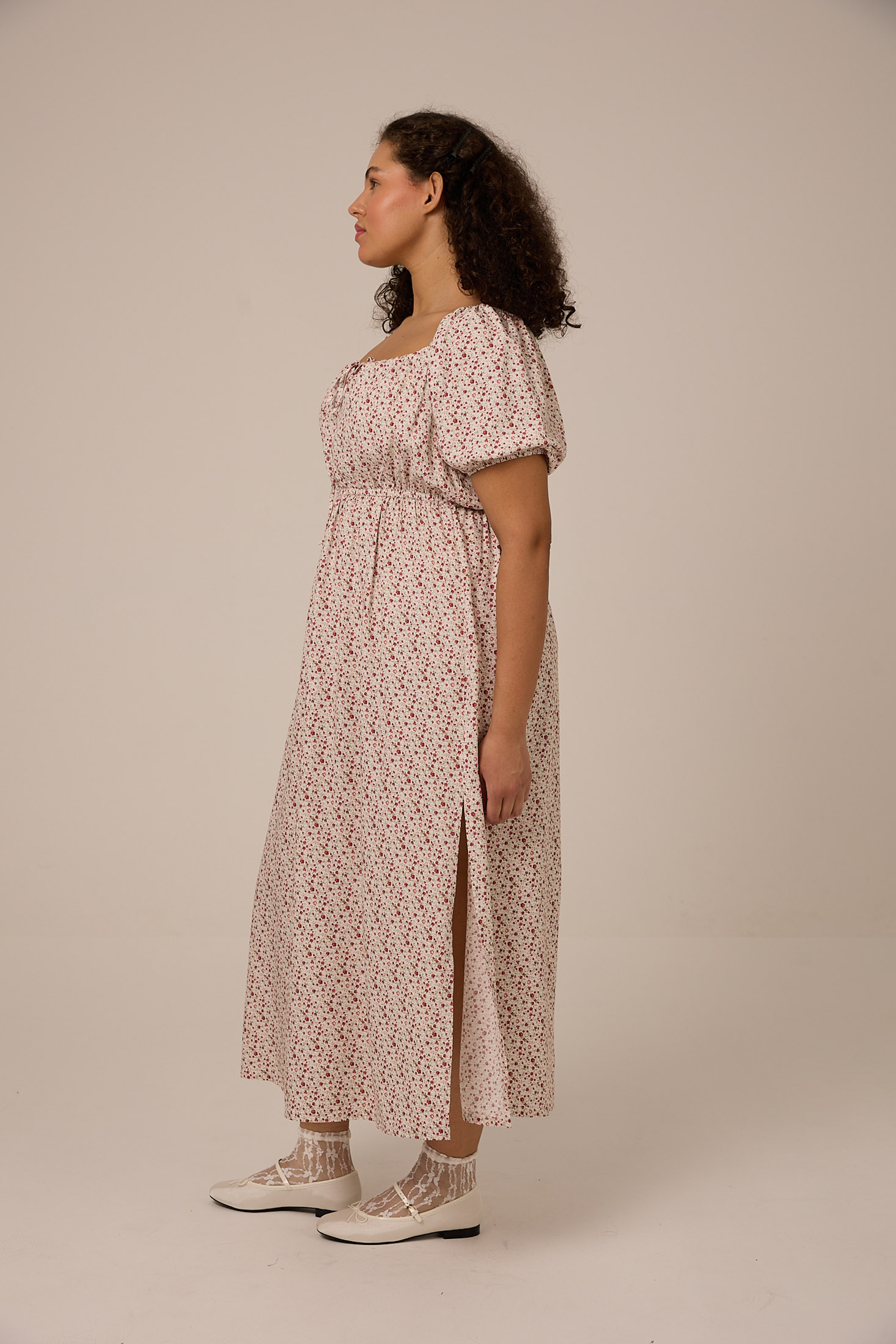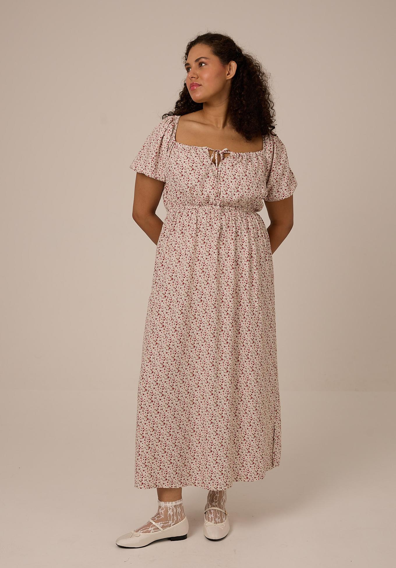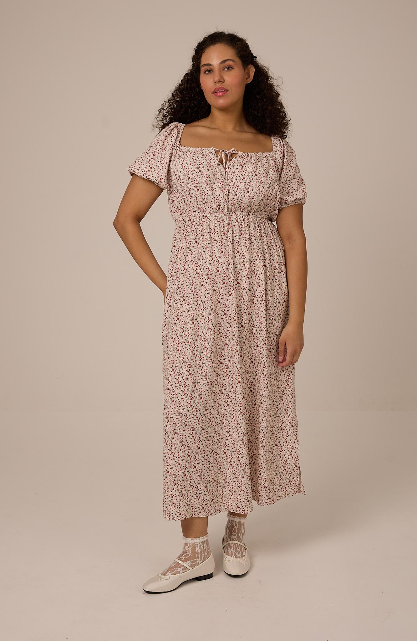 Платье полуприлегающее, с широкими рукавами-фонариками. Горловина собрана на шнур и может регулироваться по глубине. По линии талии платье собрано на резинку. В боковых швах выполнены разрезы. Изделие выполнено из струящейся вискозы в двух вариантах: синий принт и молочный принт.
