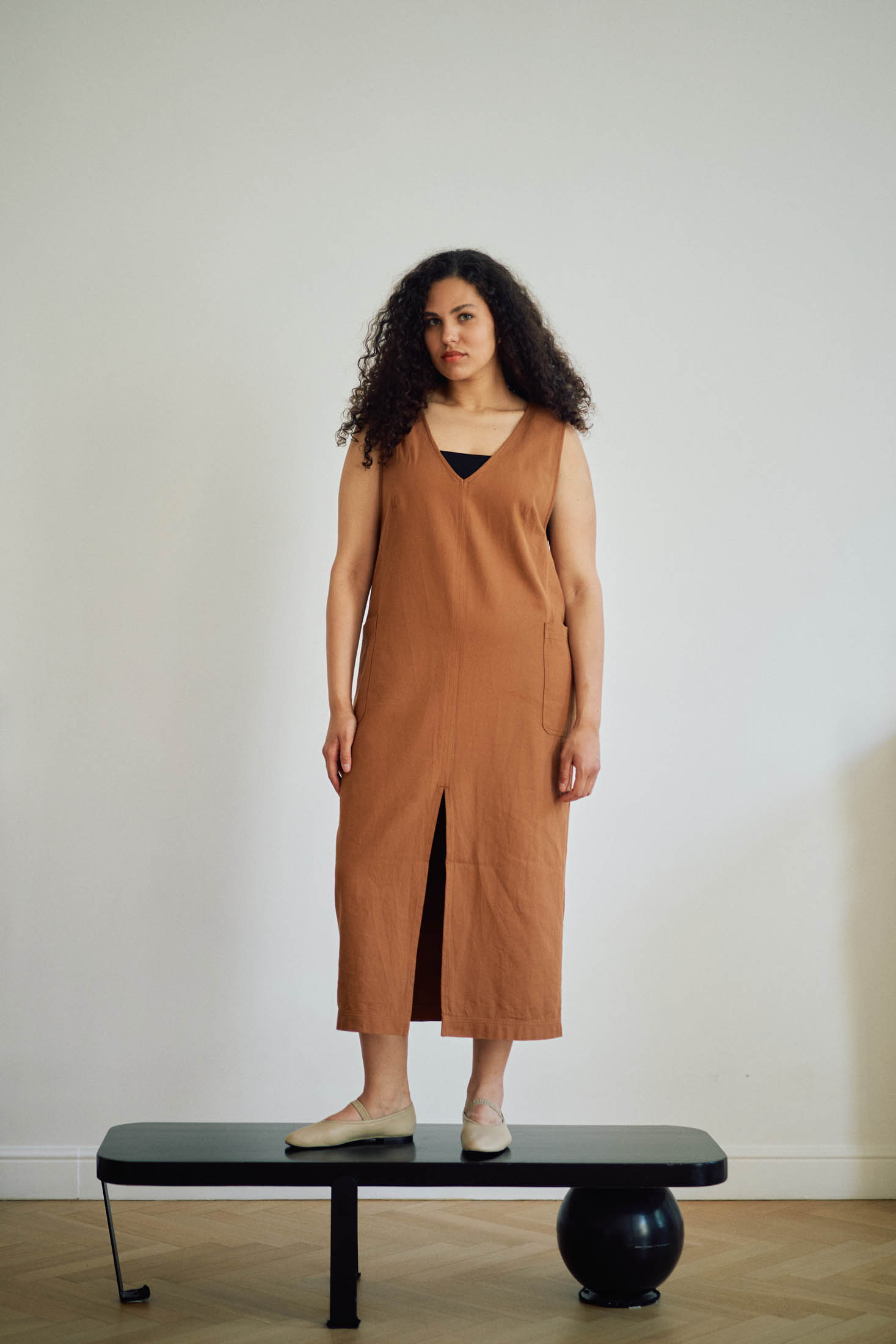 Сарафан свободный, прямого кроя, длиной миди. Глубокий вырез горловины спереди и глубокие проймы. Карманы накладные. Спереди разрез. Нагрудные вытачки обеспечивают хорошую посадку. Сарафан выполнен из плотного хлопка в коричневом и св. зеленом цвете.