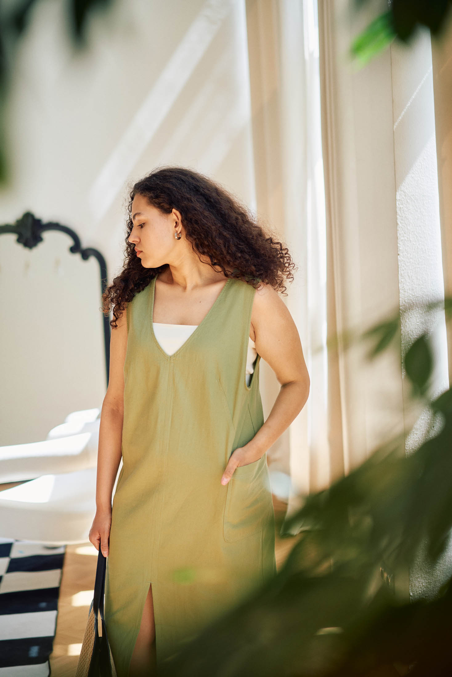 Сарафан свободный, прямого кроя, длиной миди. Глубокий вырез горловины спереди и глубокие проймы. Карманы накладные. Спереди разрез. Нагрудные вытачки обеспечивают хорошую посадку. Сарафан выполнен из плотного хлопка в коричневом и св. зеленом цвете.