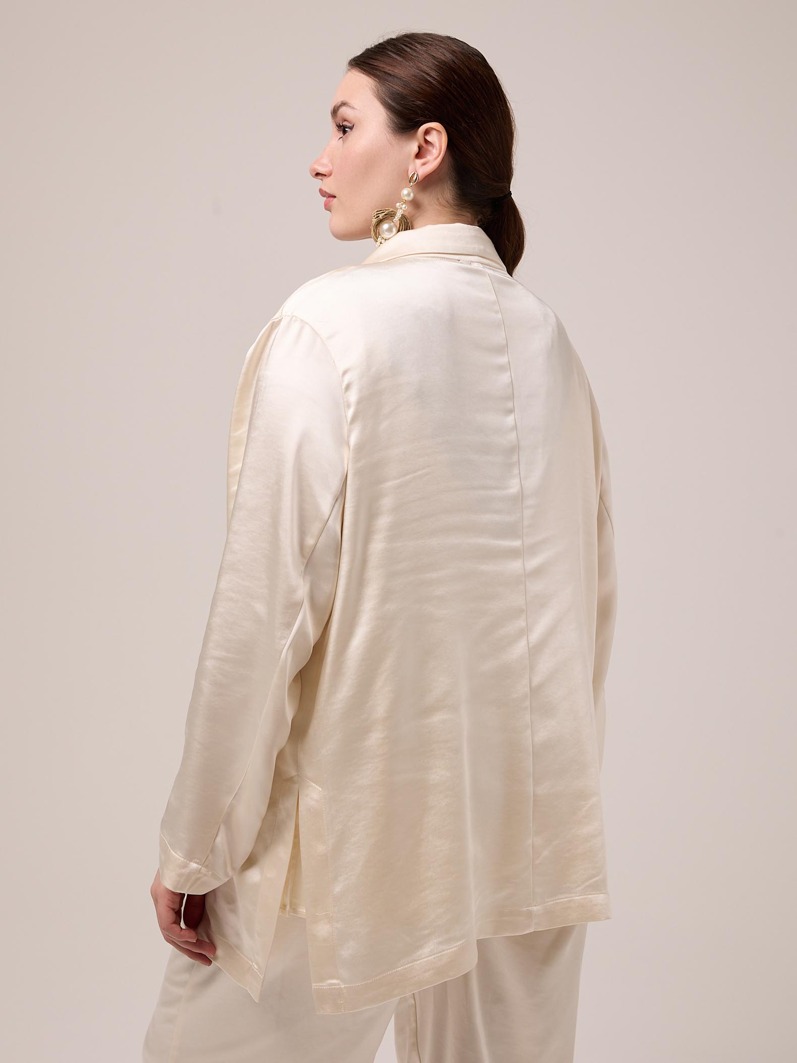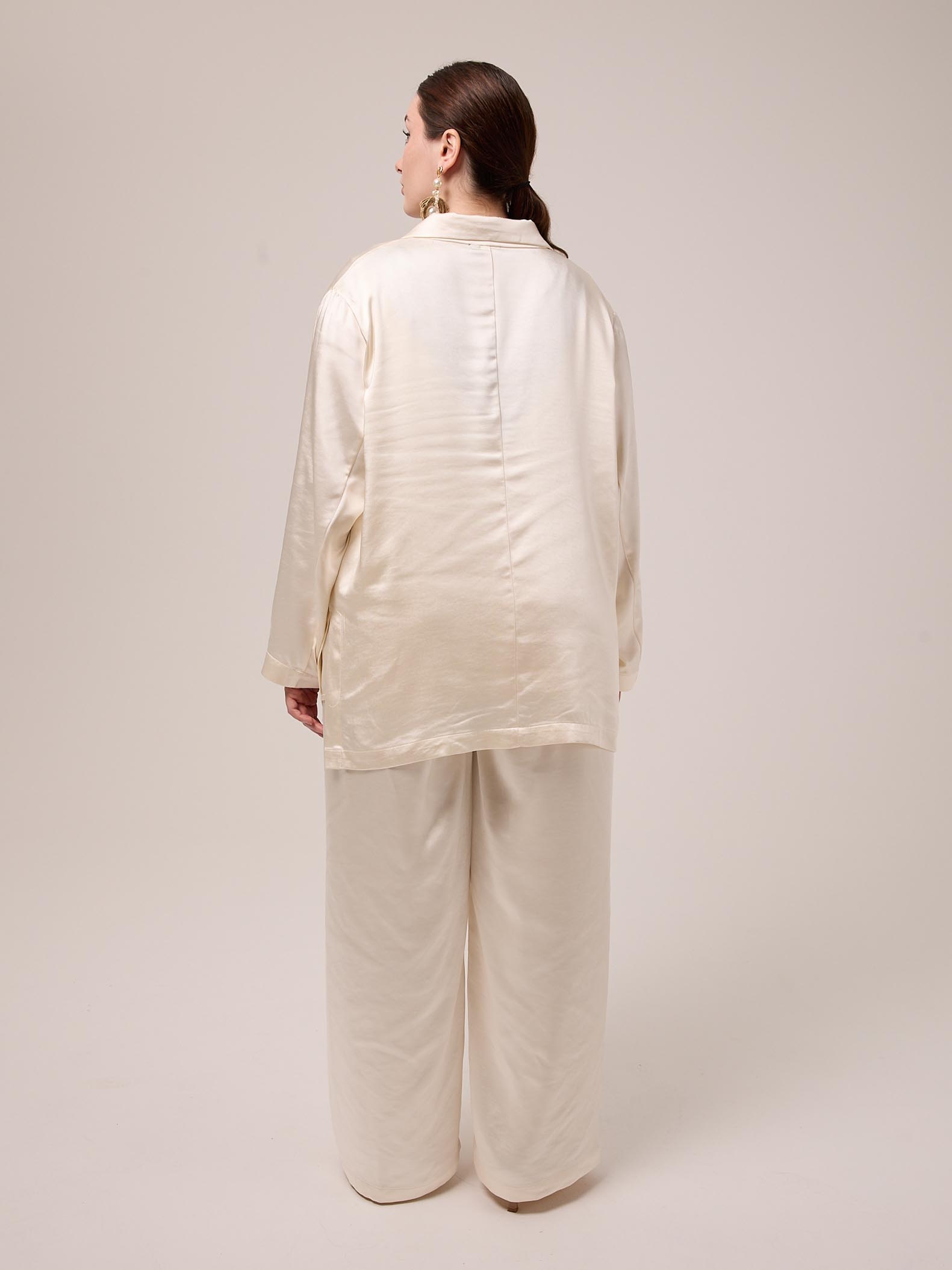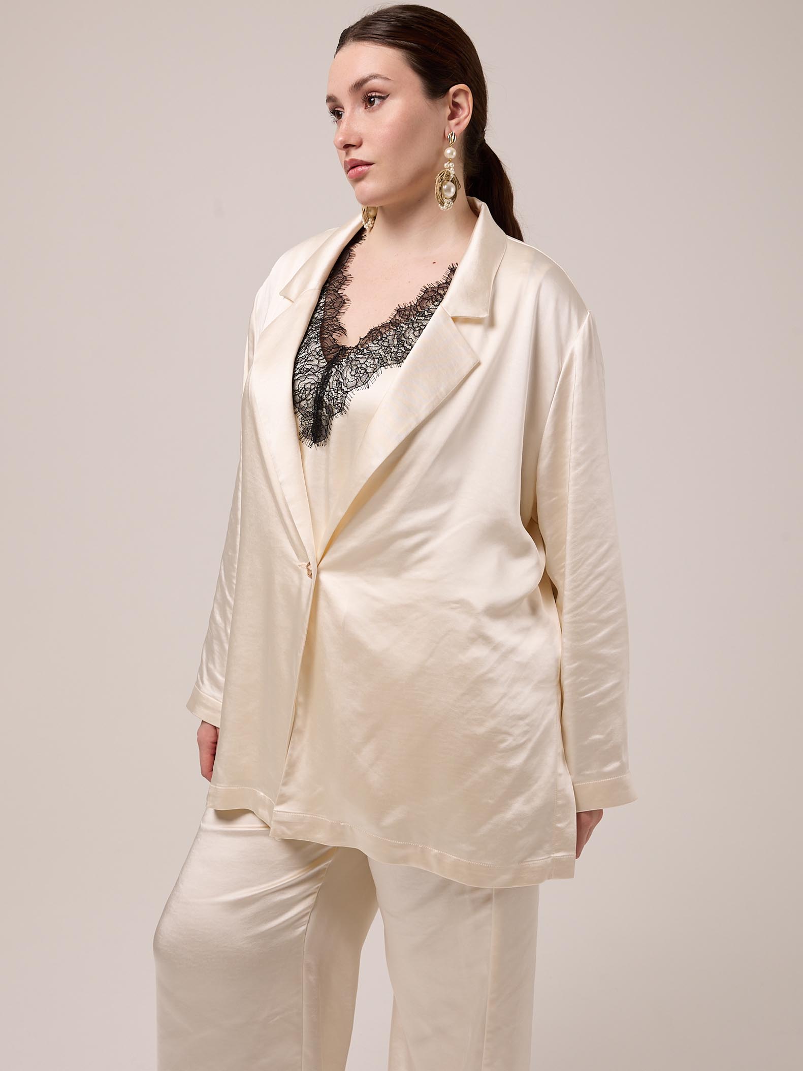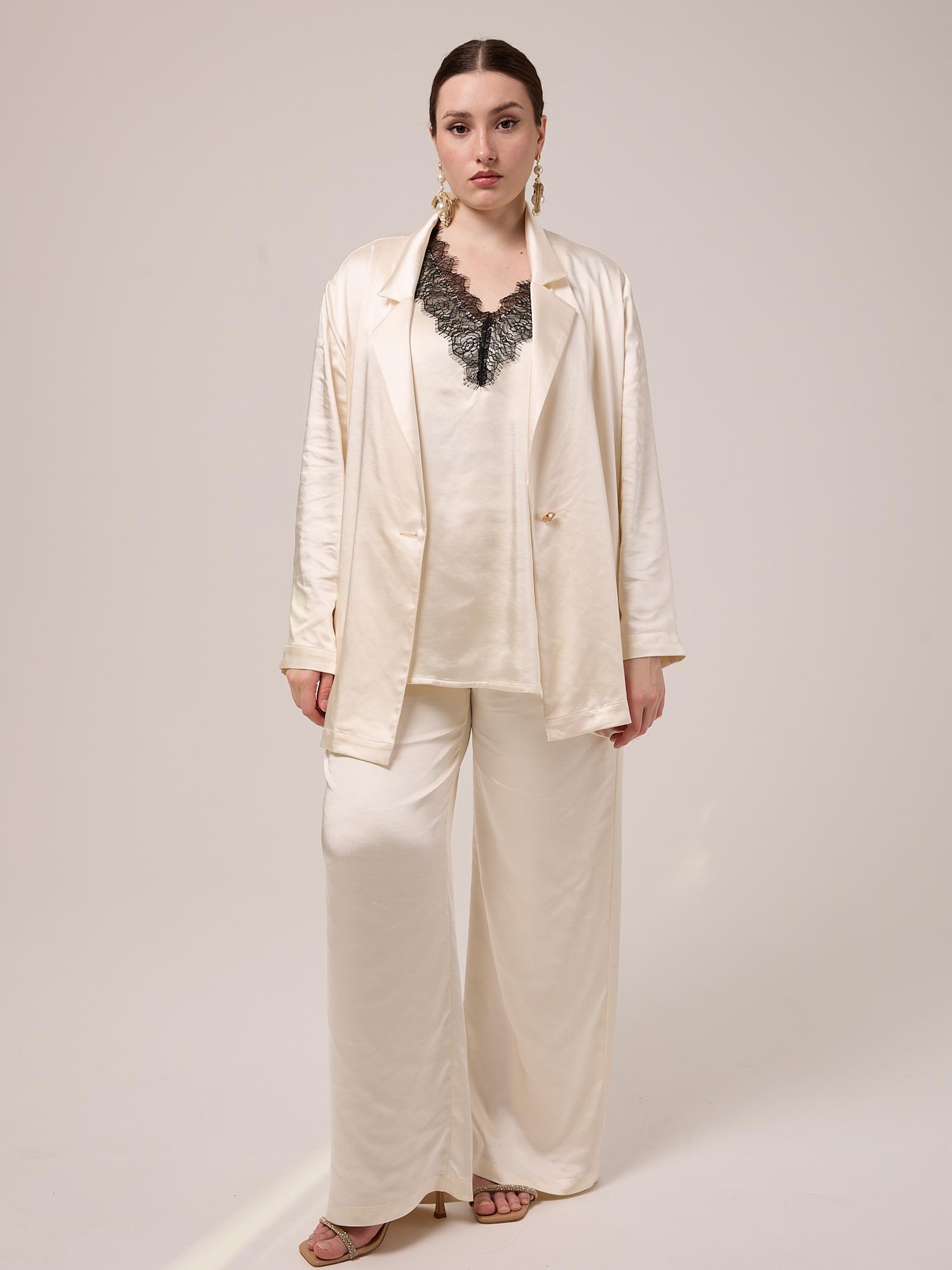 Костюм состоит из жакета и брюк. Жакет прямого, свободного кроя. Воротник английский с лацканами. Карманы на жакете не предусмотрены, но высокие разрезы в боковых швах, позволяют легко пользоваться карманами на брюках. Застегивается жакет на петлю и пуговицу. Выполнен из плотного атласа с «крэш» эффектом, без подкладки. Брюки свободные в бедрах, широкие по всей длине. Боковые карманы на передних половинках. Пояс с эластичной тесьмой внутри. Костюм выполнен из плотного атласа с «крэш эффектом» в черном и молочном цветах.