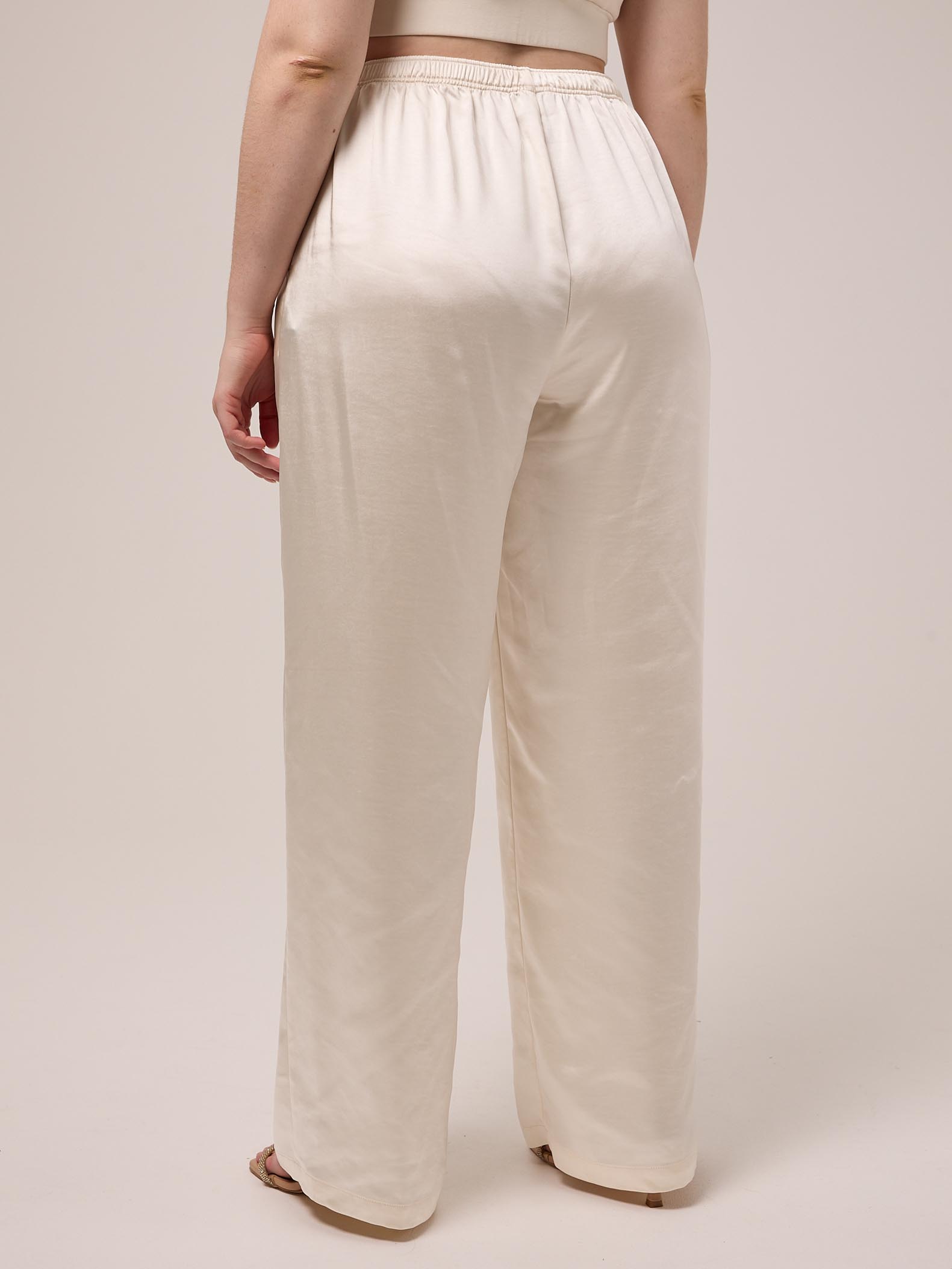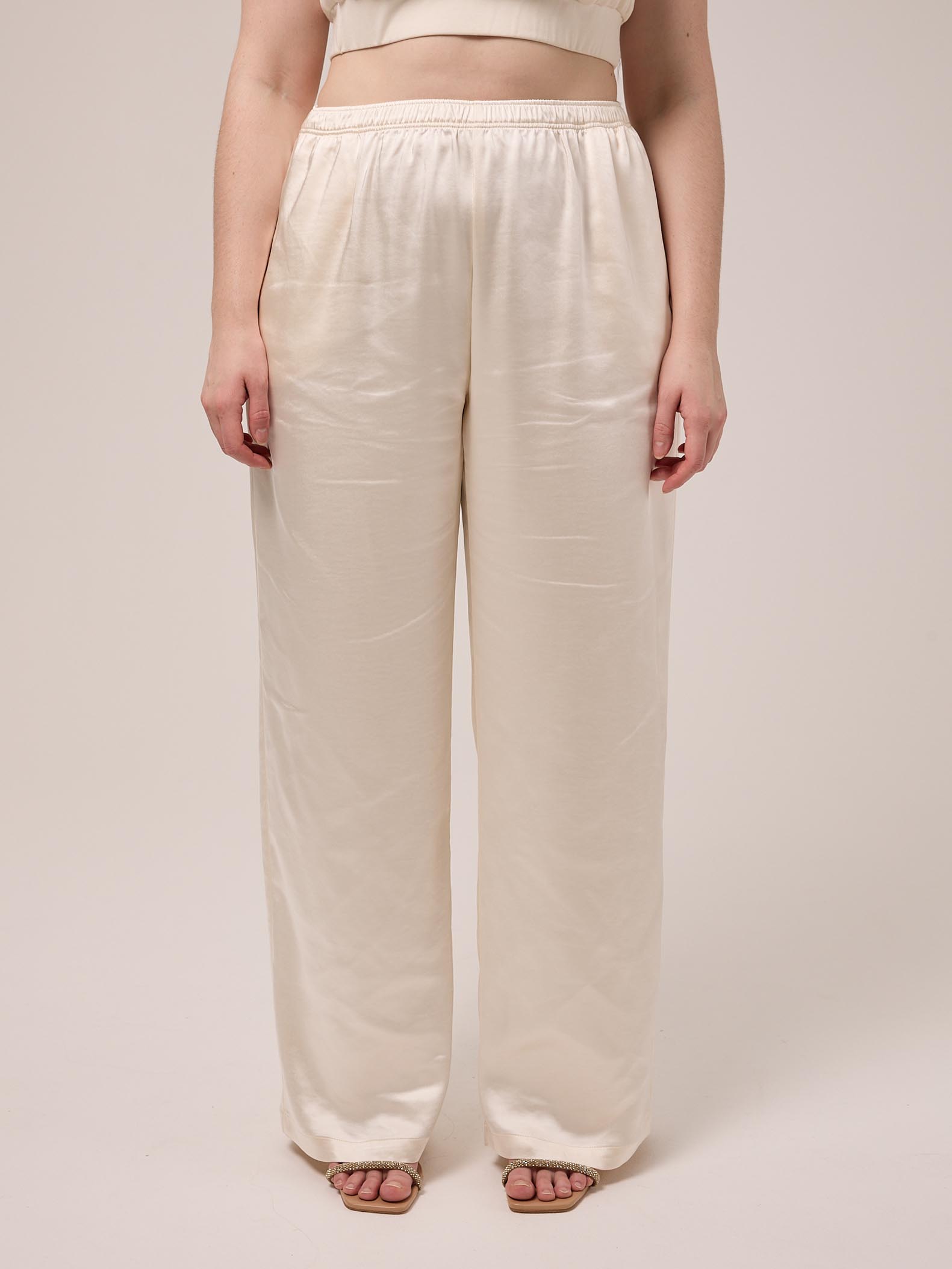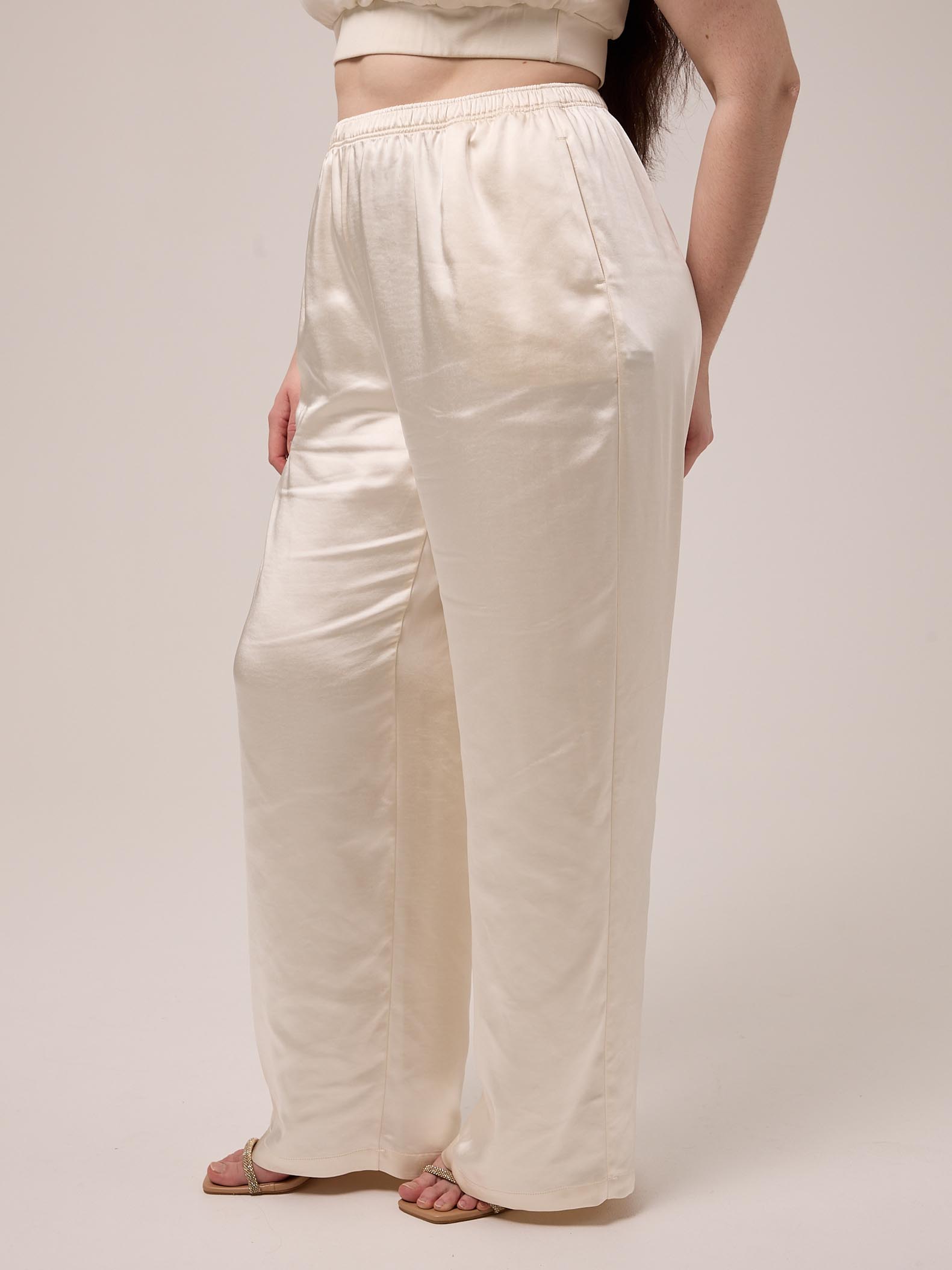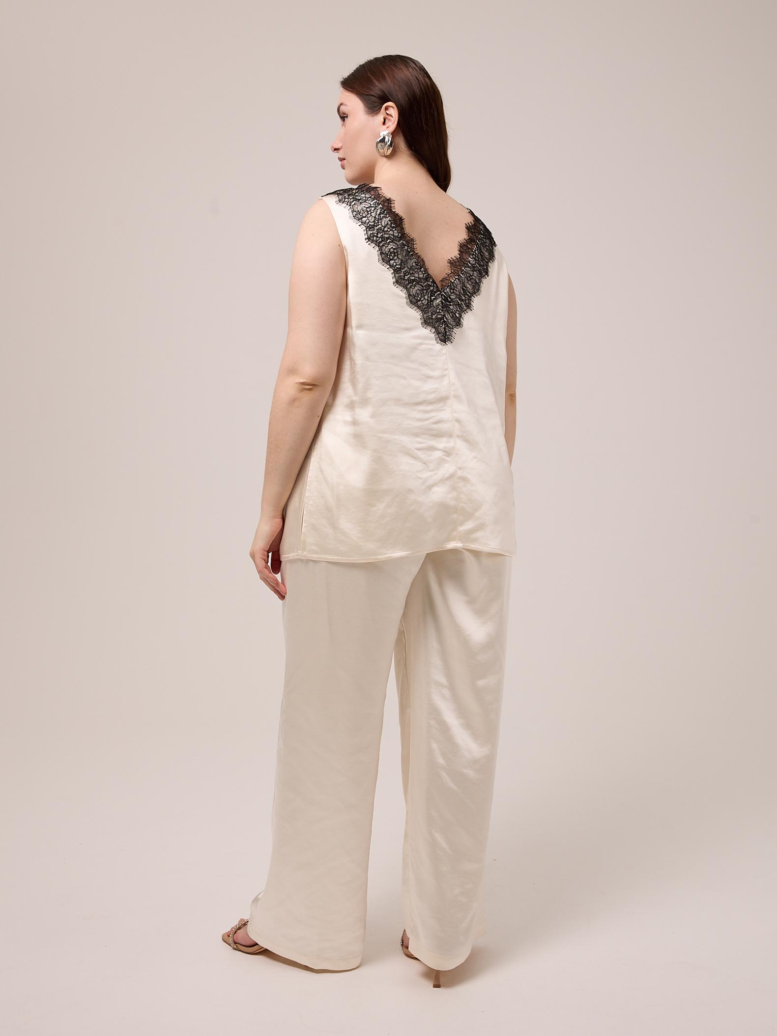 Костюм состоит из жакета и брюк. Жакет прямого, свободного кроя. Воротник английский с лацканами. Карманы на жакете не предусмотрены, но высокие разрезы в боковых швах, позволяют легко пользоваться карманами на брюках. Застегивается жакет на петлю и пуговицу. Выполнен из плотного атласа с «крэш» эффектом, без подкладки. Брюки свободные в бедрах, широкие по всей длине. Боковые карманы на передних половинках. Пояс с эластичной тесьмой внутри. Костюм выполнен из плотного атласа с «крэш эффектом» в черном и молочном цветах.