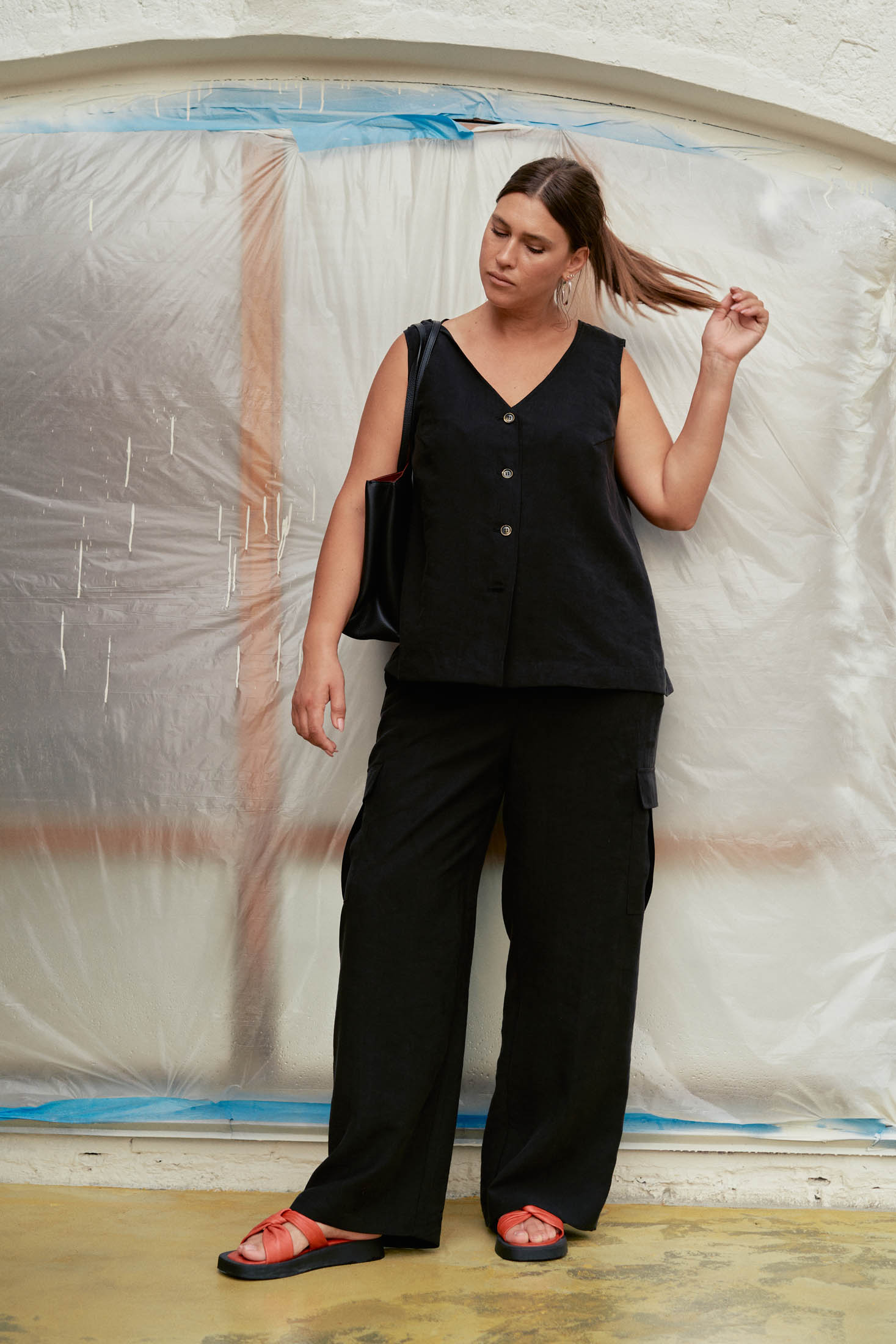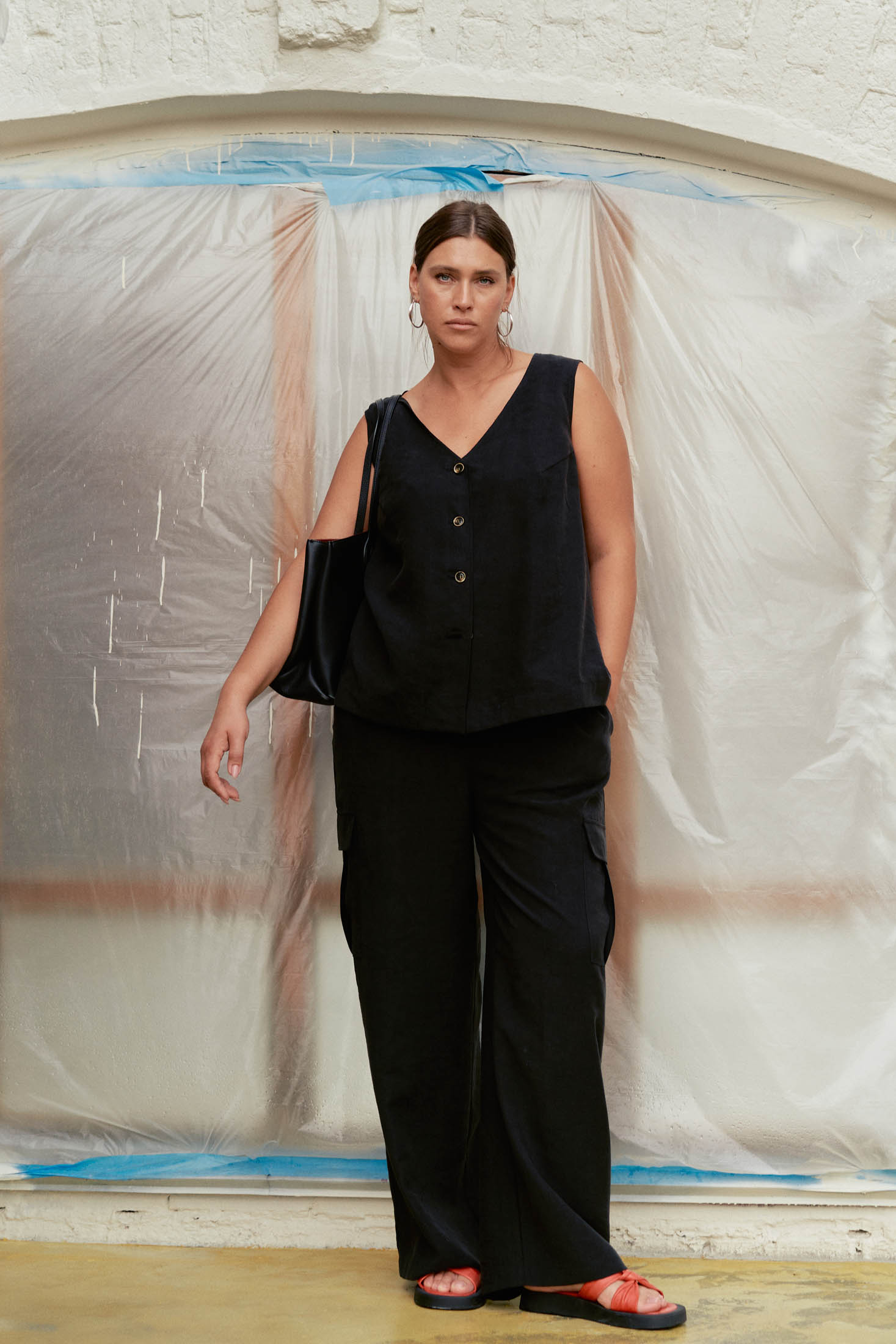 Костюм состоит из жилета и брюк. Жилет свободного кроя, длиной до бедер. На спинке выполнена встречная складка. Нагрудная вытачка обеспечит хорошую посадку. Жилет застегивается на петли и пуговицы. Брюки прямого кроя, умеренно широкие по всей длине. Пояс притачной с эластичной тесьмой внутри, гульфик ложный. Боковые карманы на передних половинках. На бедрах большие накладные карманы с клапанами. Костюм выполнен из шелковистого тенсела в черном и коричневом цвете.