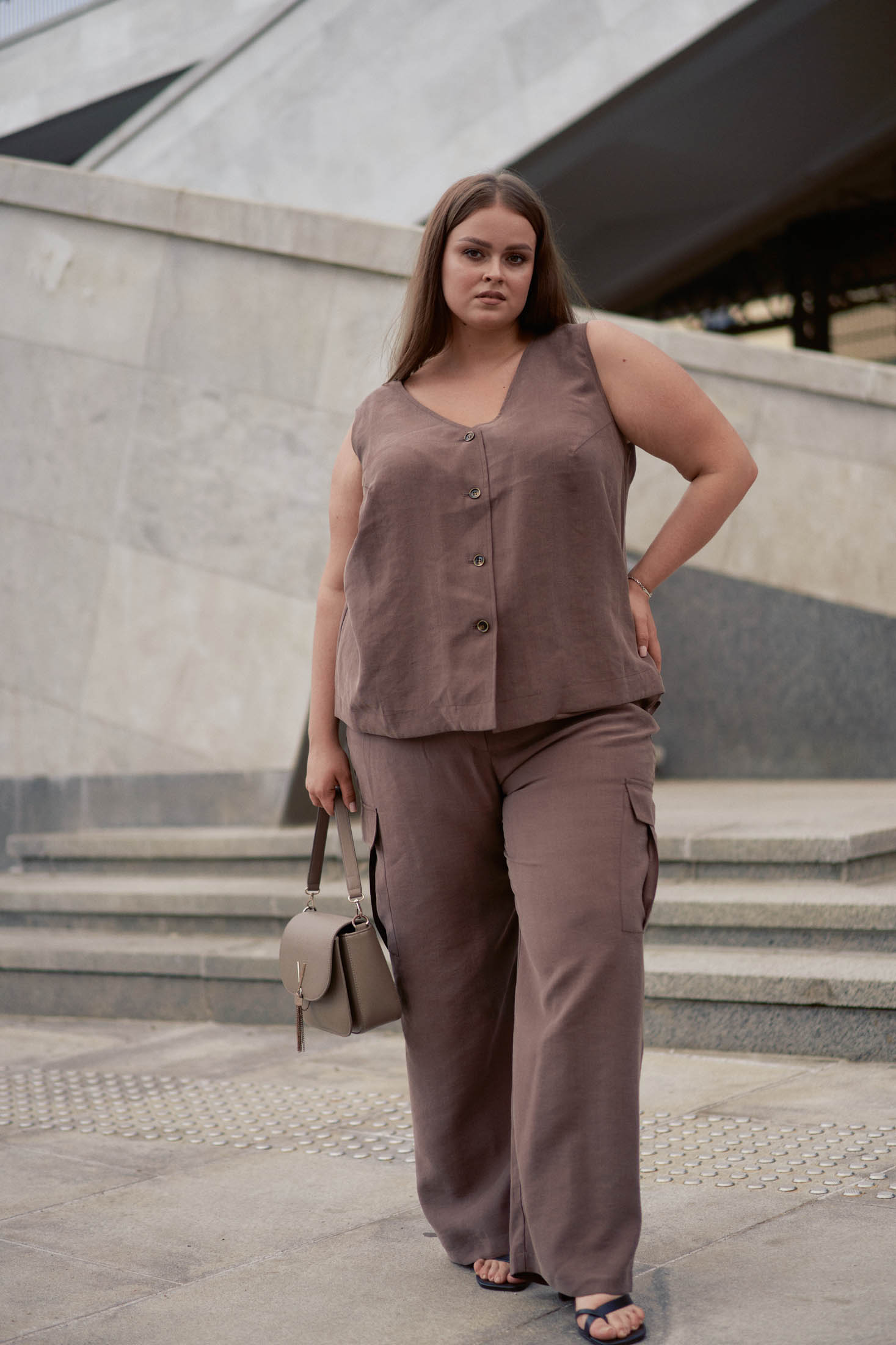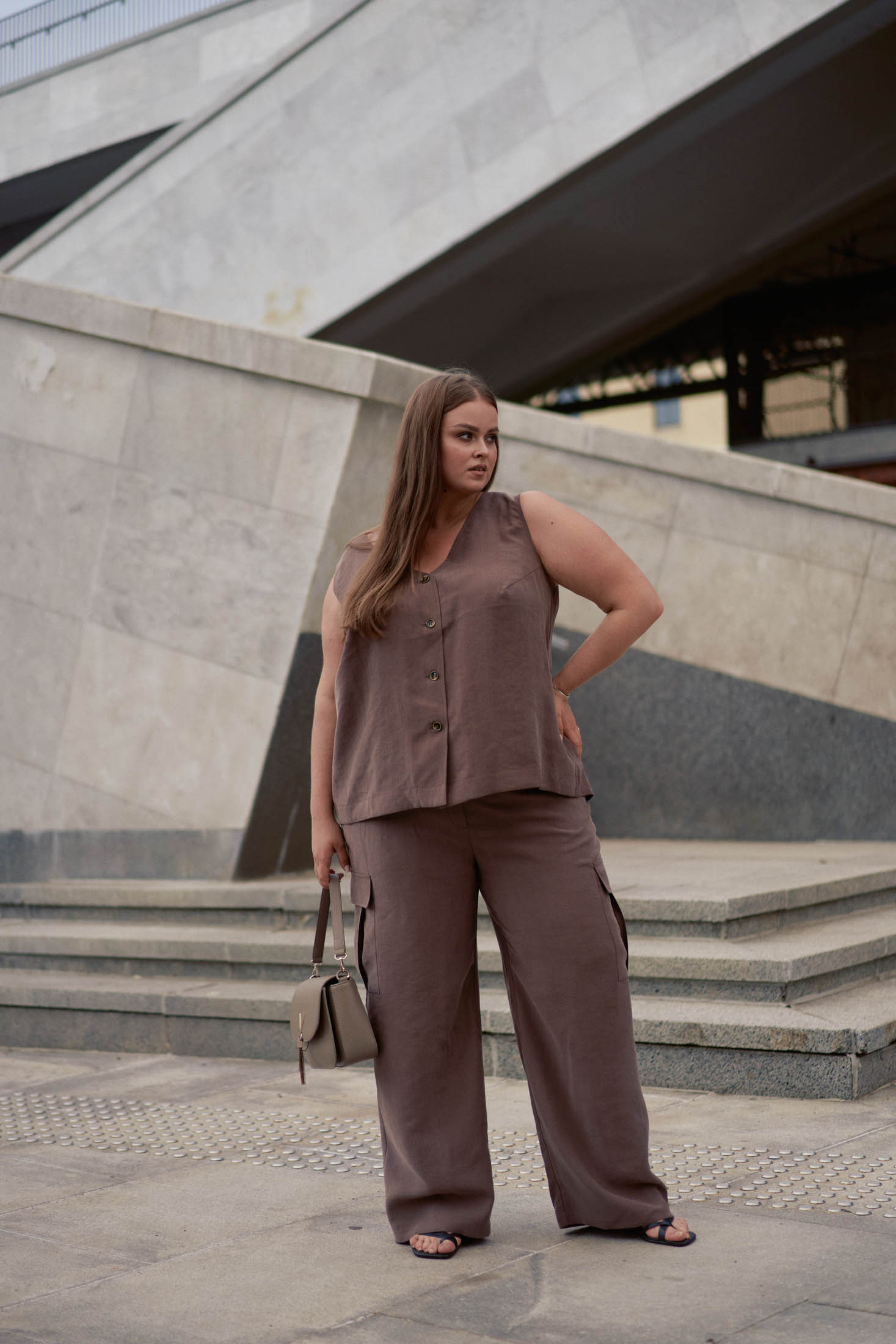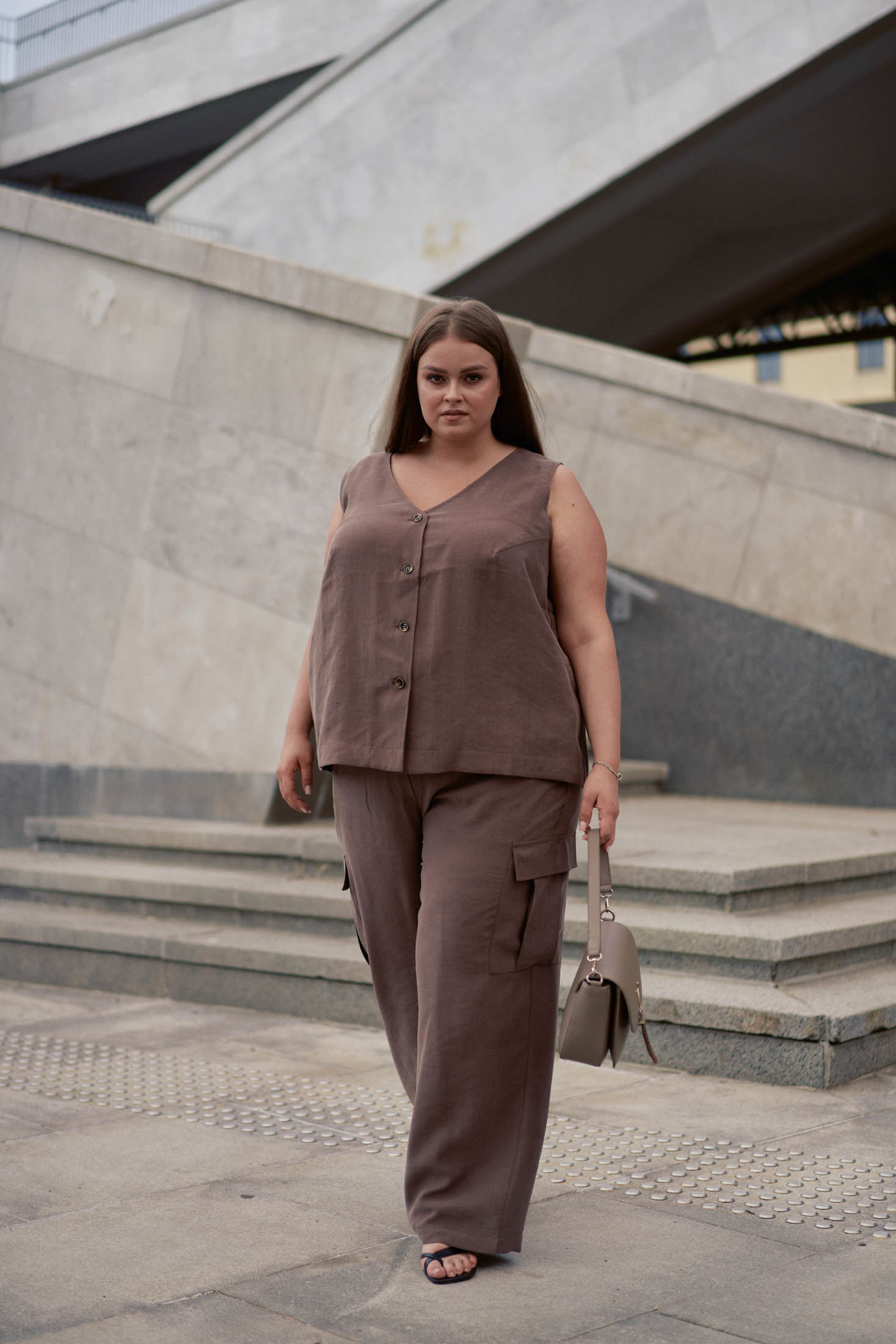 Костюм состоит из жилета и брюк. Жилет свободного кроя, длиной до бедер. На спинке выполнена встречная складка. Нагрудная вытачка обеспечит хорошую посадку. Жилет застегивается на петли и пуговицы. Брюки прямого кроя, умеренно широкие по всей длине. Пояс притачной с эластичной тесьмой внутри, гульфик ложный. Боковые карманы на передних половинках. На бедрах большие накладные карманы с клапанами. Костюм выполнен из шелковистого тенсела в черном и коричневом цвете.