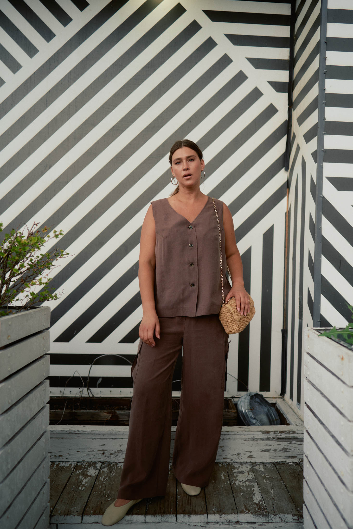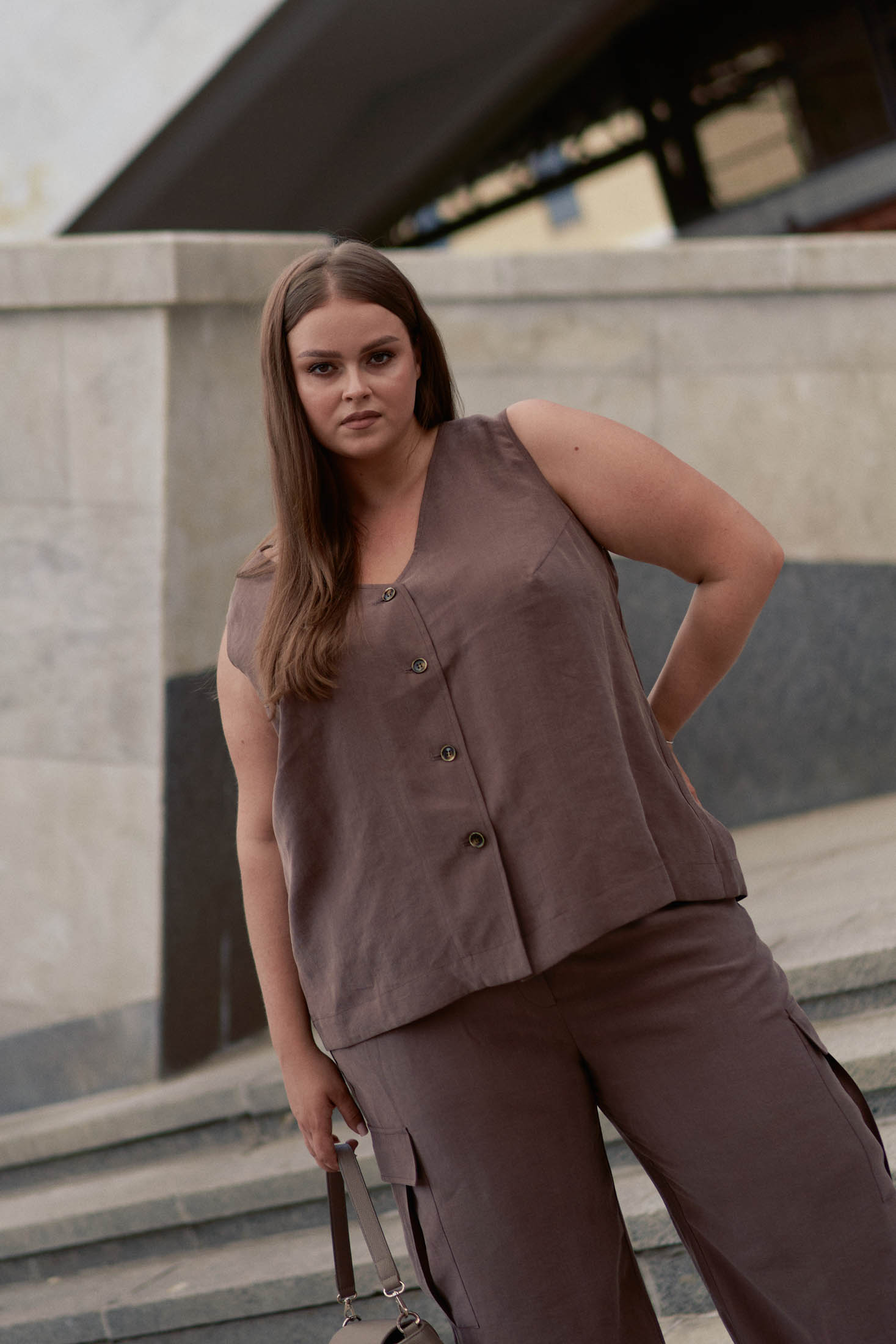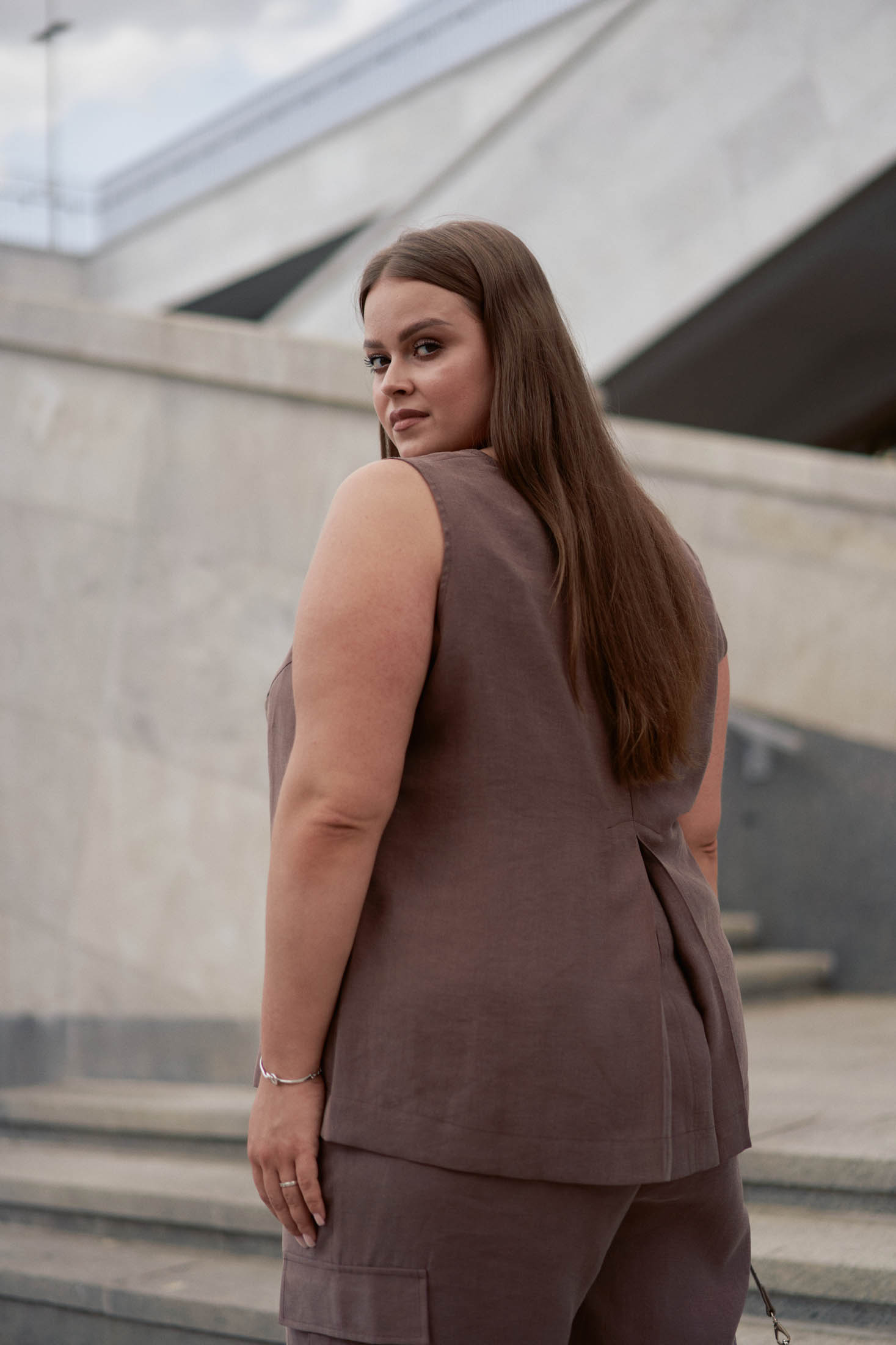 Костюм состоит из жилета и брюк. Жилет свободного кроя, длиной до бедер. На спинке выполнена встречная складка. Нагрудная вытачка обеспечит хорошую посадку. Жилет застегивается на петли и пуговицы. Брюки прямого кроя, умеренно широкие по всей длине. Пояс притачной с эластичной тесьмой внутри, гульфик ложный. Боковые карманы на передних половинках. На бедрах большие накладные карманы с клапанами. Костюм выполнен из шелковистого тенсела в черном и коричневом цвете.