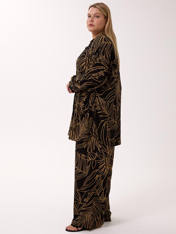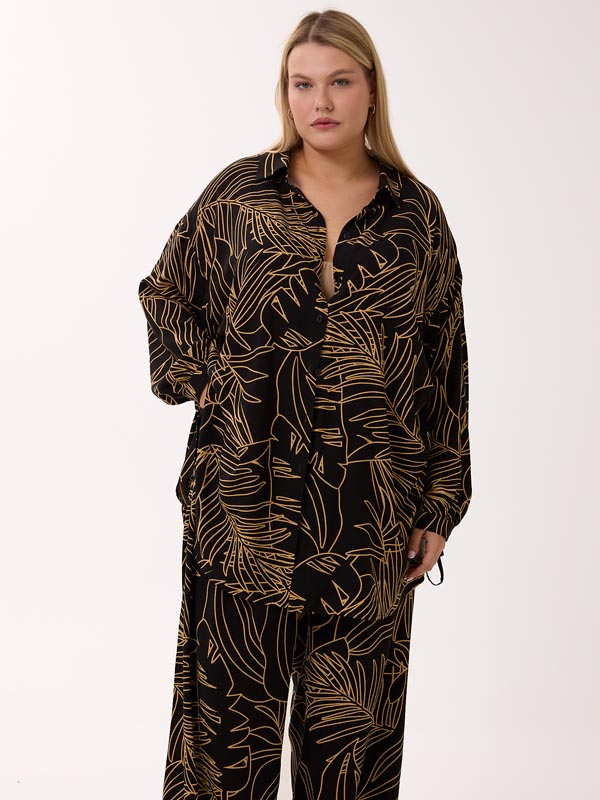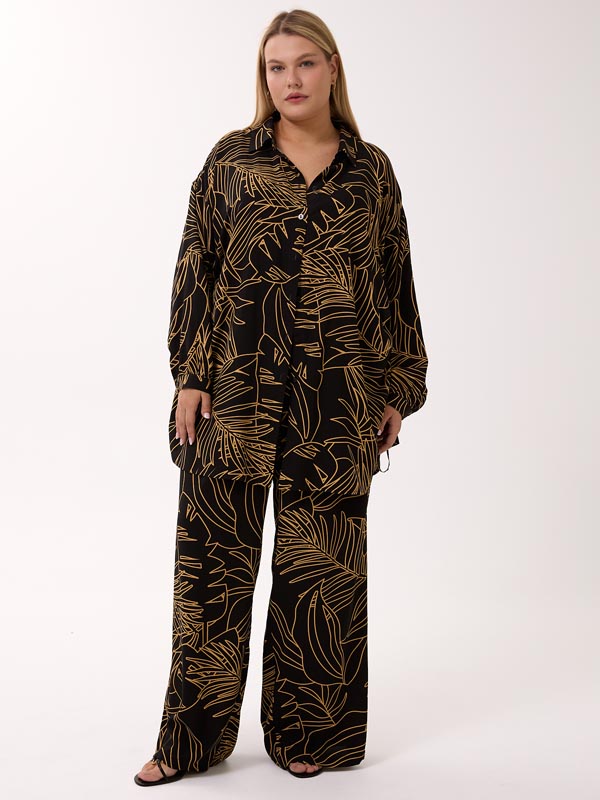 Легкий струящийся костюм, который состоит из брюк и рубашки. Брюки свободные в области бедер, широкие по всей длине. Пояс с эластичной тесьмой внутри, для дополнительной фиксации предусмотрен шнурок. Карманы на брюках выполнены в боковых швах. Рубашка объемная, со спущенным плечевым поясом. Воротник рубашечный, стояче-отложной. Рукава с манжетами. В боковых швах высокие разрезы и кулиска со шнурком, для моделирования нового образа с драпировками. Застежка-пуговицы. Костюм выполнен из вискозной ткани в трех принтах: черный/бежевый, молочный/коричневый, молочный/бежевый.