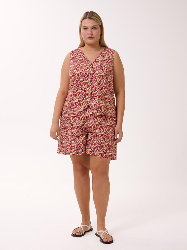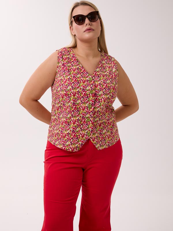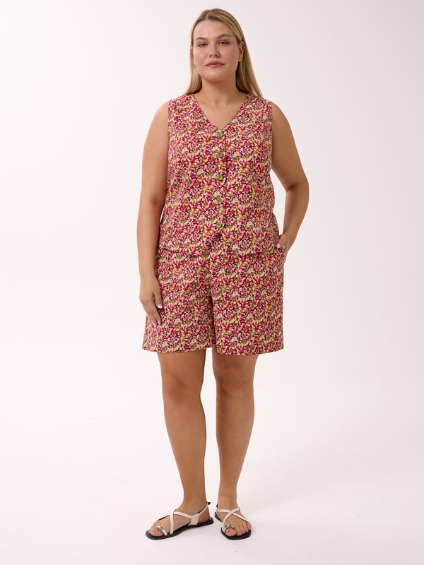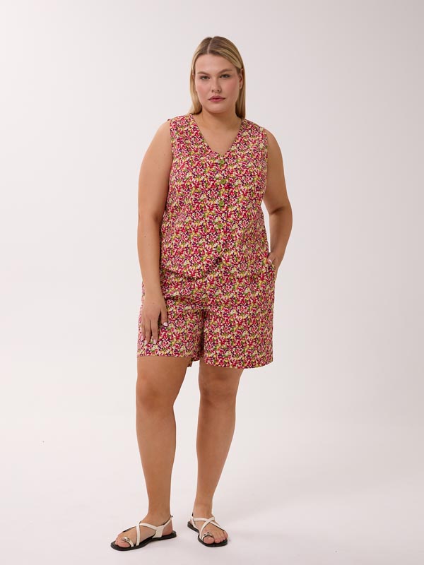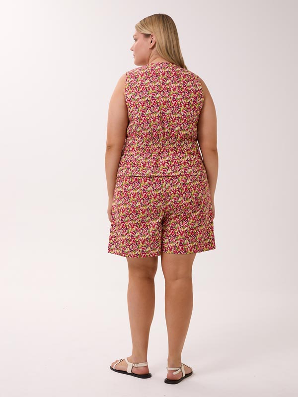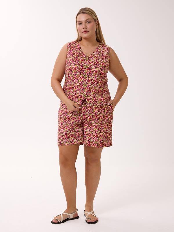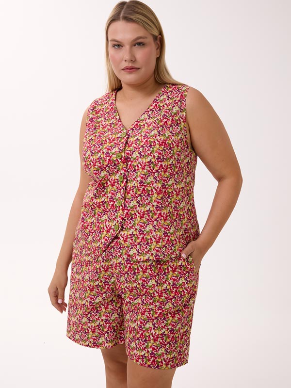Состоит из жилетки и шорт. Полуприлегающий короткий жилет с V-образным вырезом. Рельефы с вытачками обеспечивают хорошую посадку. По линии талии, на спинке изделие присобрано на резинку, для более комфортного прилегания. Жилет застегивается на петли и пуговицы. Шорты с боковыми карманами. Пояс на резинке со шнурком. Костюм выполнен из 100% хлопкового поплина в синем и красном цвете.
