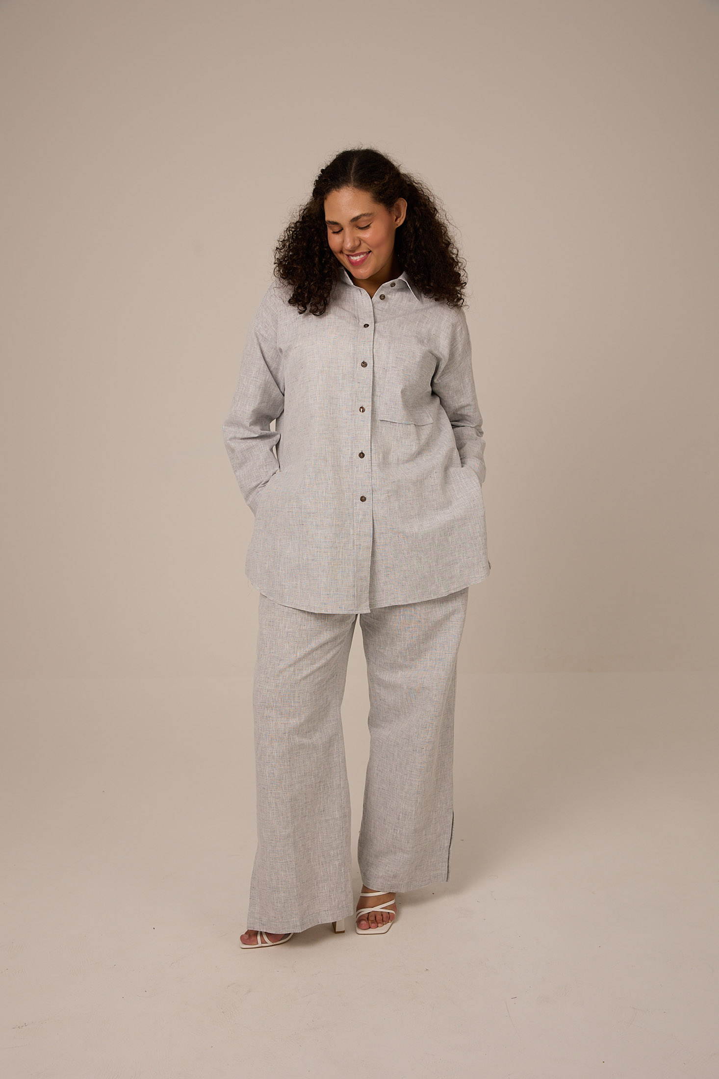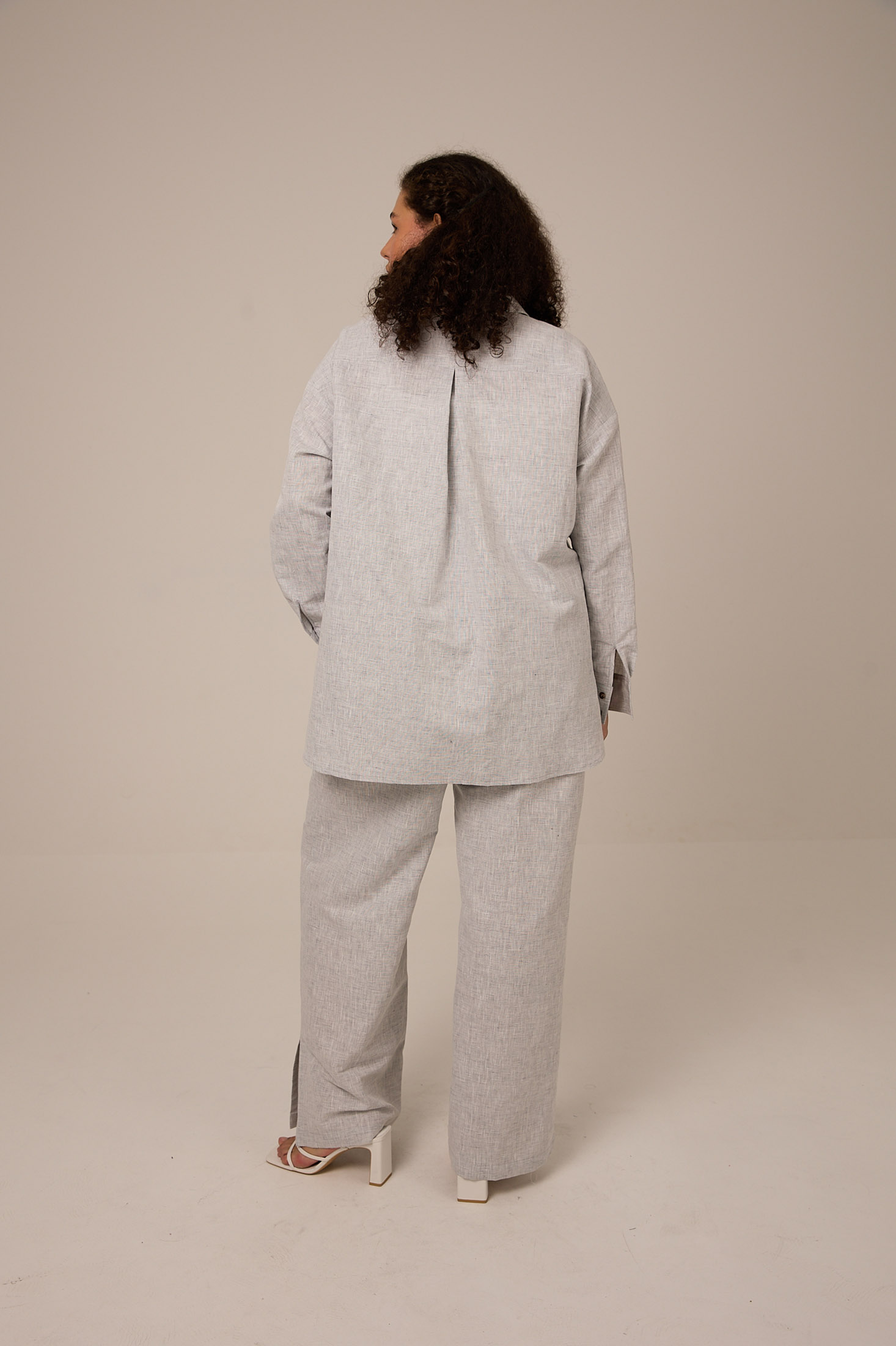 Костюм состоит из рубашки и брюк. Рубашка свободного кроя, длиной ниже линии бедер. Воротник отложной на стойке. Плечевой пояс спущенный. Рукава длинные с манжетами. На спинке отрезная кокетка и встречная складка. Низ оформлен плавными линиями с высокими разрезами в боковых швах, которые застегиваются на пуговицы. На левой полочке выполнен нагрудный карман. Рубашка застегивается на петли и пуговицы из ракушки. Брюки свободного кроя, умеренно широкие по всей длине. Пояс притачной с эластичной тесьмой внутри, так же в поясе есть шнур. Боковые карманы на передних половинках. На задних половинках - ложные карманы с листочками. Внизу брюк, в боковых швах выполнены разрезы. Костюм выполнен из хлопковой ткани с добавлением льна с св. сером меланже.