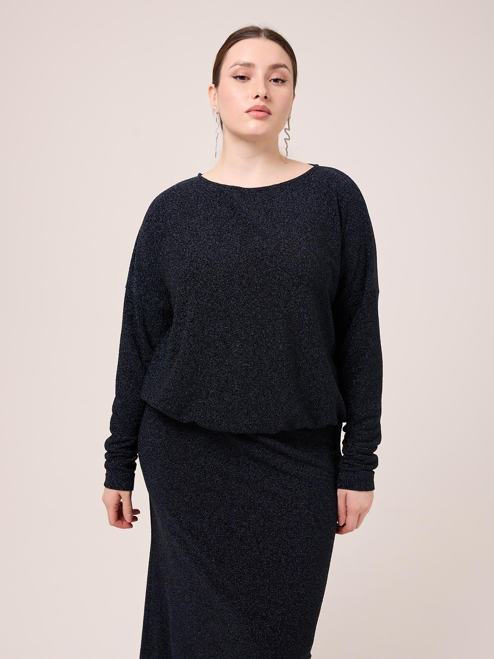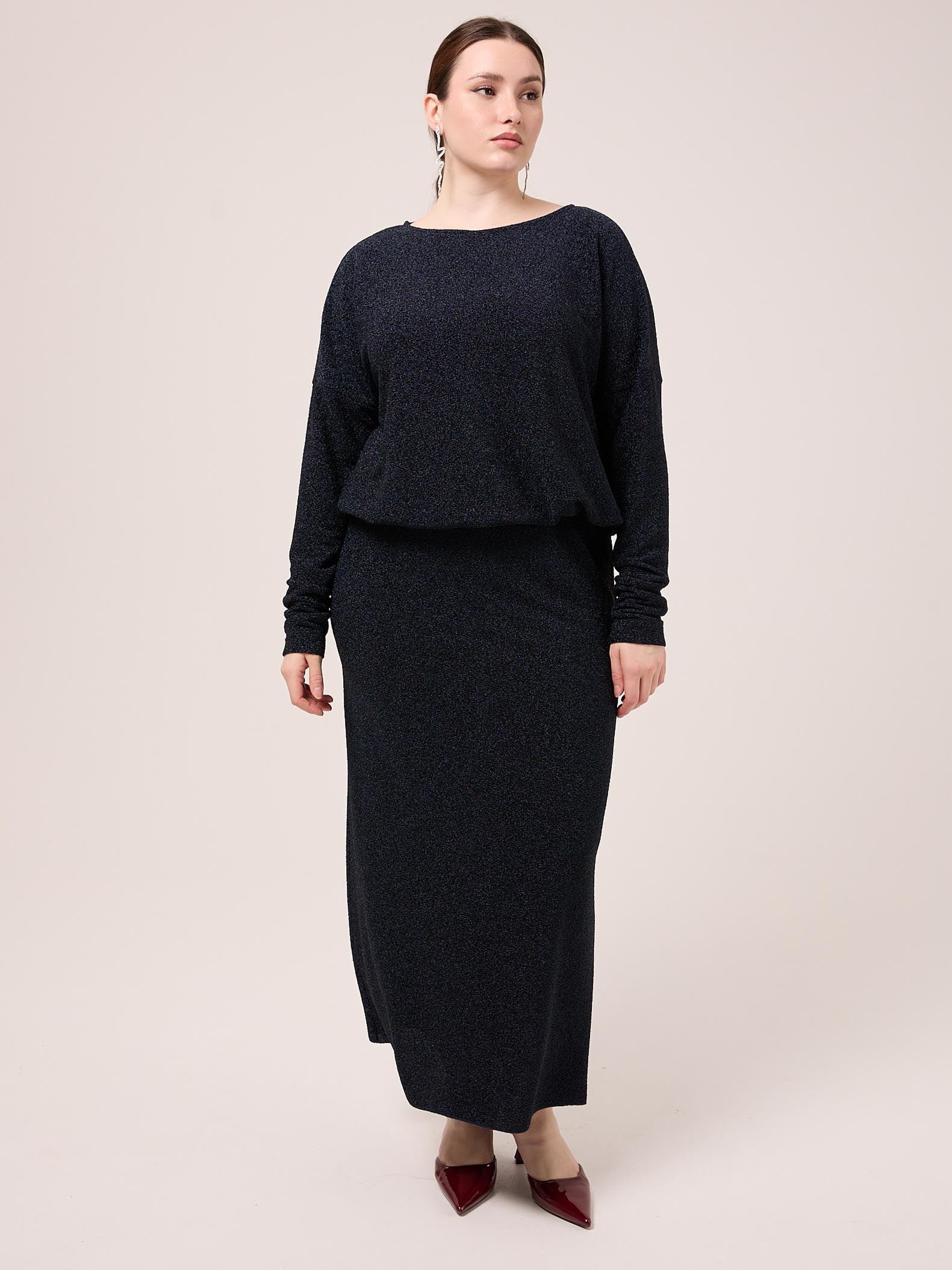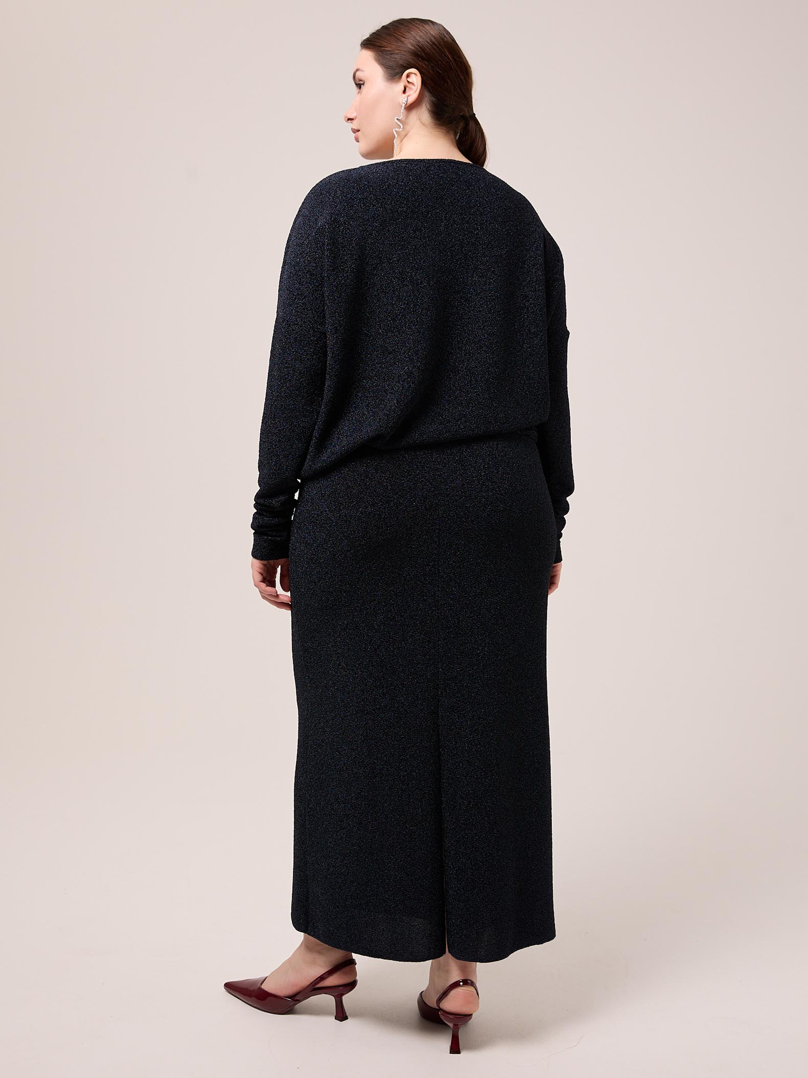 Костюм состоит из юбки и блузона. Юбка макси прямого кроя с разрезом сзади. Пояс с эластичной тесьмой внутри. Блузон прямого кроя со спущенным плечевым поясом. Вырез горловины-небольшая «лодочка». Рукава узкие, длинные, со сборкой внизу. Низ блузона на эластичной тесьме. Костюм выполнен из фактурного трикотажа с люрексом в двух цветах: темно-синем и серебряном.