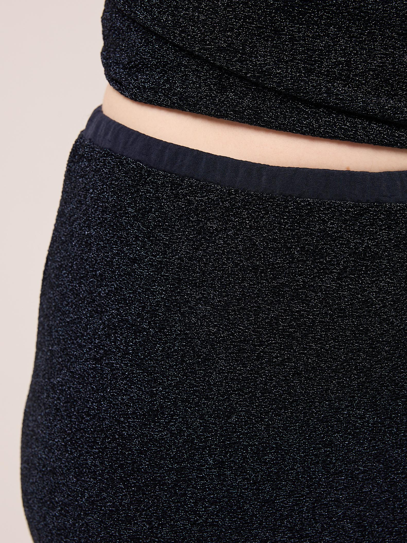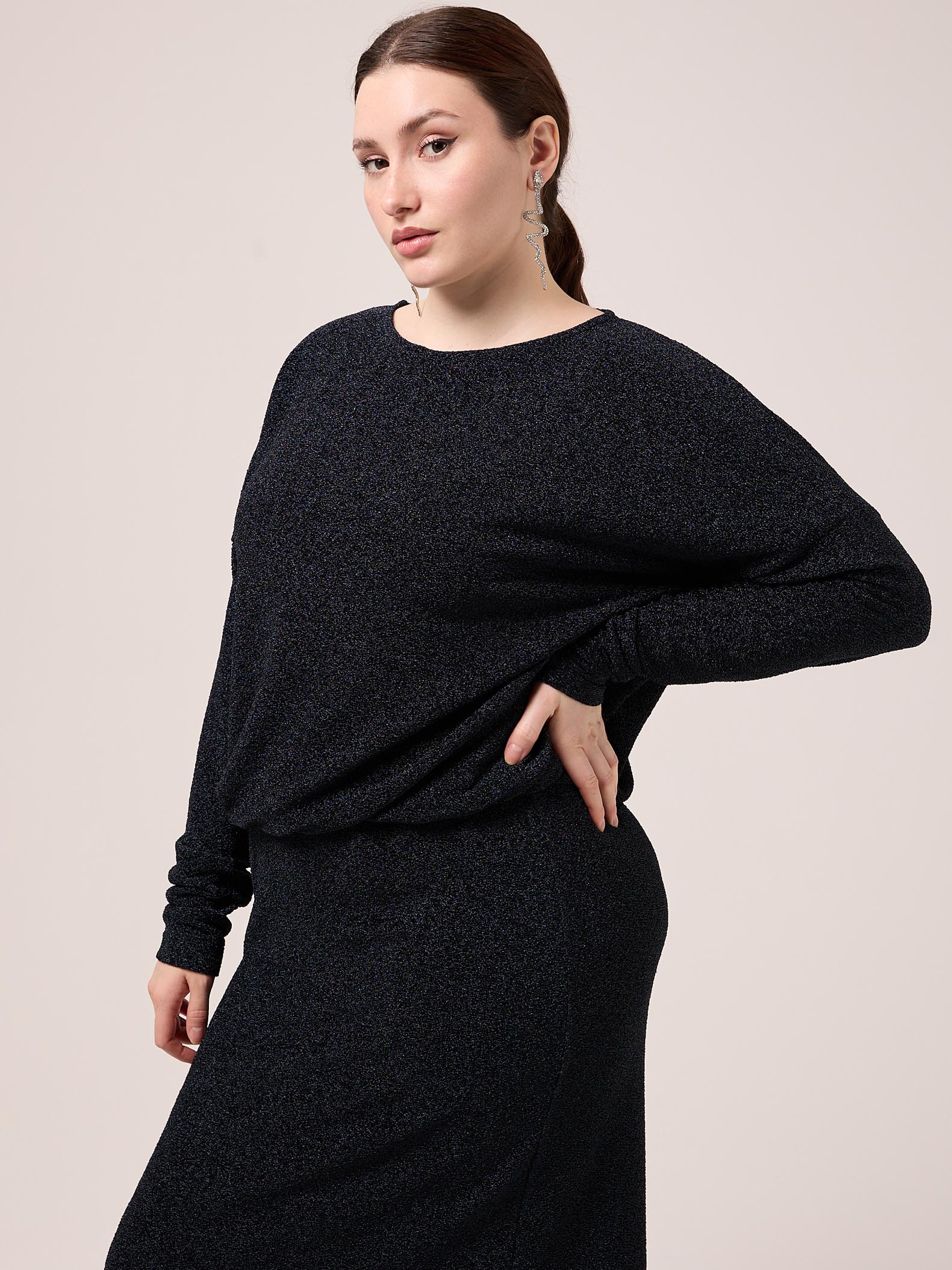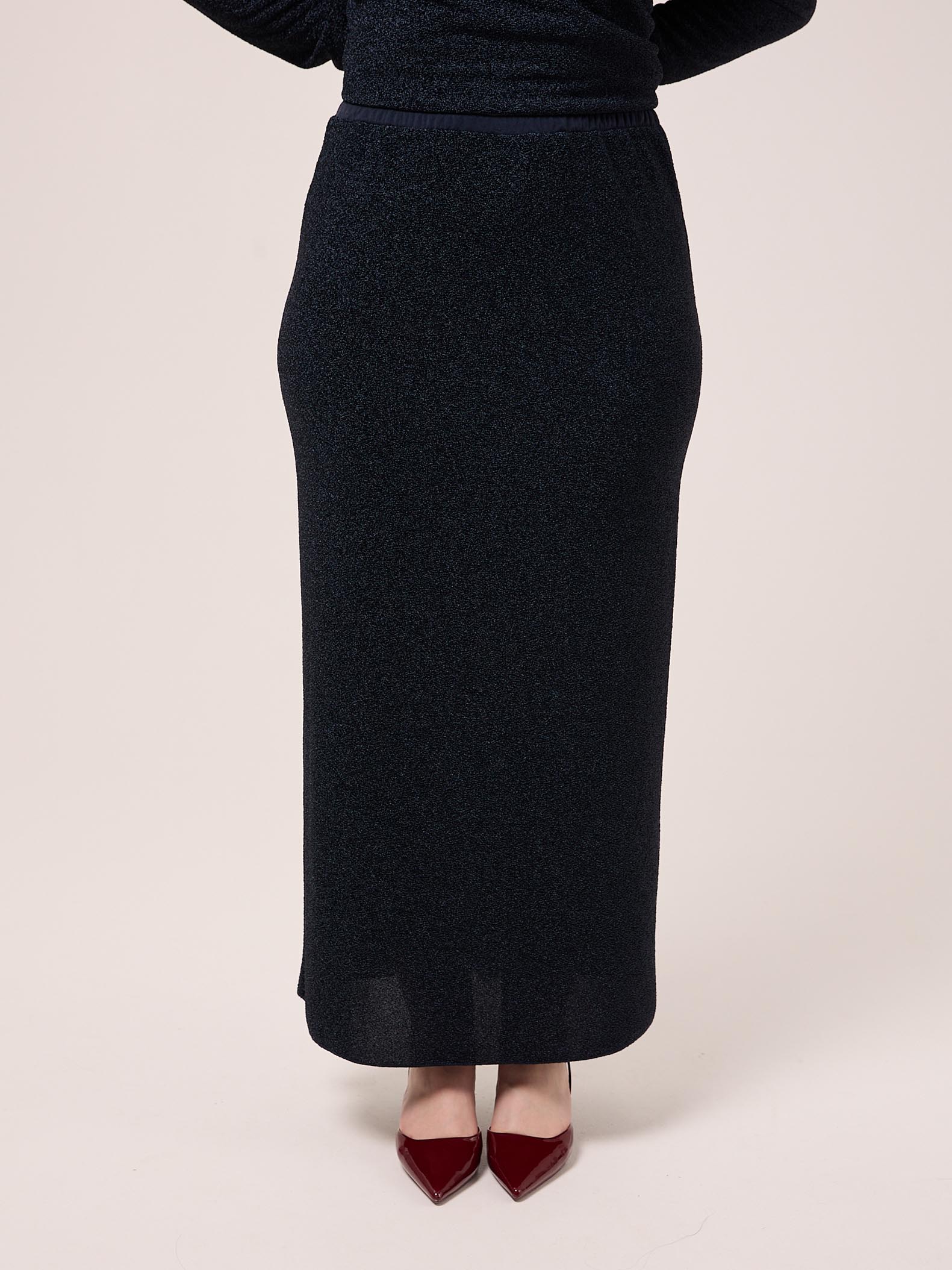 Костюм состоит из юбки и блузона. Юбка макси прямого кроя с разрезом сзади. Пояс с эластичной тесьмой внутри. Блузон прямого кроя со спущенным плечевым поясом. Вырез горловины-небольшая «лодочка». Рукава узкие, длинные, со сборкой внизу. Низ блузона на эластичной тесьме. Костюм выполнен из фактурного трикотажа с люрексом в двух цветах: темно-синем и серебряном.