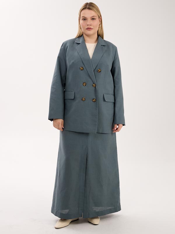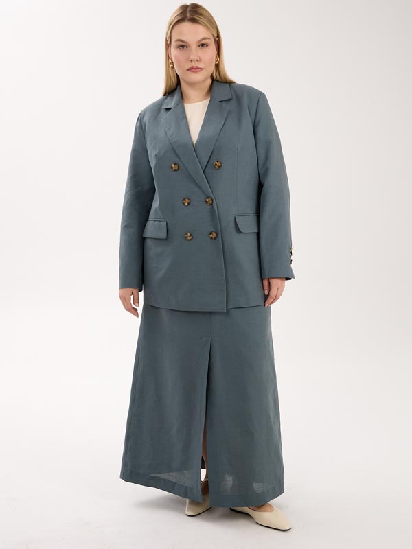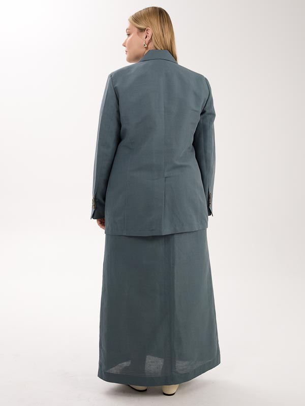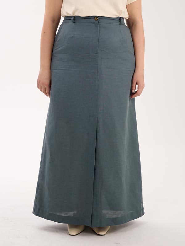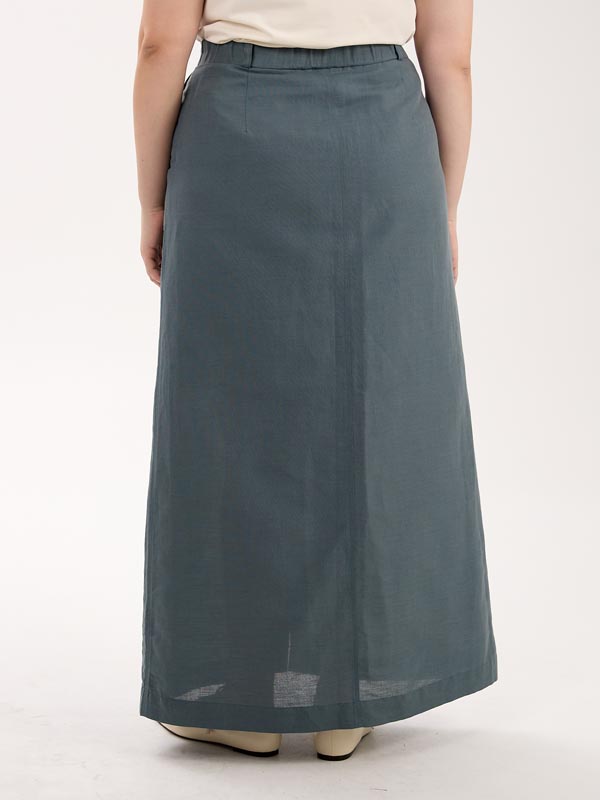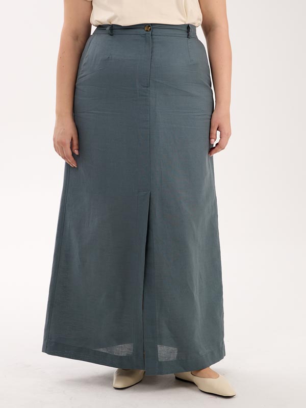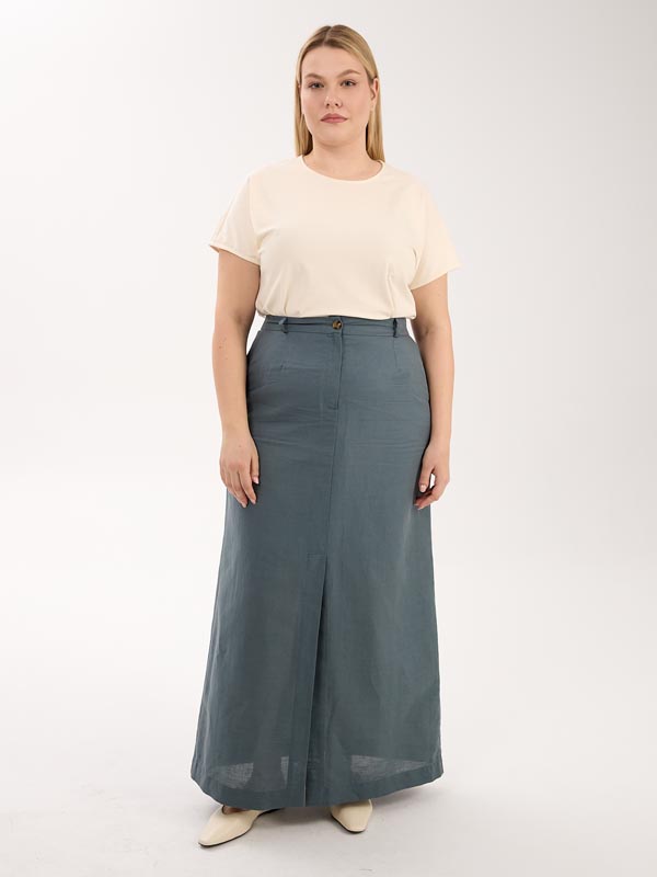А-образная юбка длиной макси. Пояс притачной, частично ( по спинке) с эластичной тесьмой внутри. Юбка с функциональным гульфиком, и шлицей спереди. Есть боковые карманы. Изделие выполнено из испанской хлопковой ткани на подкладке. Цвета: серо-голубой, эффектная серо-белая полоска.
