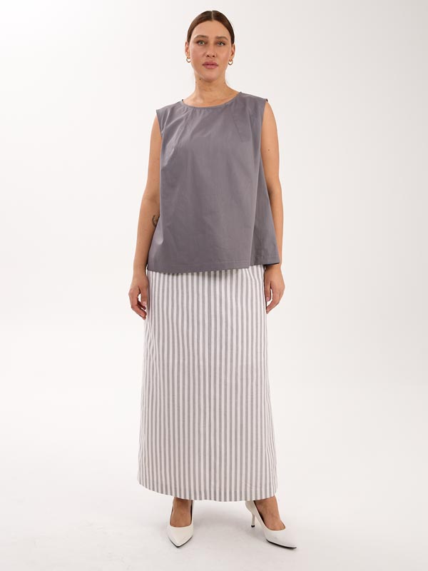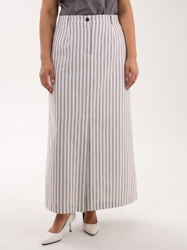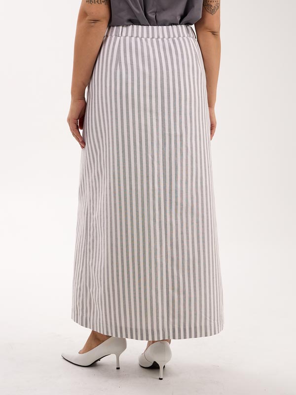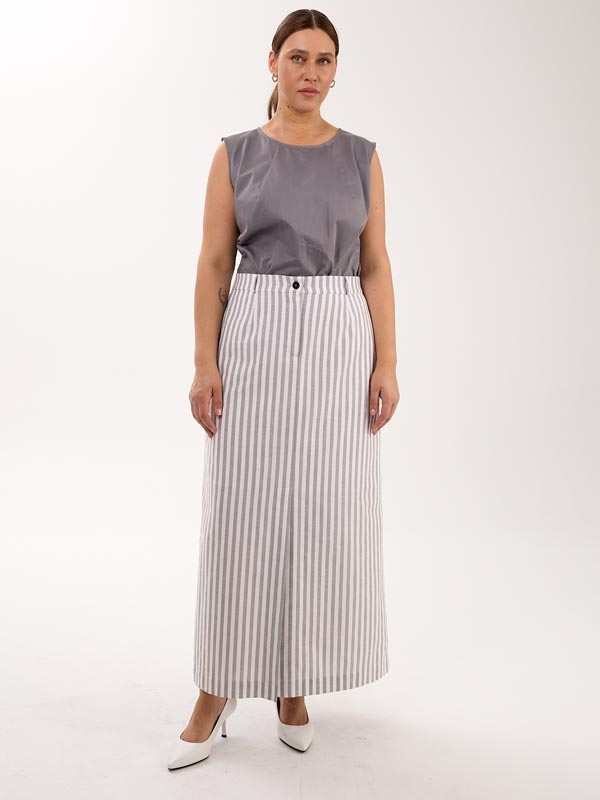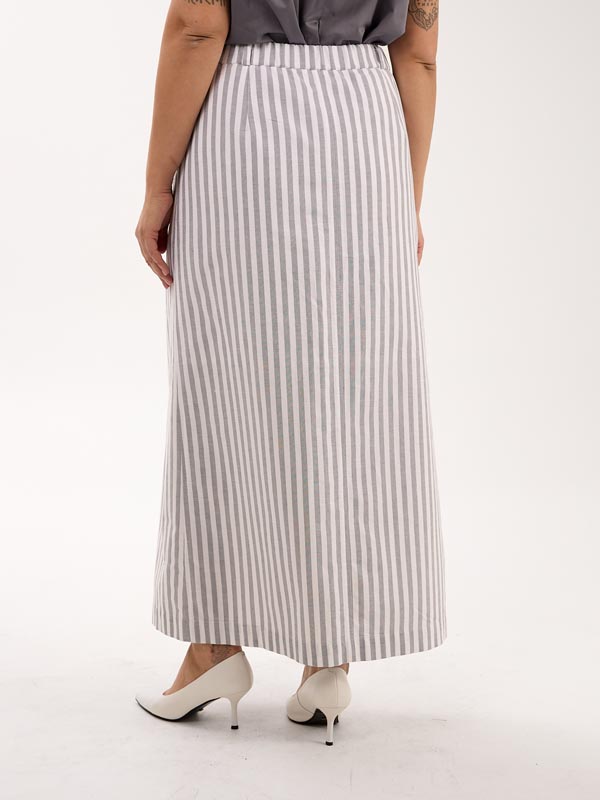 А-образная юбка длиной макси. Пояс притачной, частично ( по спинке) с эластичной тесьмой внутри. Юбка с функциональным гульфиком, и шлицей спереди. Есть боковые карманы. Изделие выполнено из испанской хлопковой ткани на подкладке. Цвета: серо-голубой, эффектная серо-белая полоска.