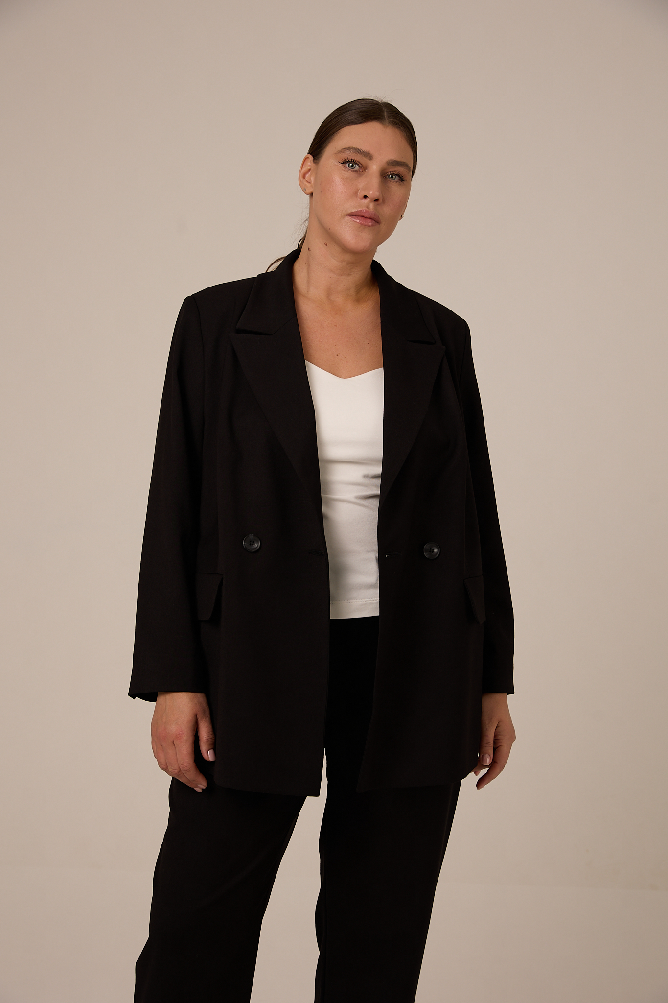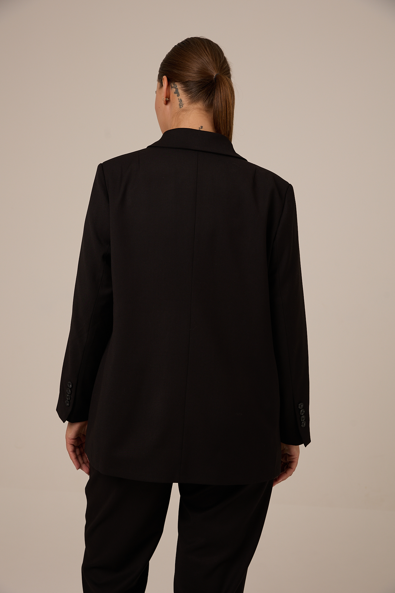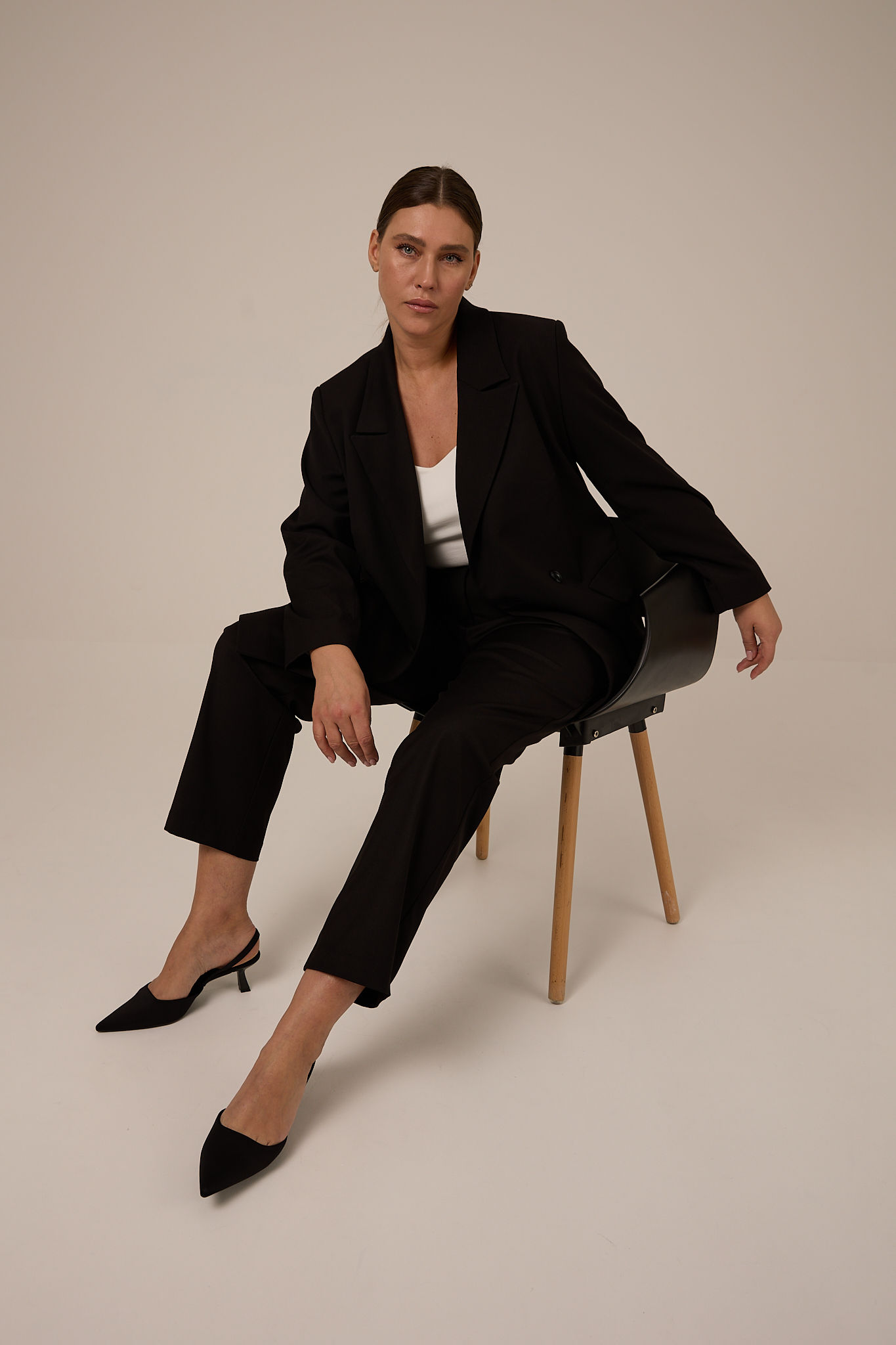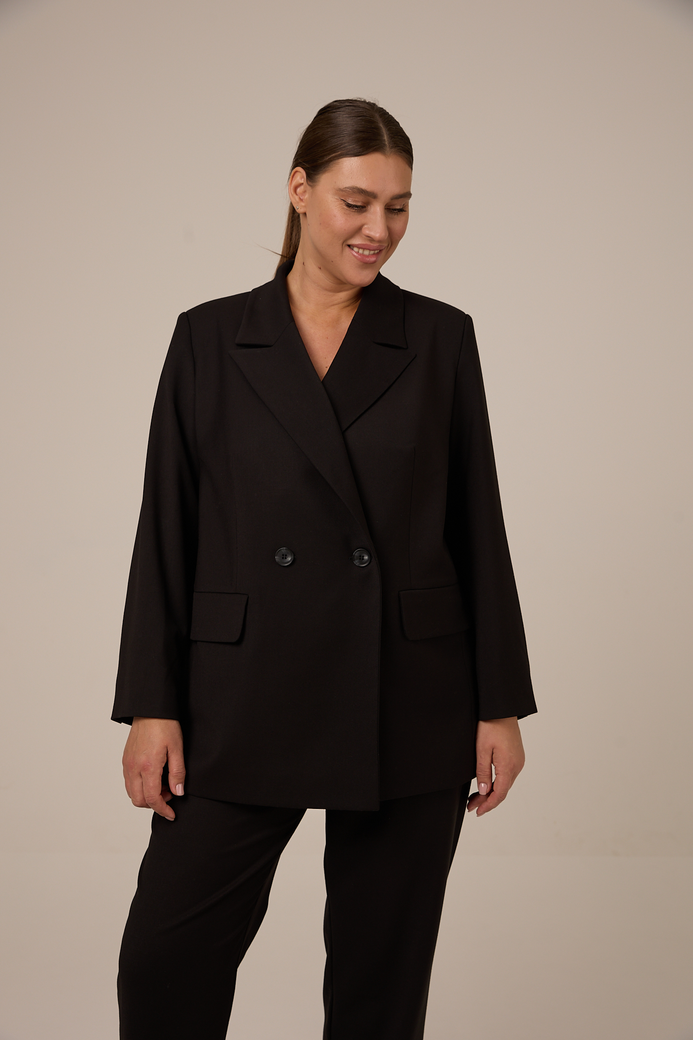 Жакет является частью костюма GIL.Костюм состоит из жакета и брюк. Жакет двубортный, полуприлегающего силуэта. Воротник английский с лацканами. Рукава двухшовные со шлицей. Карманы прорезные с клапанами, расположены горизонтально. Изделие застегивается на петли и пуговицы. Жакет выполнен из вискозосодержащей костюмной ткани на подкладке в серо-розовом и черном цветах. Брюки с классической посадкой, полуприлегающие в области бедер, немного заужены к низу. Длина до щиколотки. Пояс притачной, по спинке с эластичной тесьмой внутри. Боковые карманы на передних половинках. На задних половинках ложные карманы «в рамку». Застежка спереди. Брюки выполнены из вискозосодержащей ткани в серо-розовом и черном цветах.