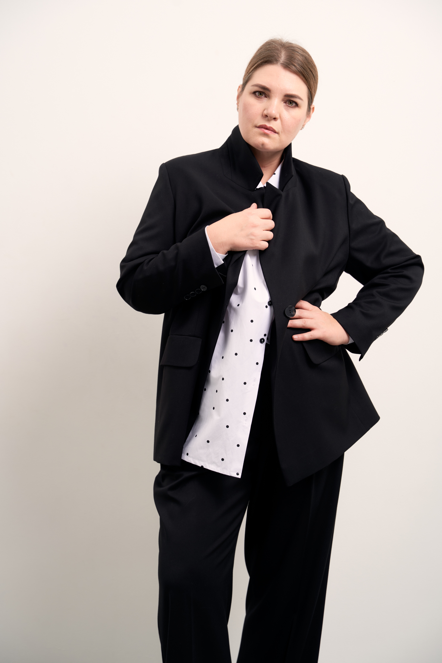 Жакет полуприлегающего силуэта на подкладке. Воротник «пиджачного» типа с лацканами. Рукава втачные, двухшовные со шлицей внизу. Боковые карманы прорезные с клапанами, расположены горизонтально. Жакет застегивается на две пуговицы.