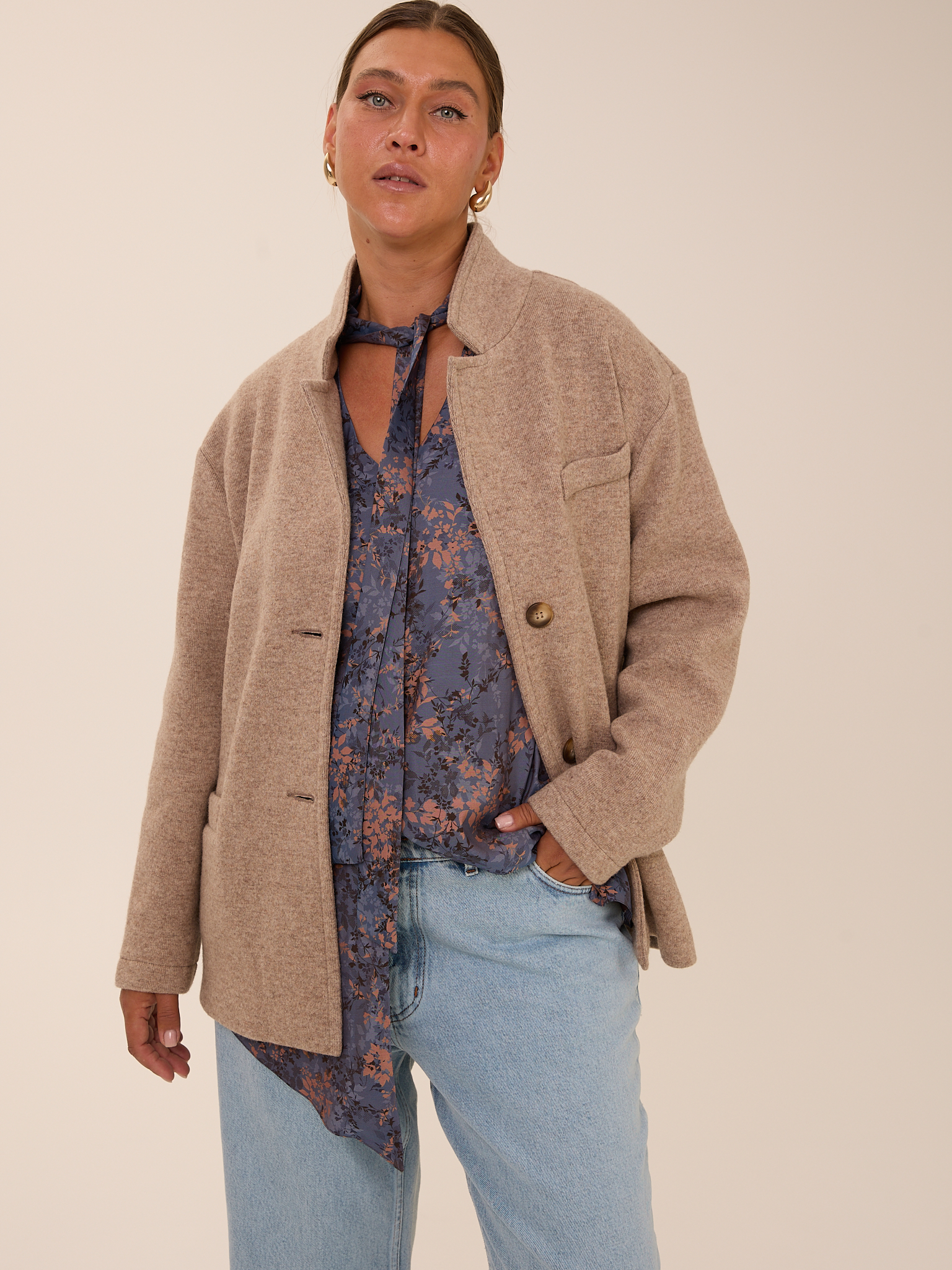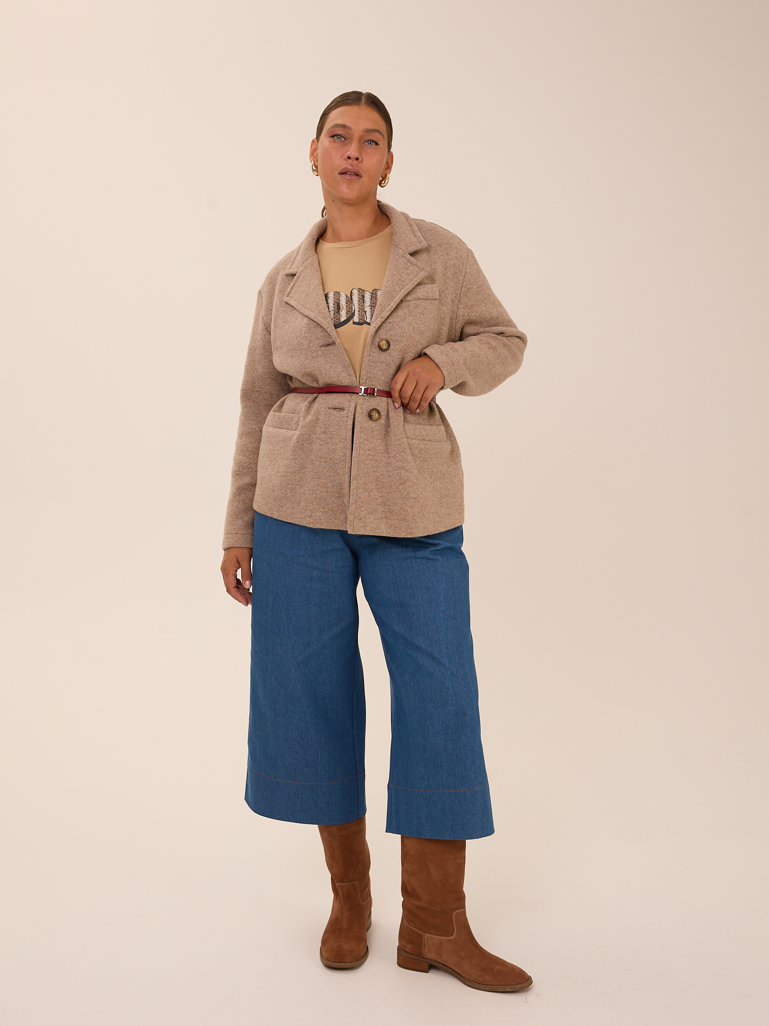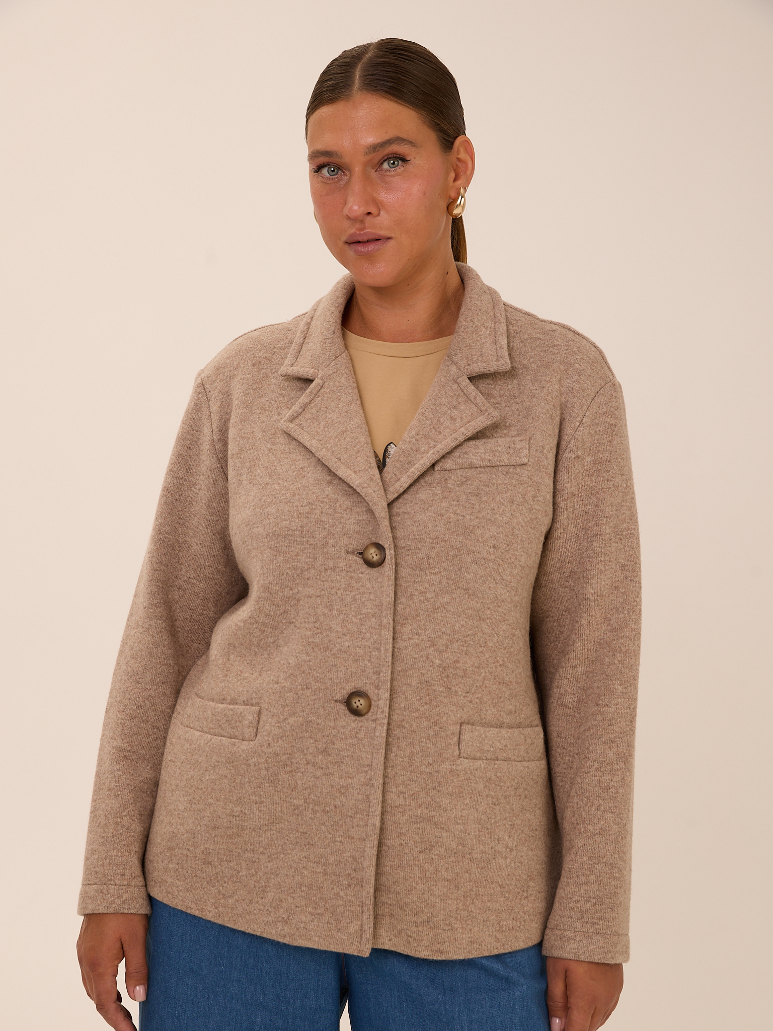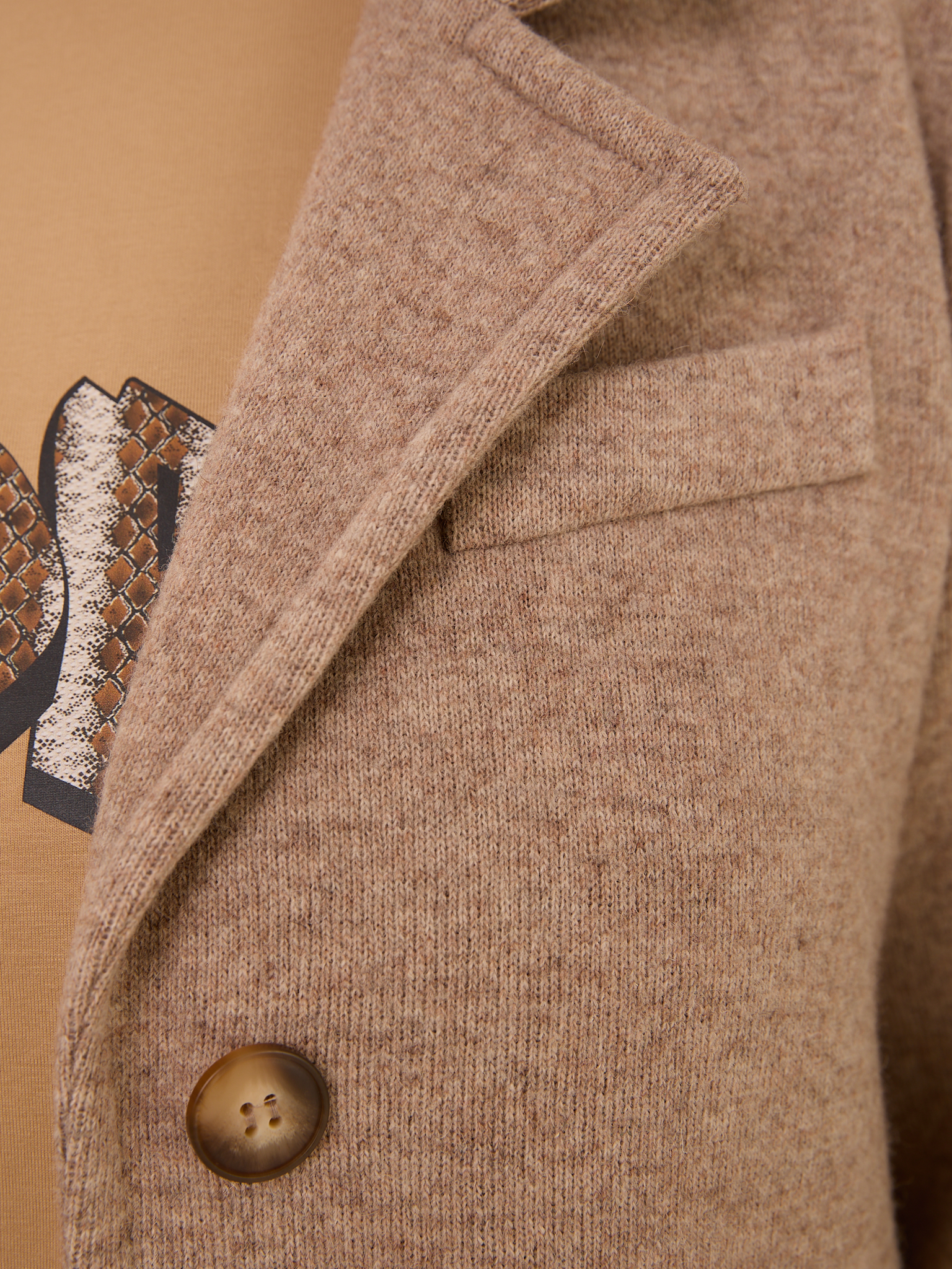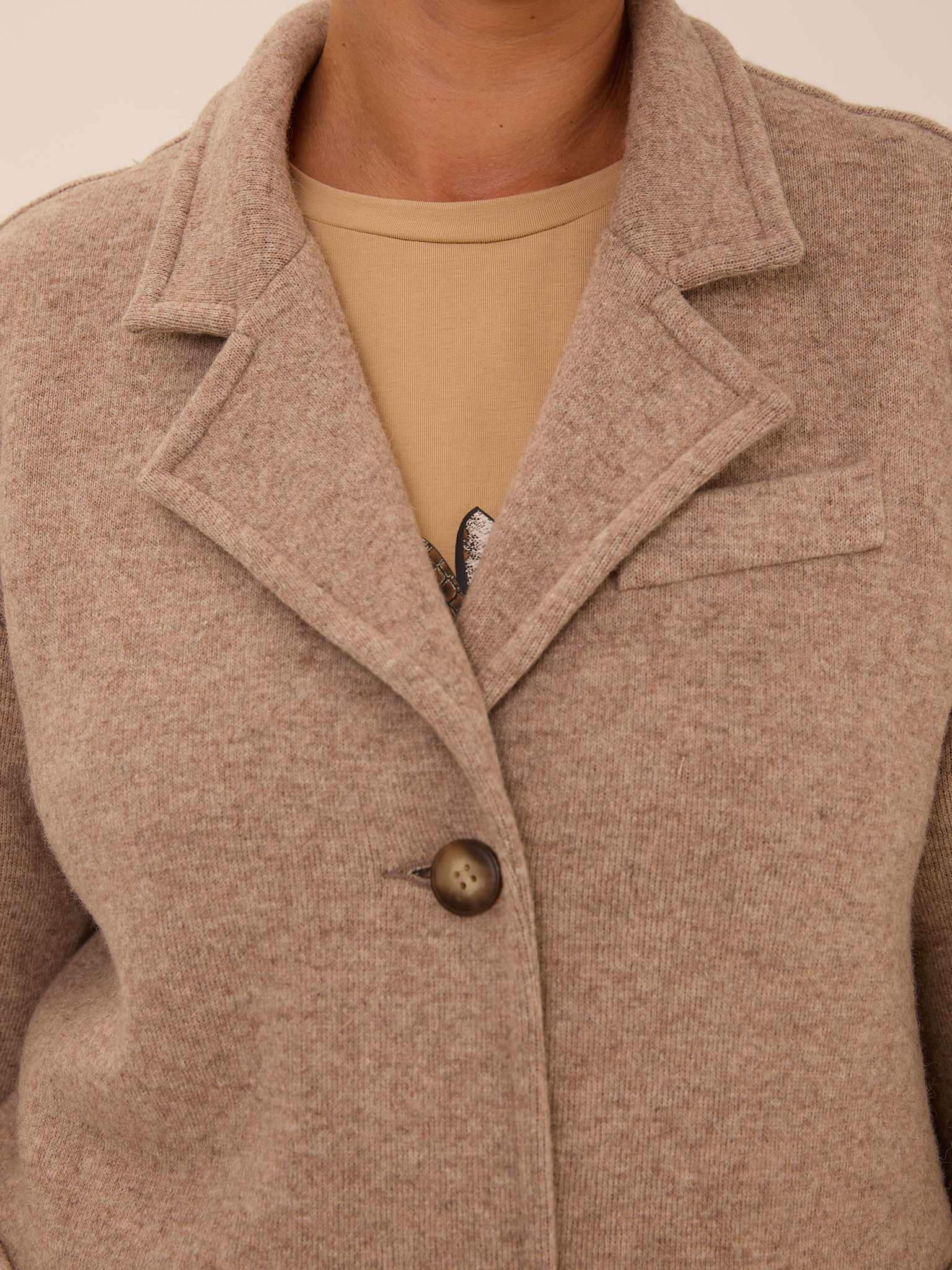 Трикотажный жакет прямого кроя. Плечевой пояс немного приспущен. Воротник английский с лацканами. Боковые карманы прорезные с листочками, расположены горизонтально. На левой полочке есть ложная листочка. Застегивается жакет на петли и пуговицы. Выполнен из двухстороннего шерстяного трикотажа без подкладки.