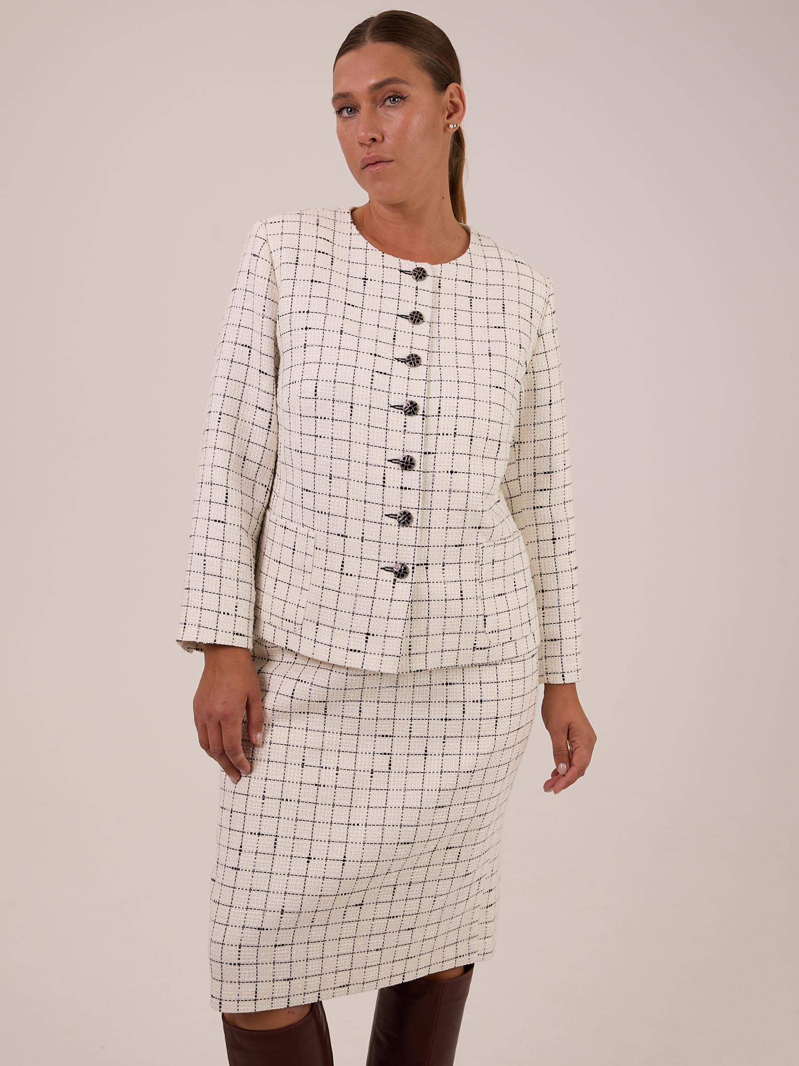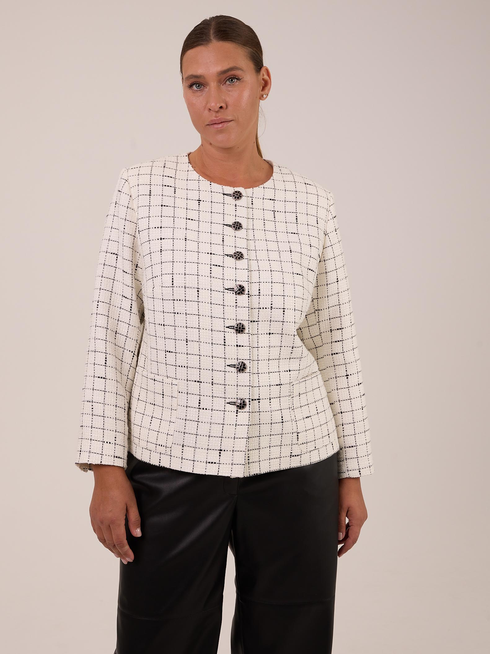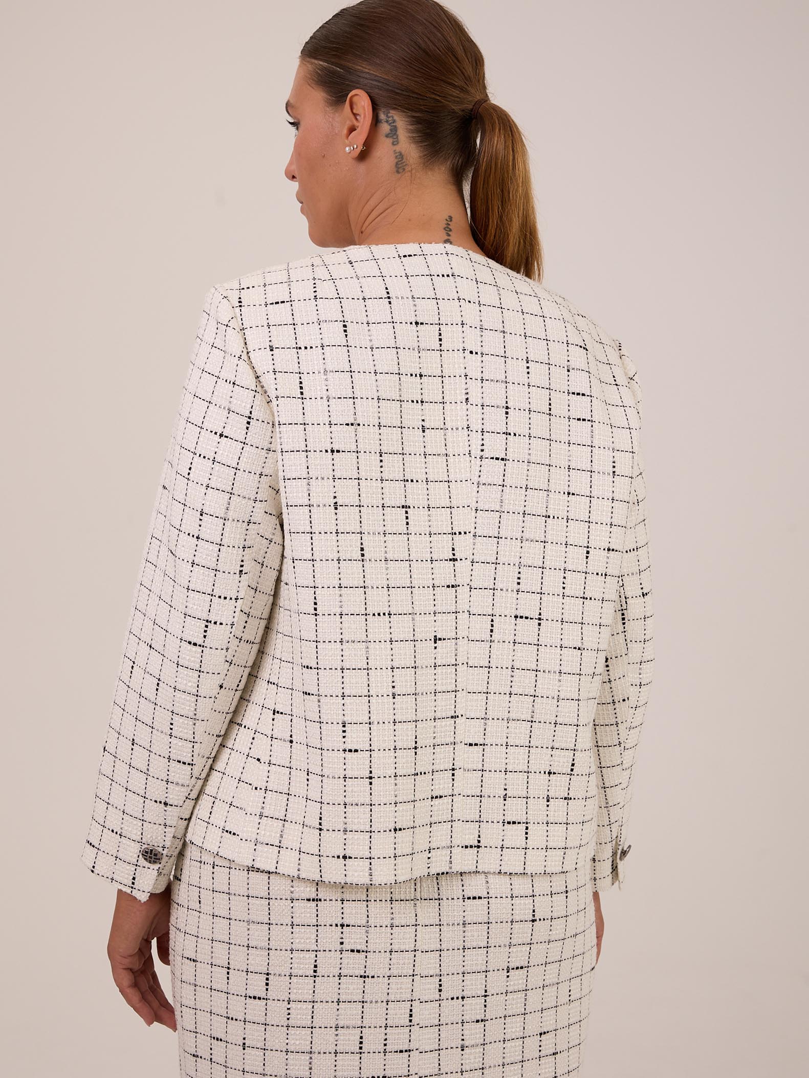 Жакет является частью костюма LUISA. Укороченный жакет полуприлегающего силуэта без воротника. Вырез горловины круглый. Рукава двухшовные с небольшими шлицами. Боковые карманы накладные. Застегивается жакет на петли и пуговицы. Выполнен из костюмной ткани типа «шанель» с содержанием хлопка. Подкладка-поливискоза. Цвет белый в черную клетку.