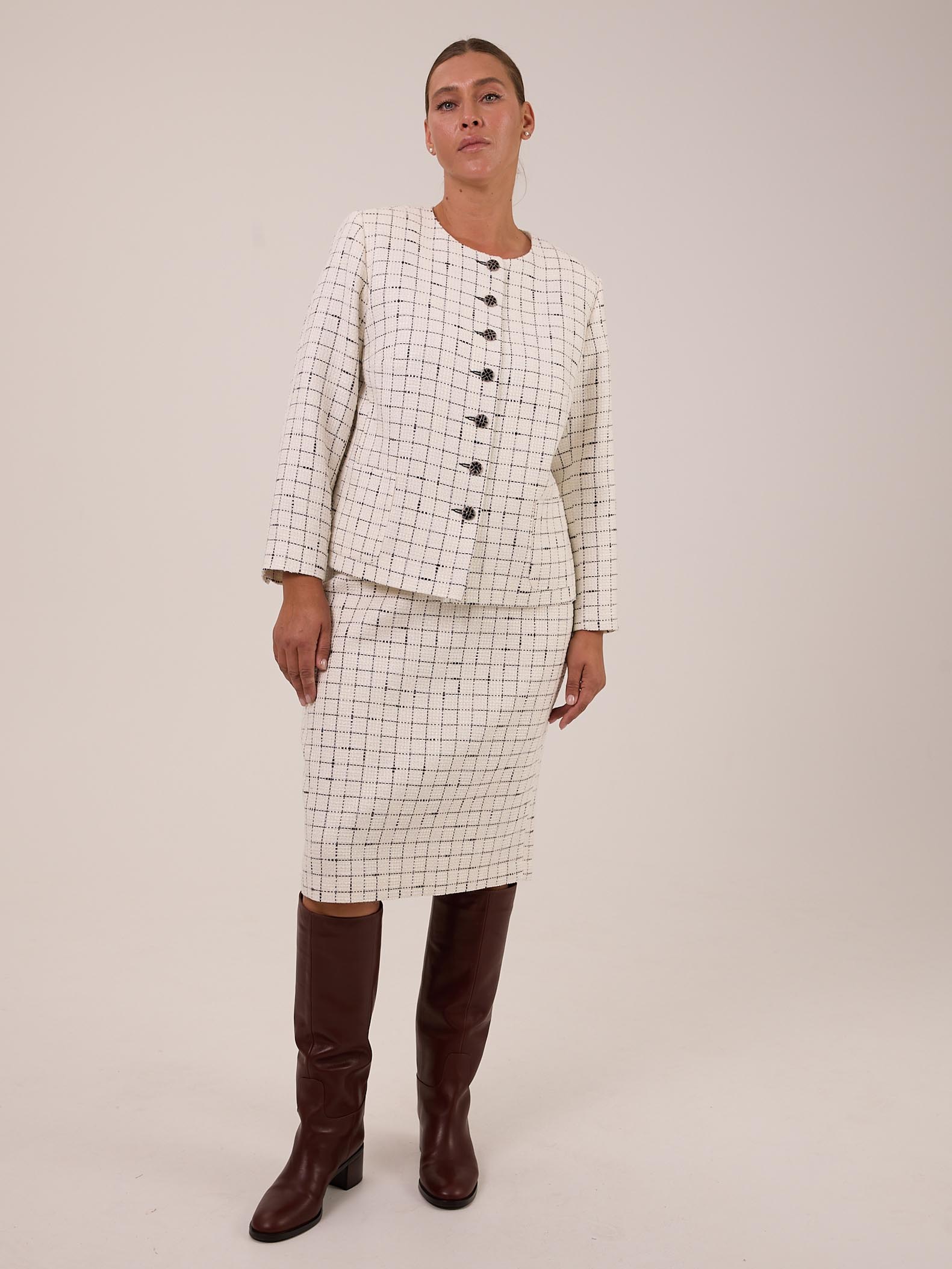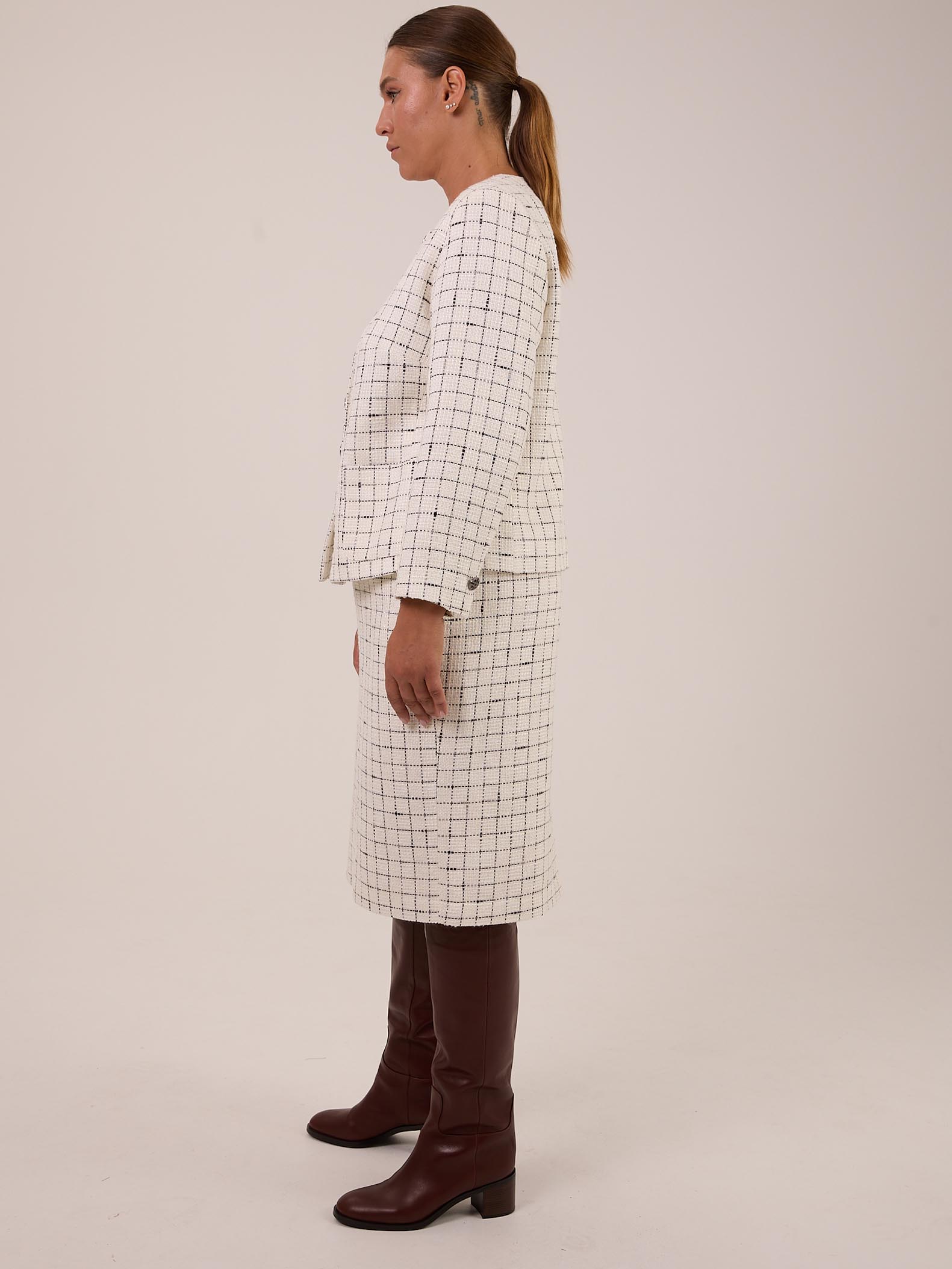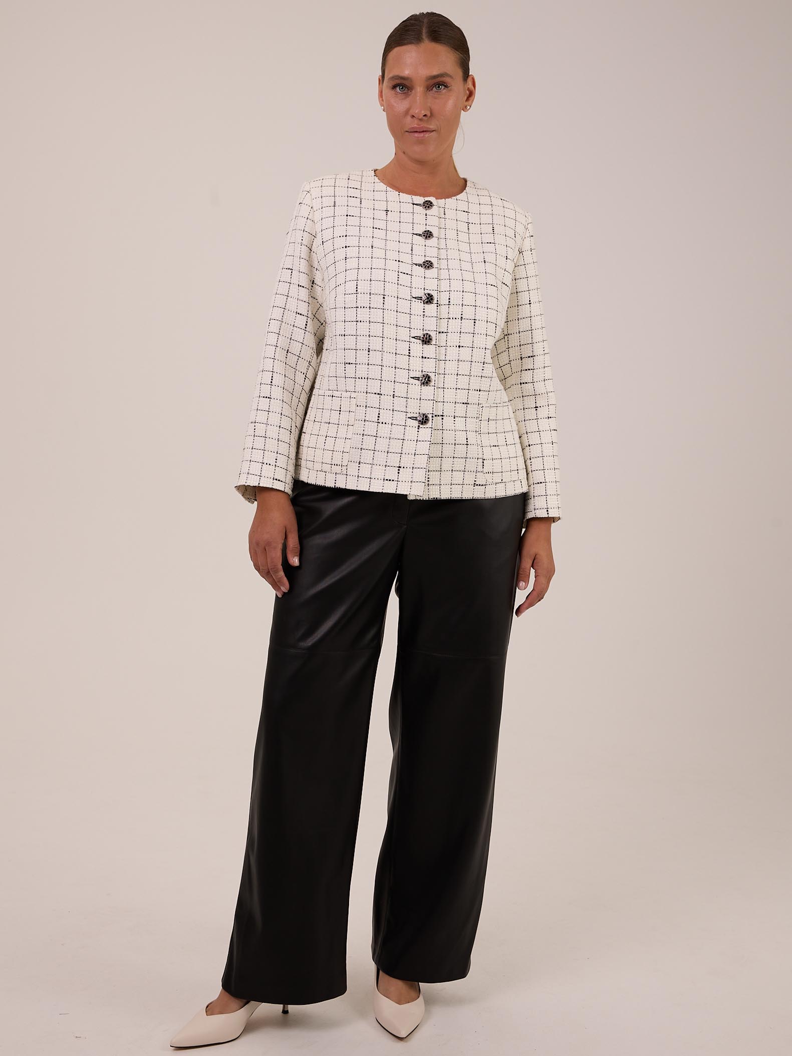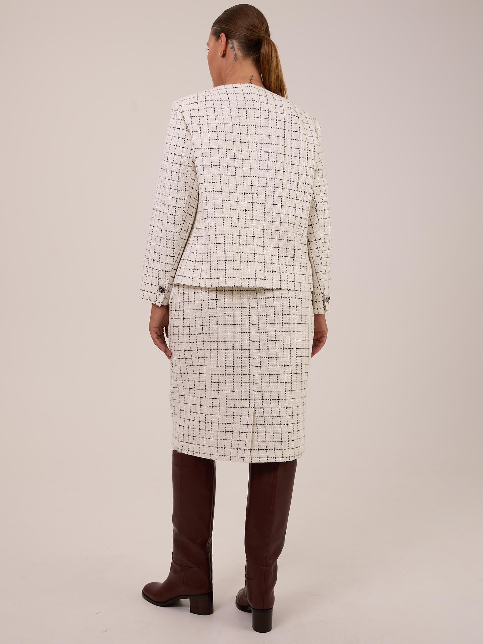Жакет является частью костюма LUISA. Укороченный жакет полуприлегающего силуэта без воротника. Вырез горловины круглый. Рукава двухшовные с небольшими шлицами. Боковые карманы накладные. Застегивается жакет на петли и пуговицы. Выполнен из костюмной ткани типа «шанель» с содержанием хлопка. Подкладка-поливискоза. Цвет белый в черную клетку.