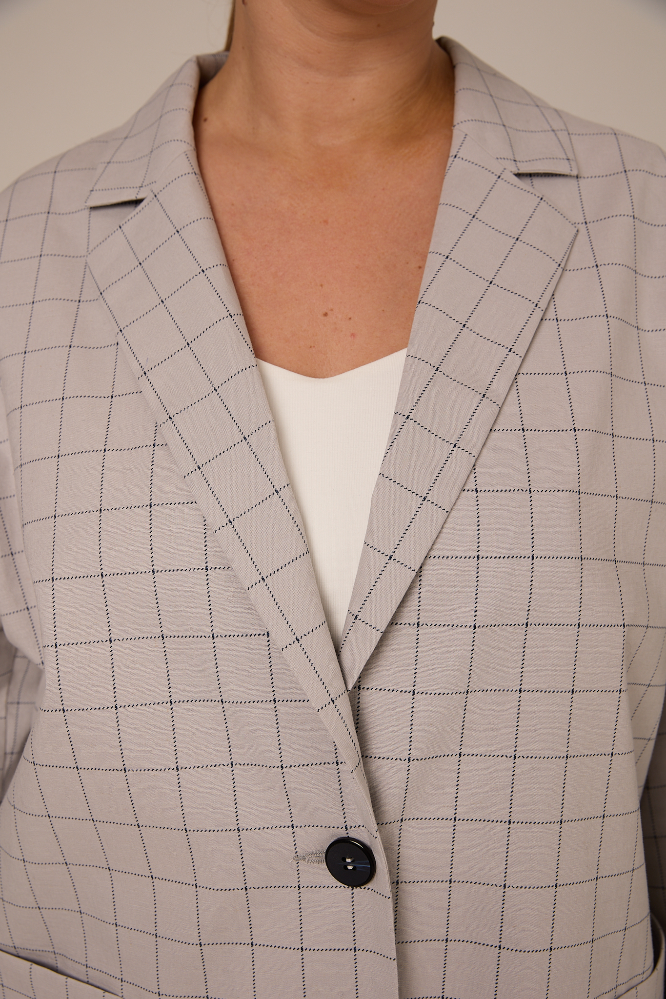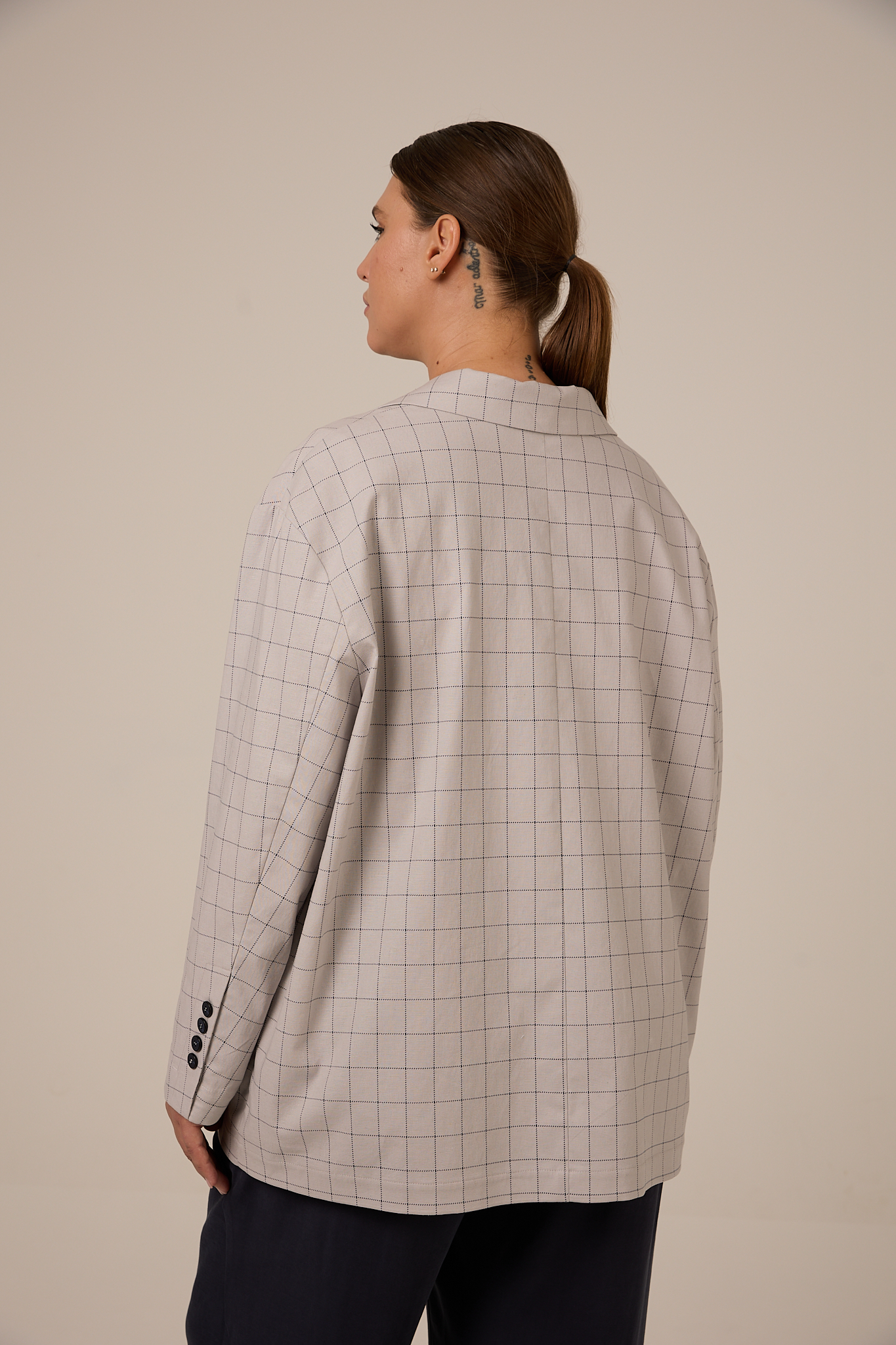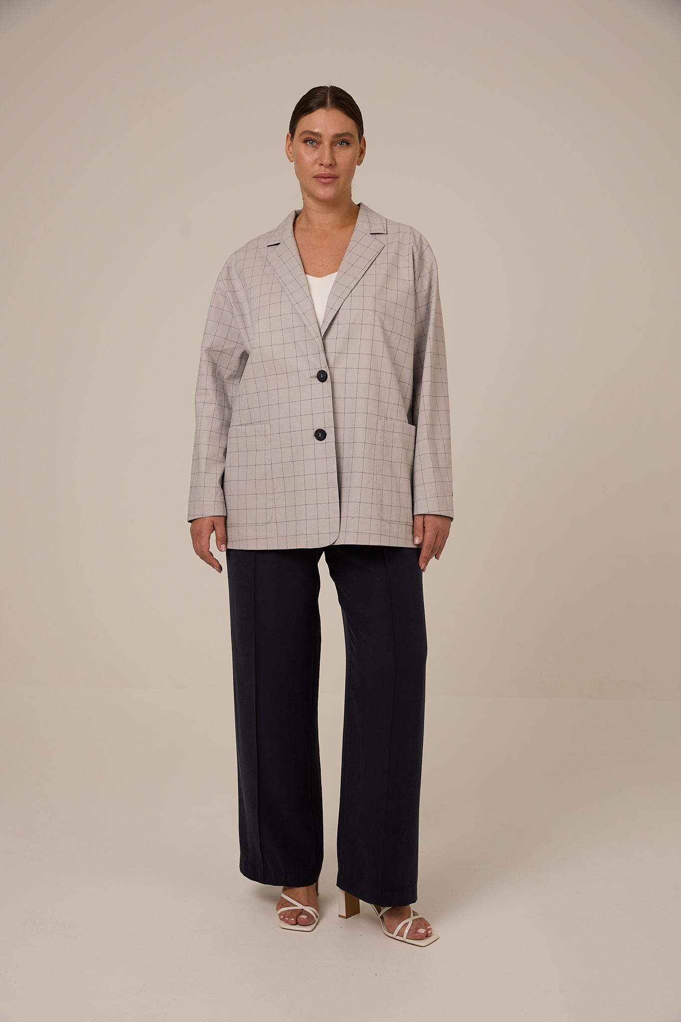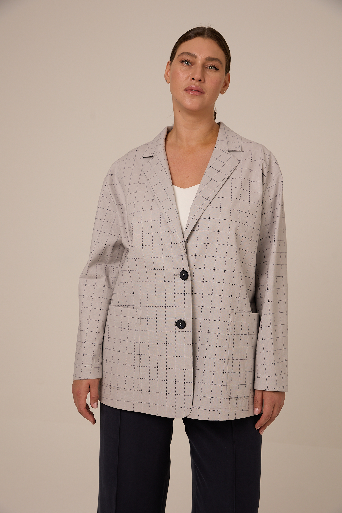 Жакет прямого кроя, свободный, со спущенным плечевым поясом. Воротник английский с лацканами. Рукава двухшовные с ложной шлицей. Карманы накладные. Жакет застегивается на петли и пуговицы. Выполнено изделие без подкладки из плотного хлопка. Цвета: серая клетка и синяя клетка.