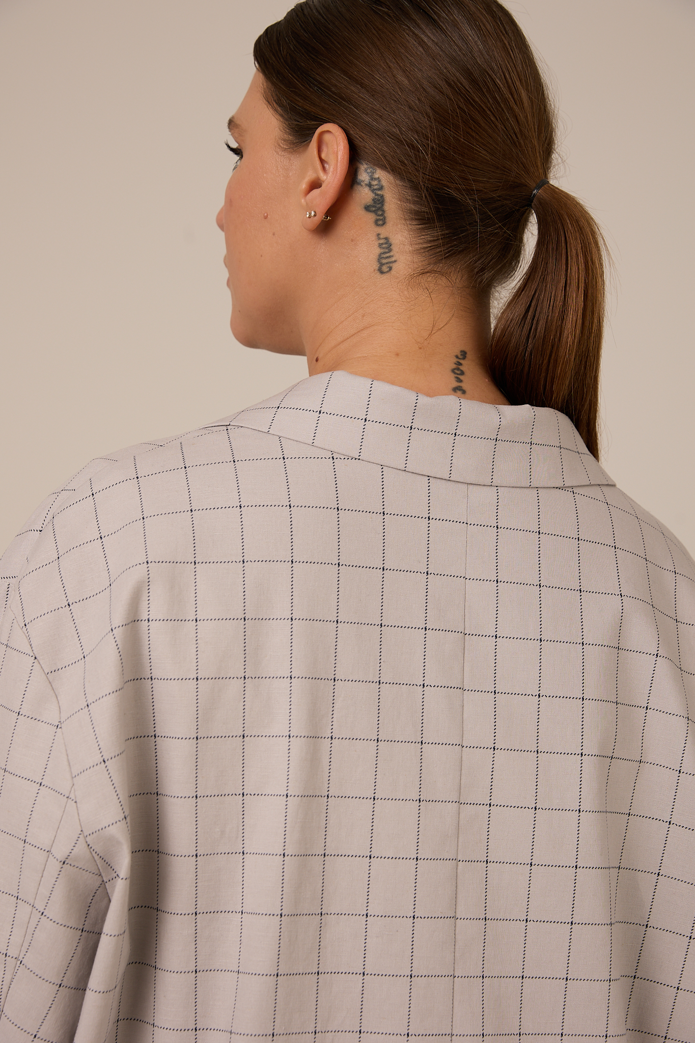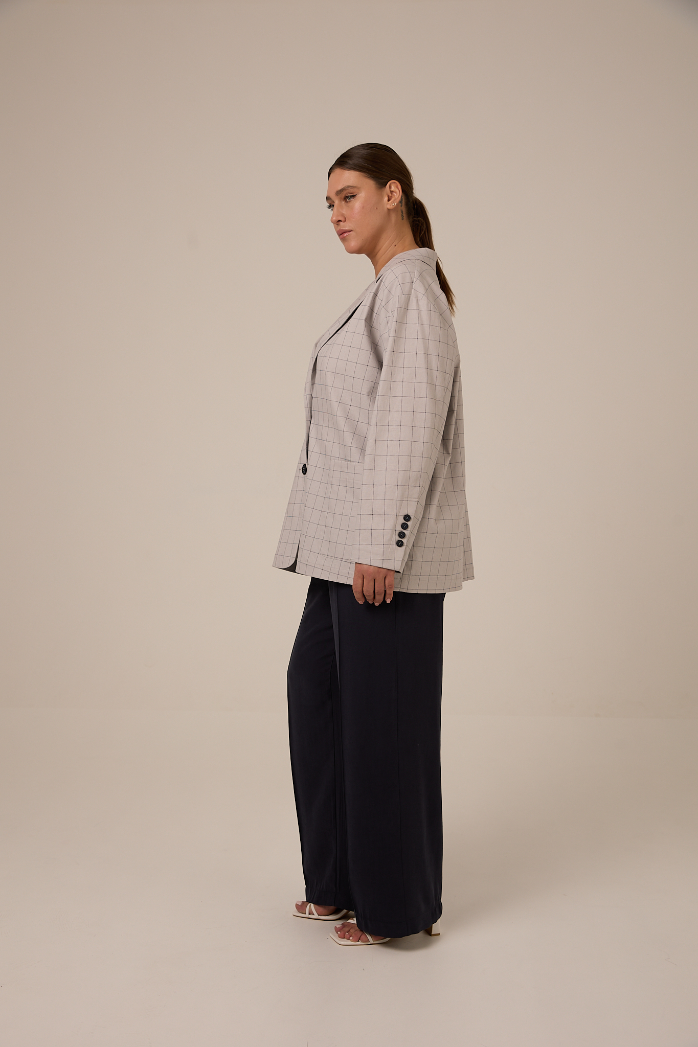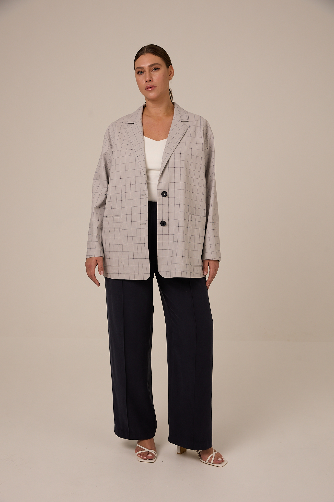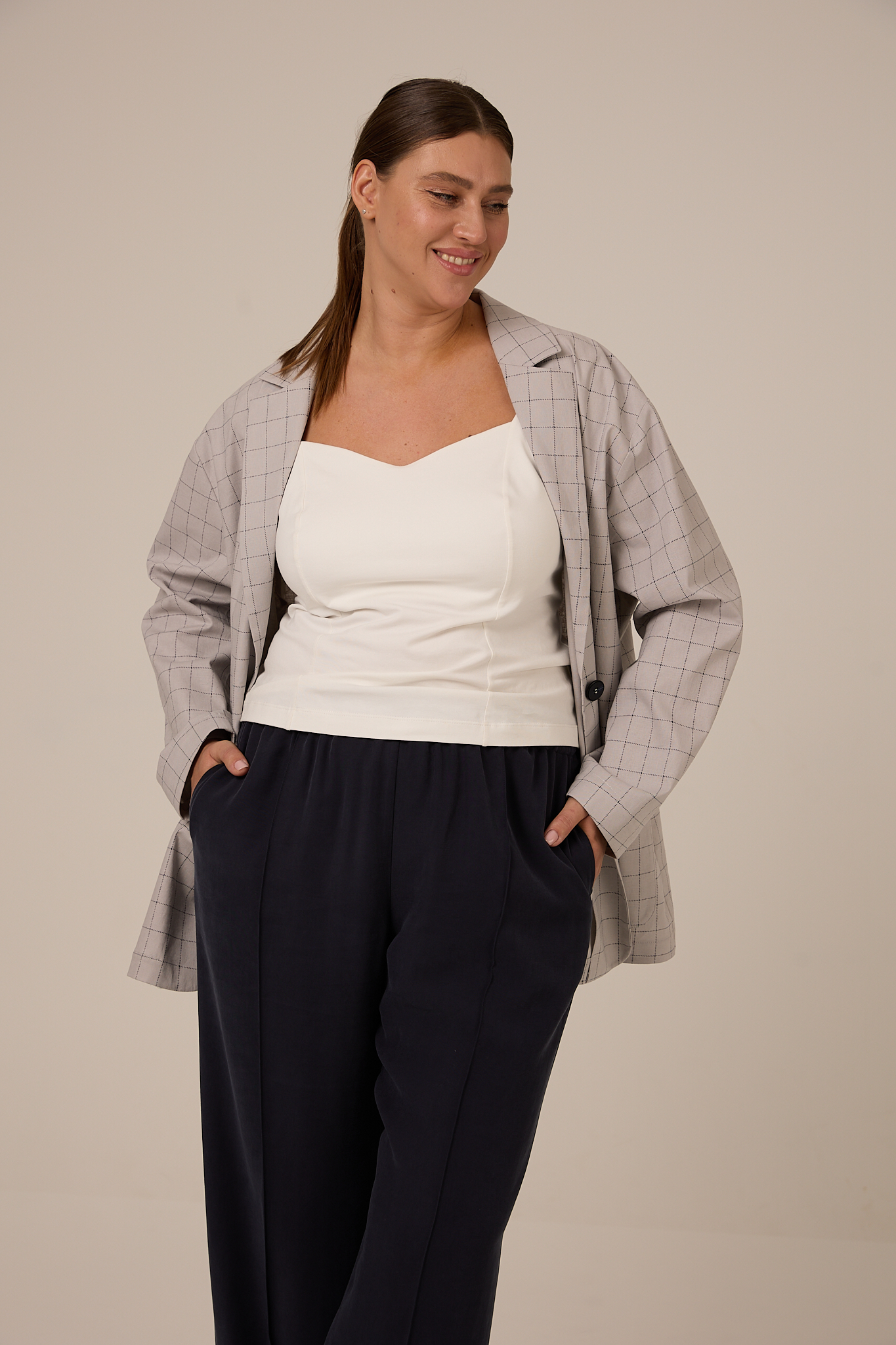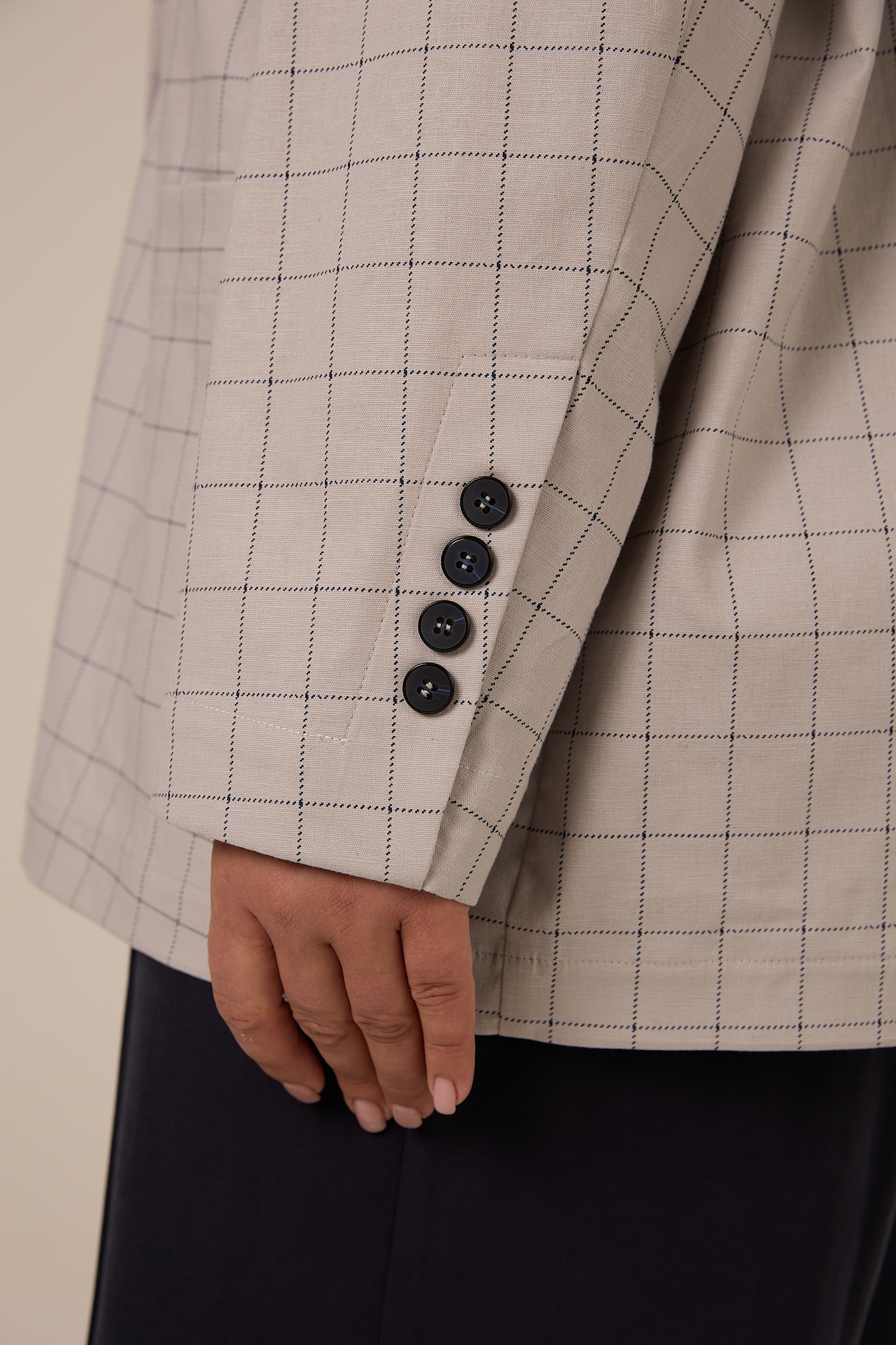 Жакет прямого кроя, свободный, со спущенным плечевым поясом. Воротник английский с лацканами. Рукава двухшовные с ложной шлицей. Карманы накладные. Жакет застегивается на петли и пуговицы. Выполнено изделие без подкладки из плотного хлопка. Цвета: серая клетка и синяя клетка.