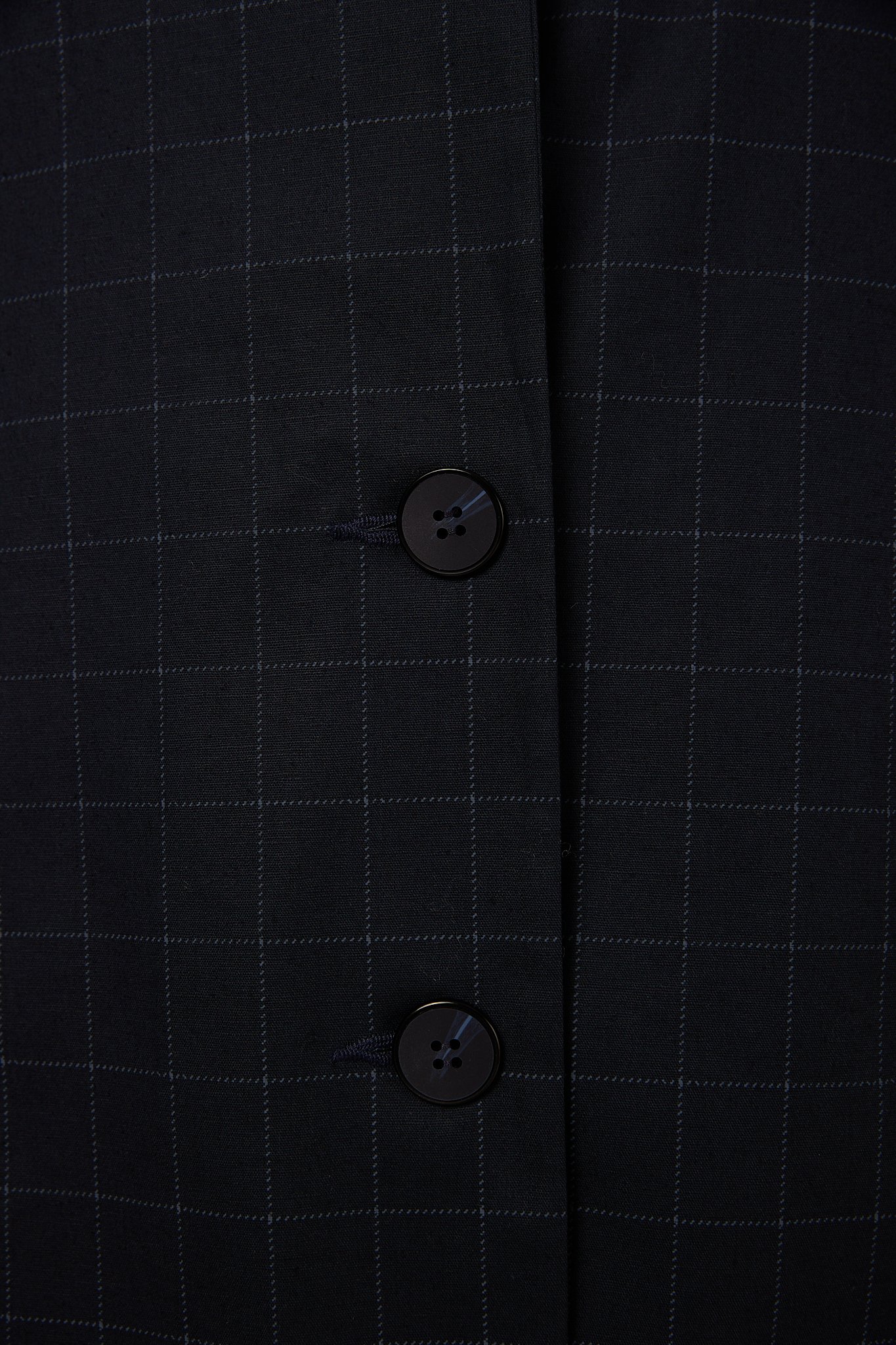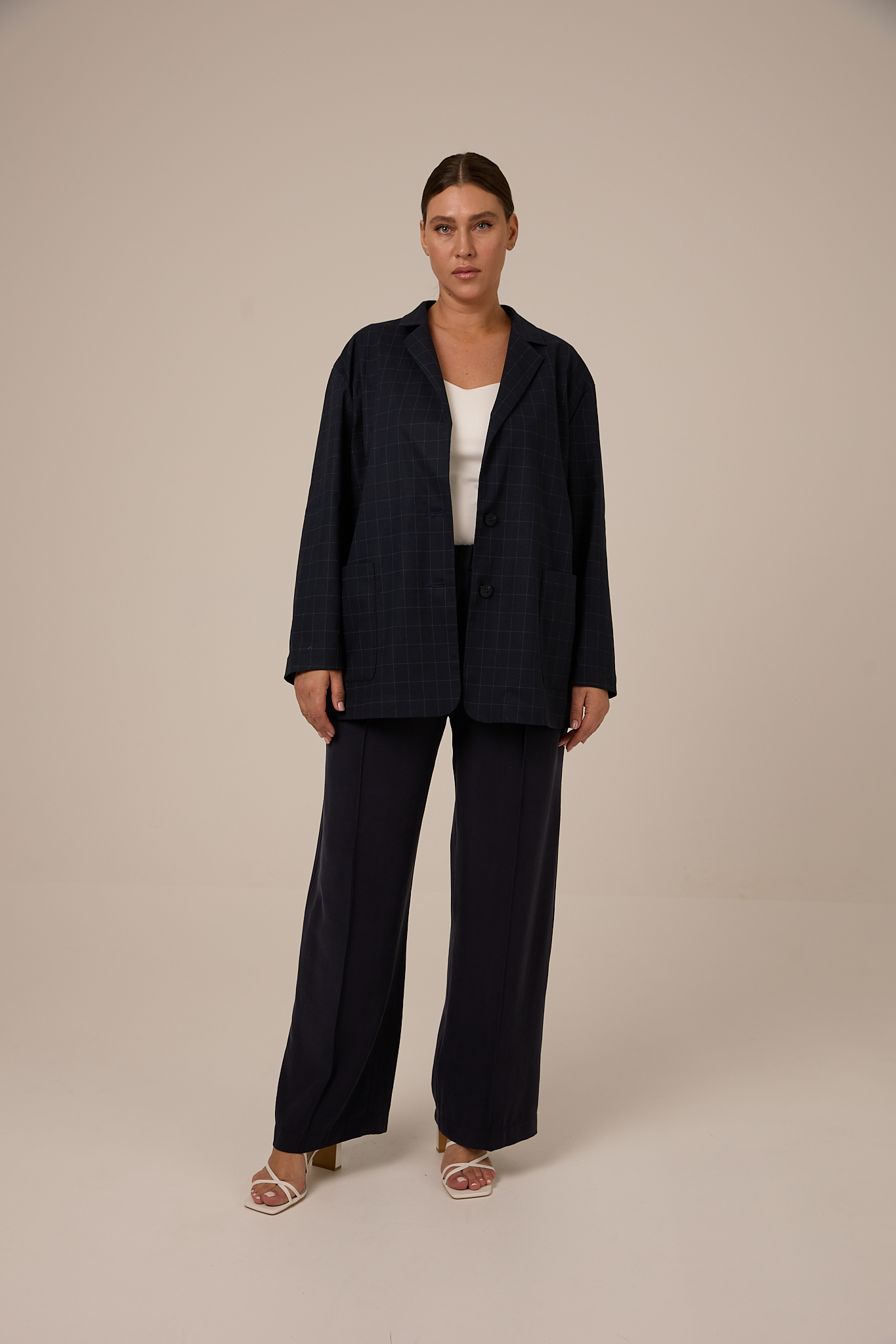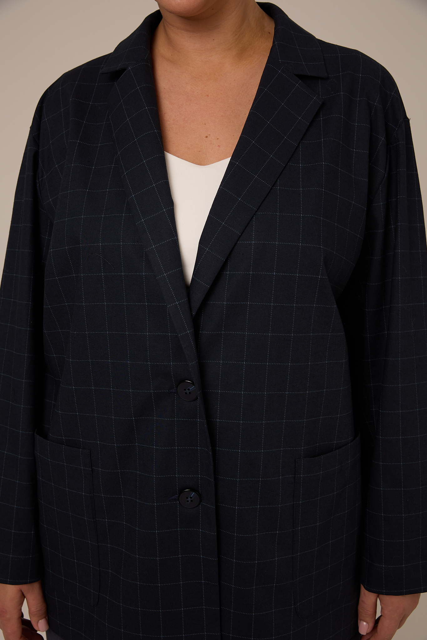 Жакет прямого кроя, свободный, со спущенным плечевым поясом. Воротник английский с лацканами. Рукава двухшовные с ложной шлицей. Карманы накладные. Жакет застегивается на петли и пуговицы. Выполнено изделие без подкладки из плотного хлопка. Цвета: серая клетка и синяя клетка.