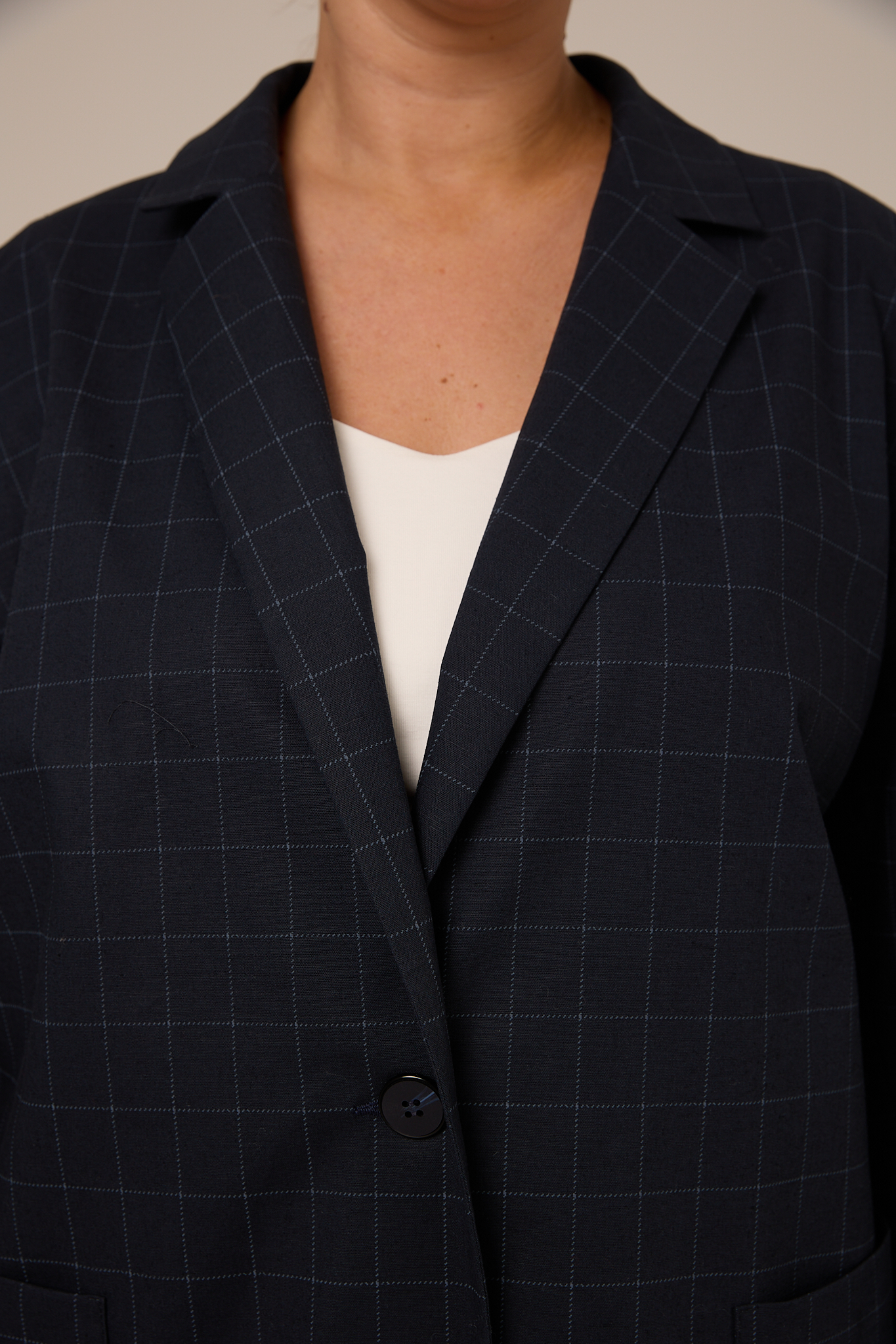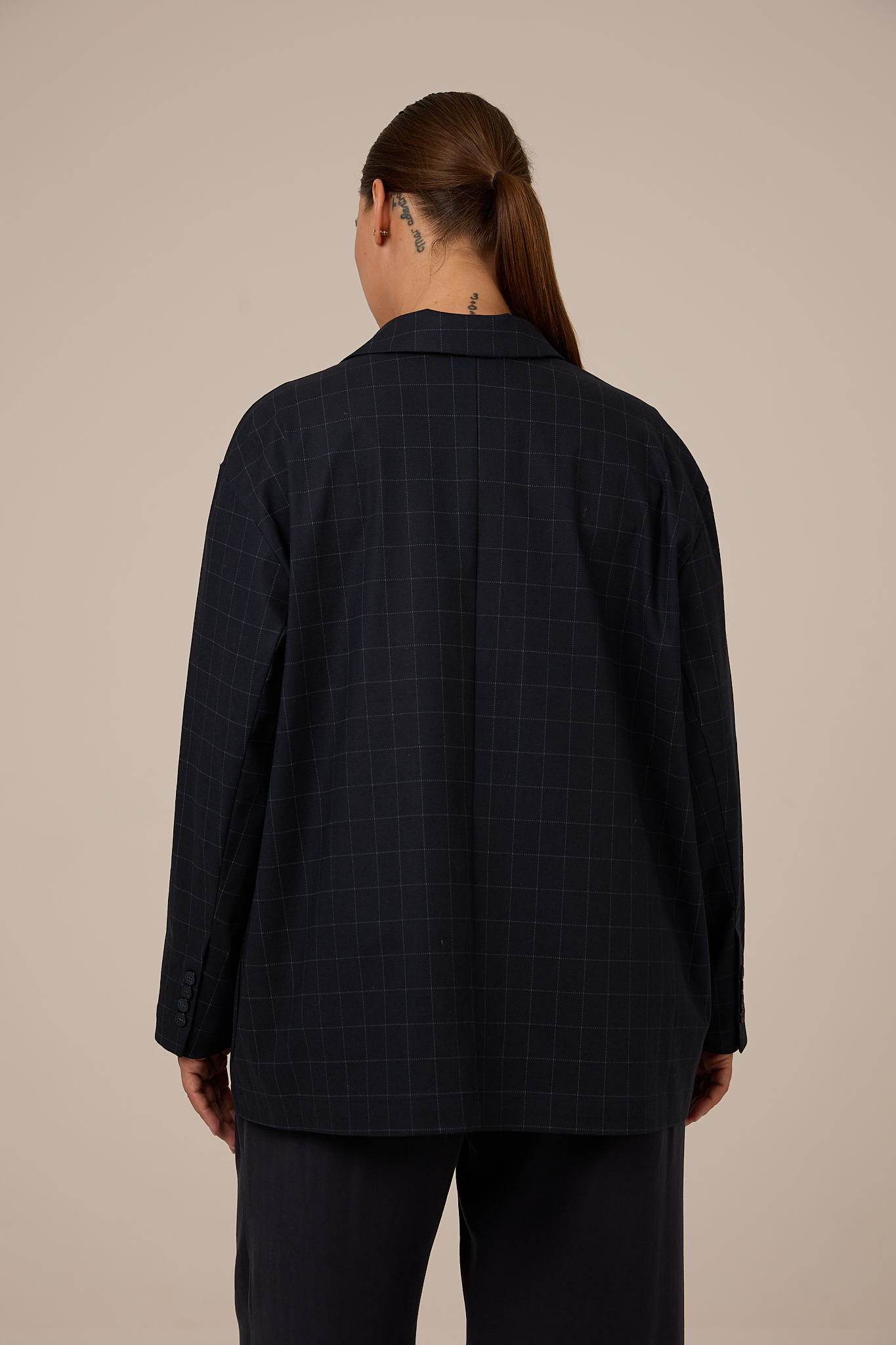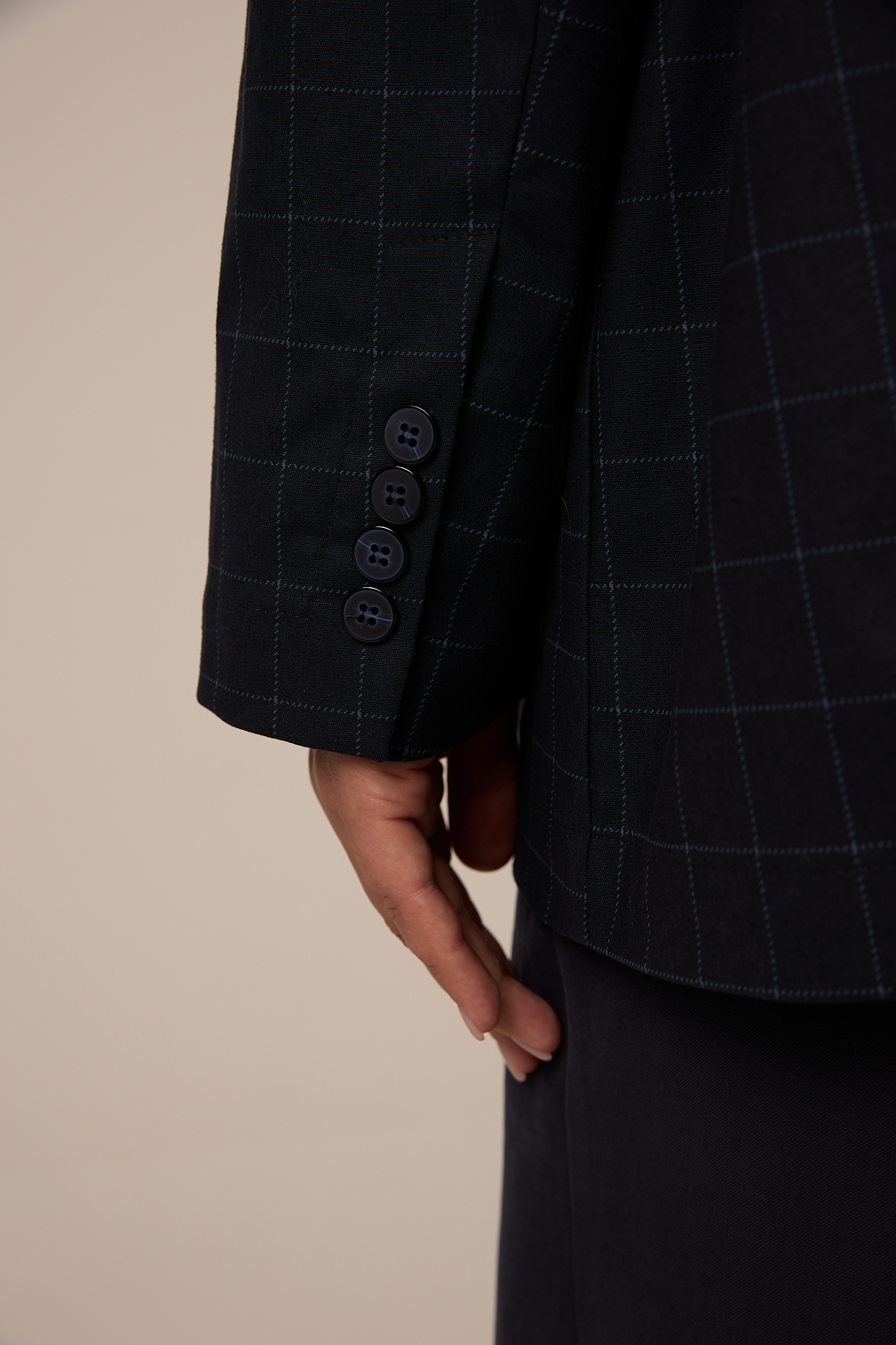 Жакет прямого кроя, свободный, со спущенным плечевым поясом. Воротник английский с лацканами. Рукава двухшовные с ложной шлицей. Карманы накладные. Жакет застегивается на петли и пуговицы. Выполнено изделие без подкладки из плотного хлопка. Цвета: серая клетка и синяя клетка.