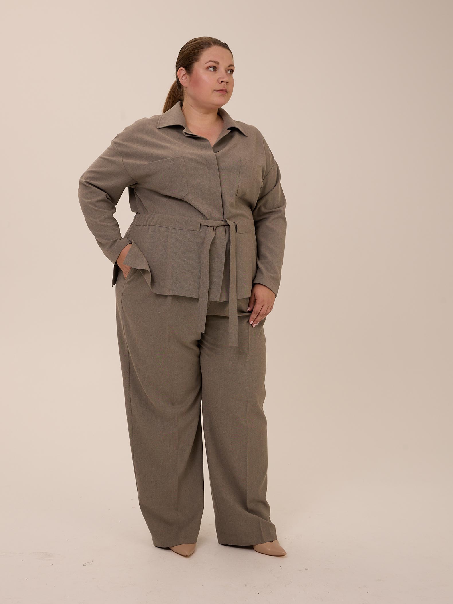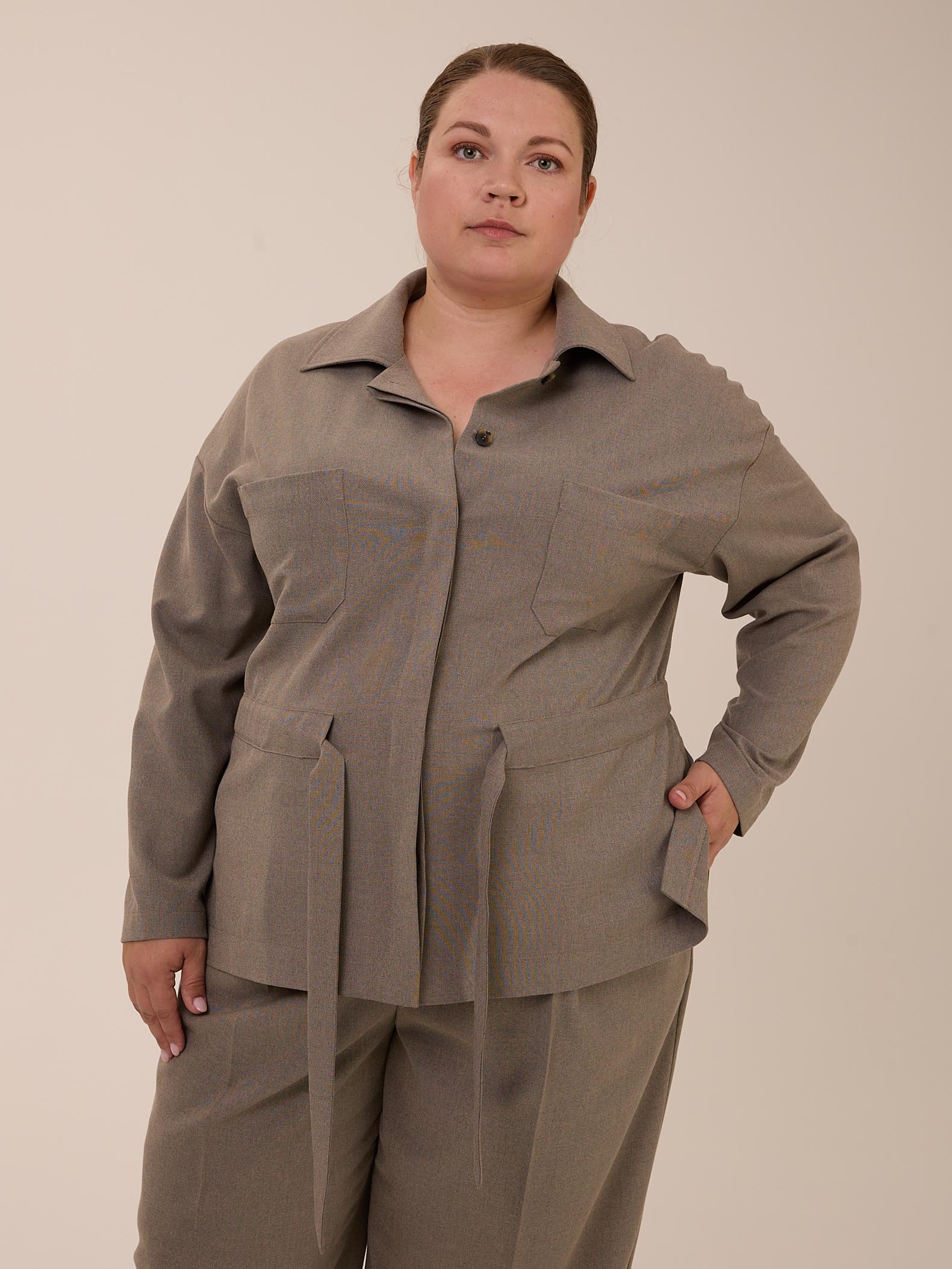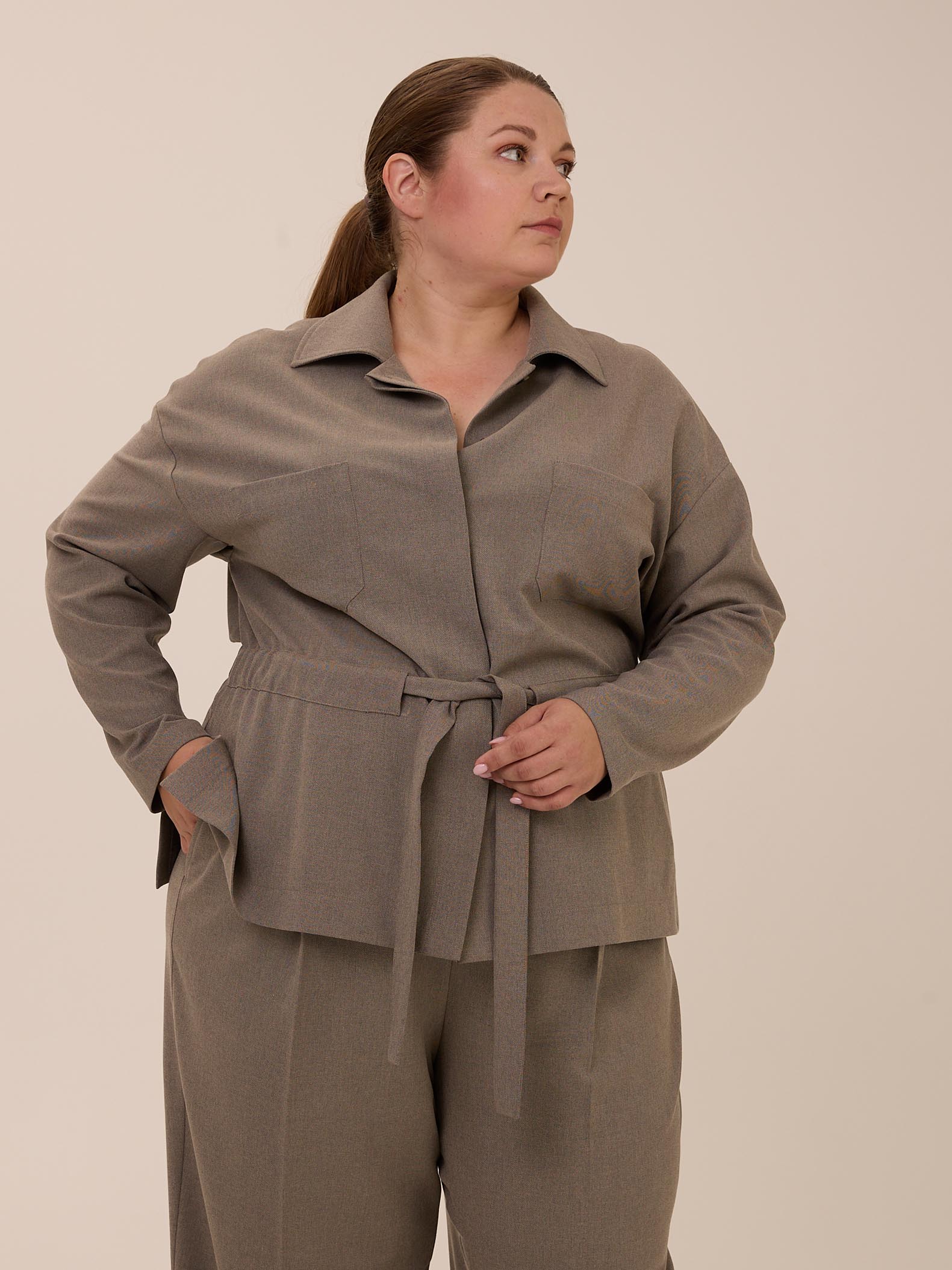 Жакет является частью костюма VALENTA. Жакет свободного кроя со спущенным плечевым поясом, длиной до линии бедер. На талии выполнена кулиска с поясом. Воротник отложной. Нагрудные карманы-накладные. В боковых швах – высокие разрезы. Жакет имеет супатную застежку. Изделие выполнено из вискозосодержащей ткани без подкладки. Цвет серый