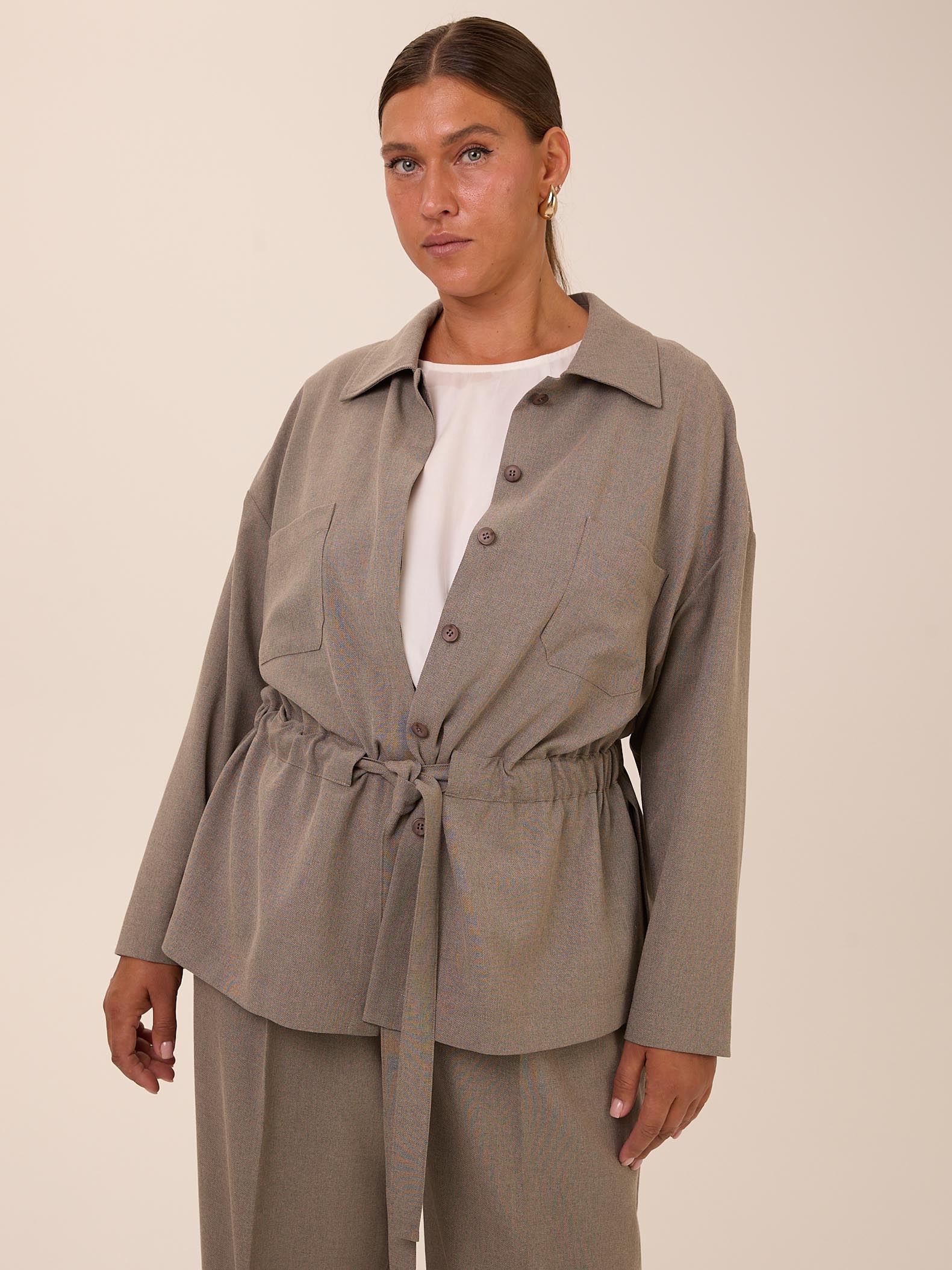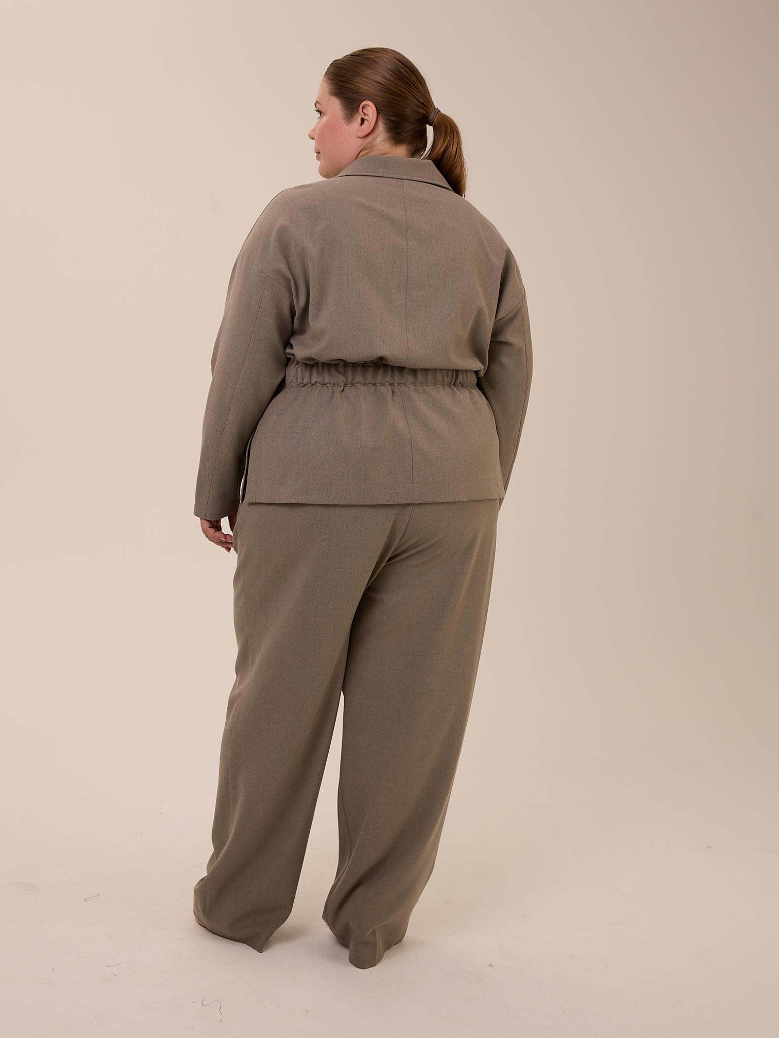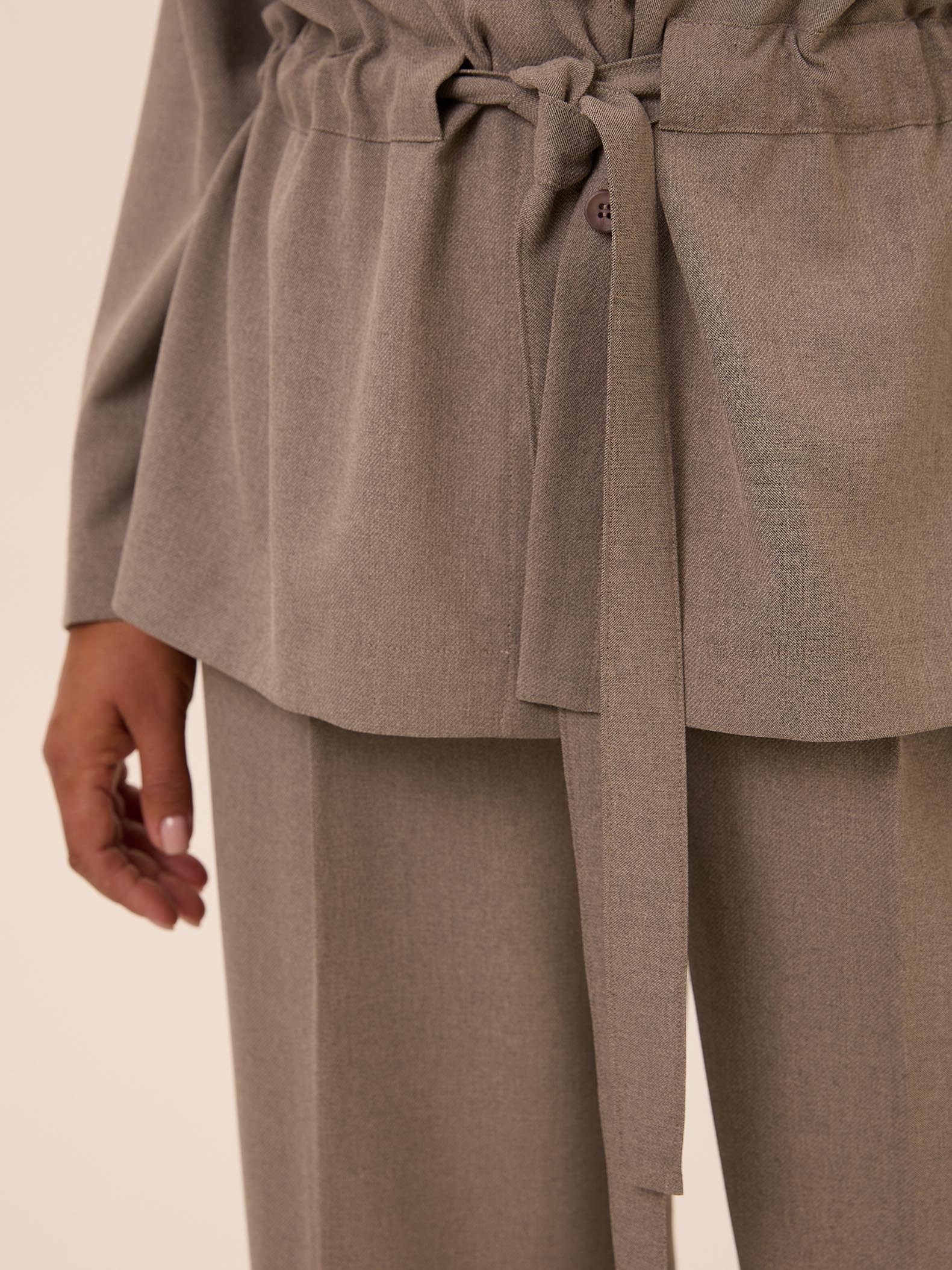 Жакет является частью костюма VALENTA. Жакет свободного кроя со спущенным плечевым поясом, длиной до линии бедер. На талии выполнена кулиска с поясом. Воротник отложной. Нагрудные карманы-накладные. В боковых швах – высокие разрезы. Жакет имеет супатную застежку. Изделие выполнено из вискозосодержащей ткани без подкладки. Цвет серый