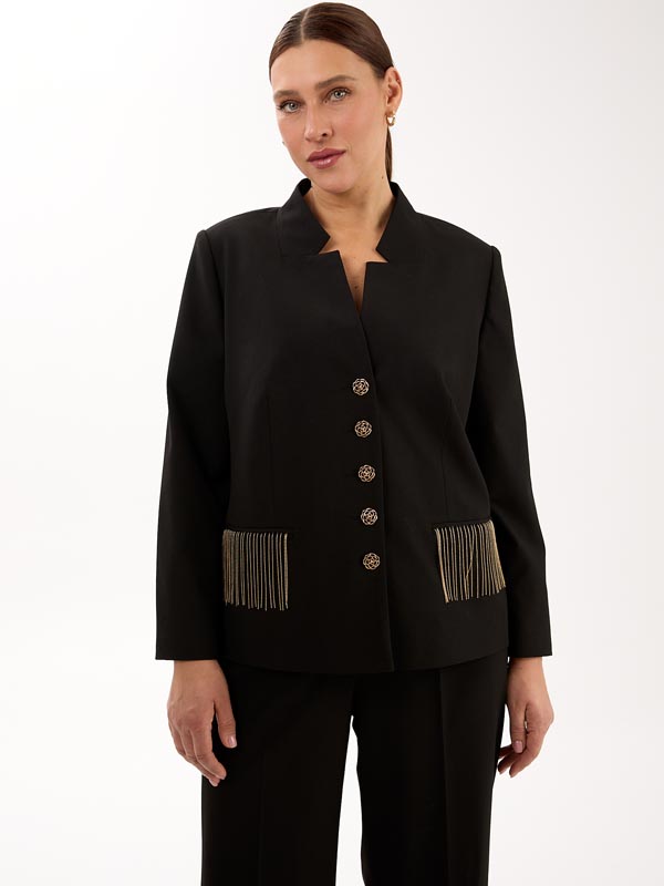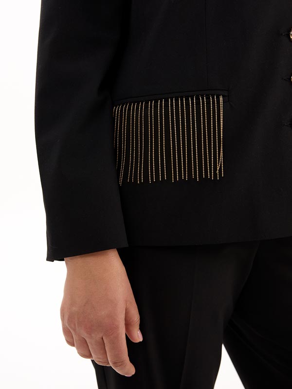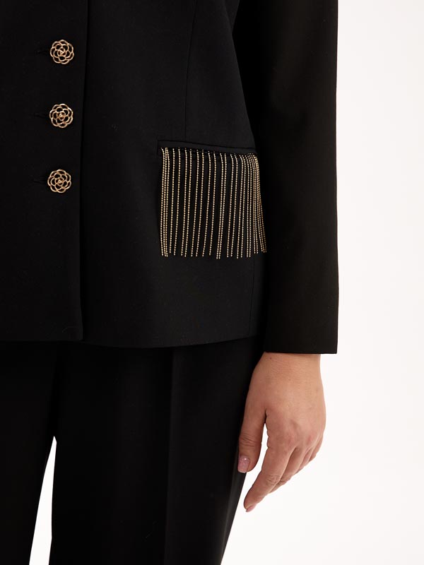 Жакет является частью костюма ЖАНЕ. Жакет полуприлегающего силуэта с фантазийным воротником. Рукава втачные, двухшовные со шлицей и декоративной пуговицей. Боковые карманы прорезные «в рамку». Бахрома-цепочка имитирует клапан. Жакет элегантной длины-до линии бедер. Выполнен из костюмной ткани, на вискозной подкладке. Изысканные детали и фурнитура делают жакет уникальным. Цвета: черный и молочный.