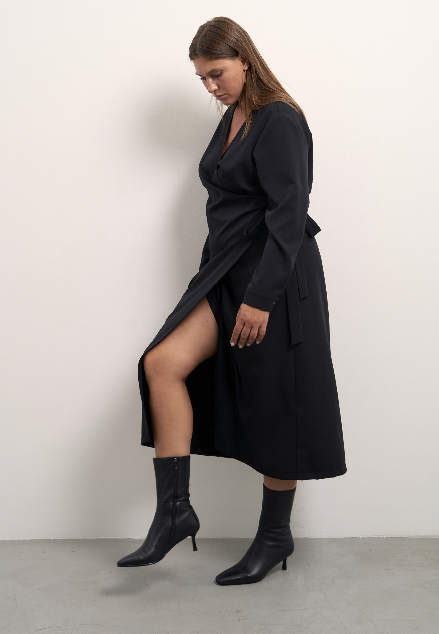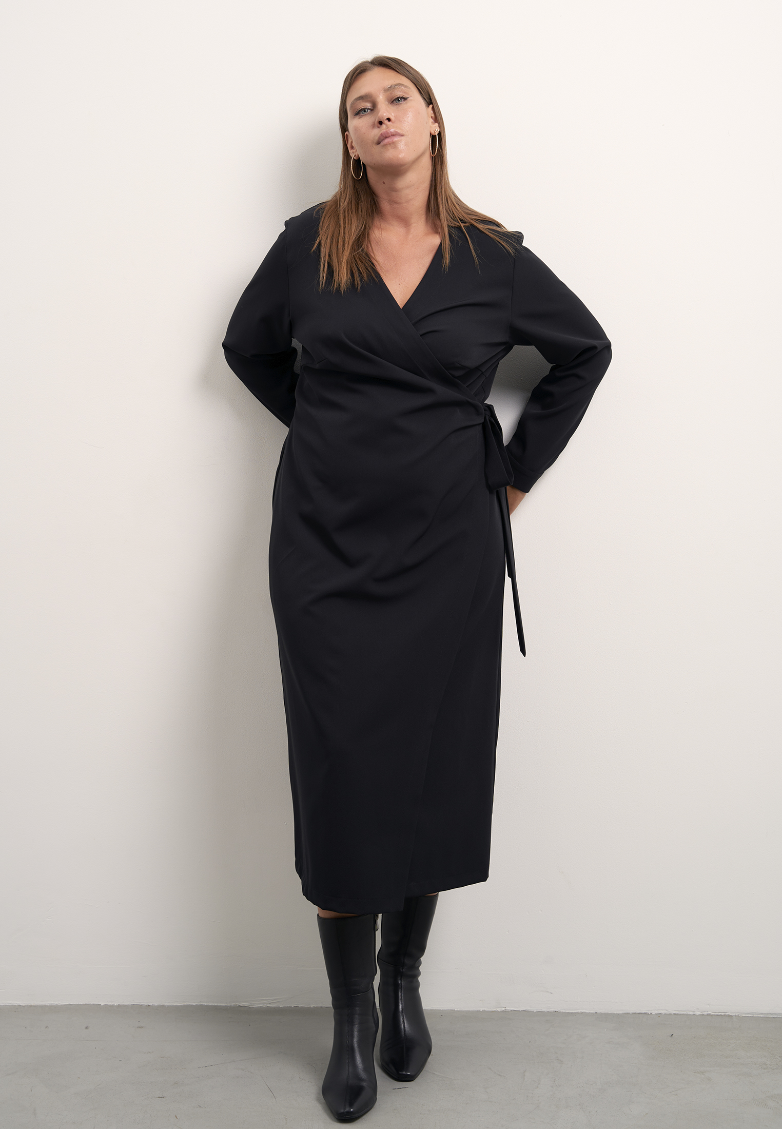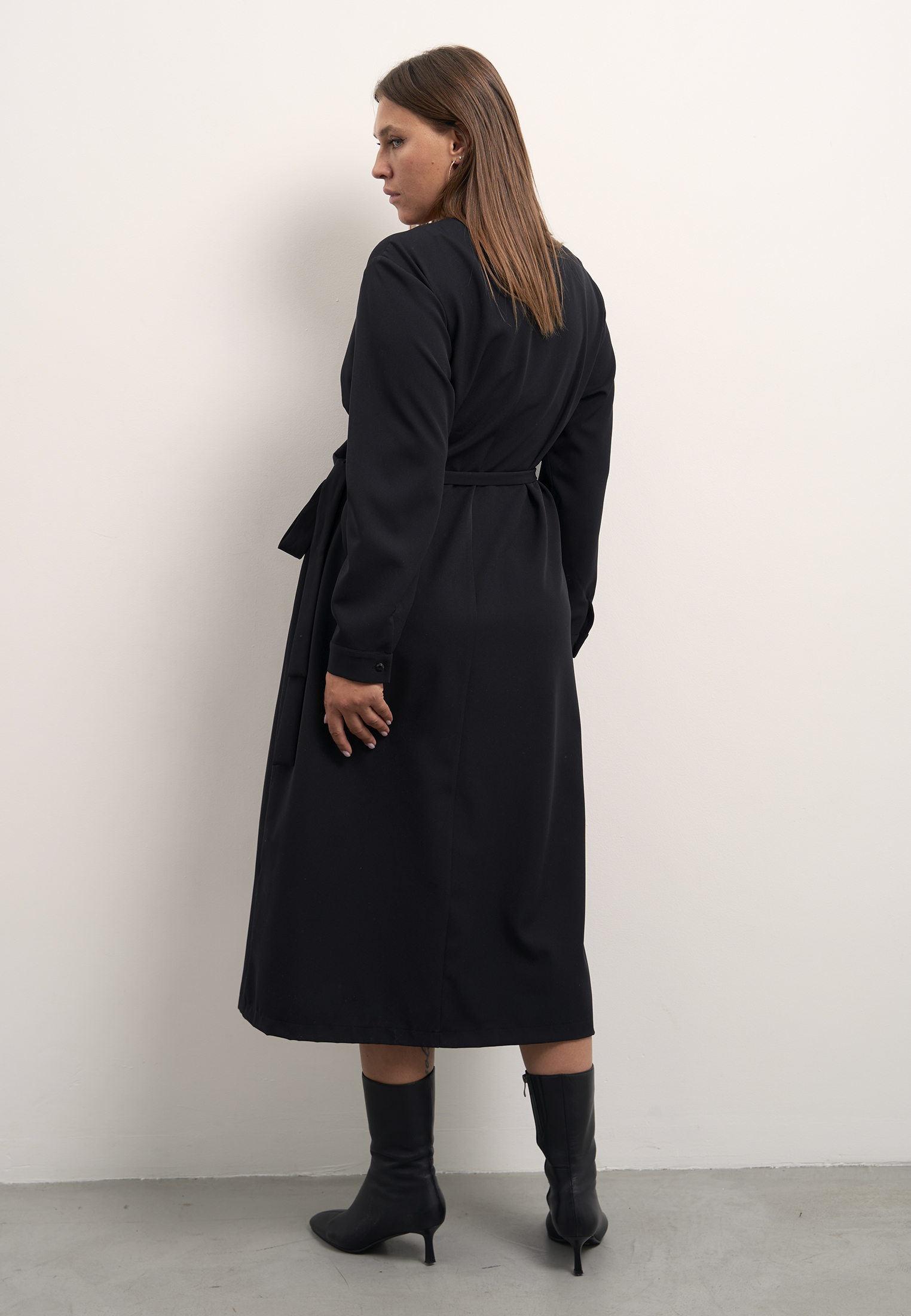 Платье прямого кроя, с запахом. Притачной пояс завязывается сбоку. Рукава длинные с манжетами. Платье выполнено из струящейся вискозосодержащей ткани в черном и коричневом цветах.
