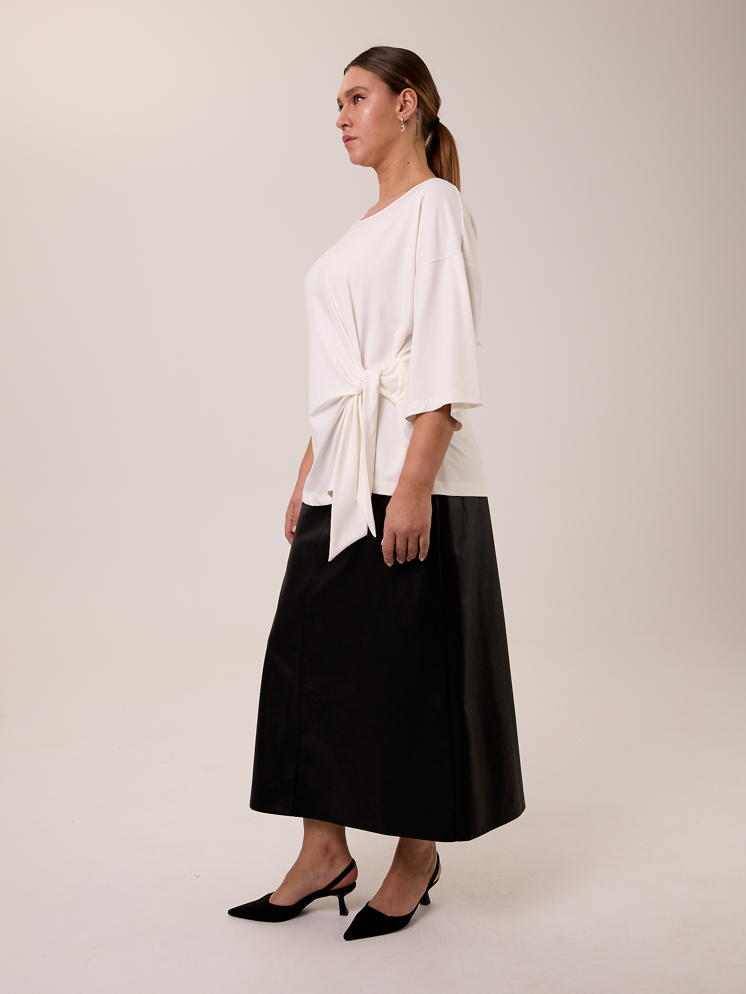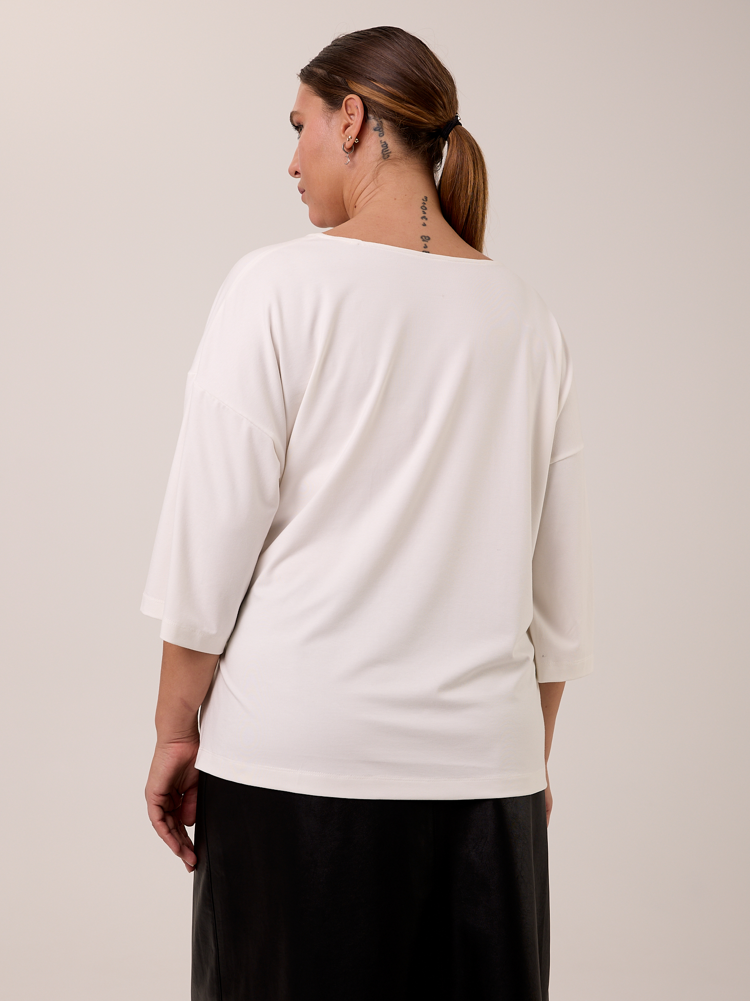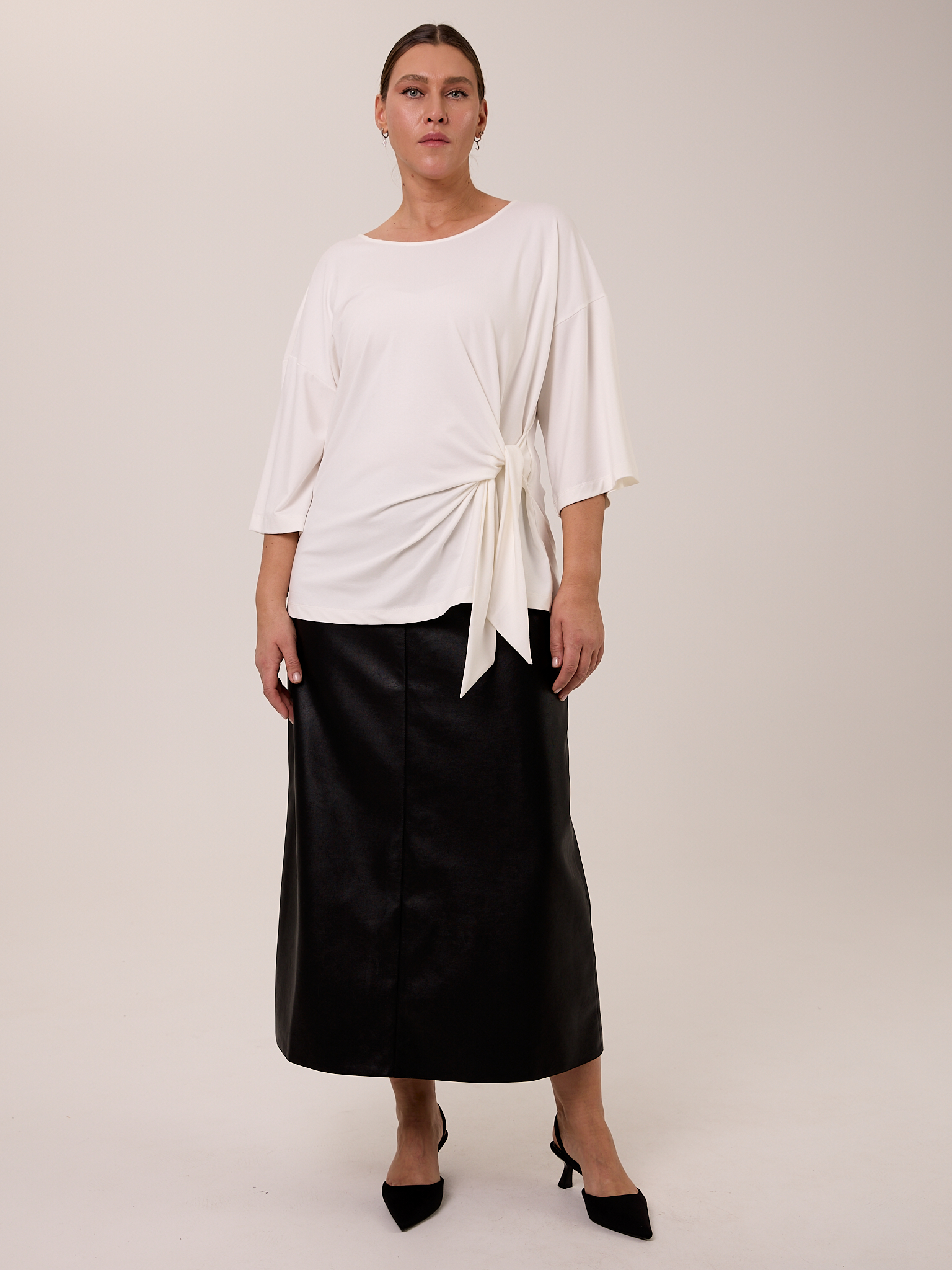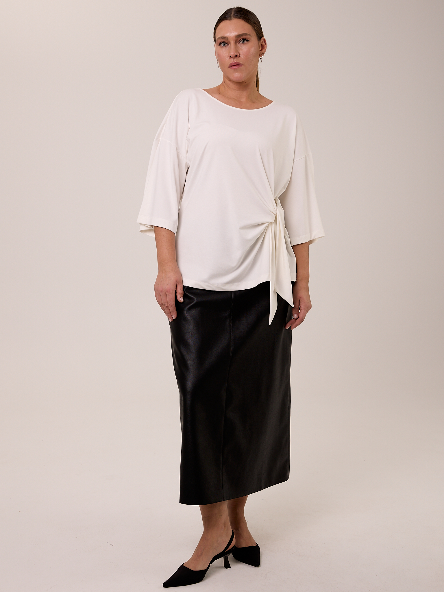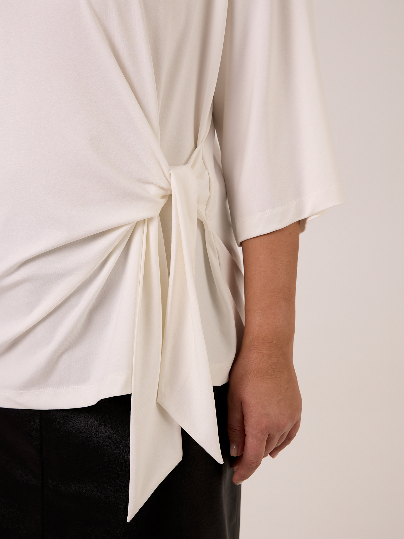 Блузон универсального прямого кроя со спущенным плечевым поясом. Рукава широкие длиной до локтя. Вырез горловины круглый. Спереди выполнен декоративный узел. Блузон выполнен из эластичного трикотажа с высоким содержанием вискозы.