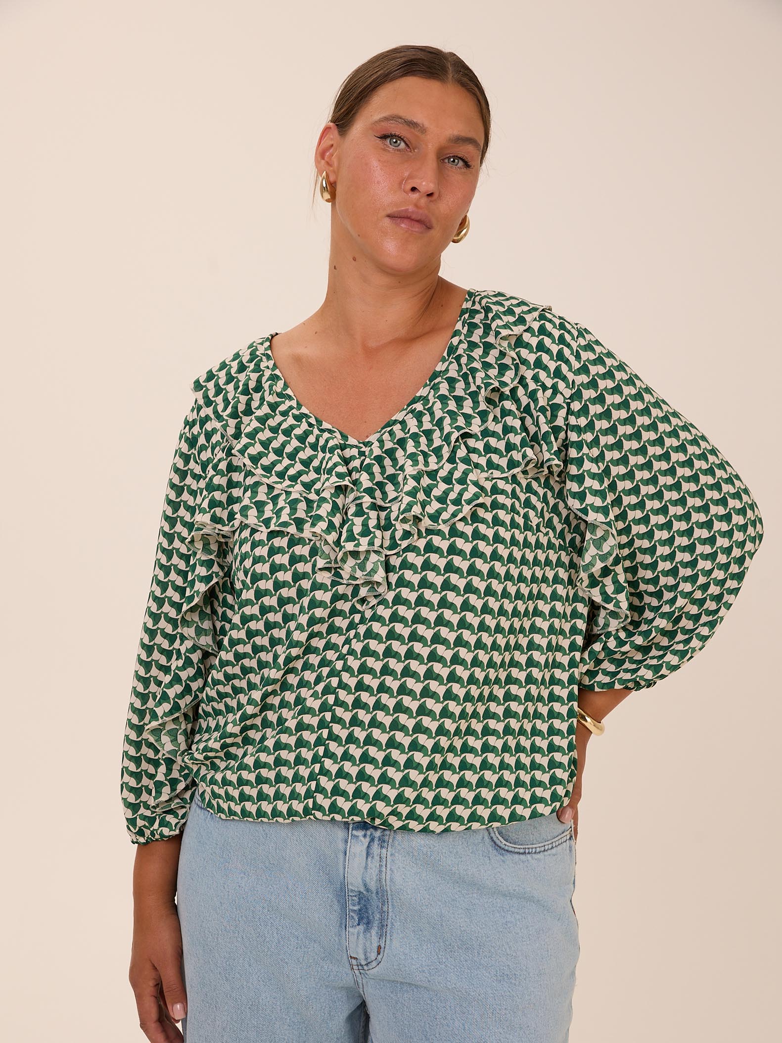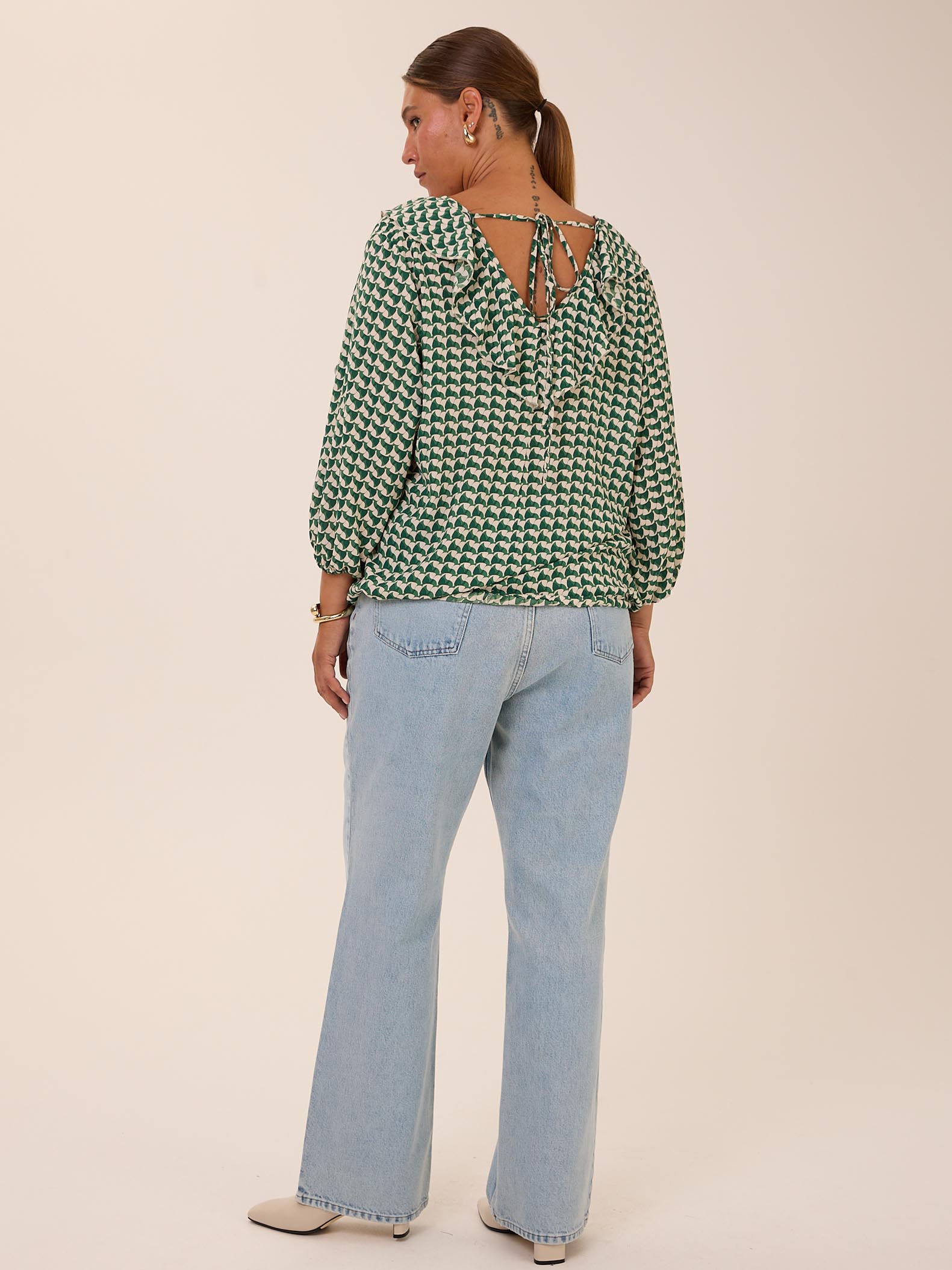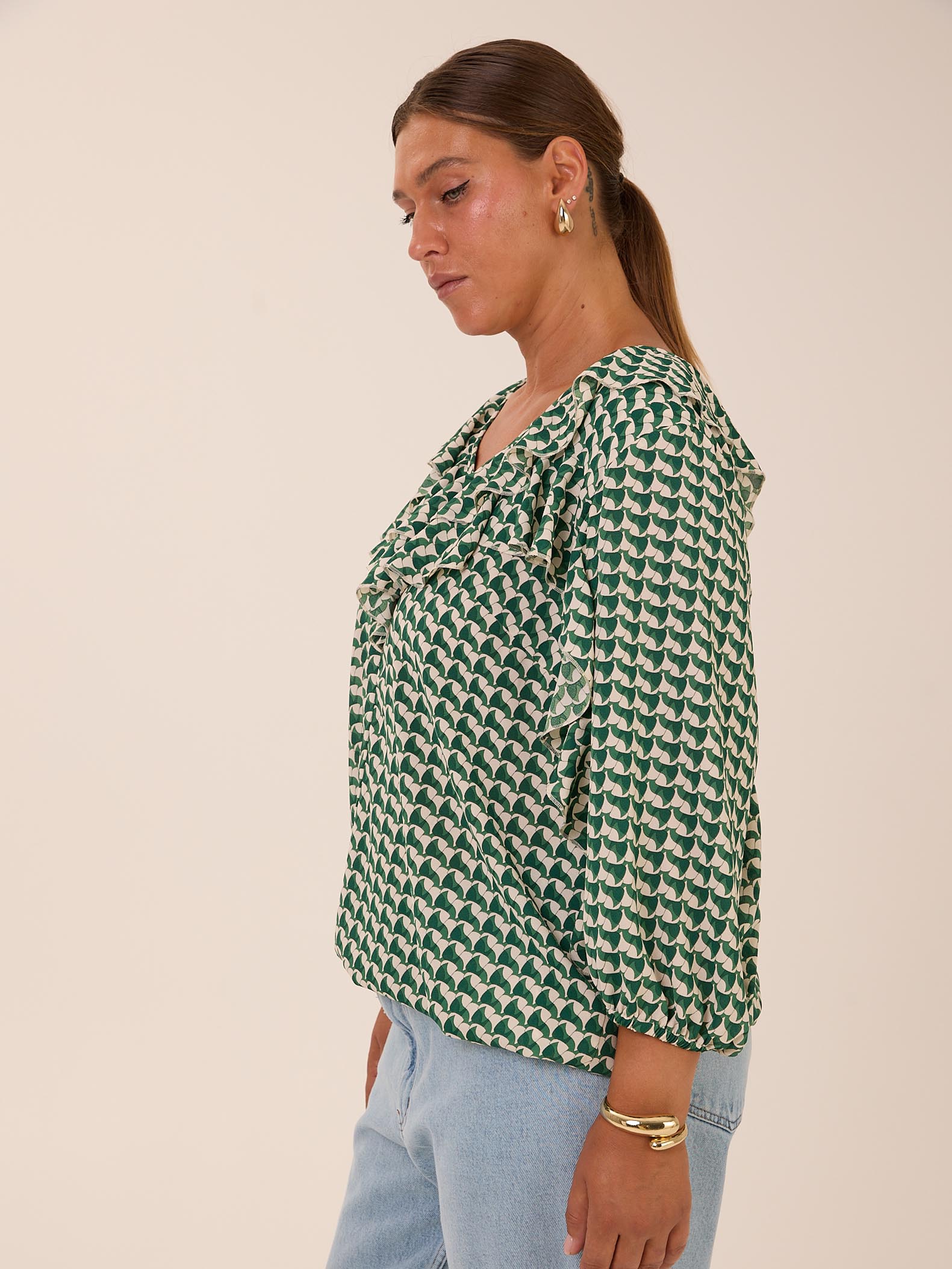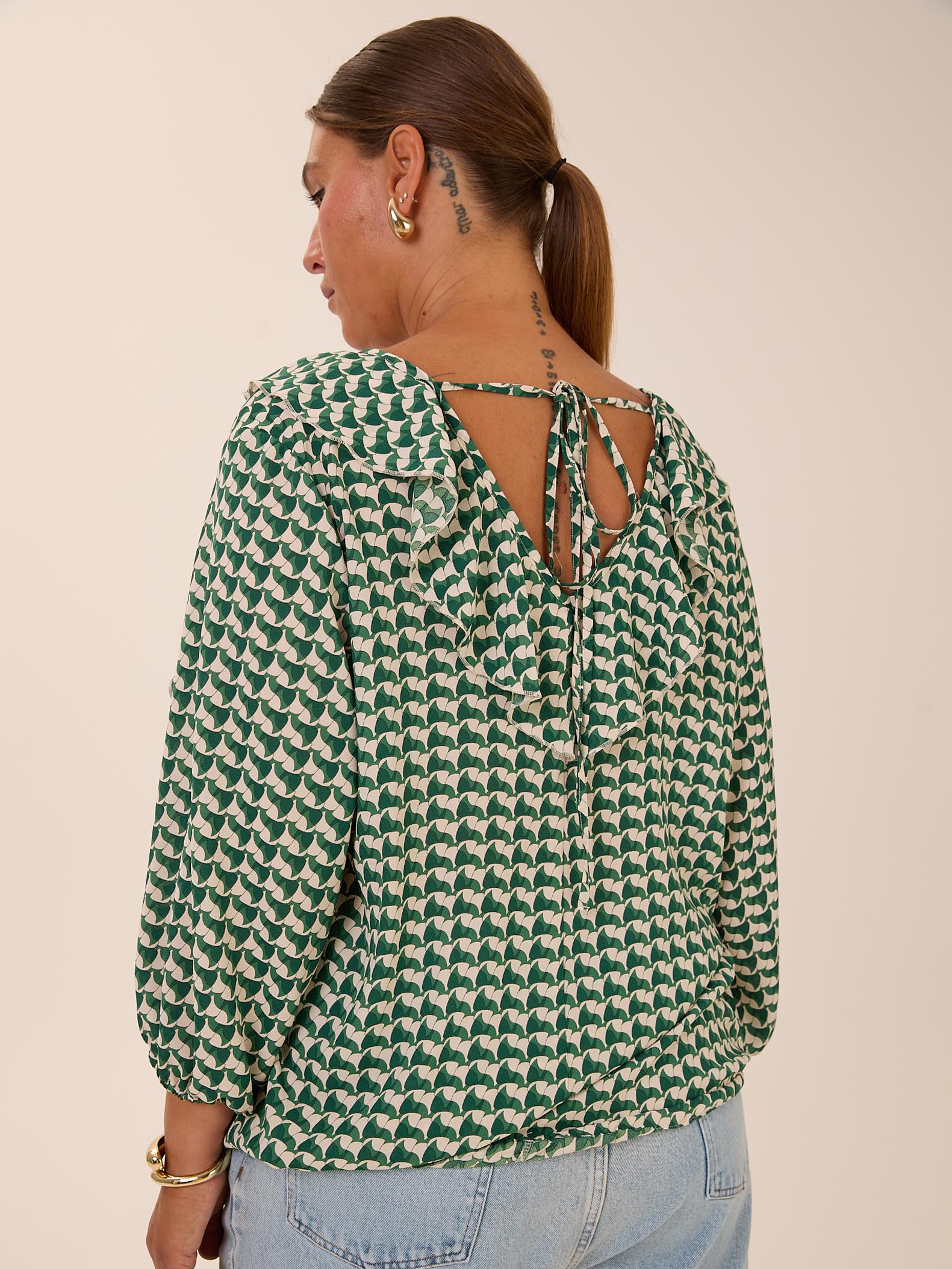 Фантазийная блузка свободного кроя. Вырез горловины V-образный спереди и сзади. Рукава широкие, по низу собираются резинкой. Линия горловины и передний перегиб рукава оформлены мягкими воланами. Низ изделия присобран на эластичную тесьму. Для регулировки ширины выреза горловины, на спинке предусмотрены шнурки.