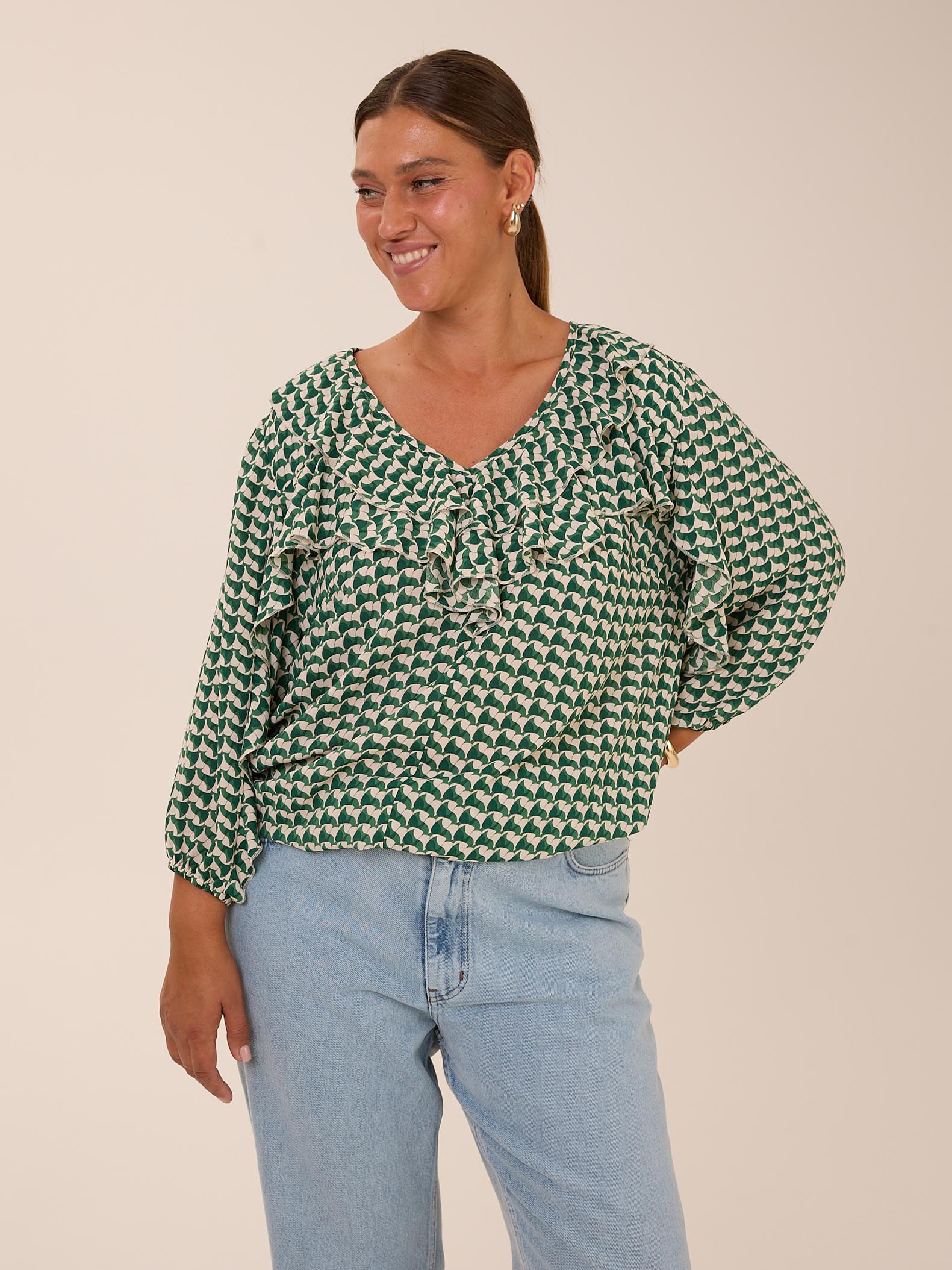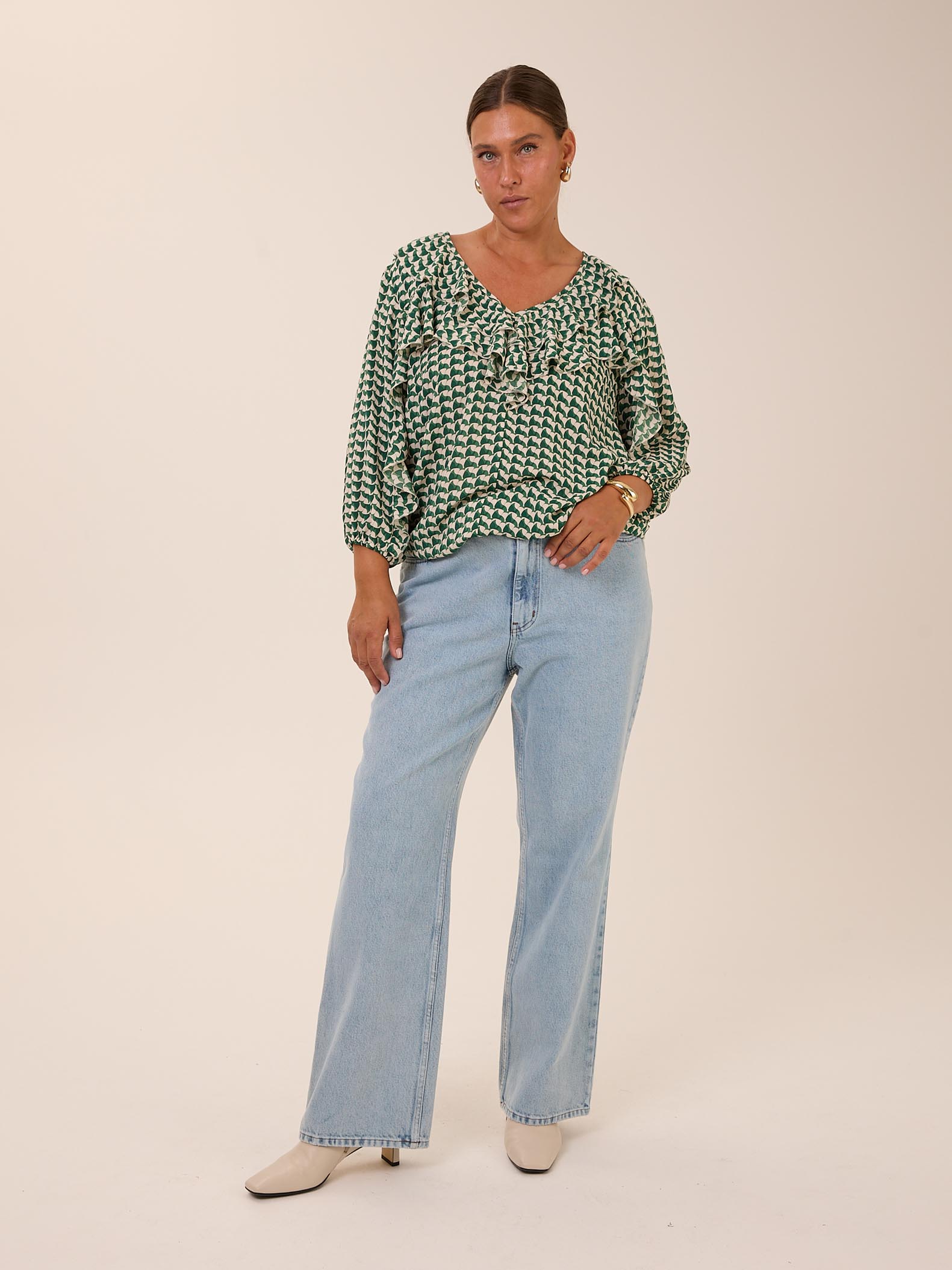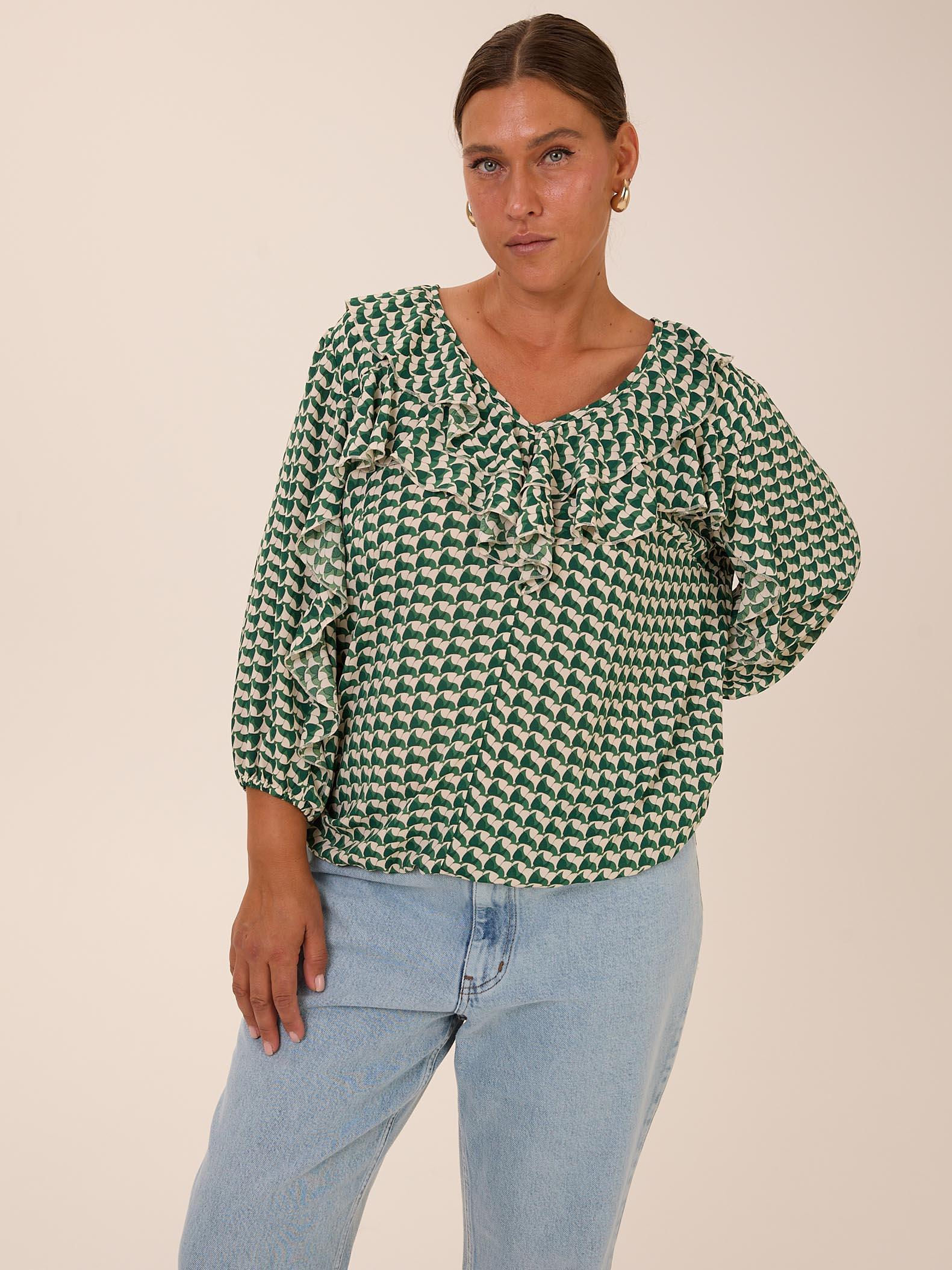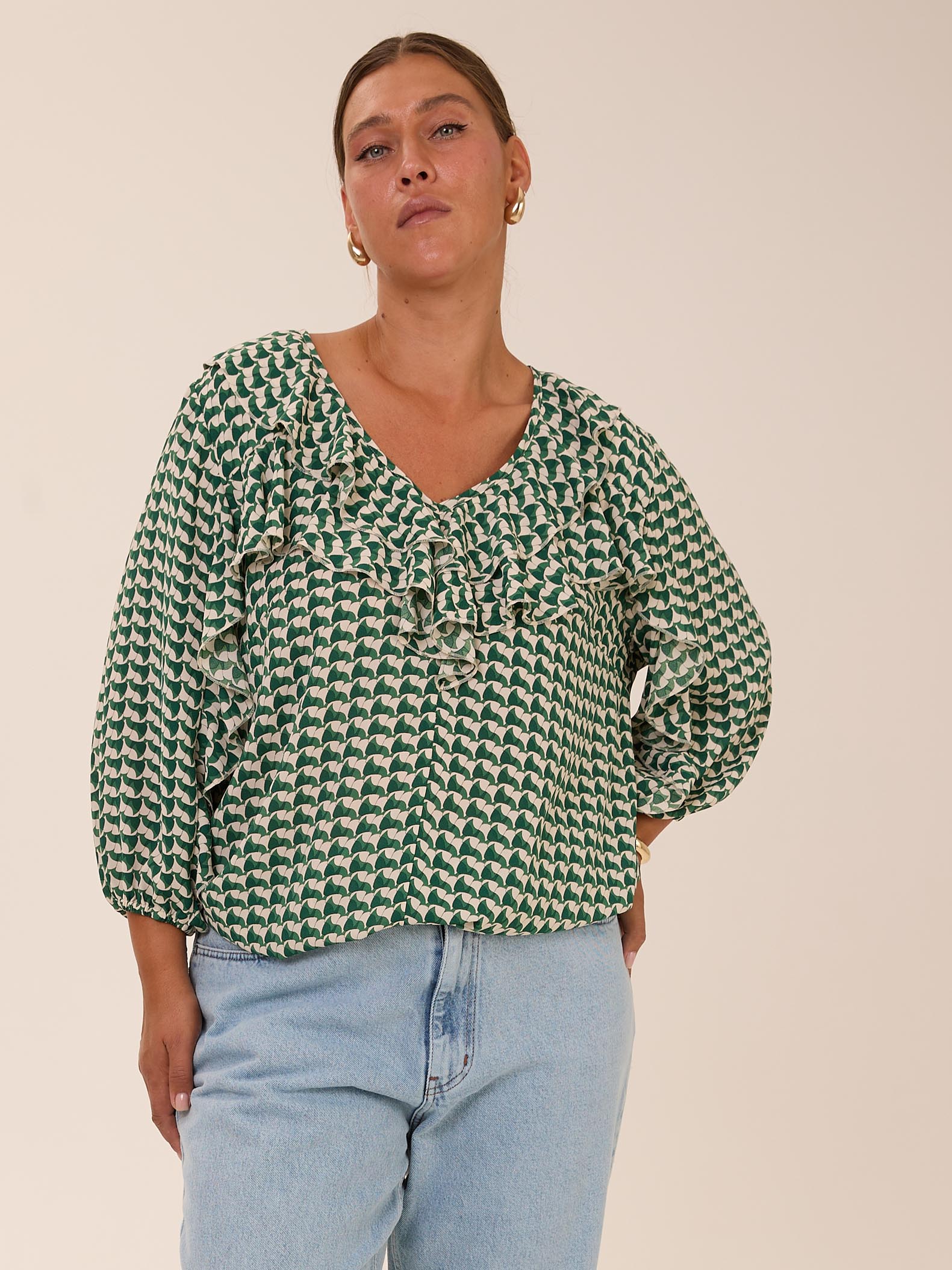 Фантазийная блузка свободного кроя. Вырез горловины V-образный спереди и сзади. Рукава широкие, по низу собираются резинкой. Линия горловины и передний перегиб рукава оформлены мягкими воланами. Низ изделия присобран на эластичную тесьму. Для регулировки ширины выреза горловины, на спинке предусмотрены шнурки.