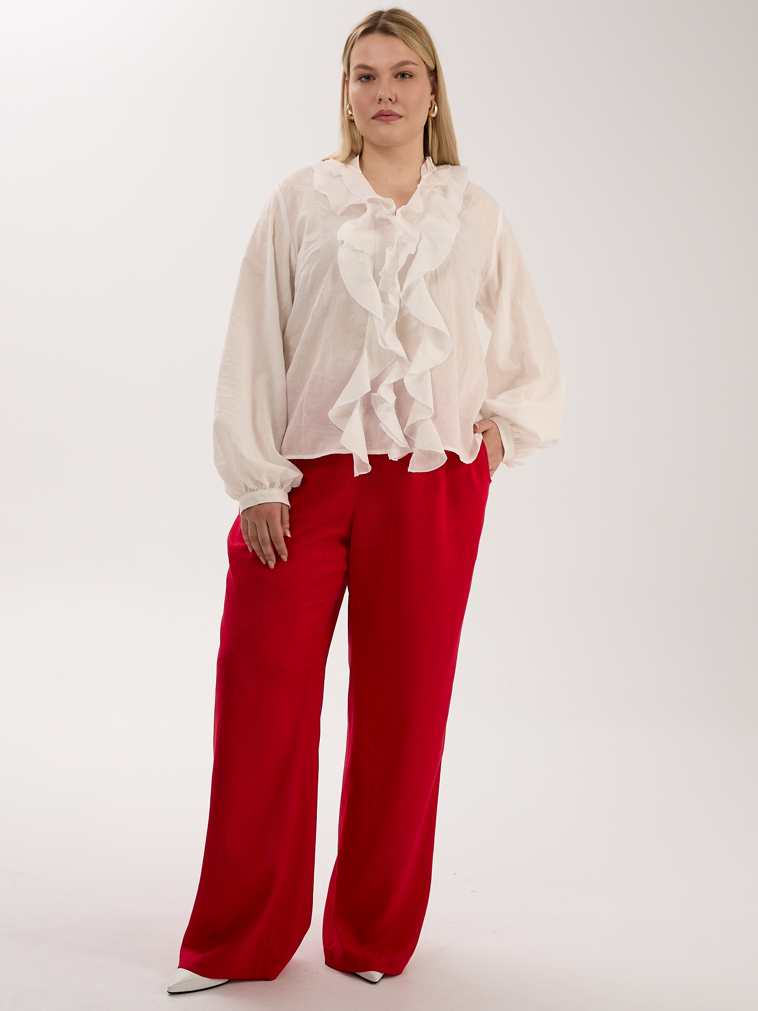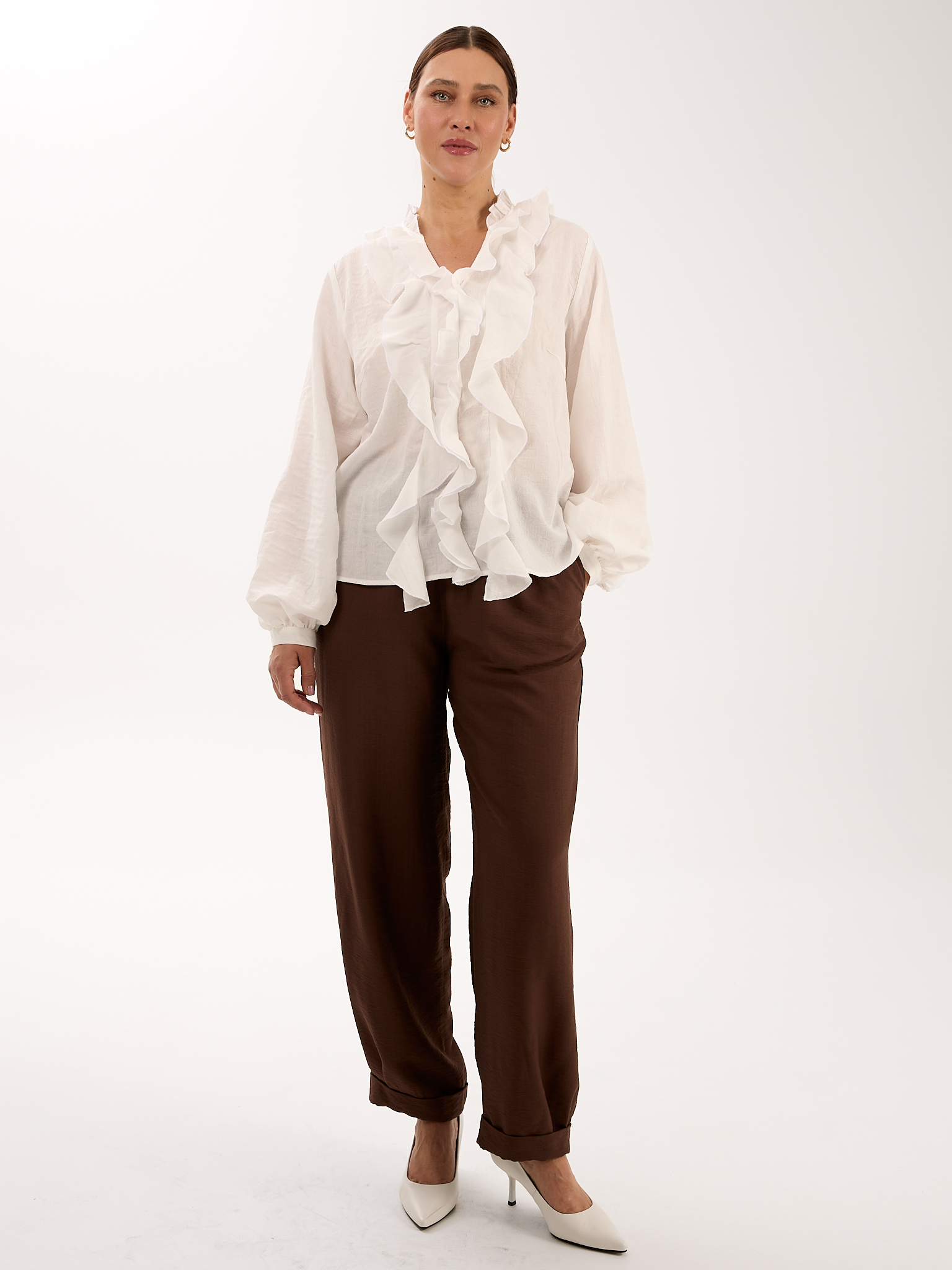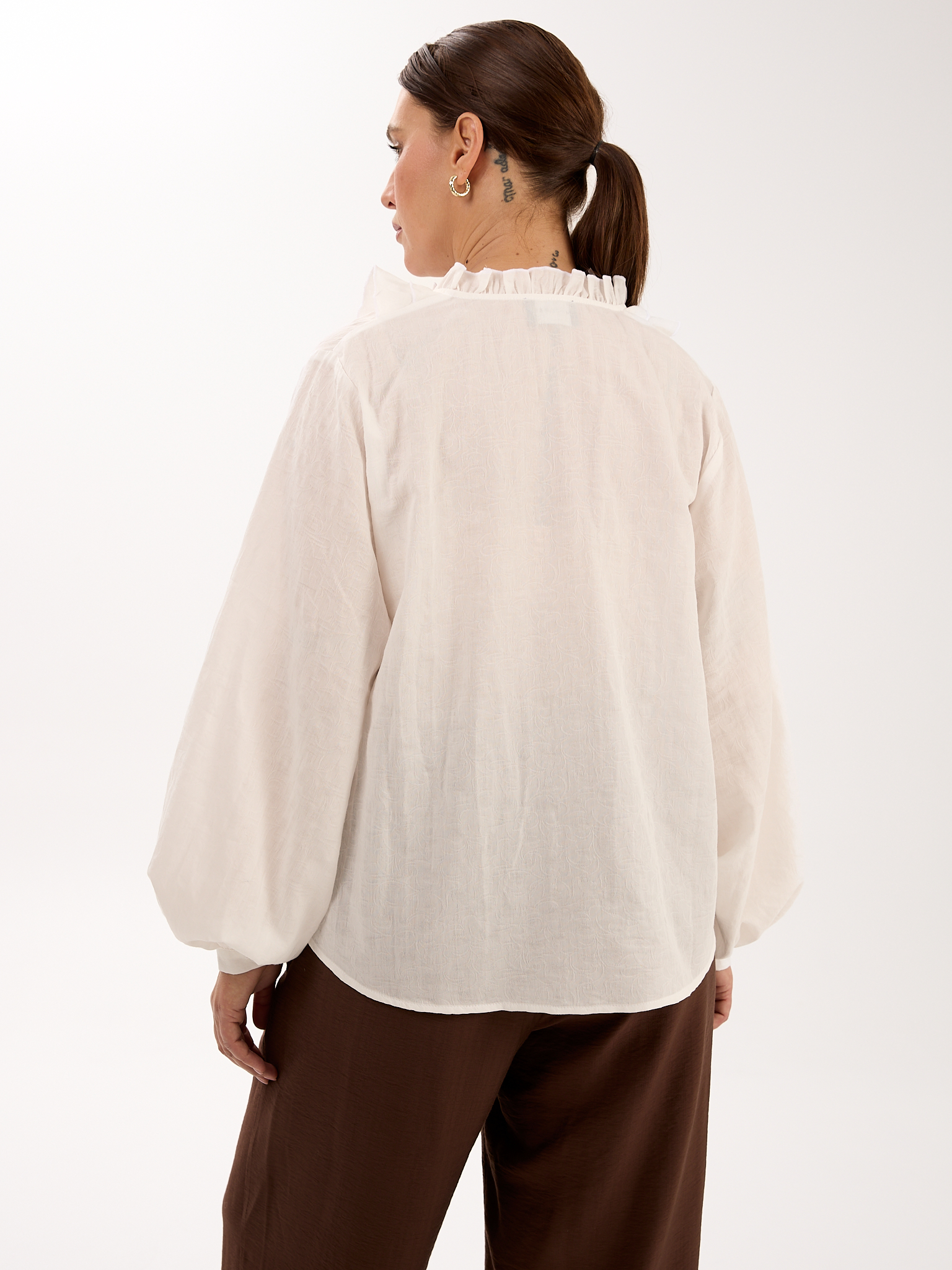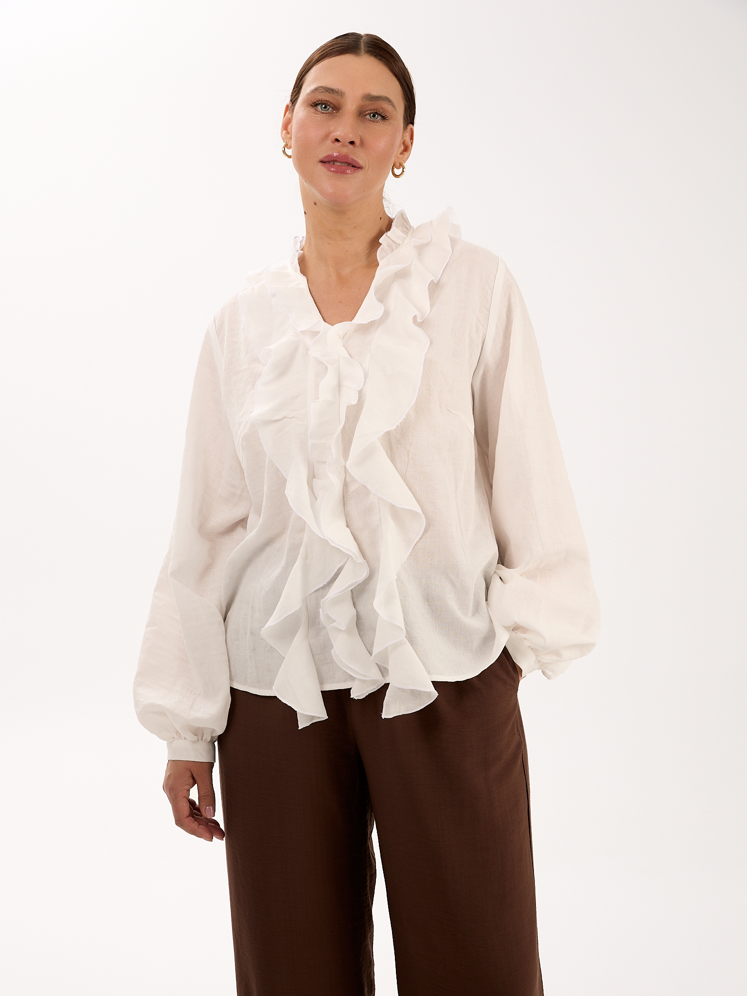Легкая блузка прямого кроя без застежки. (надевается через голову). Горловина V-образная, оформлена оборками и воланами разной ширины, переходящими на полочку. Рукава объемные с манжетами.