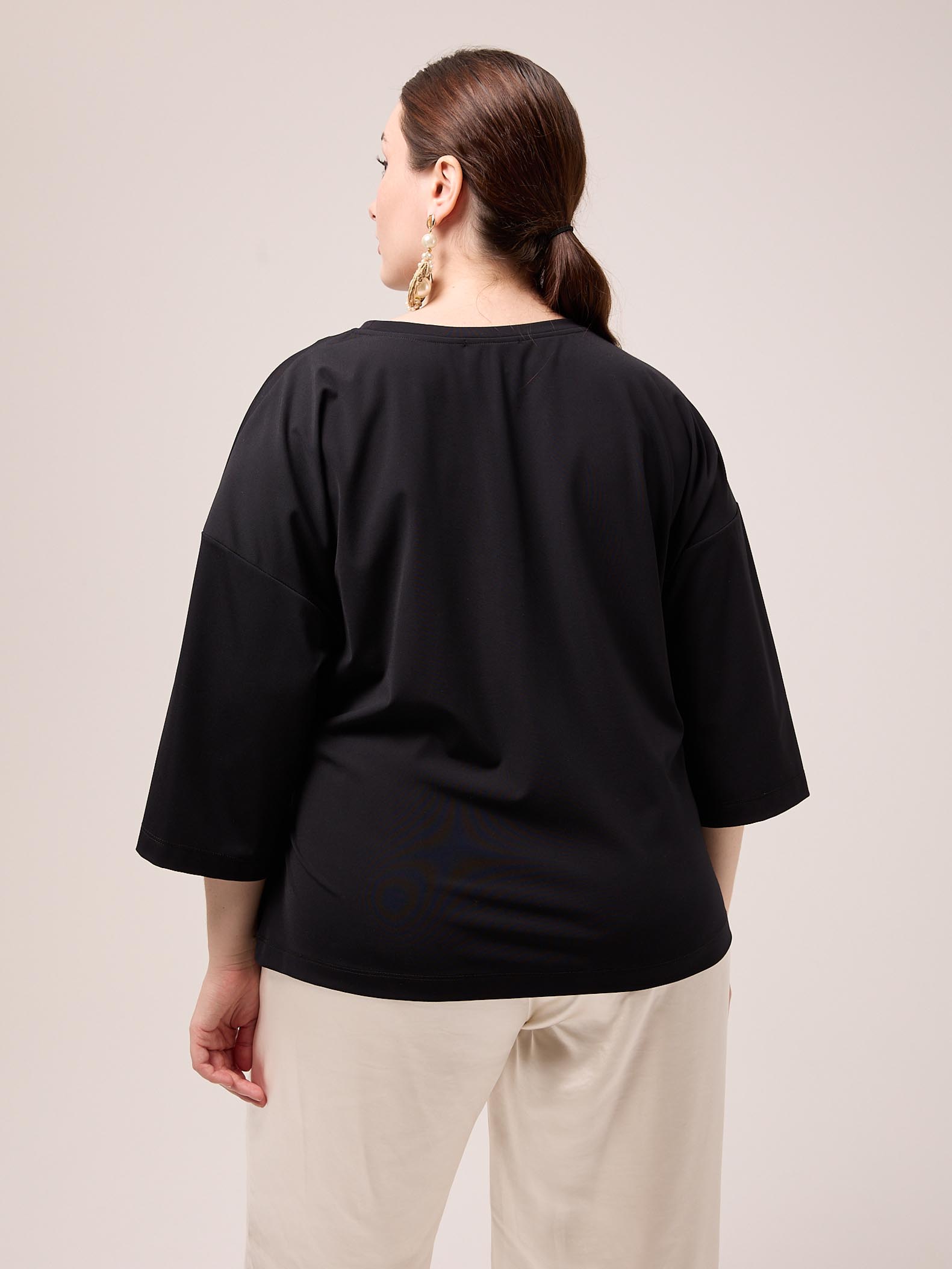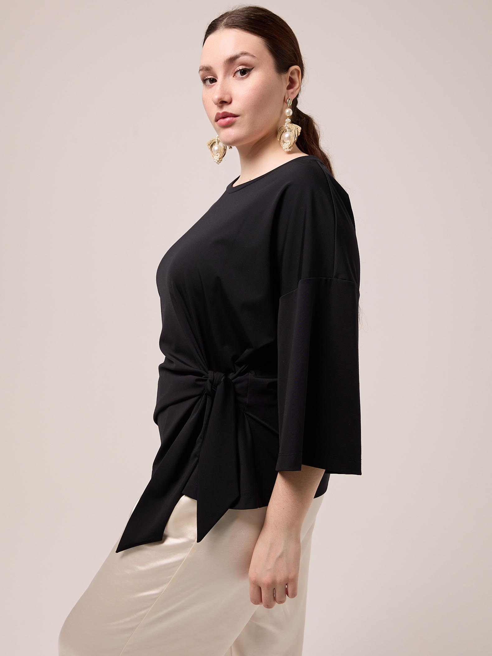 Блузон универсального прямого кроя со спущенным плечевым поясом. Рукава широкие длиной до локтя. Вырез горловины круглый. Спереди выполнен декоративный узел. Блузон выполнен из эластичного трикотажа с высоким содержанием вискозы в черном цвете.
