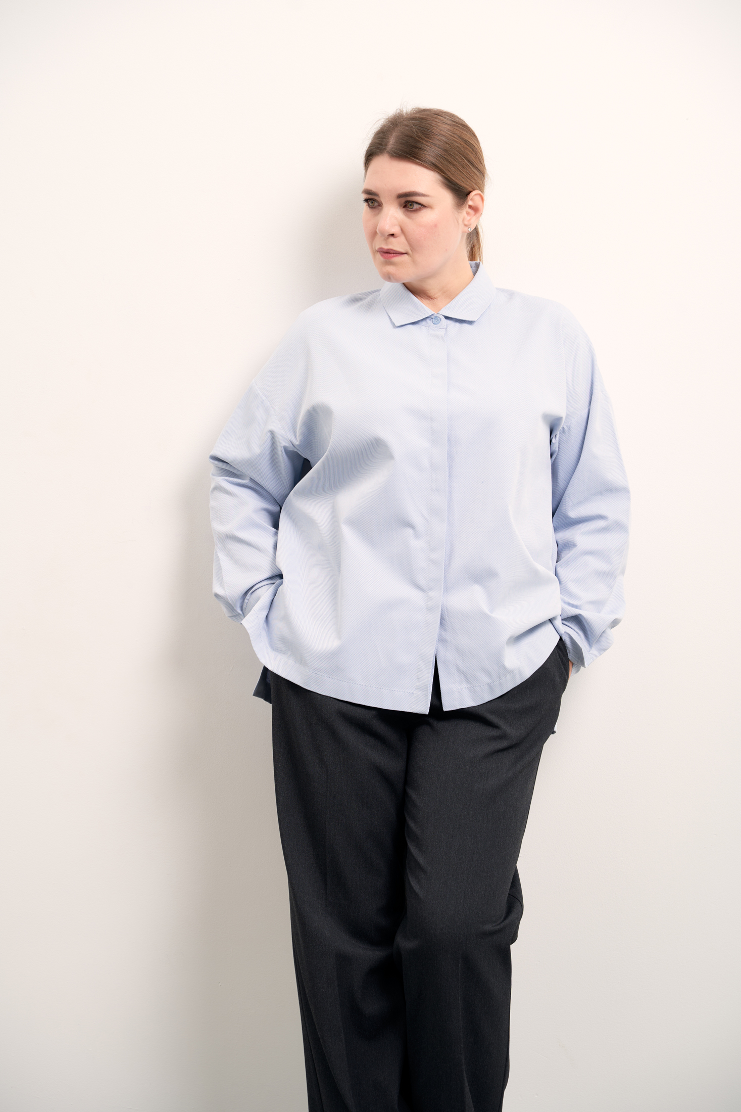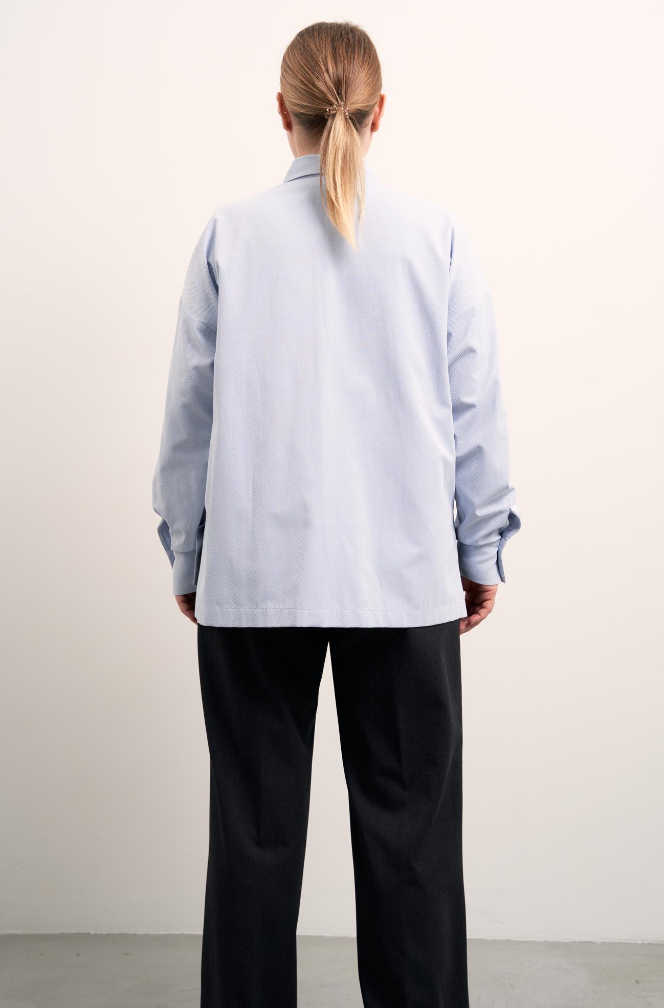 Рубашка прямого силуэта. Воротник отложной на стойке. Плечевой пояс спущен. Рукава длинные с широкими манжетами. Застежка супатная на петли и пуговицы. Спинка немного длинее переда. В боковых швах выполнены разрезы. Рубашка выполнена из хлопковой ткани в двух цветах: голубом и белом.