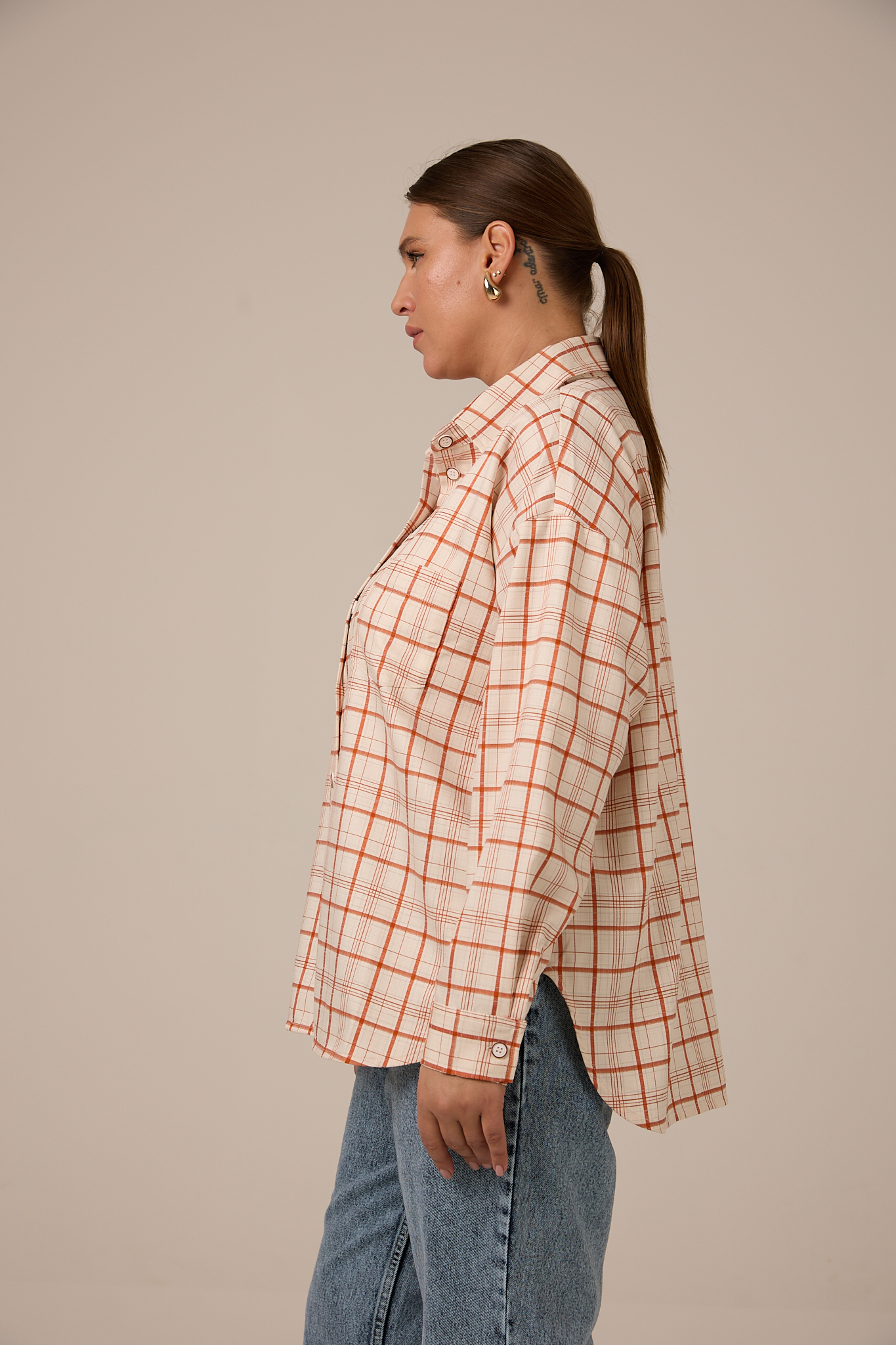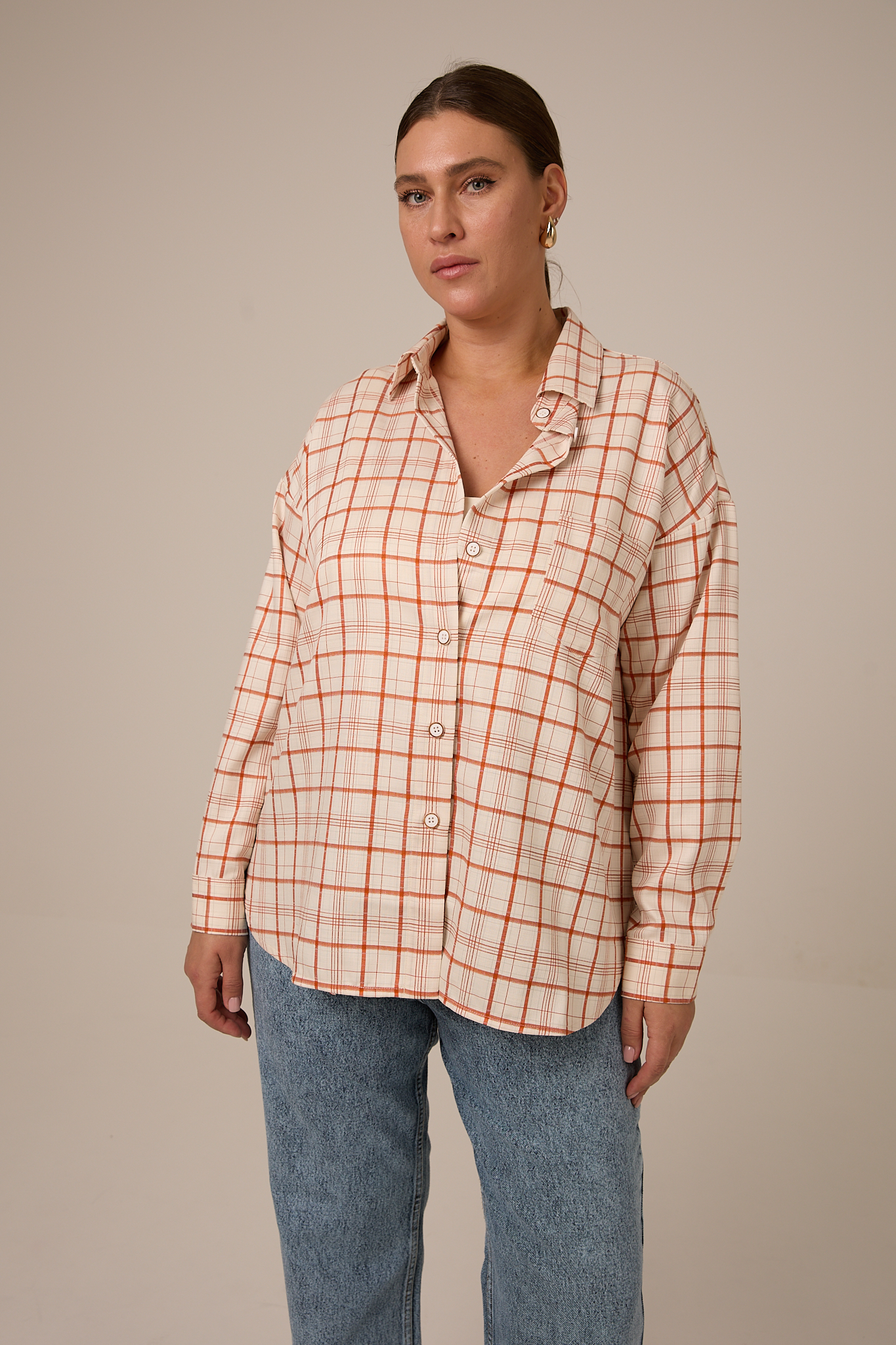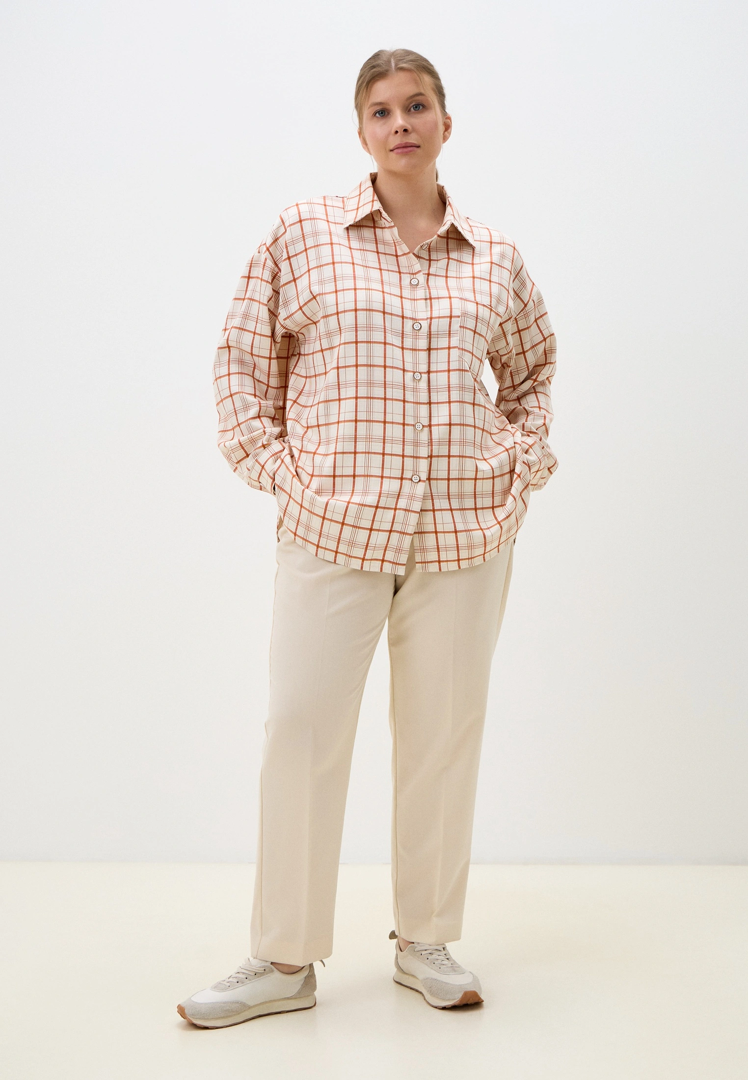 Классическая рубашка свободного кроя со спущенным плечевым поясом. Воротник отложной на стойке. Рукава длинные с манжетами. На спинке выполнена встречная складка, которая обеспечивает дополнительный объем. На левой полочке нагрудный карман. Низ оформлен плавной линией с закругленными боками. Застегивается рубашка на петли и пуговицы. Выполнена из мягкой ткани с высоким содержанием вискозы в двух цветах серая полоска и оранжевая клетка.