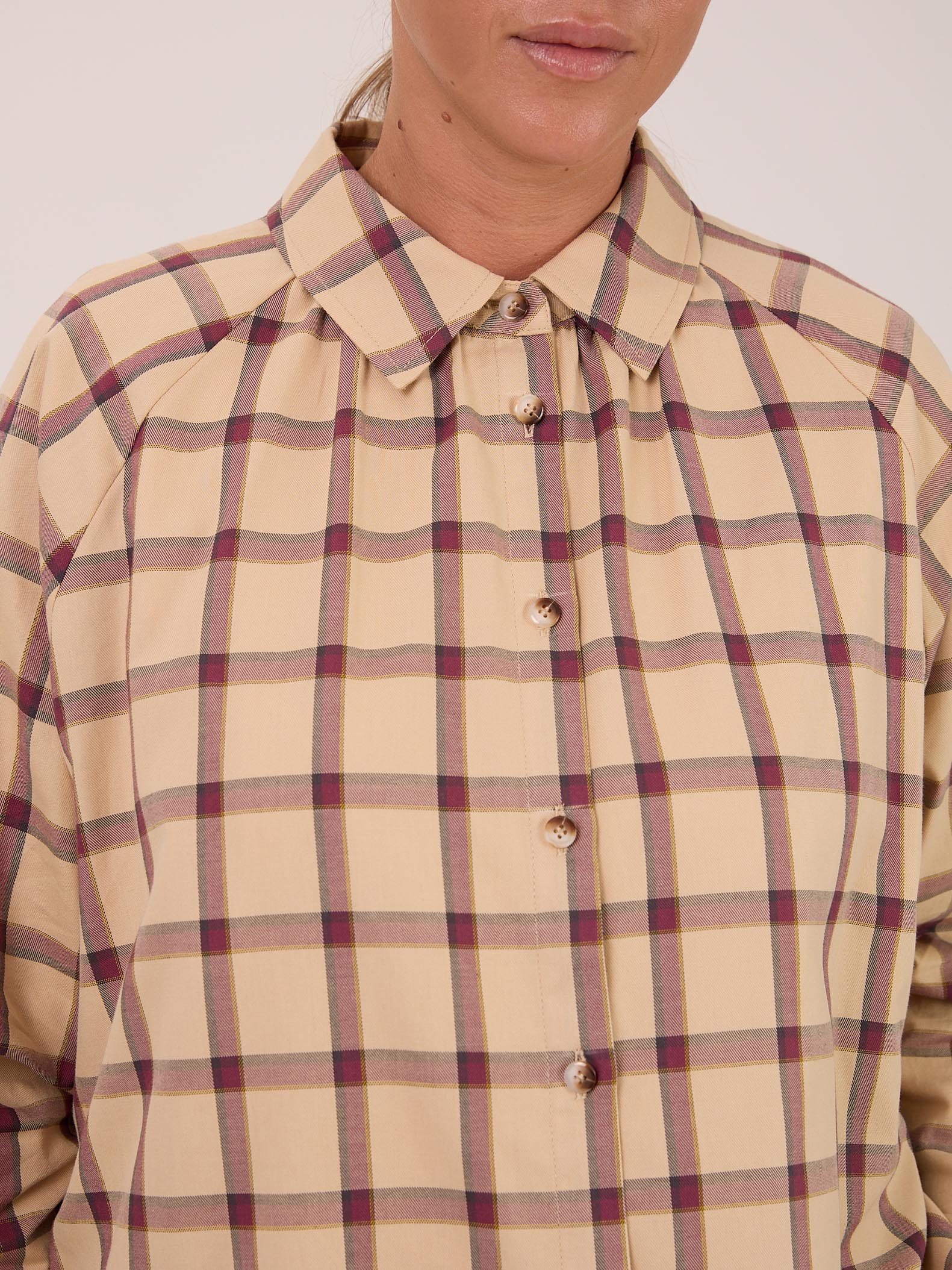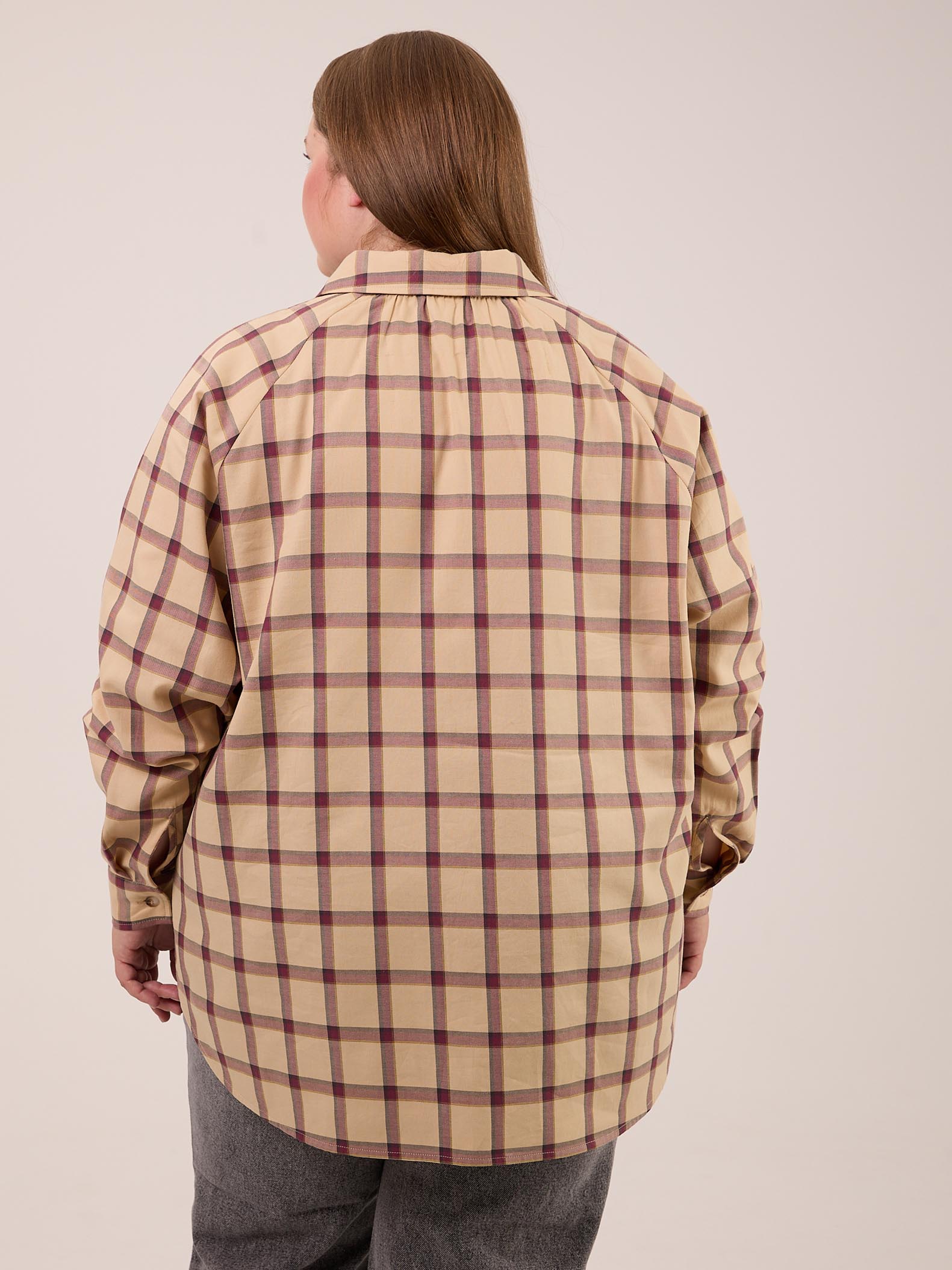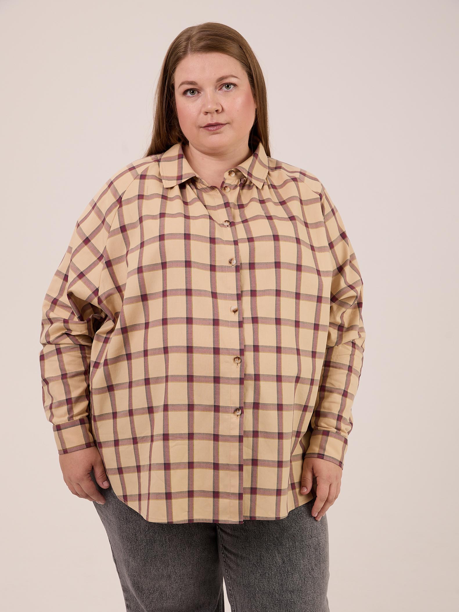 Рубашка 26/39. Рубашка прямого кроя.  Рукава реглан с манжетами. Воротник рубашечного типа, отложной на стойке. Низ оформлен плавными линиями с высокими закругленными разрезами в боковых швах. Рубашка застегивается на петли и пуговицы. Изделие выполнено из мягкой хлопковой ткани в бежевом цвете.