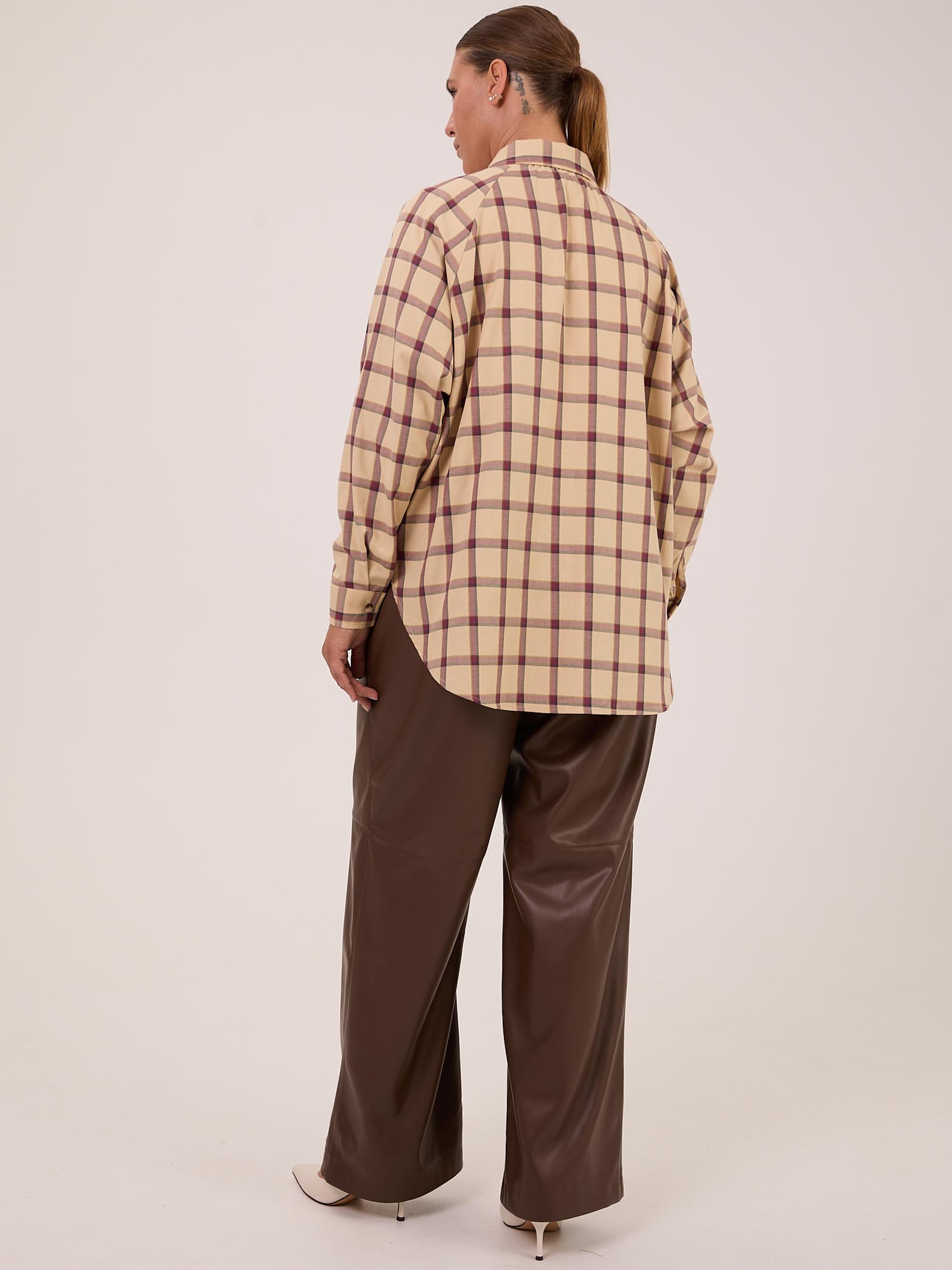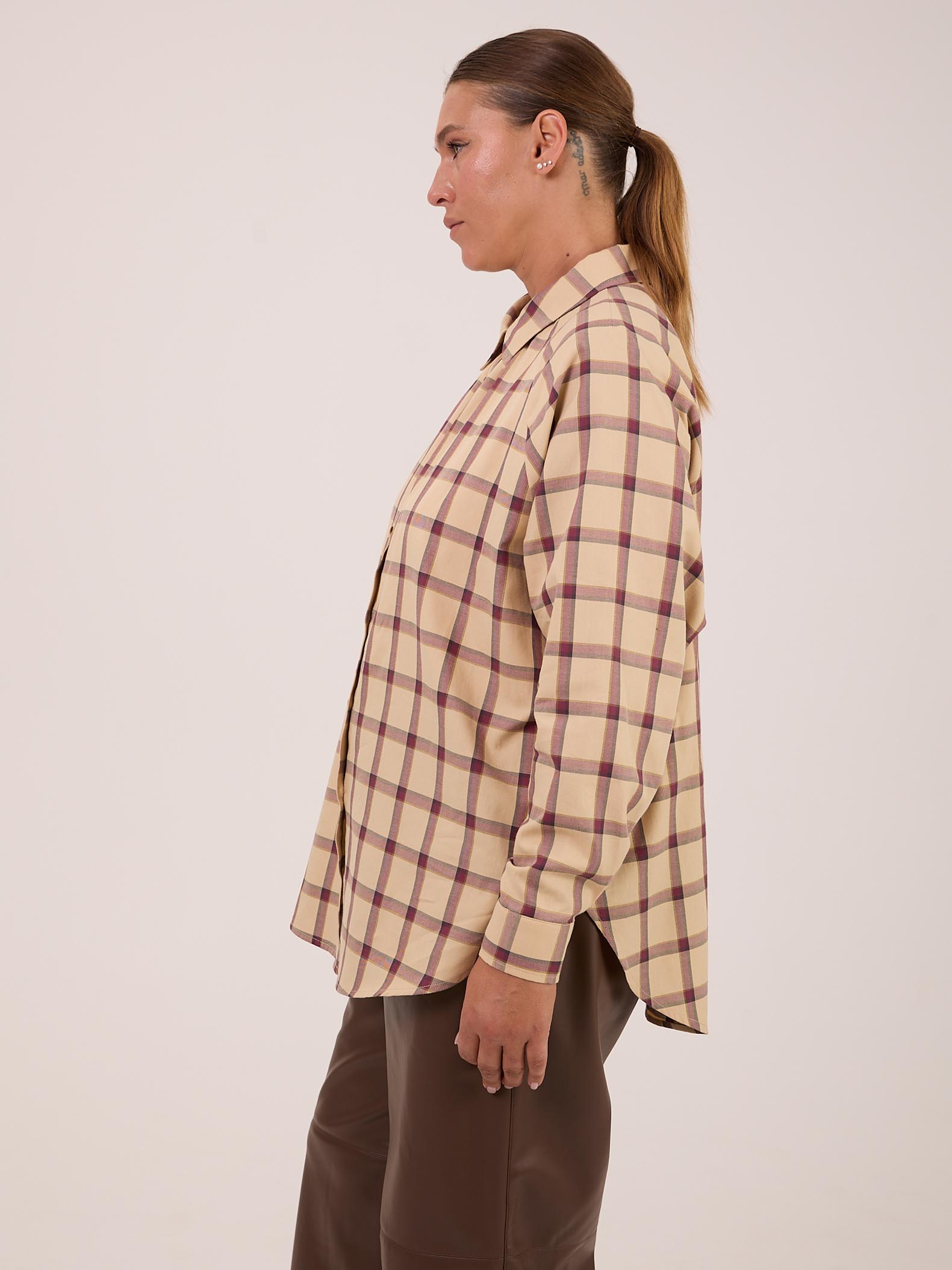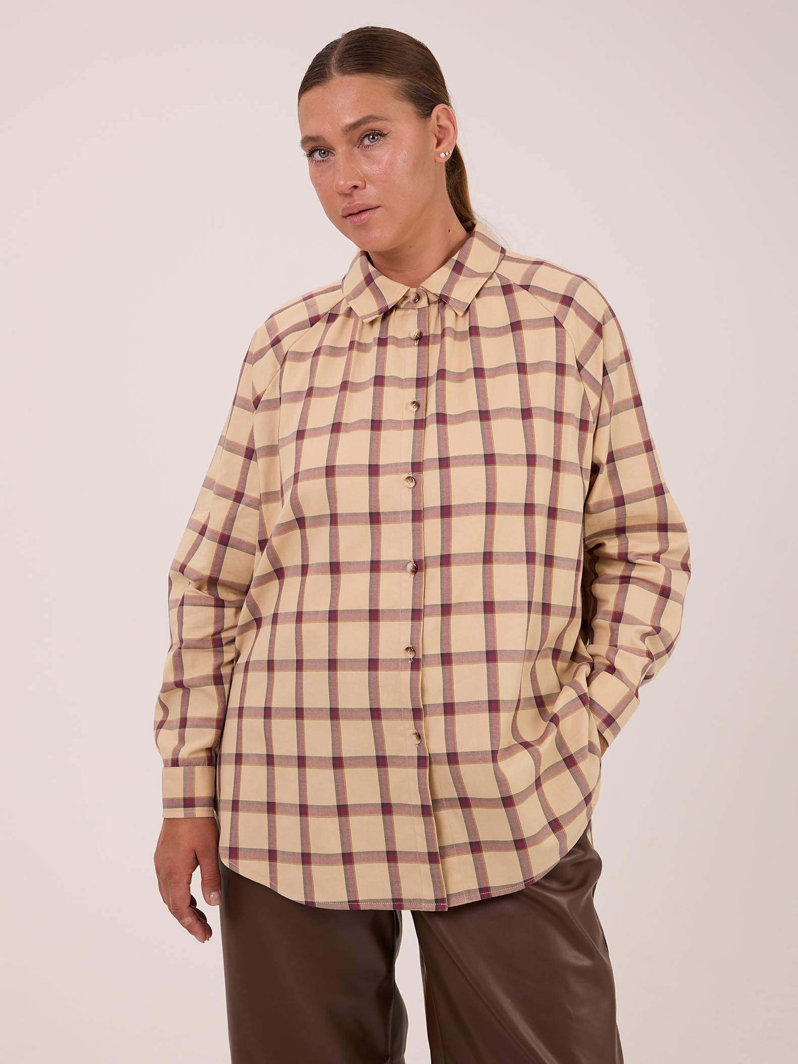 Рубашка 26/39. Рубашка прямого кроя.  Рукава реглан с манжетами. Воротник рубашечного типа, отложной на стойке. Низ оформлен плавными линиями с высокими закругленными разрезами в боковых швах. Рубашка застегивается на петли и пуговицы. Изделие выполнено из мягкой хлопковой ткани в бежевом цвете.