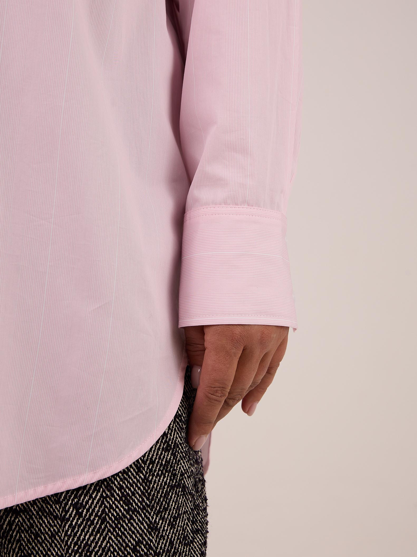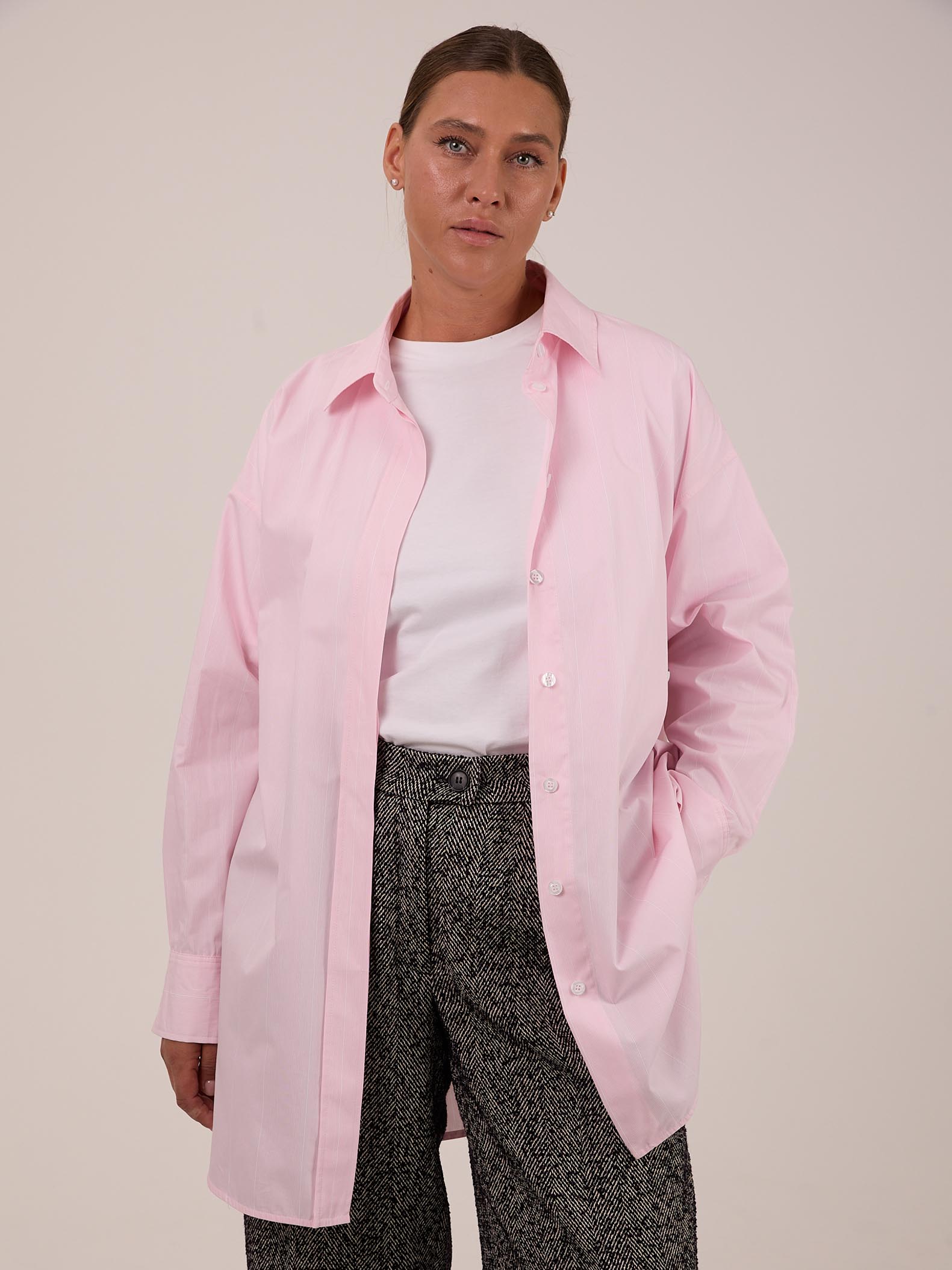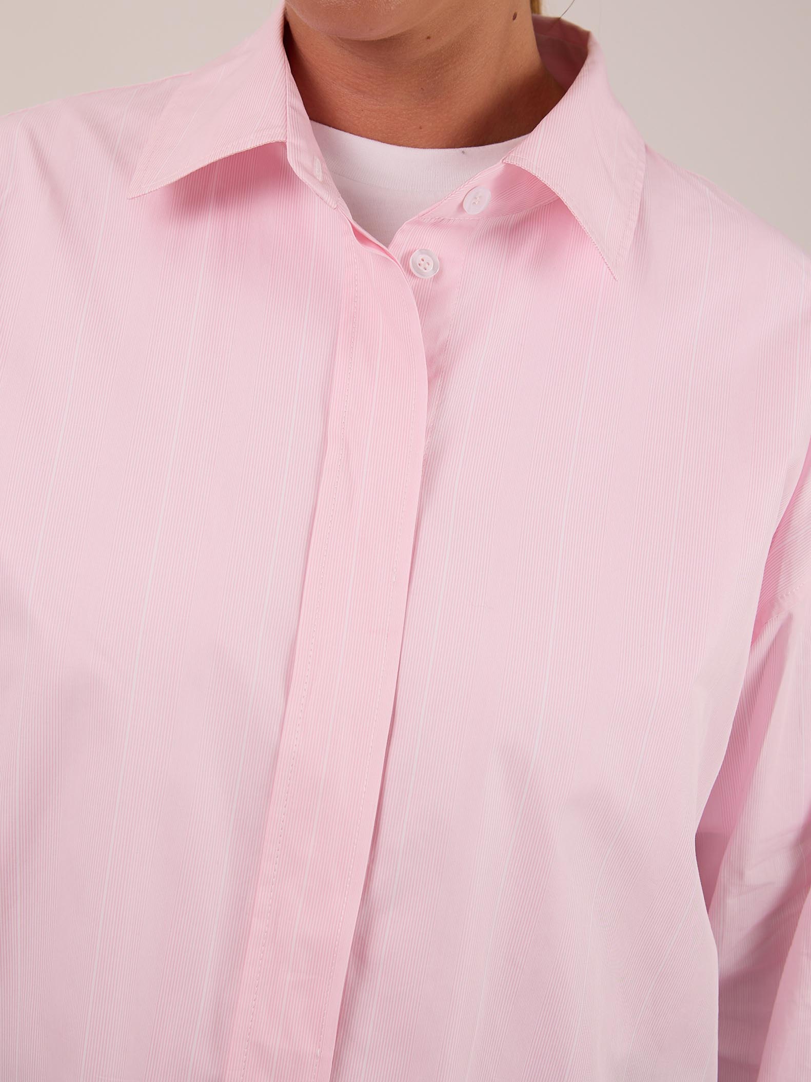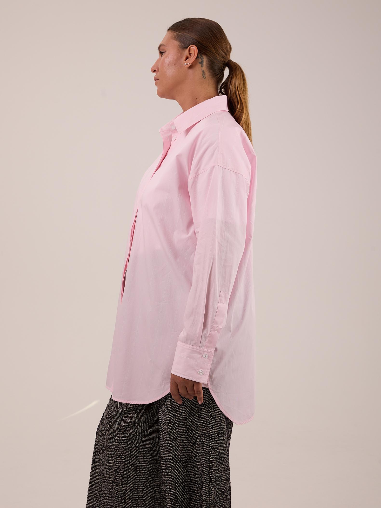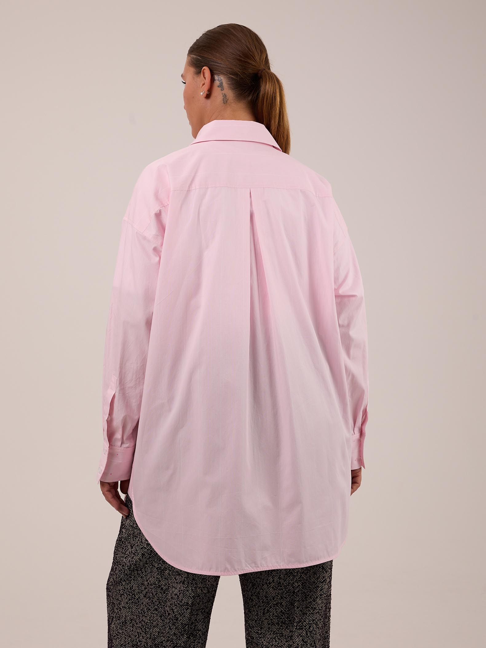 Рубашка «овер» свободного кроя, длиной до середины бедра. Воротник отложной на стойке. Плечевой пояс спущенный. Рукава длинные с широкими манжетами, застегиваются на петли и пуговицы. На спинке отрезная кокетка и встречная складка. Низ оформлен плавными линиями с закругленными разрезами в боковых швах. Рубашка застегивается на супатные пуговицы. Изделие выполнено из хлопковой ткани в розовом цвете.
