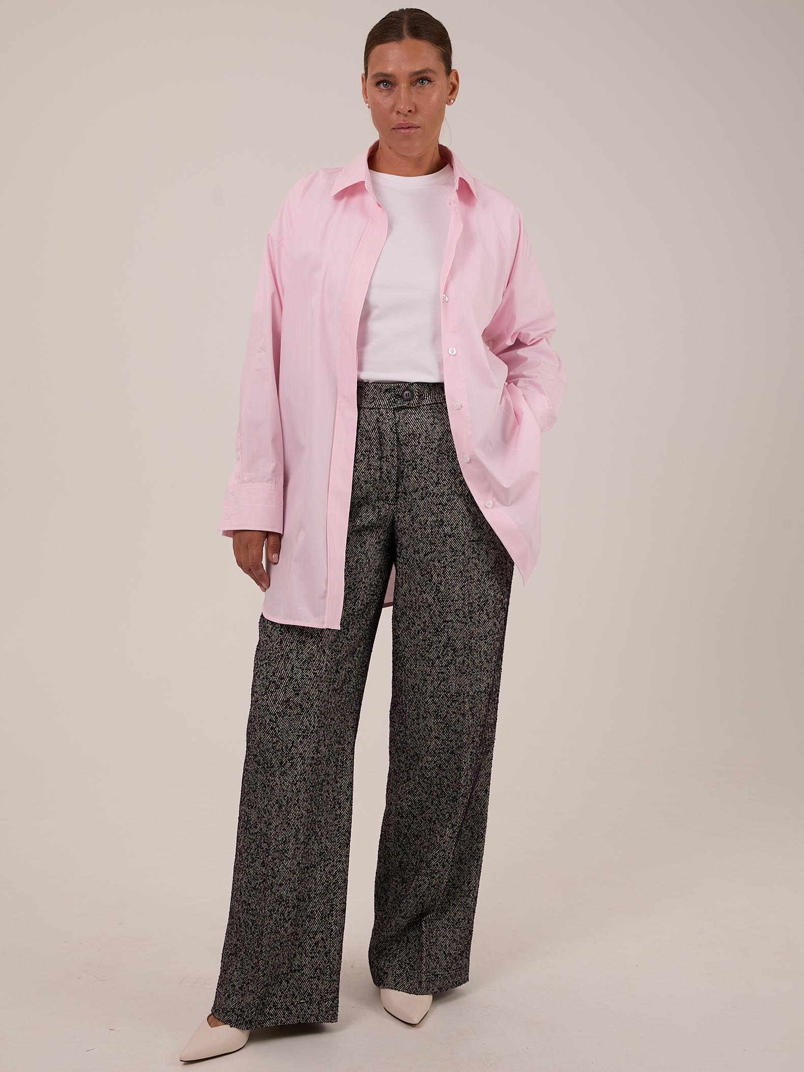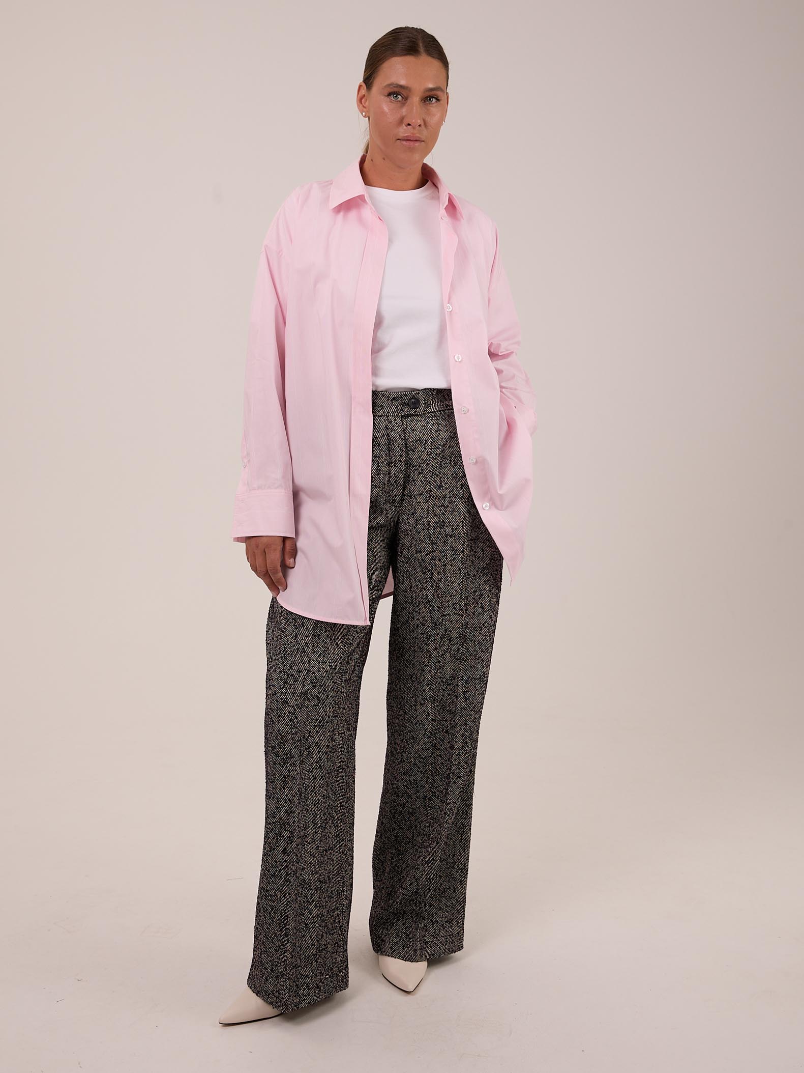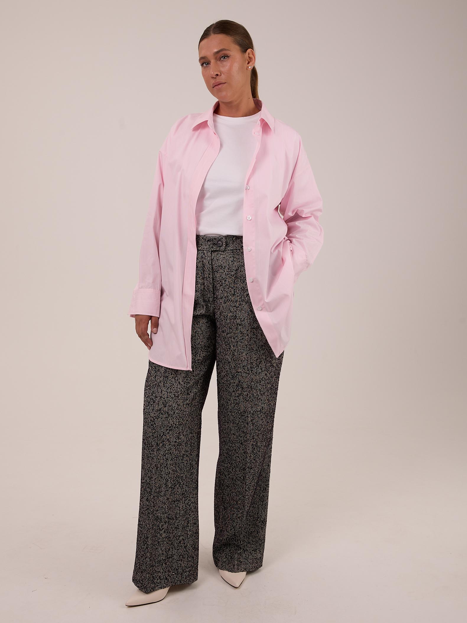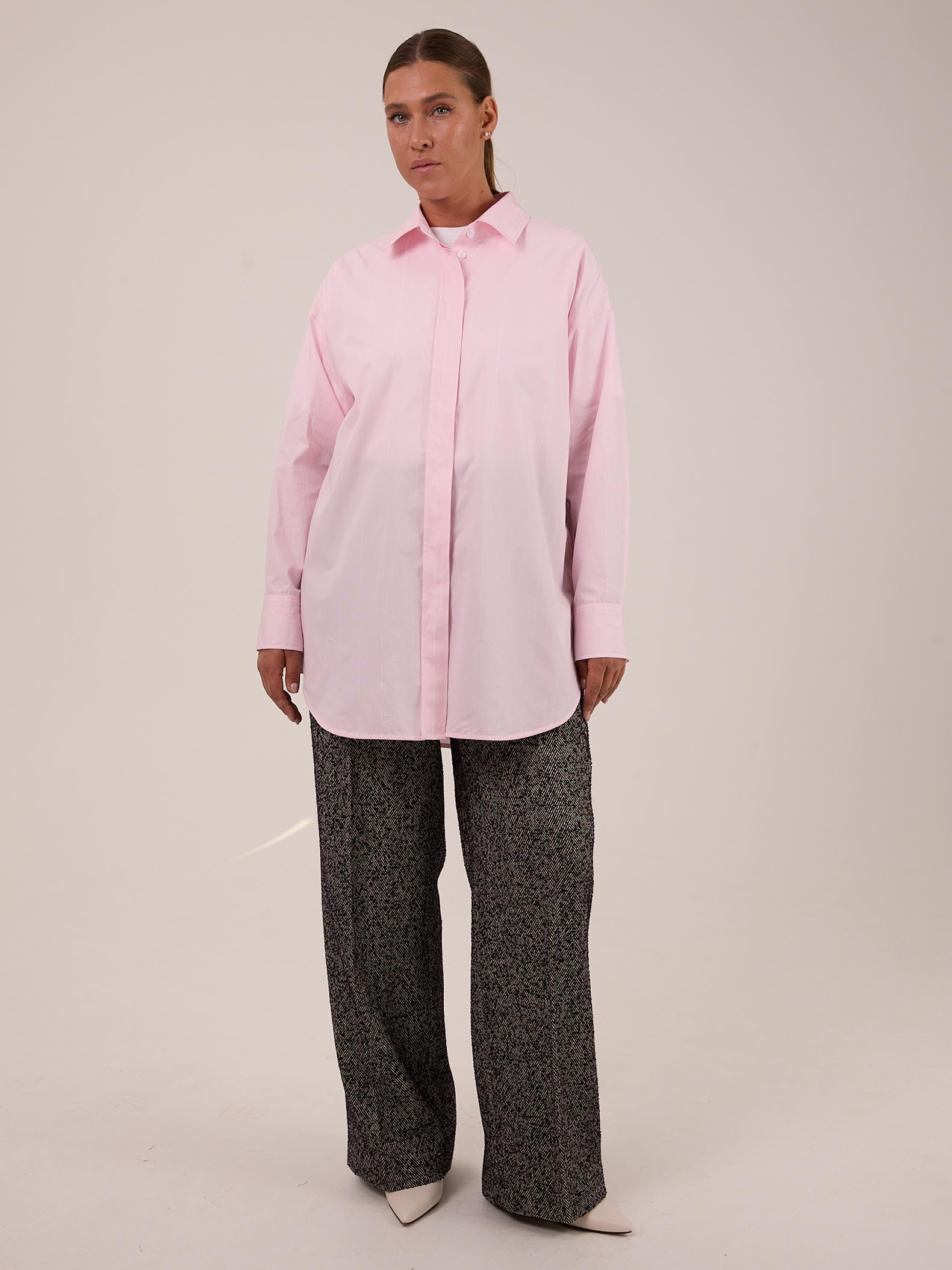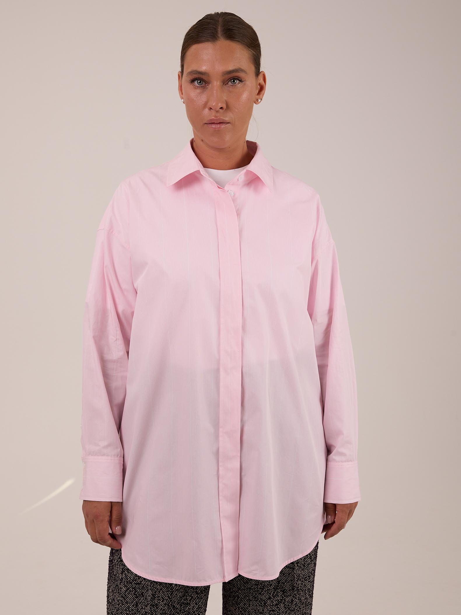 Рубашка «овер» свободного кроя, длиной до середины бедра. Воротник отложной на стойке. Плечевой пояс спущенный. Рукава длинные с широкими манжетами, застегиваются на петли и пуговицы. На спинке отрезная кокетка и встречная складка. Низ оформлен плавными линиями с закругленными разрезами в боковых швах. Рубашка застегивается на супатные пуговицы. Изделие выполнено из хлопковой ткани в розовом цвете.