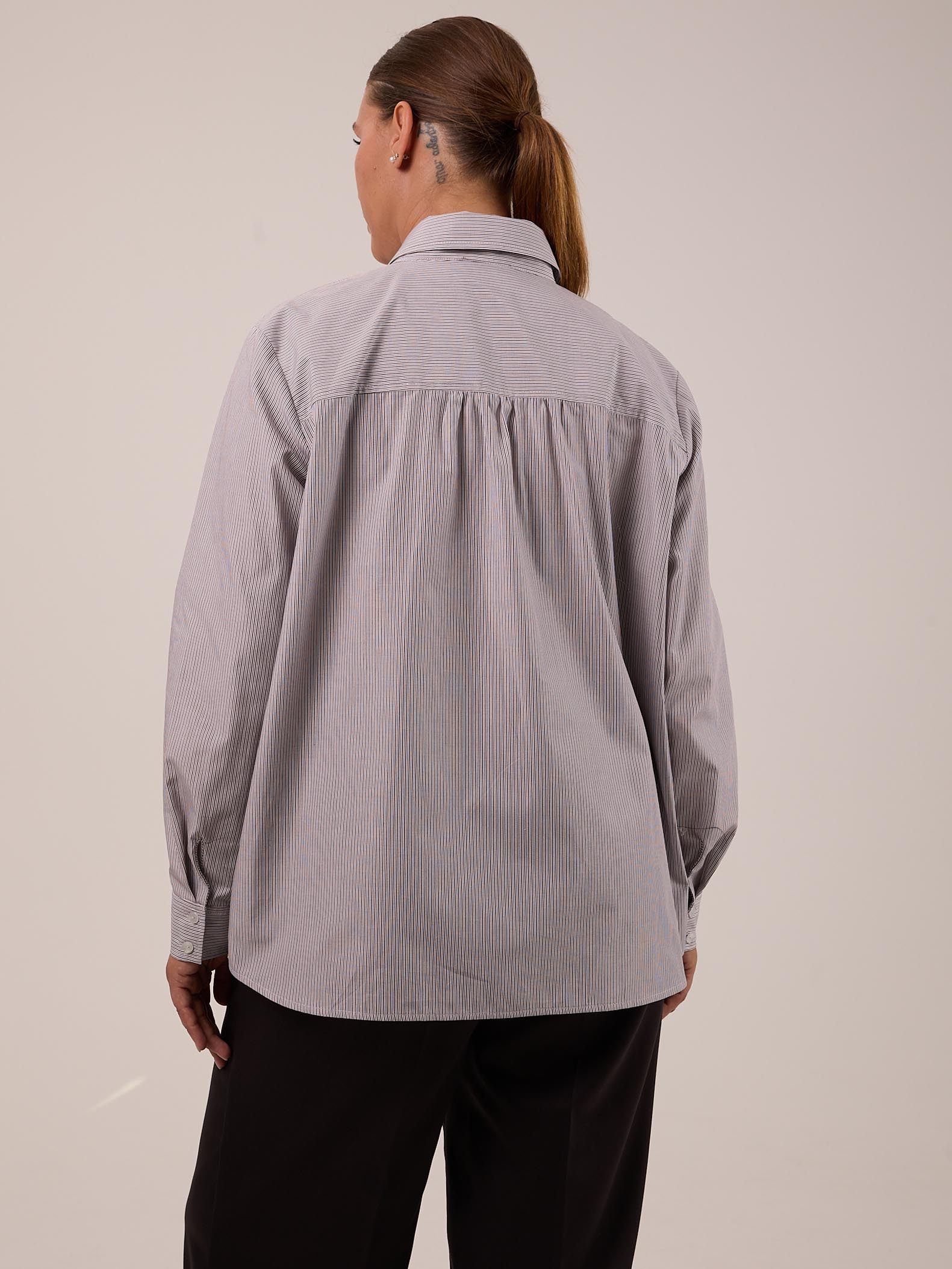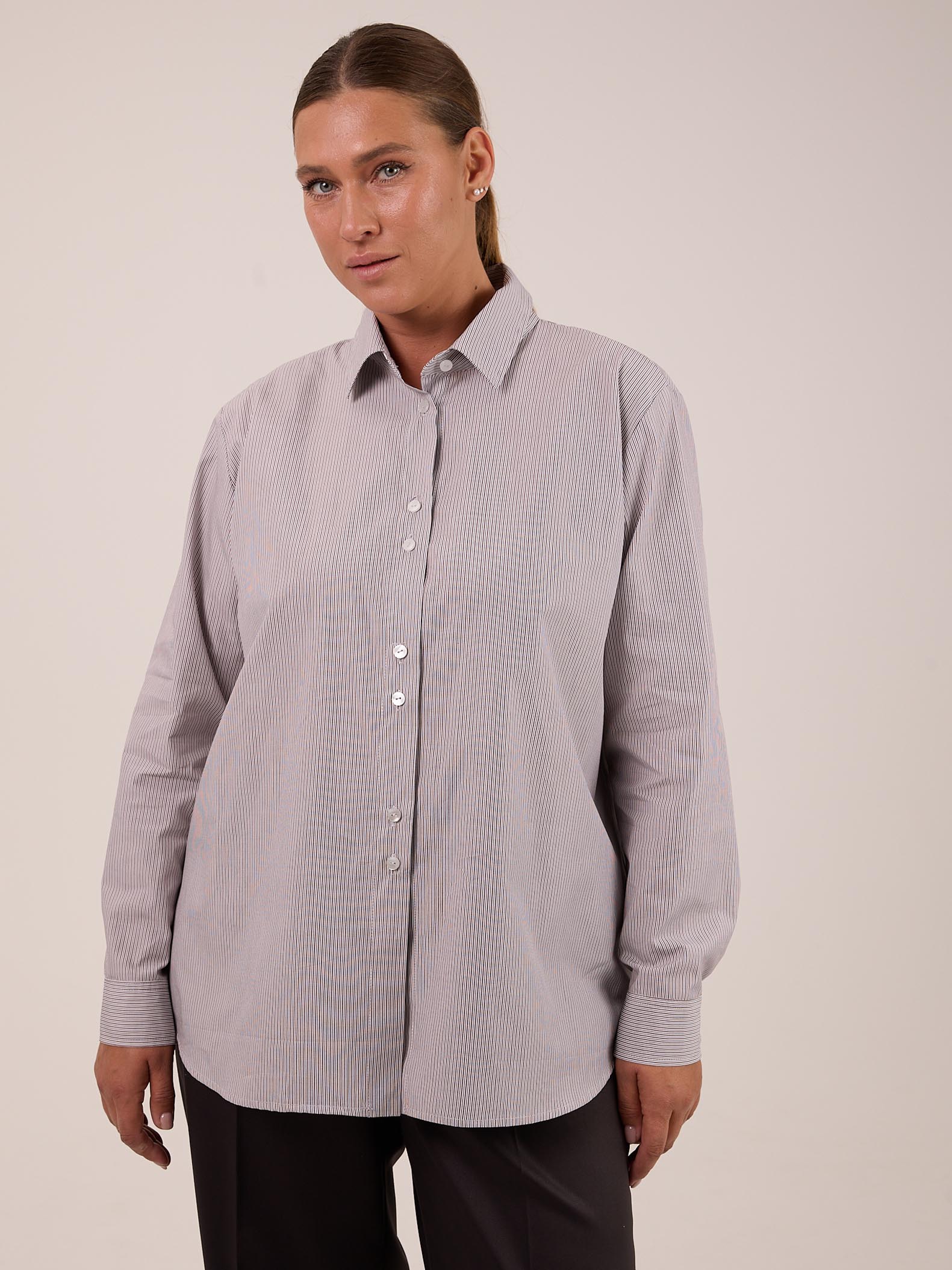 Классическая рубашка прямого кроя с приспущенным плечевым поясом. Воротник отложной на стойке. Рукава длинные с манжетами. На спинке, под кокеткой выполнена небольшая сборка, которая обеспечивает дополнительный объем. Низ оформлен плавной линией с закругленными боками. Застегивается рубашка на петли и пуговицы. Выполнена из хлопковой ткани в двух цветах: розовом и бежевом.