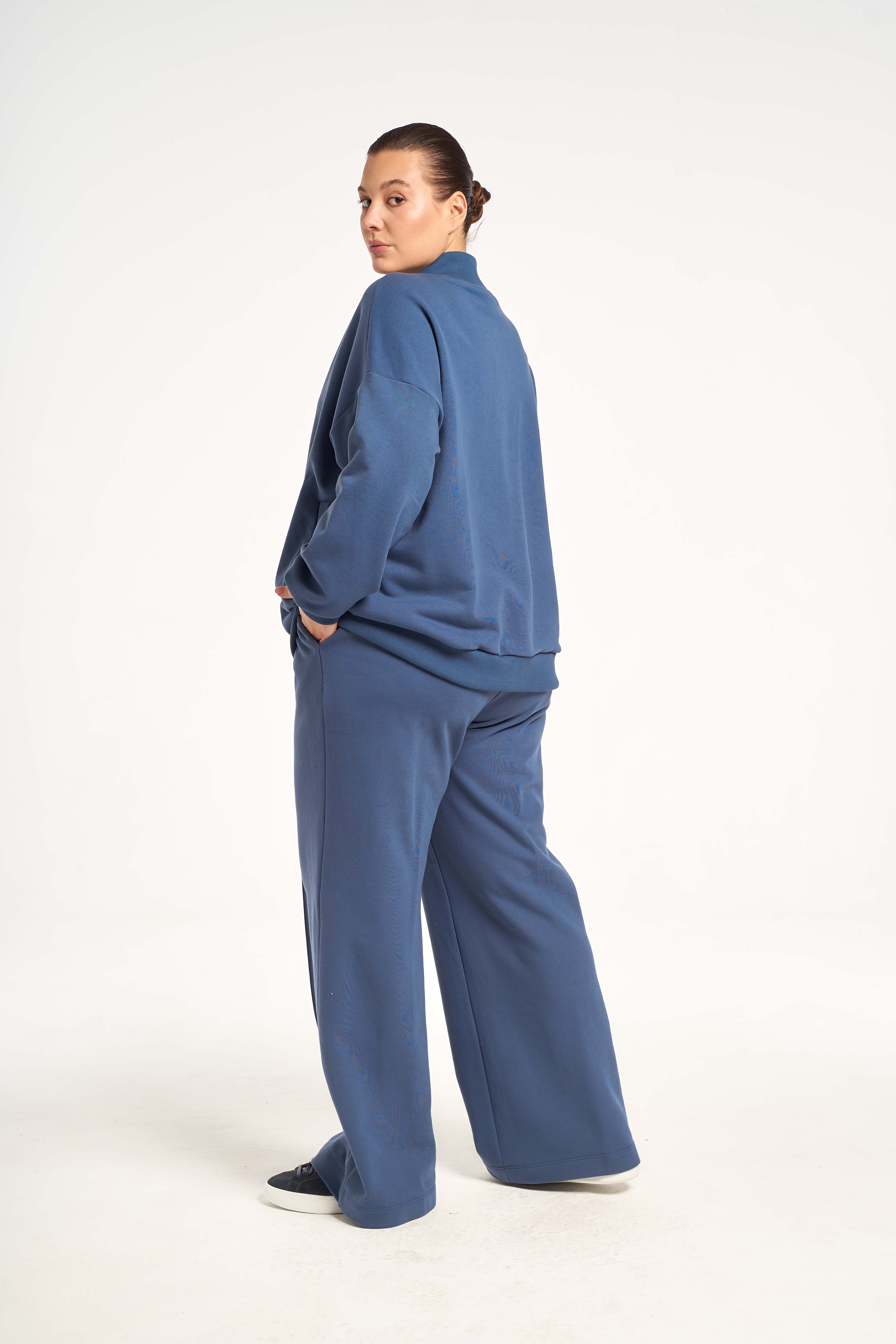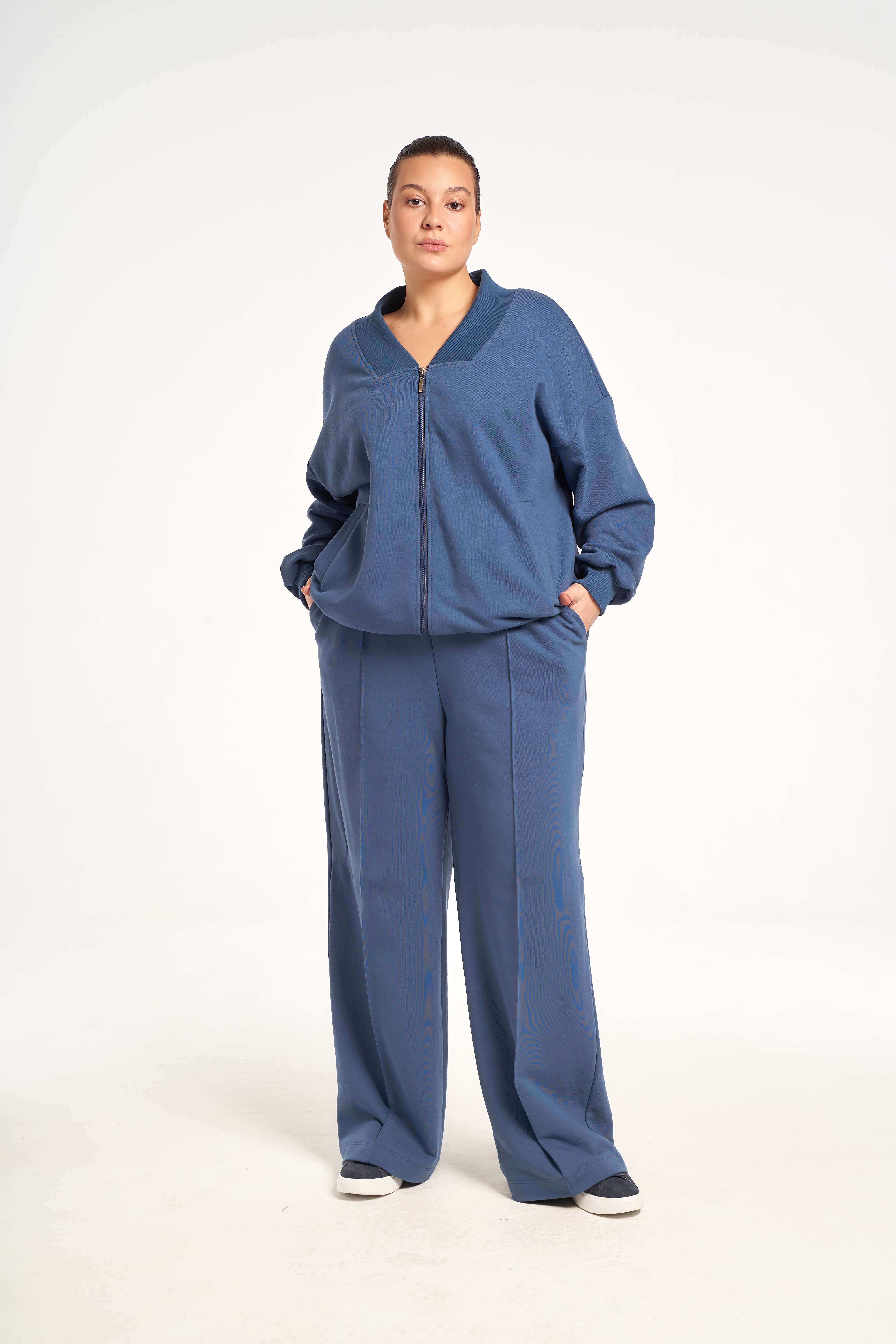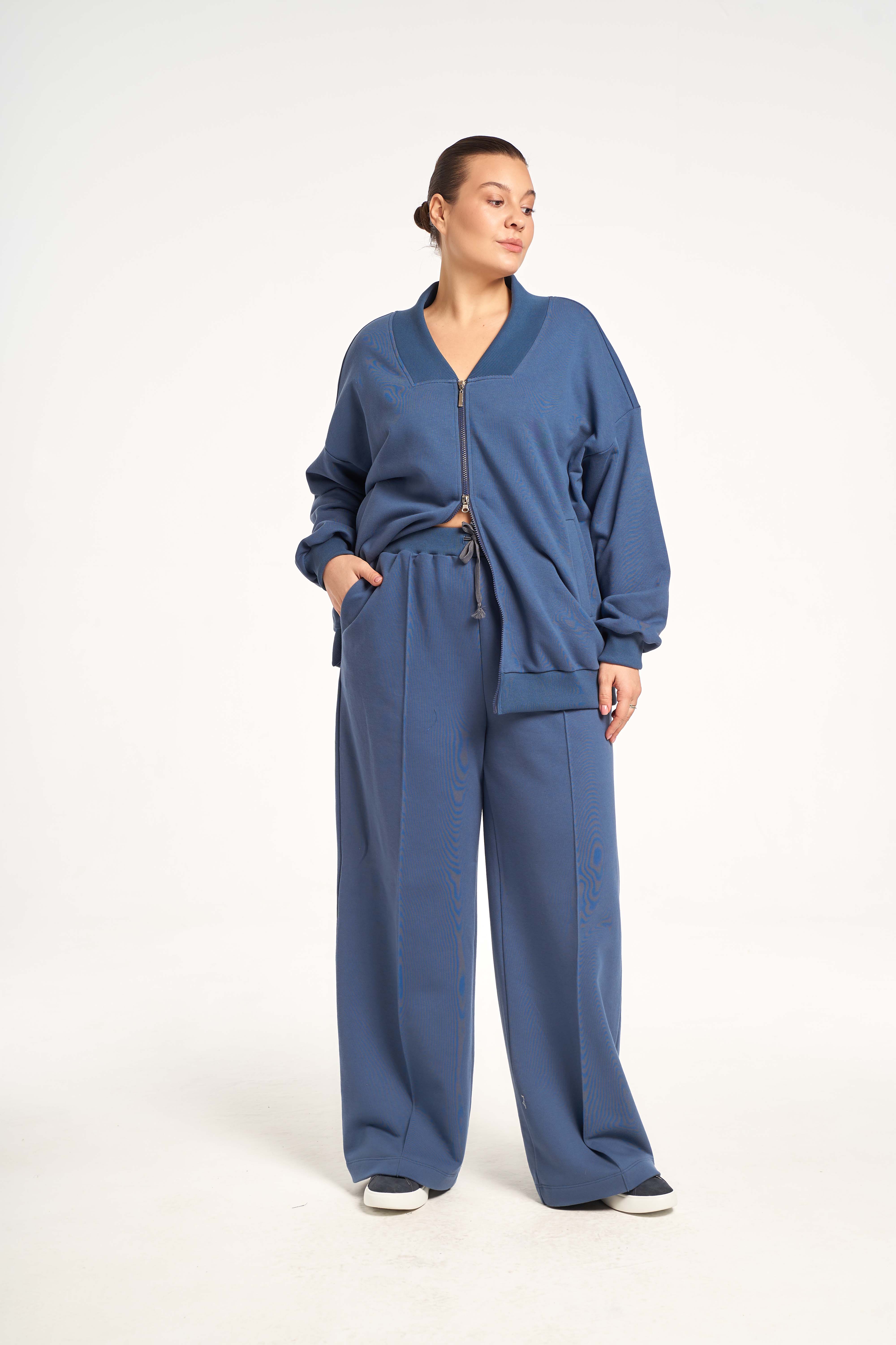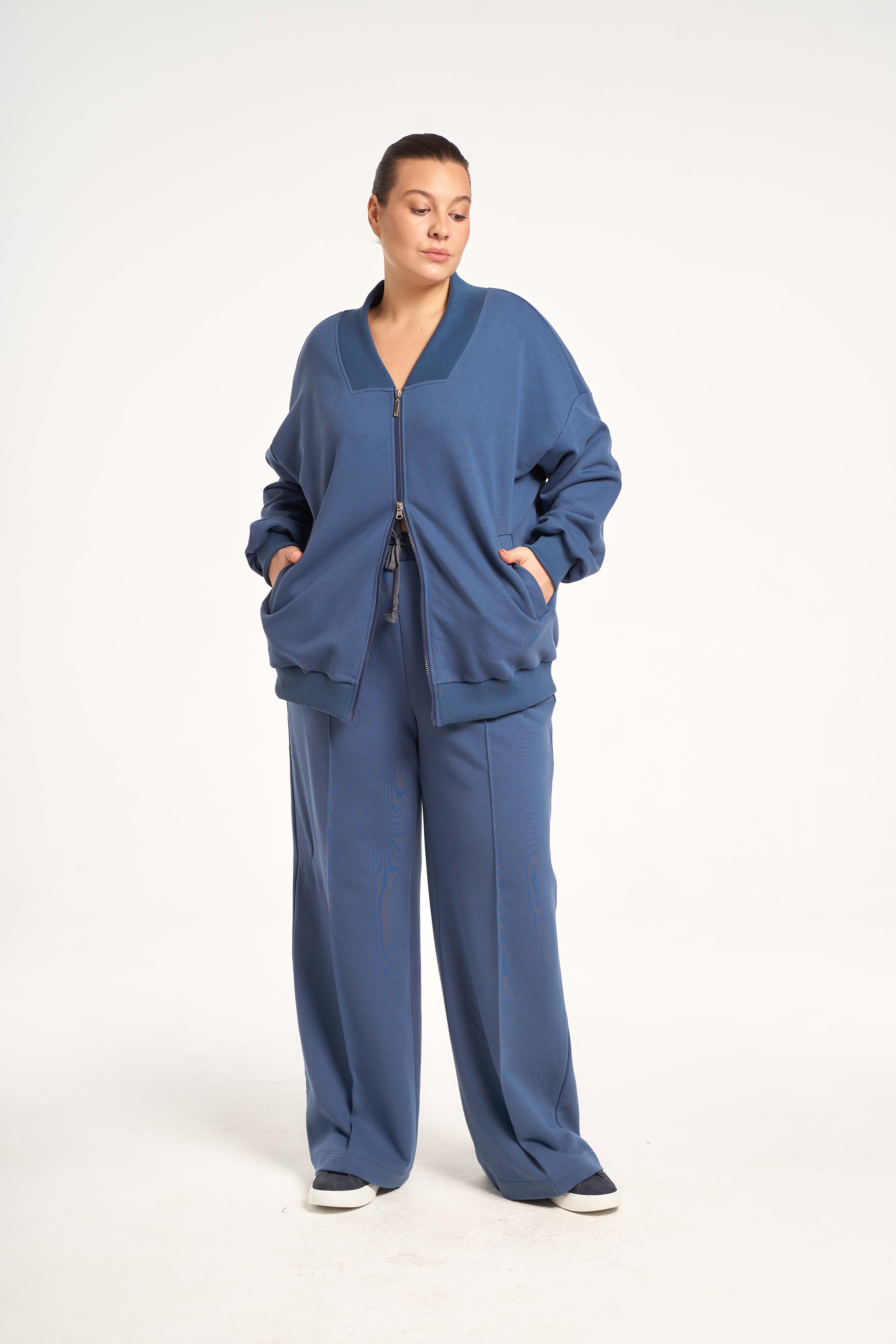 Костюм состоит из бомбера и брюк. Бомбер свободный, со спущенным плечевым поясом. Воротник трикотажный. Карманы с листочками. Рукава с трикотажными манжетами, низ изделия с трикотажным поясом. Застегивается бомбер на молнию. Брюки свободные, широкие по всей длине. Пояс трикотажный со шнуром. Костюм выполнен из хлопкосодержащего трикотажного футера.