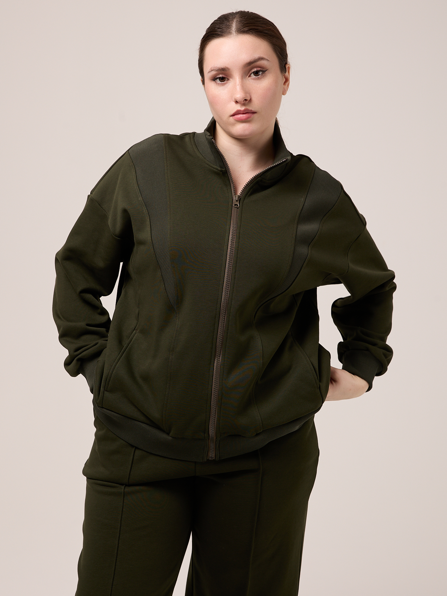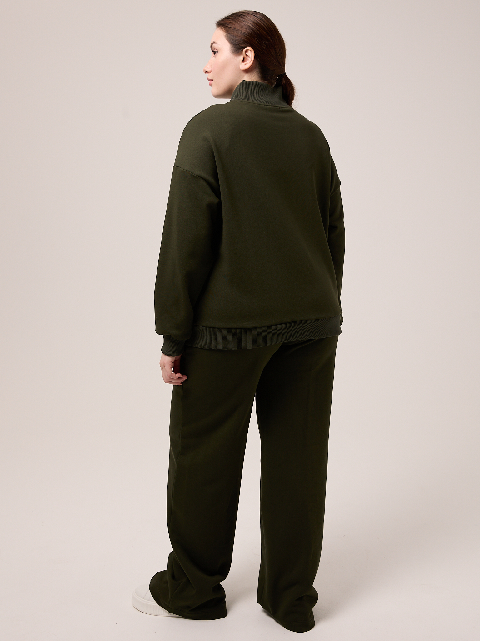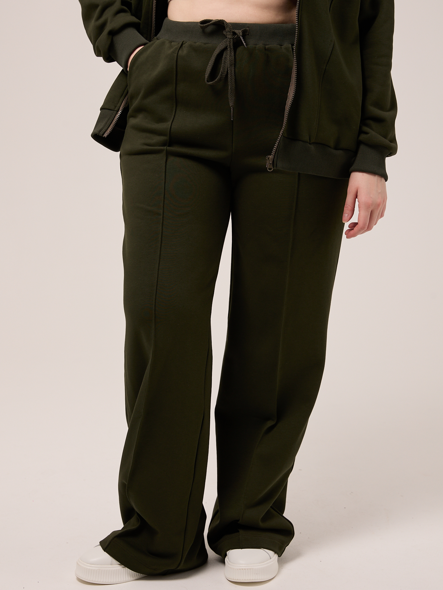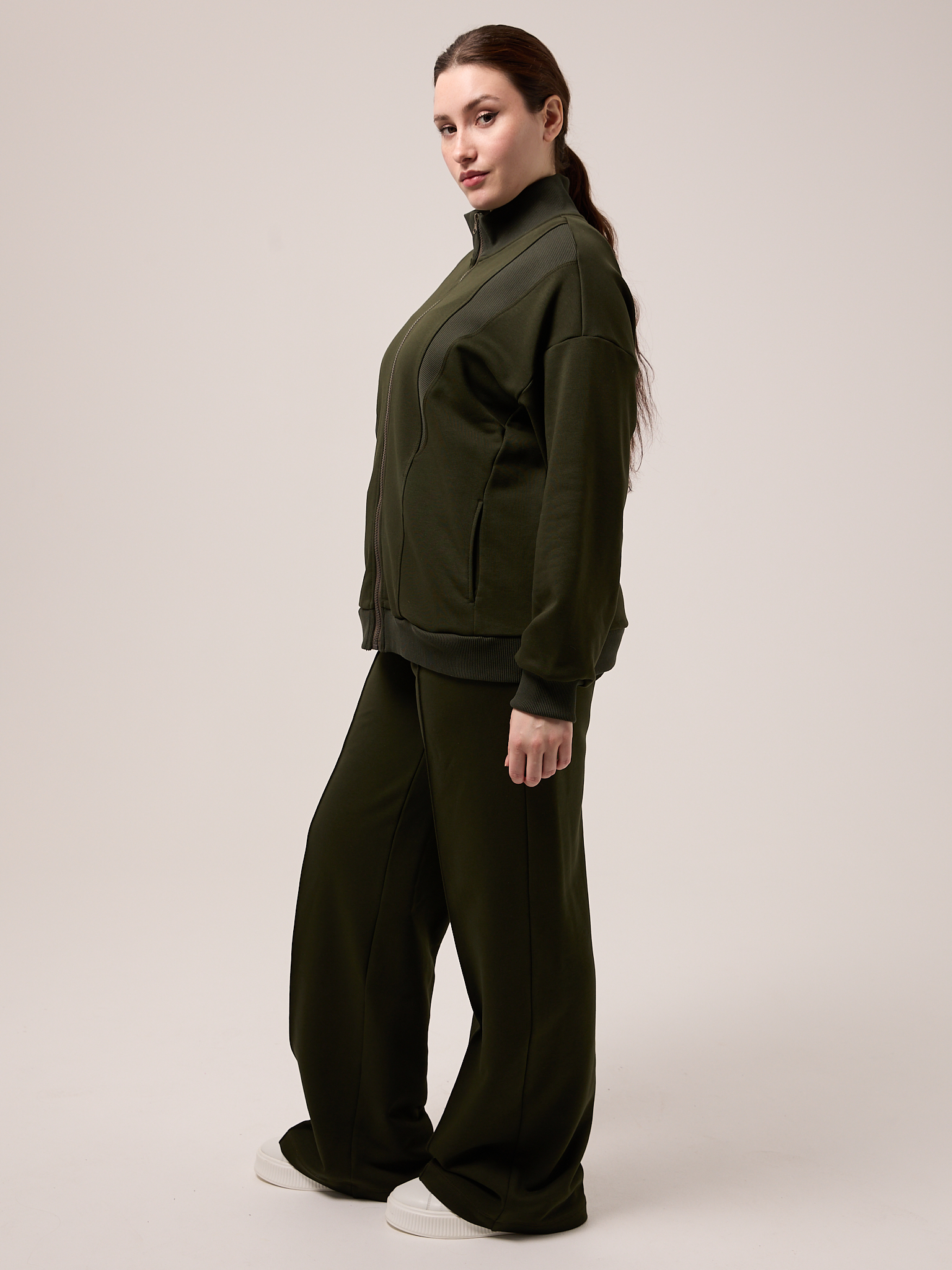 Костюм состоит из бомбера и брюк. Бомбер свободный, со спущенным плечевым поясом. Воротник трикотажный. Карманы выполнены в швах. Рукава с трикотажными манжетами, низ изделия с трикотажным поясом. Застегивается бомбер на молнию. Брюки свободные, широкие по всей длине. Пояс трикотажный со шнуром. Боковые карманы на передних половинках. Костюм выполнен из хлопкового трикотажного футера в трех цветах: молочном, черном и коричневом.