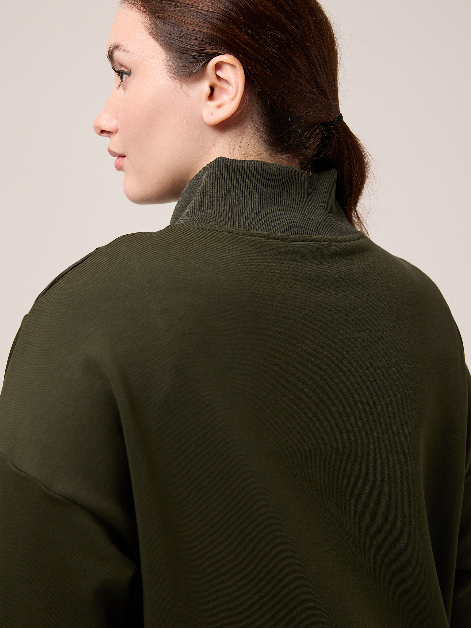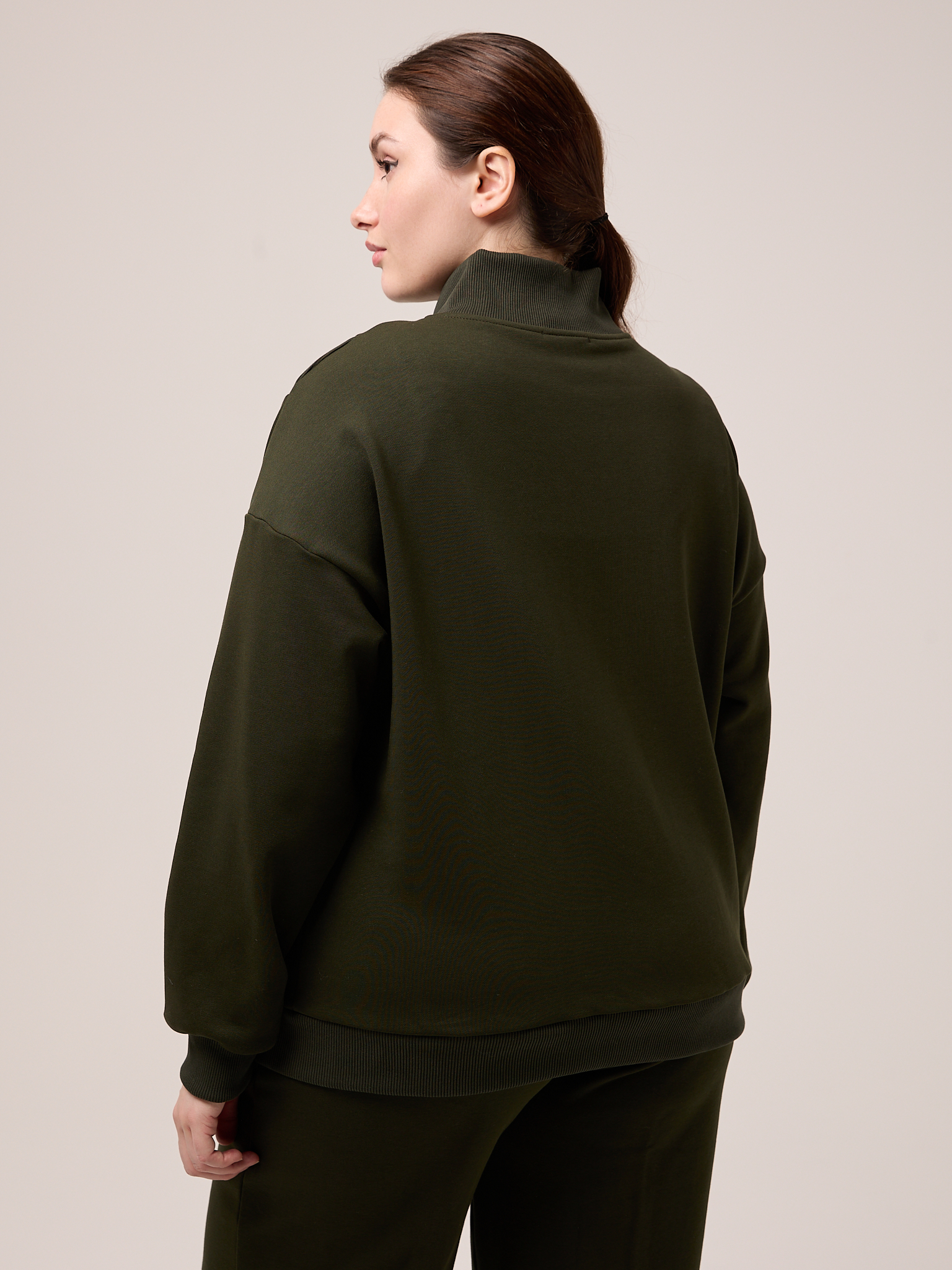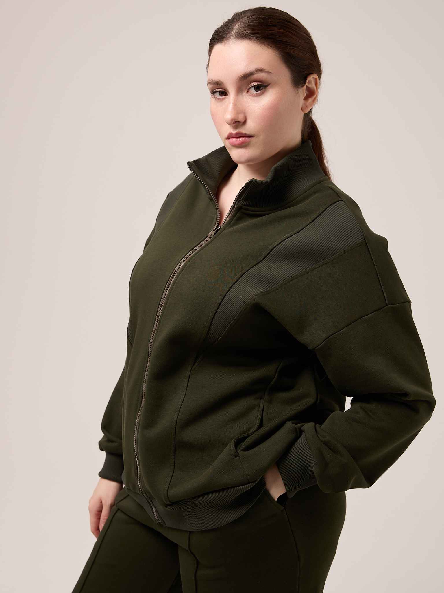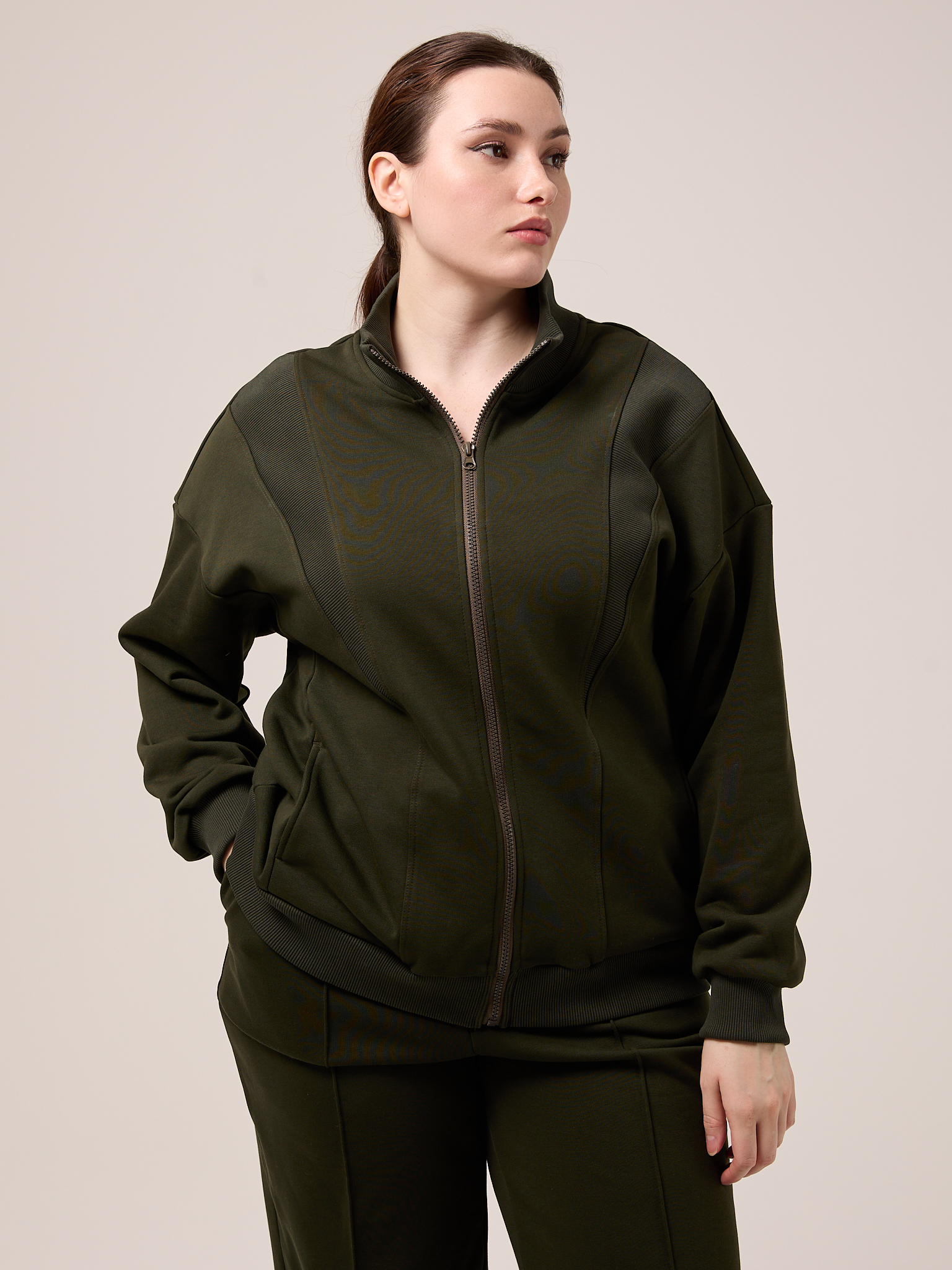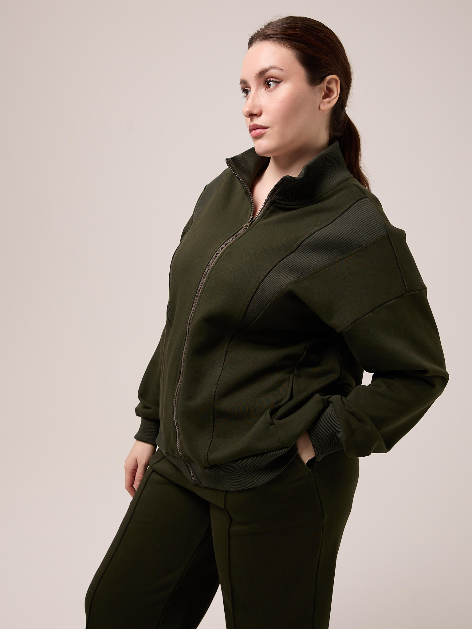 Костюм состоит из бомбера и брюк. Бомбер свободный, со спущенным плечевым поясом. Воротник трикотажный. Карманы выполнены в швах. Рукава с трикотажными манжетами, низ изделия с трикотажным поясом. Застегивается бомбер на молнию. Брюки свободные, широкие по всей длине. Пояс трикотажный со шнуром. Боковые карманы на передних половинках. Костюм выполнен из хлопкового трикотажного футера в трех цветах: молочном, черном и коричневом.