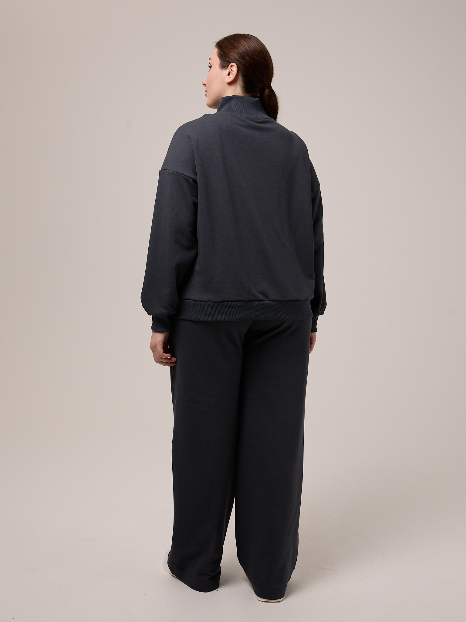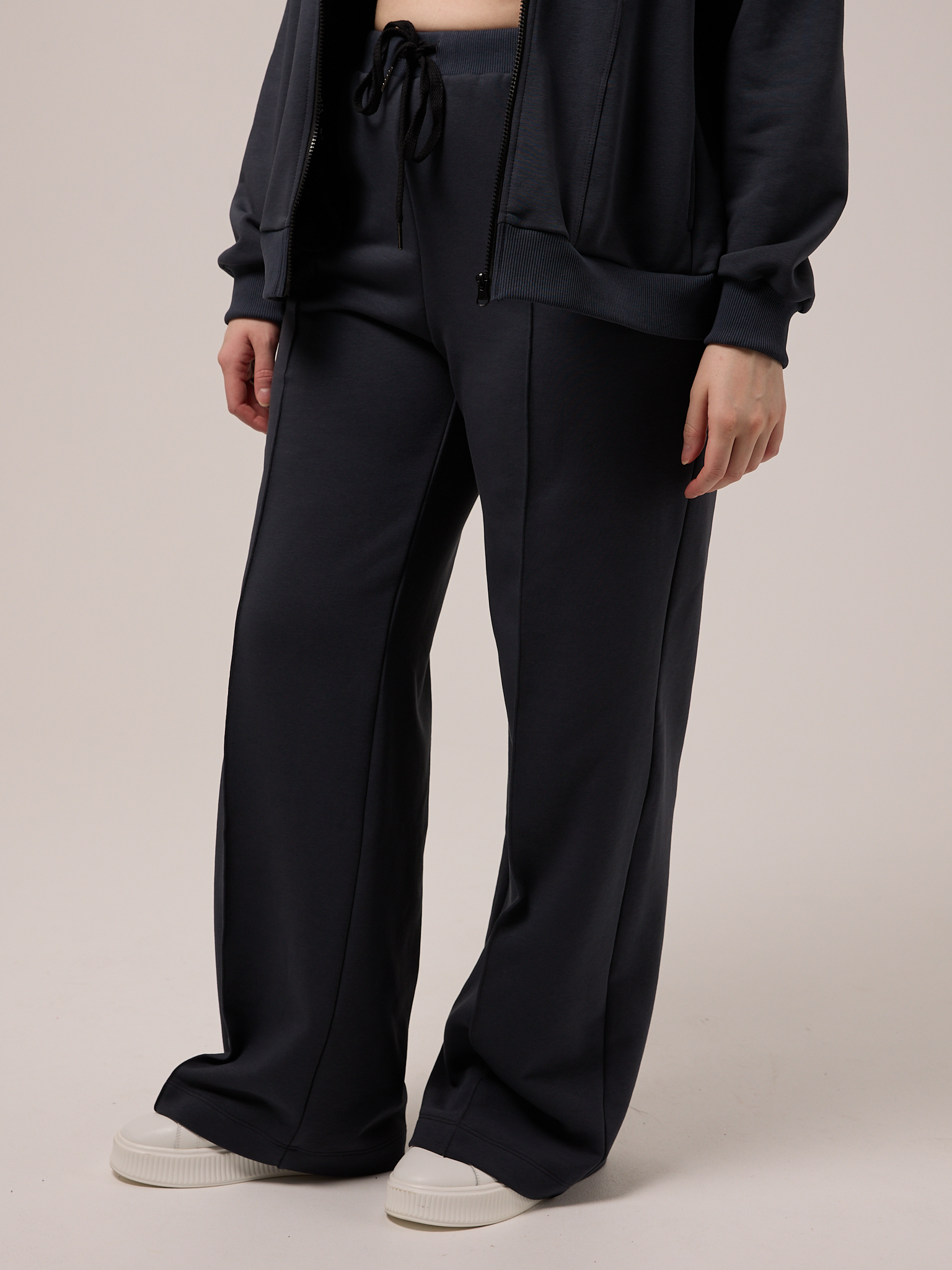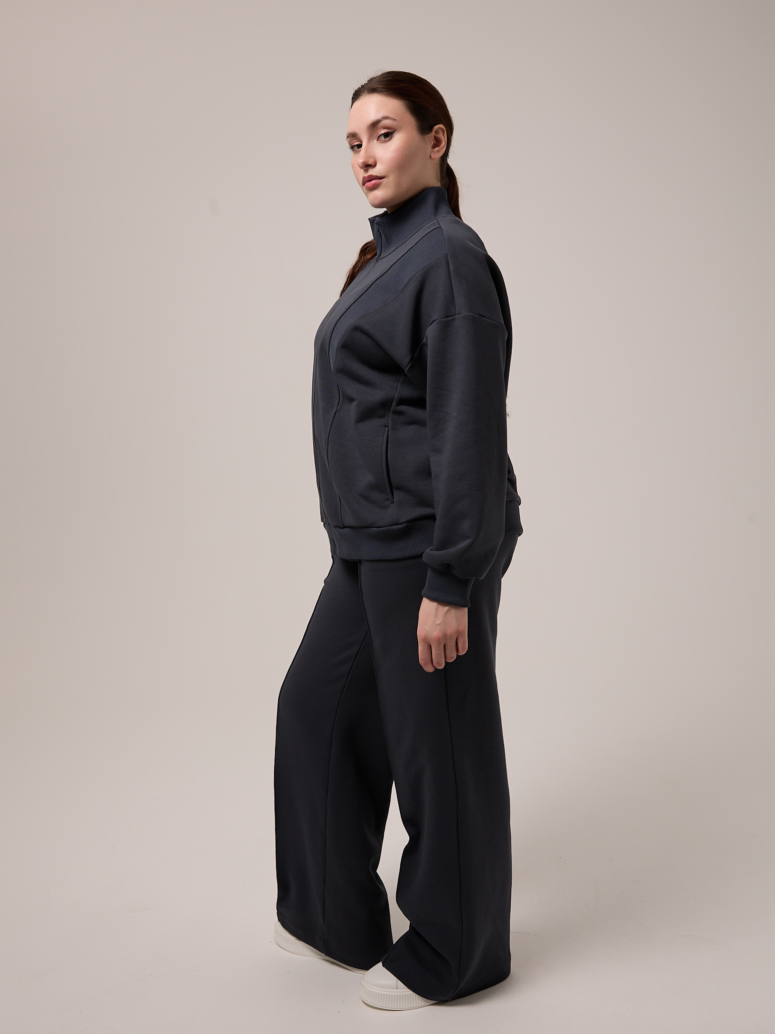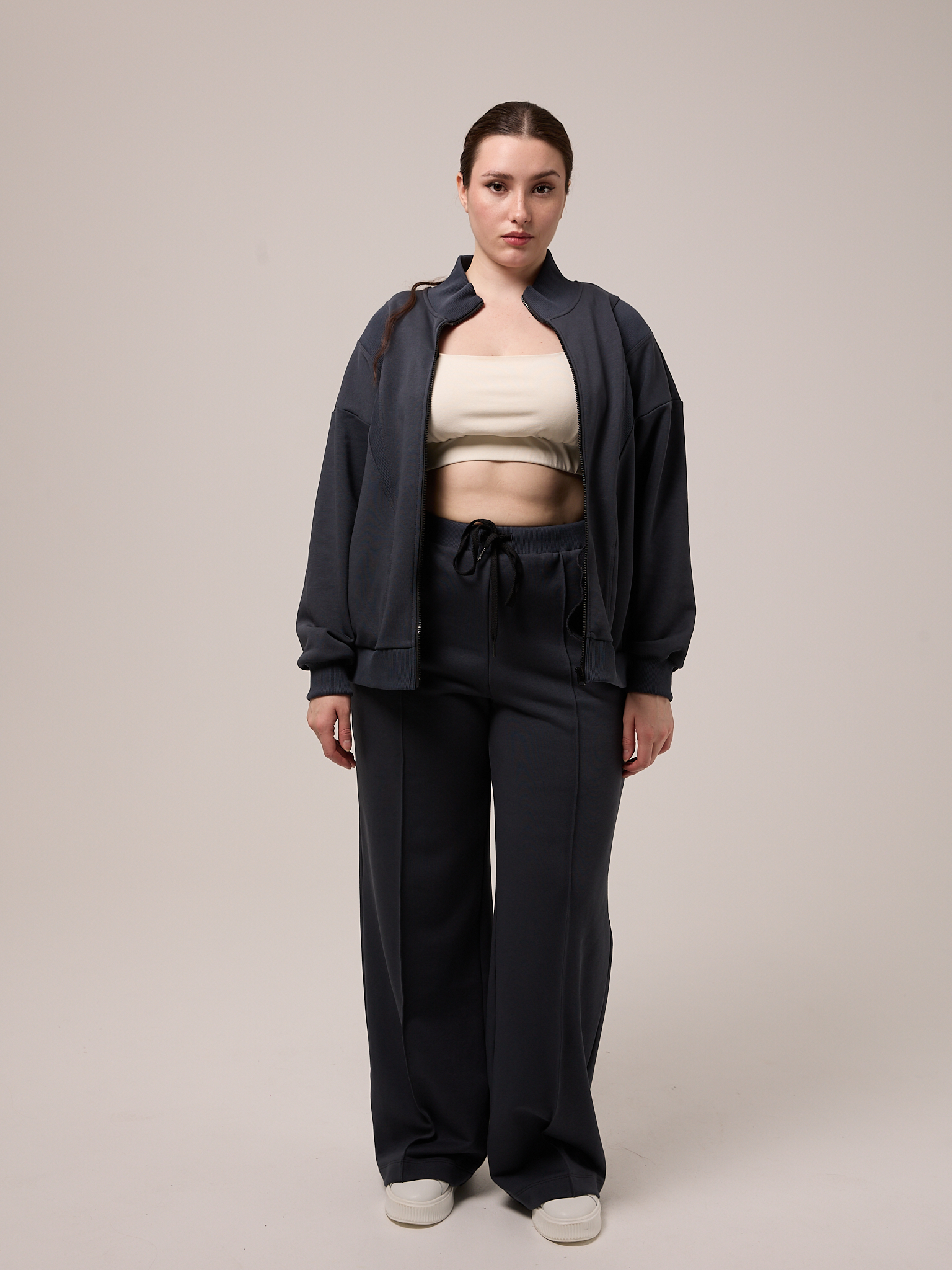 Костюм состоит из бомбера и брюк. Бомбер свободный, со спущенным плечевым поясом. Воротник трикотажный. Карманы выполнены в швах. Рукава с трикотажными манжетами, низ изделия с трикотажным поясом. Застегивается бомбер на молнию. Брюки свободные, широкие по всей длине. Пояс трикотажный со шнуром. Боковые карманы на передних половинках. Костюм выполнен из хлопкового трикотажного футера в трех цветах: молочном, черном и коричневом.