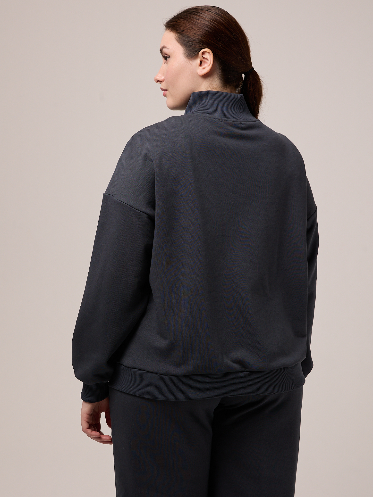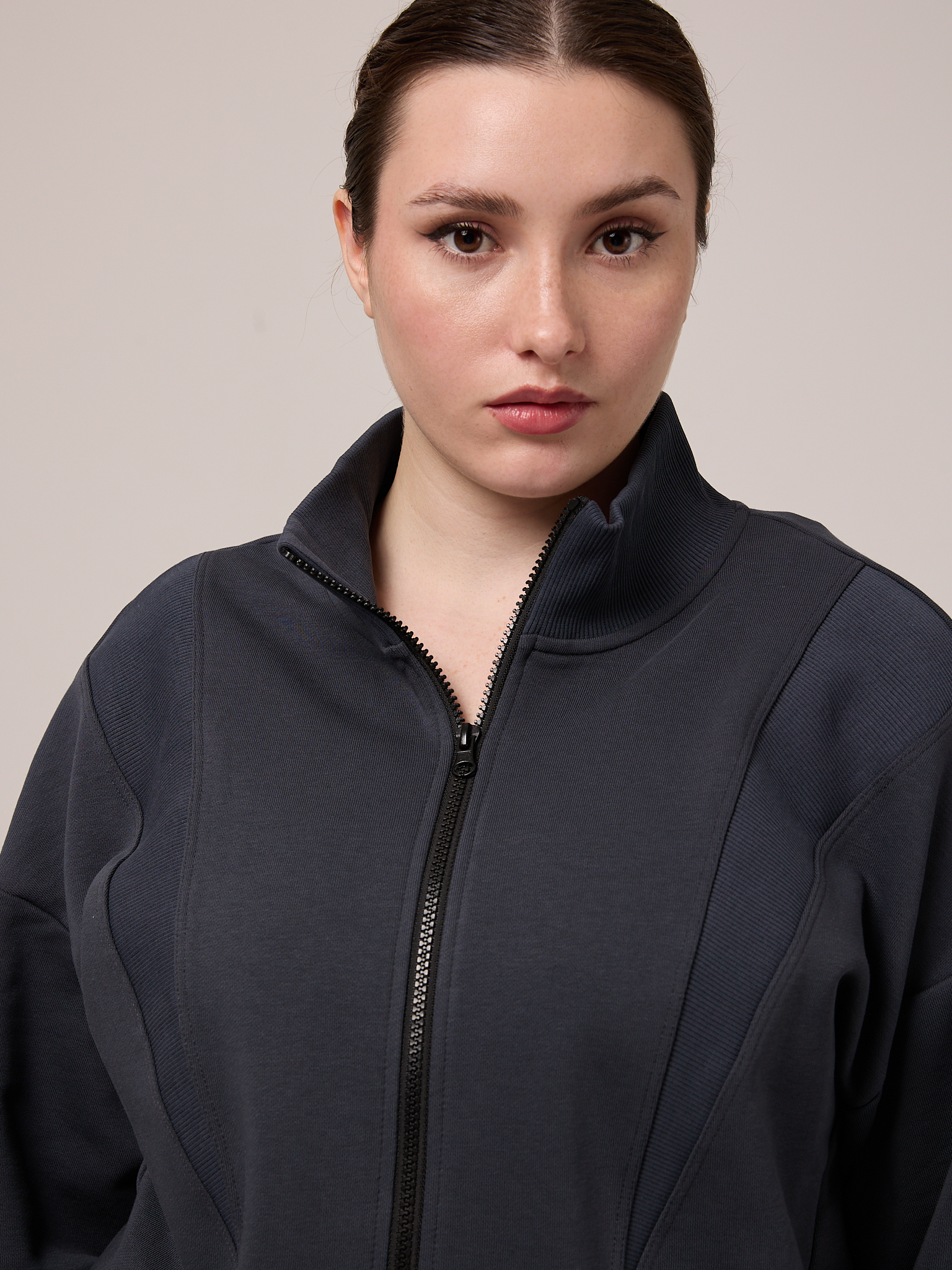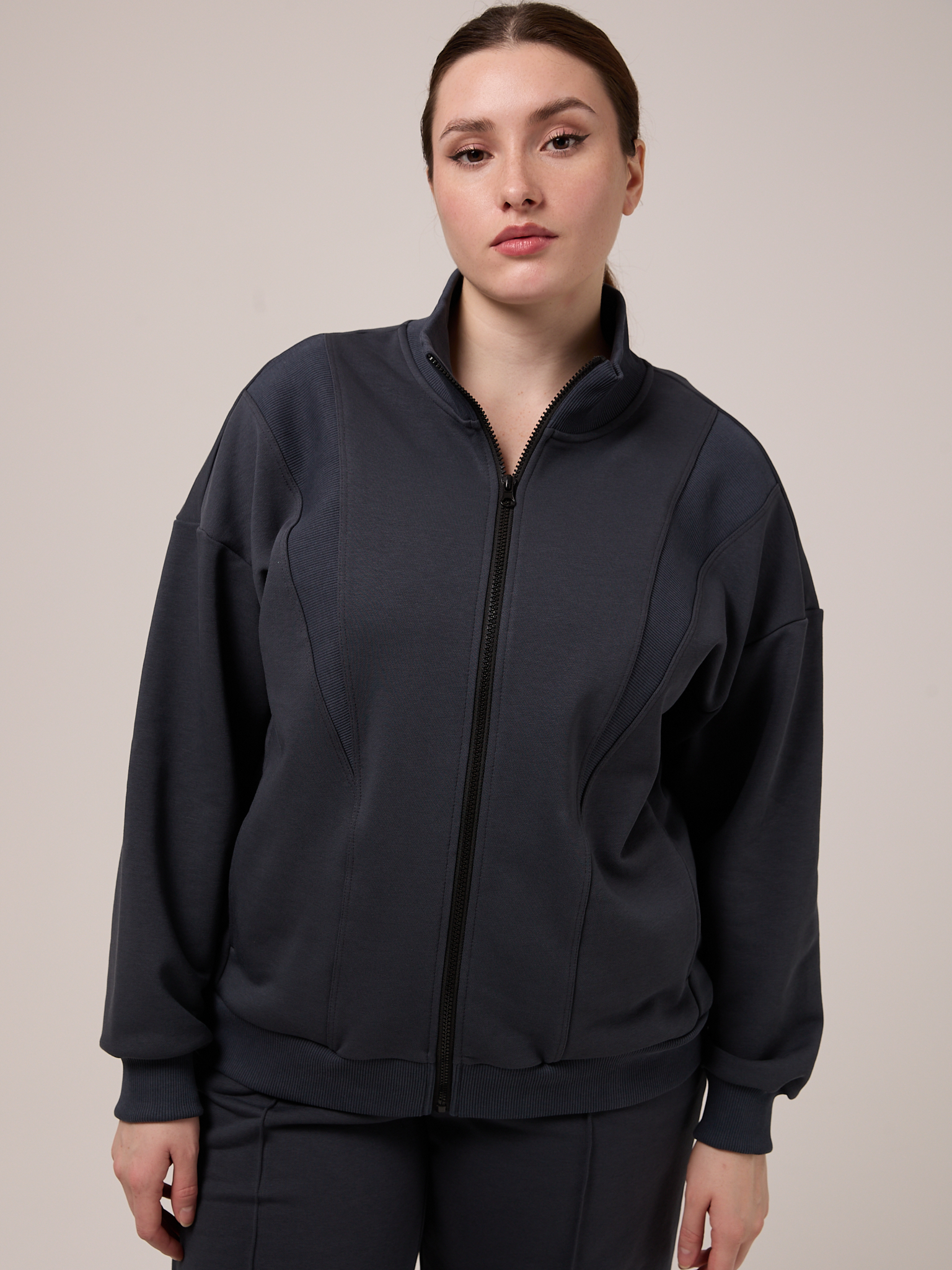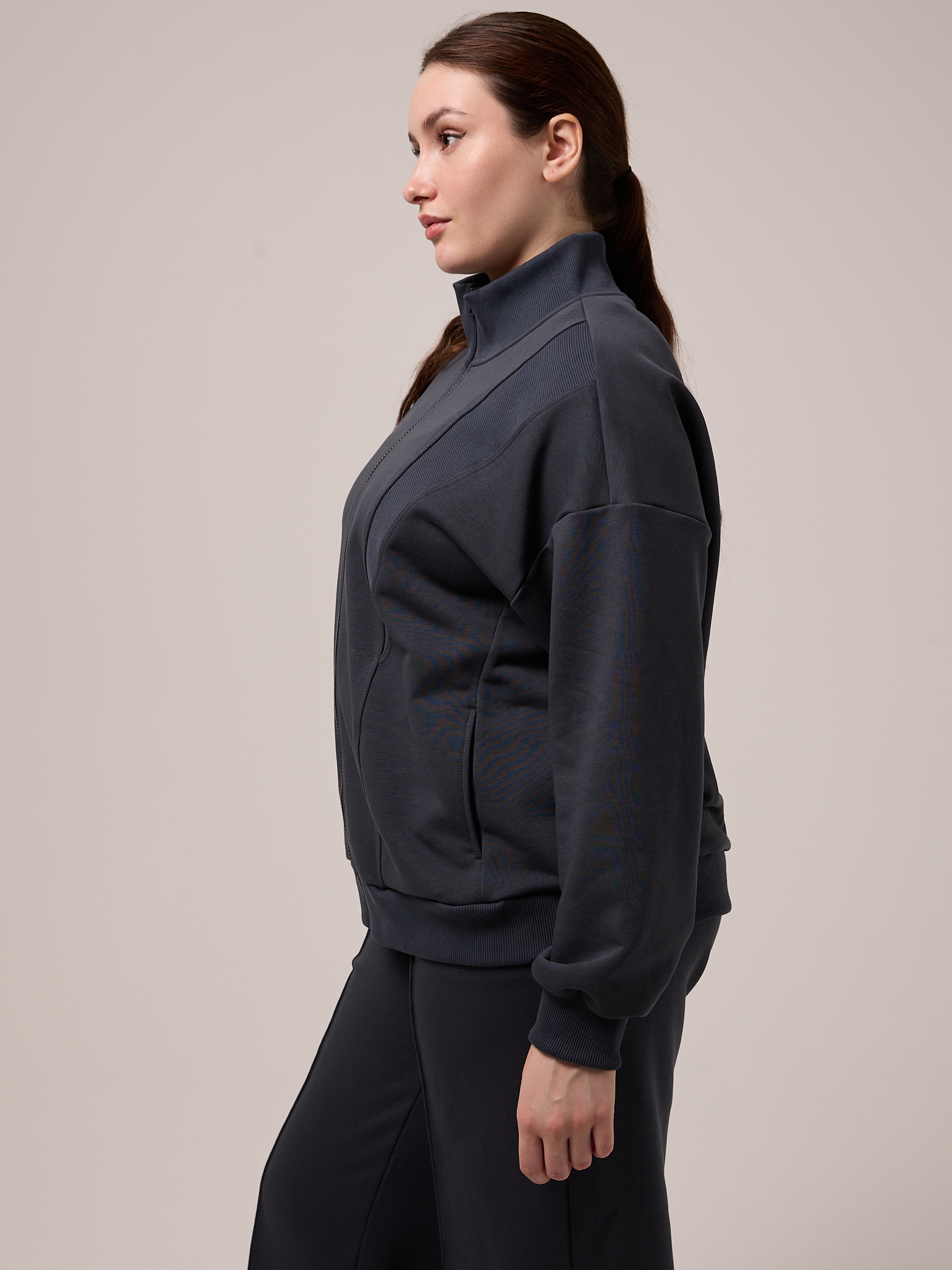Костюм состоит из бомбера и брюк. Бомбер свободный, со спущенным плечевым поясом. Воротник трикотажный. Карманы выполнены в швах. Рукава с трикотажными манжетами, низ изделия с трикотажным поясом. Застегивается бомбер на молнию. Брюки свободные, широкие по всей длине. Пояс трикотажный со шнуром. Боковые карманы на передних половинках. Костюм выполнен из хлопкового трикотажного футера в трех цветах: молочном, черном и коричневом.