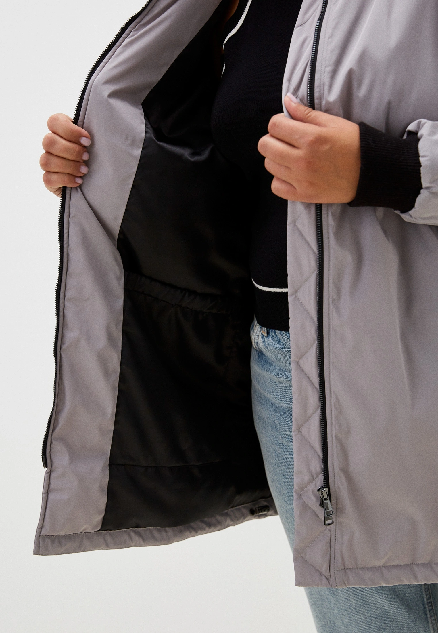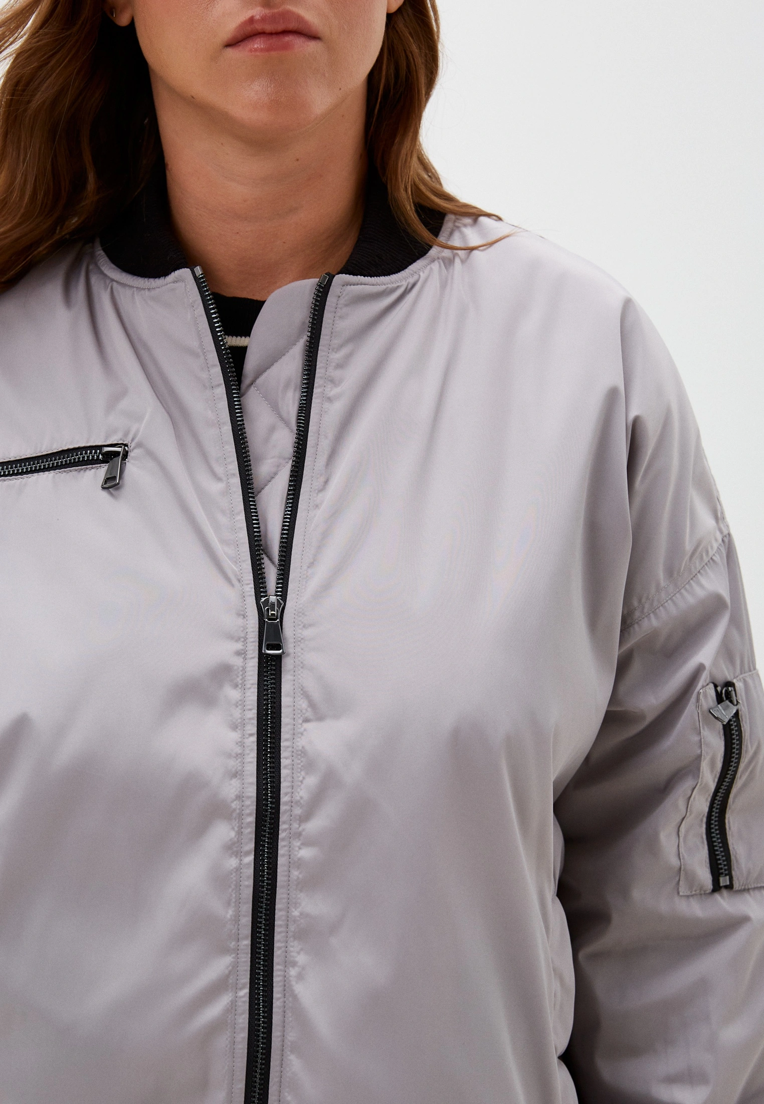 Утепленный бомбер, объемный, типа «овер». Плечевой пояс спущенный. Воротник трикотажный, низ рукавов с трикотажными манжетами. Боковые карманы прорезные с листочками. Дополнительно выполнены два функциональных кармана с молниями –нагрудный на правой полочке, и на левом рукаве. Длина бомберадо середины бедра. По низу изделия выполнена кулиска с регулируемой резинкой. Есть внутренний накладной карман на подкладке. Застежка борта-металлическая молния.