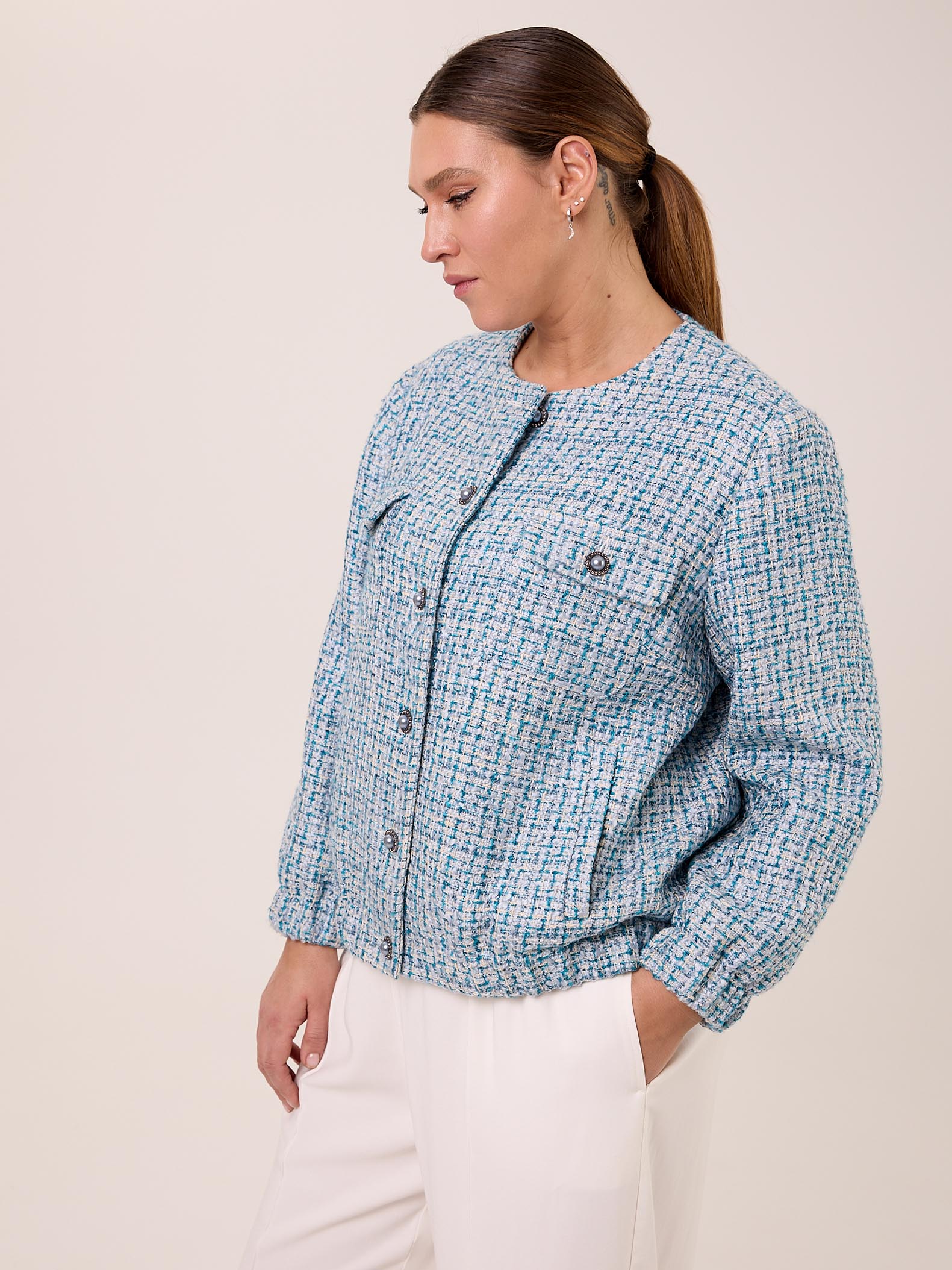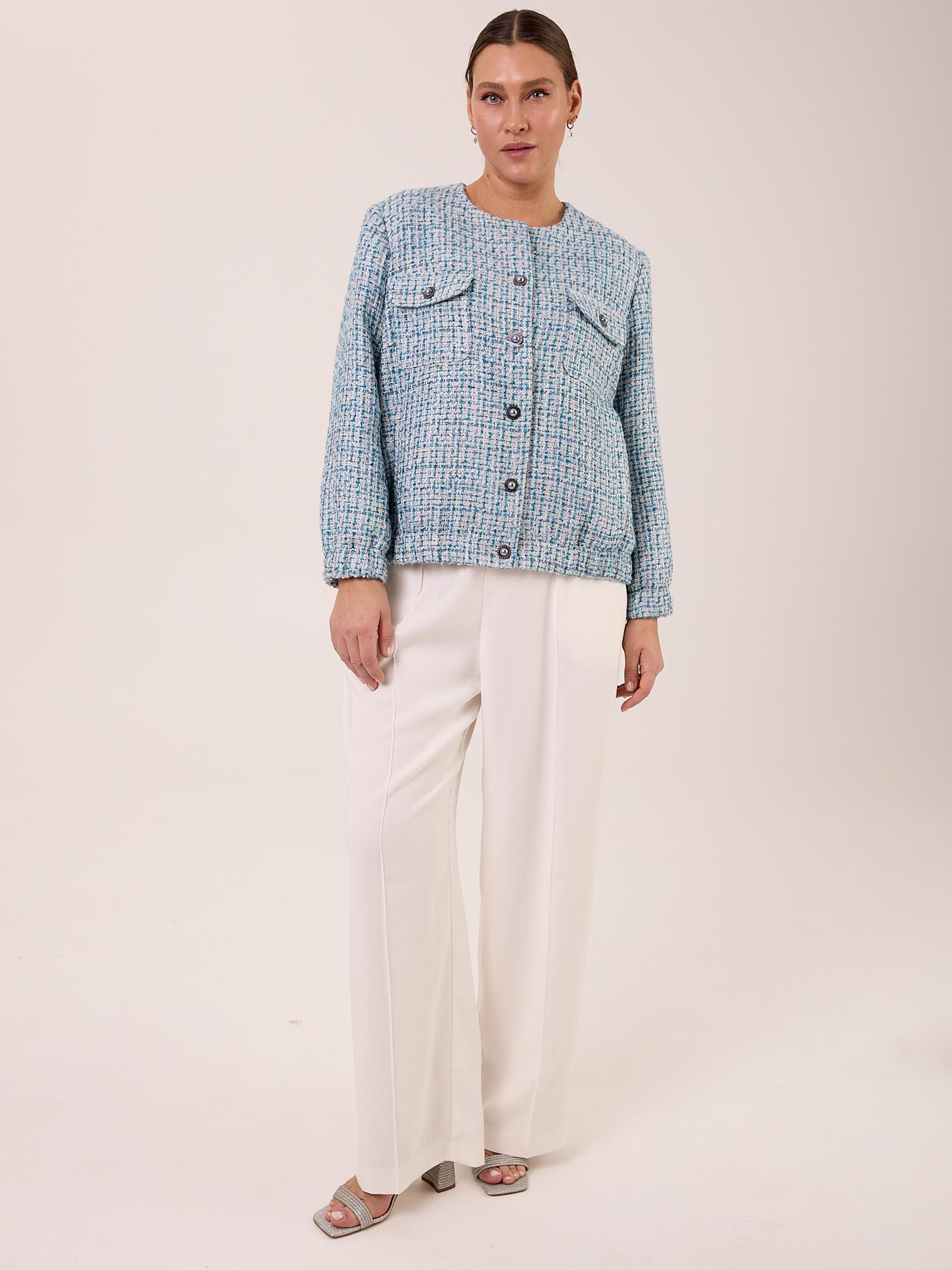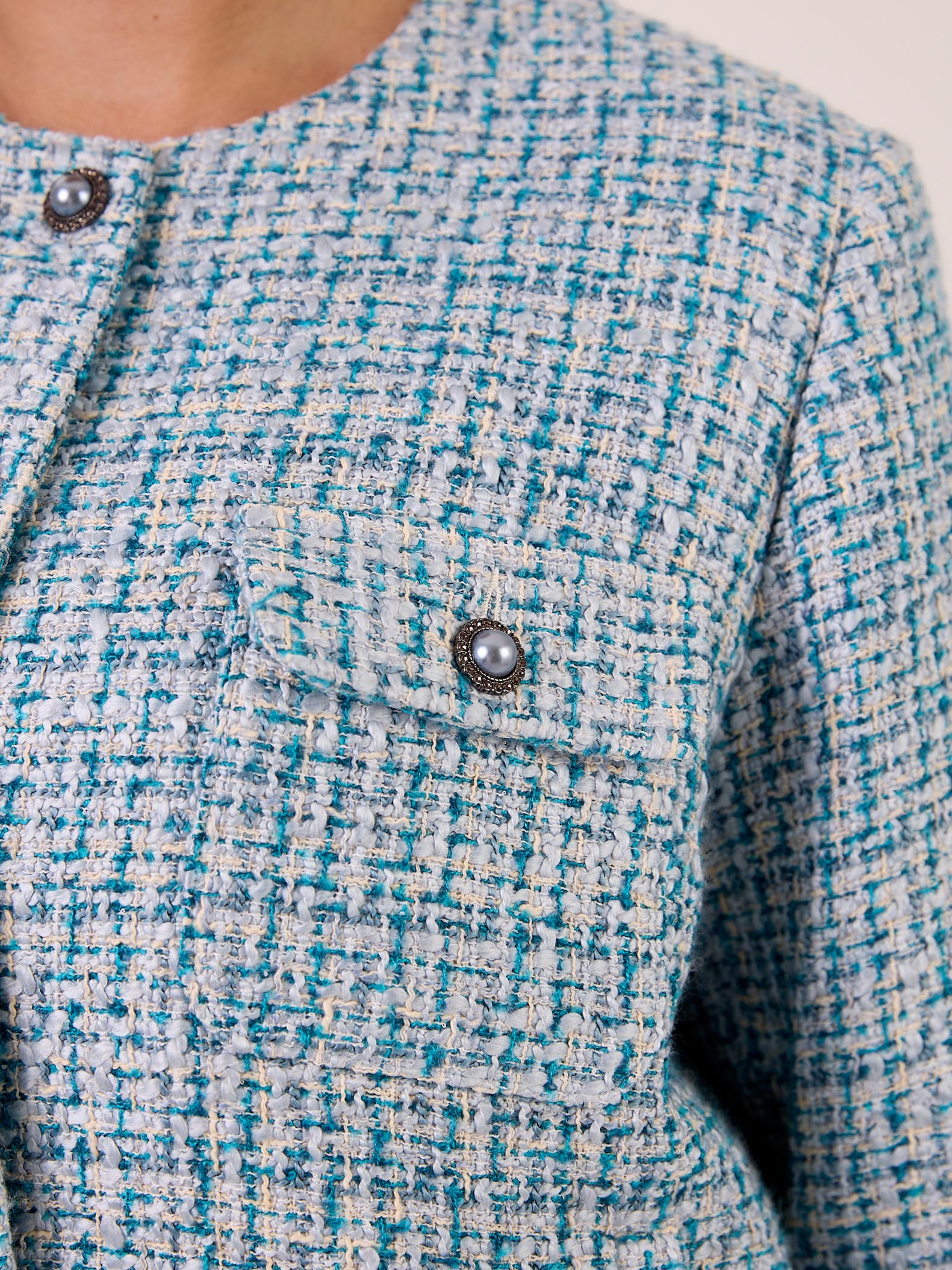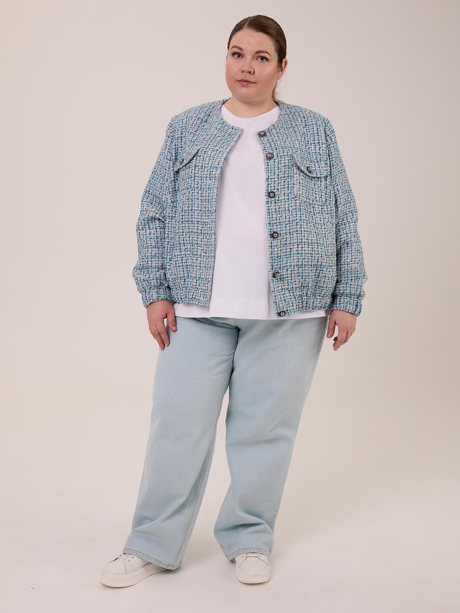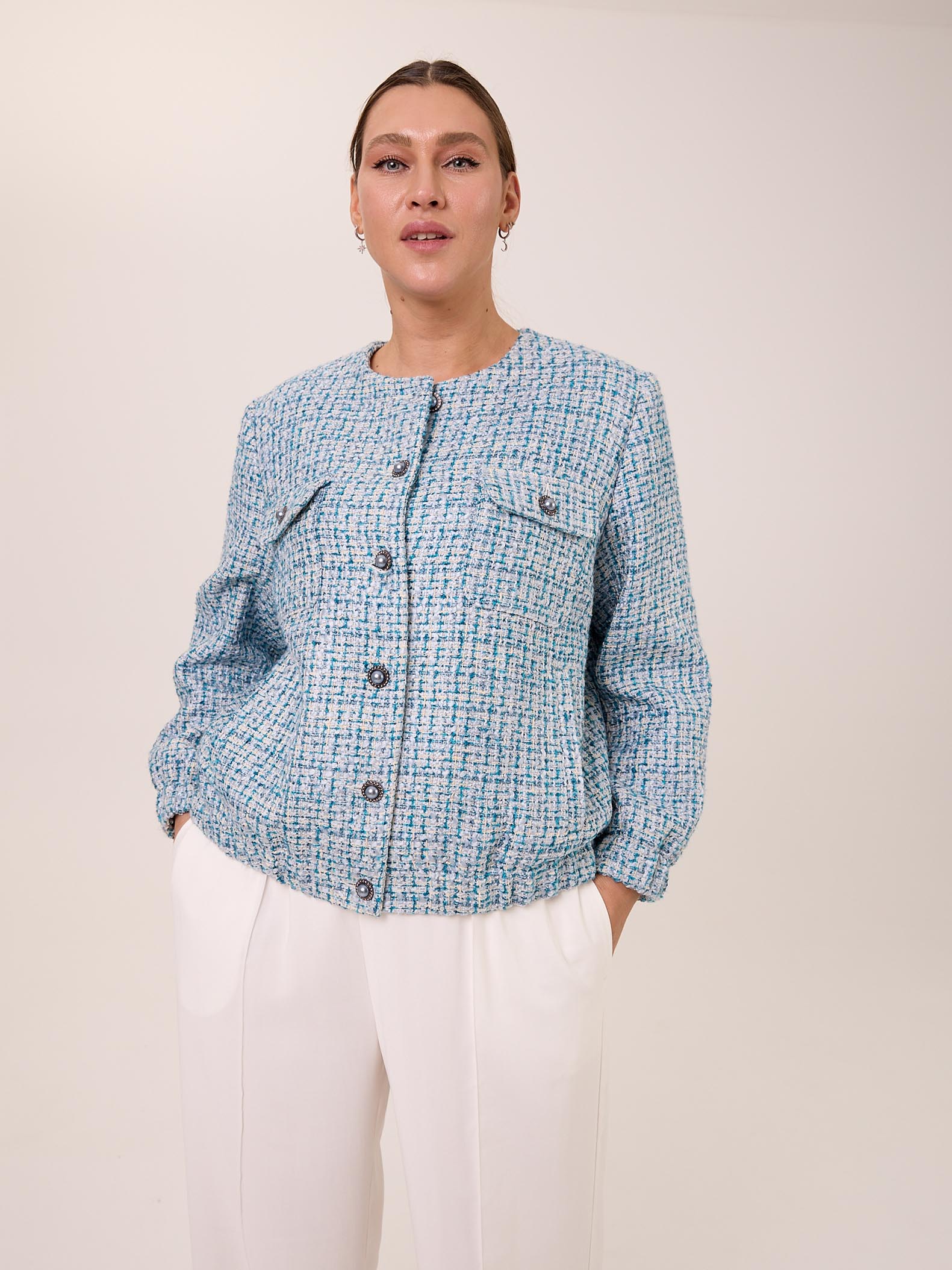 Жакет типа «бомбер» с круглой горловиной без воротника. Рукава втачные, внизу на резинке. Нагрудные карманы накладные с клапанами. Боковые карманы прорезные с листочками. По низу изделия выполнен пояс с эластичной тесьмой внутри. Жакет застегивается на декоративные пуговицы и петли. Выполнен из костюмного твида в голубом цвете.