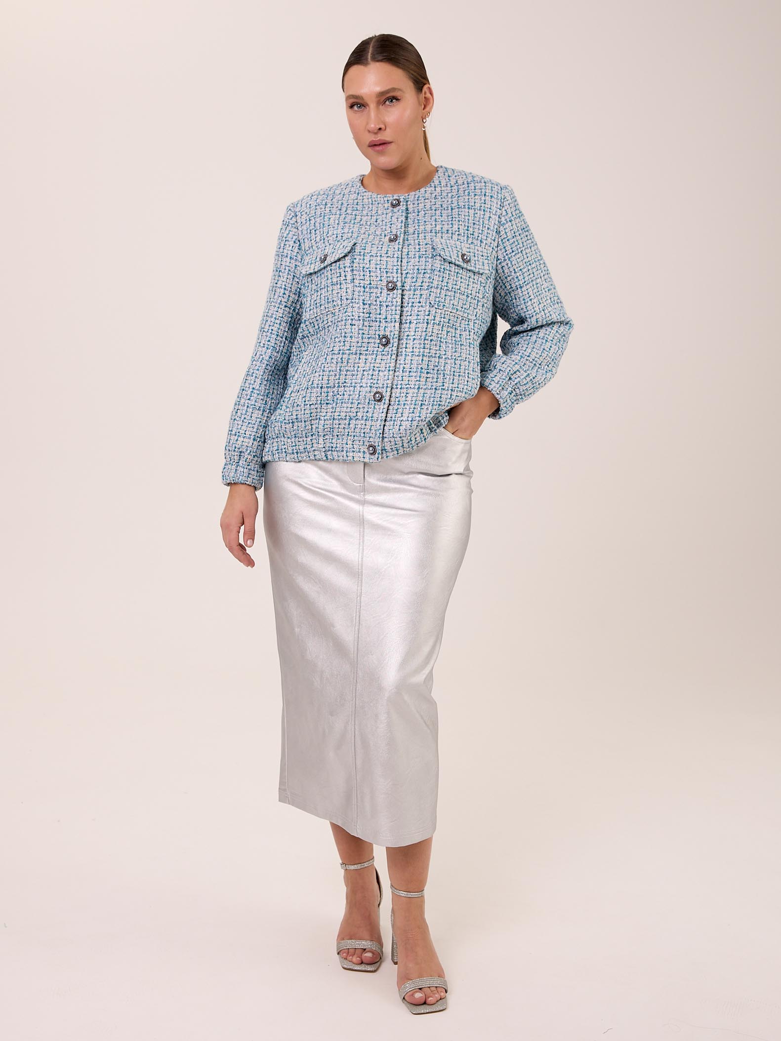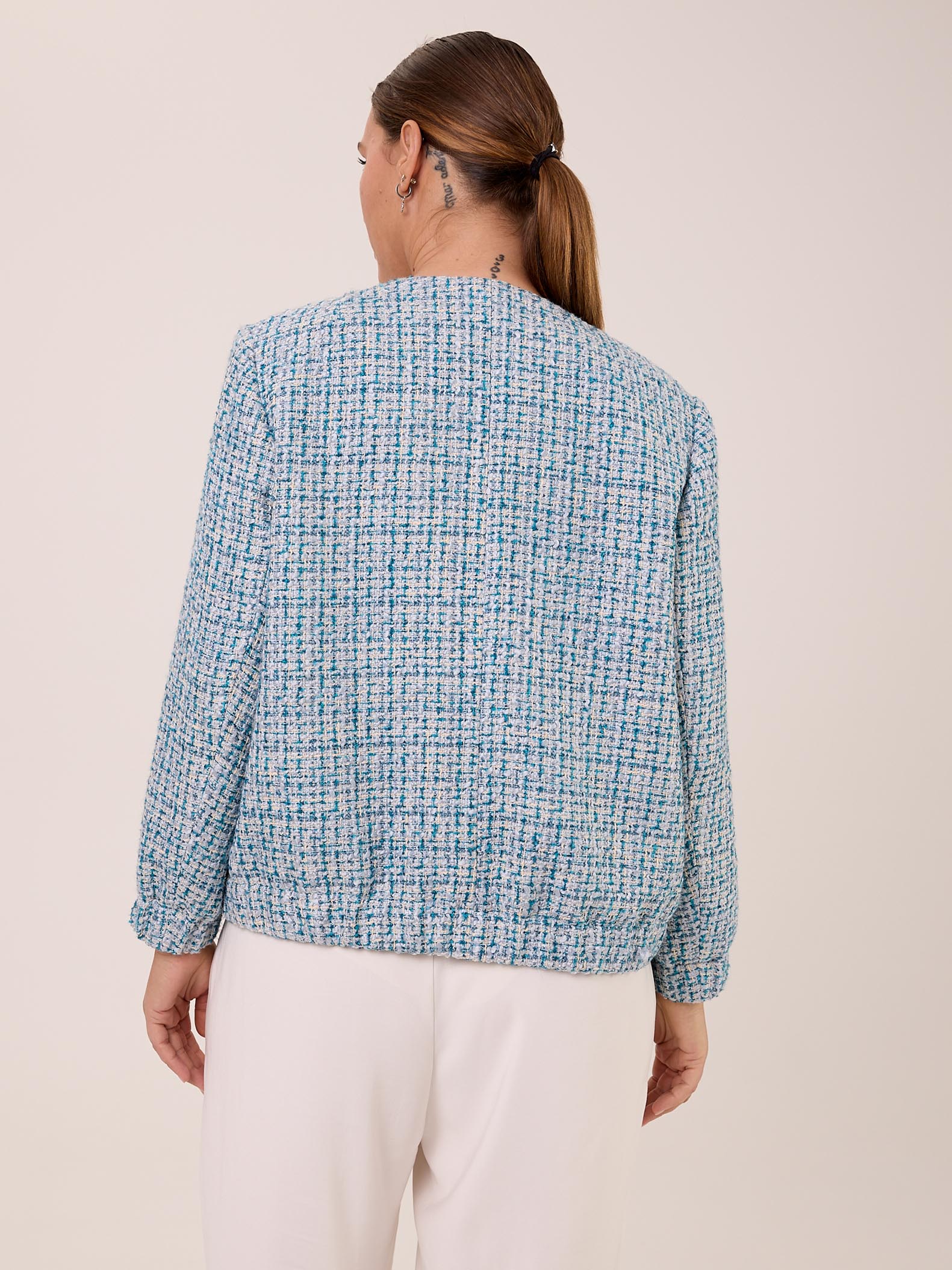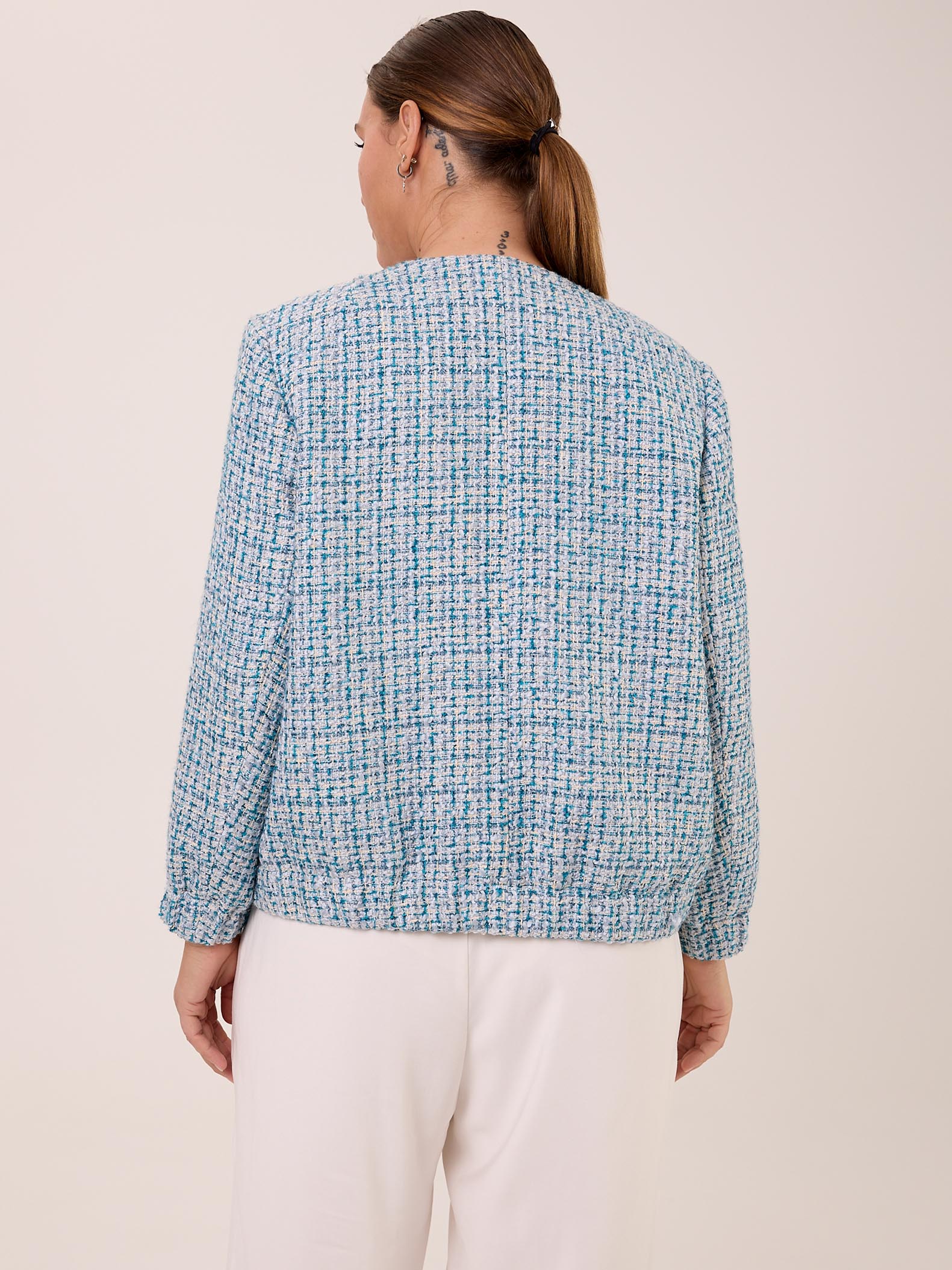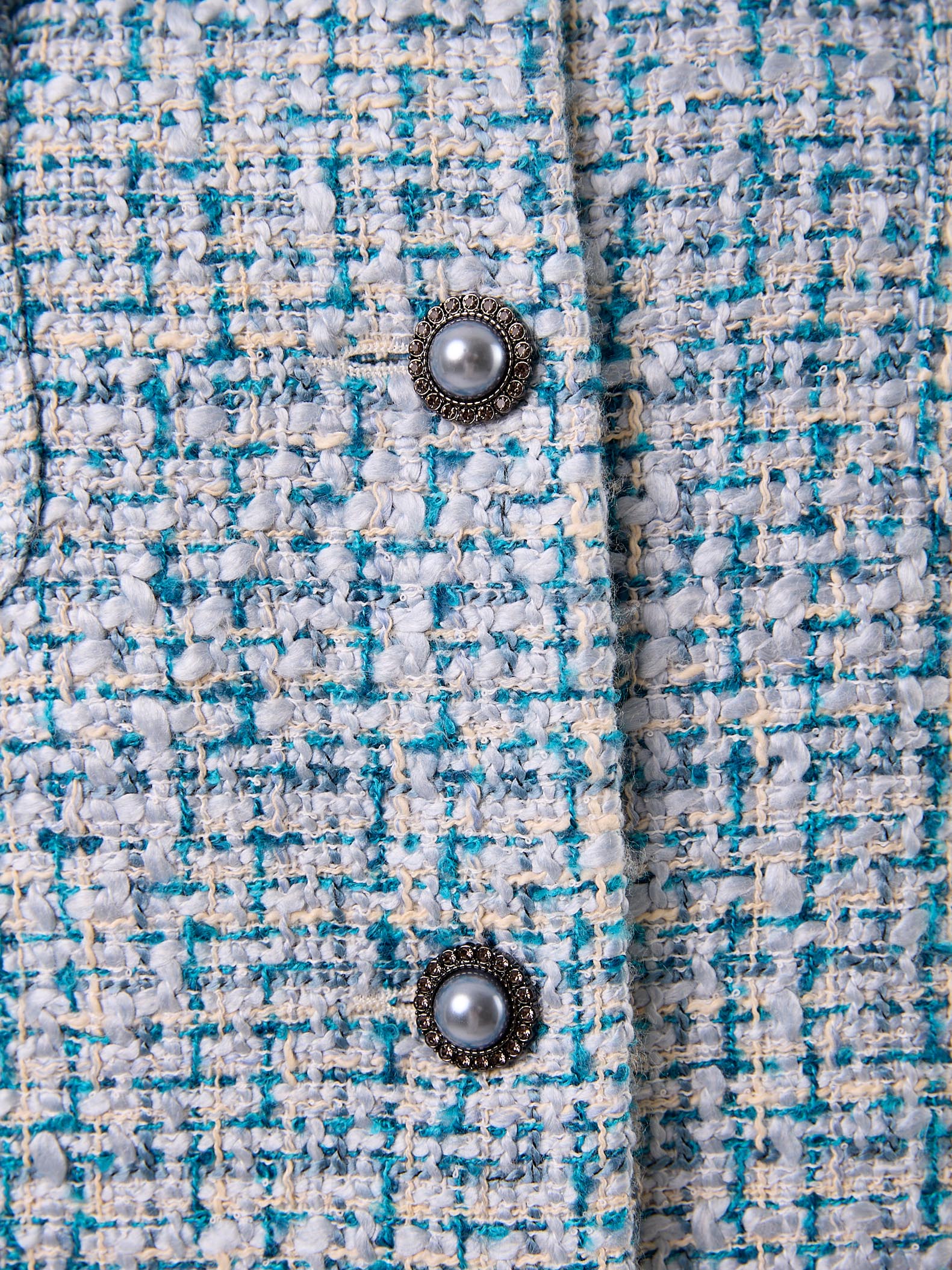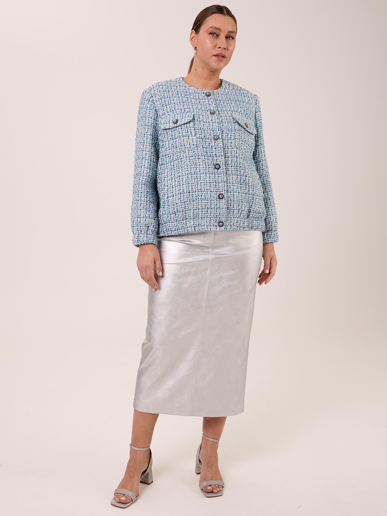 Жакет типа «бомбер» с круглой горловиной без воротника. Рукава втачные, внизу на резинке. Нагрудные карманы накладные с клапанами. Боковые карманы прорезные с листочками. По низу изделия выполнен пояс с эластичной тесьмой внутри. Жакет застегивается на декоративные пуговицы и петли. Выполнен из костюмного твида в голубом цвете.