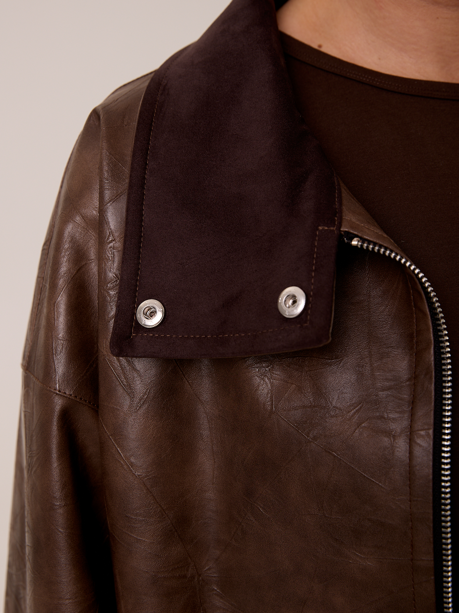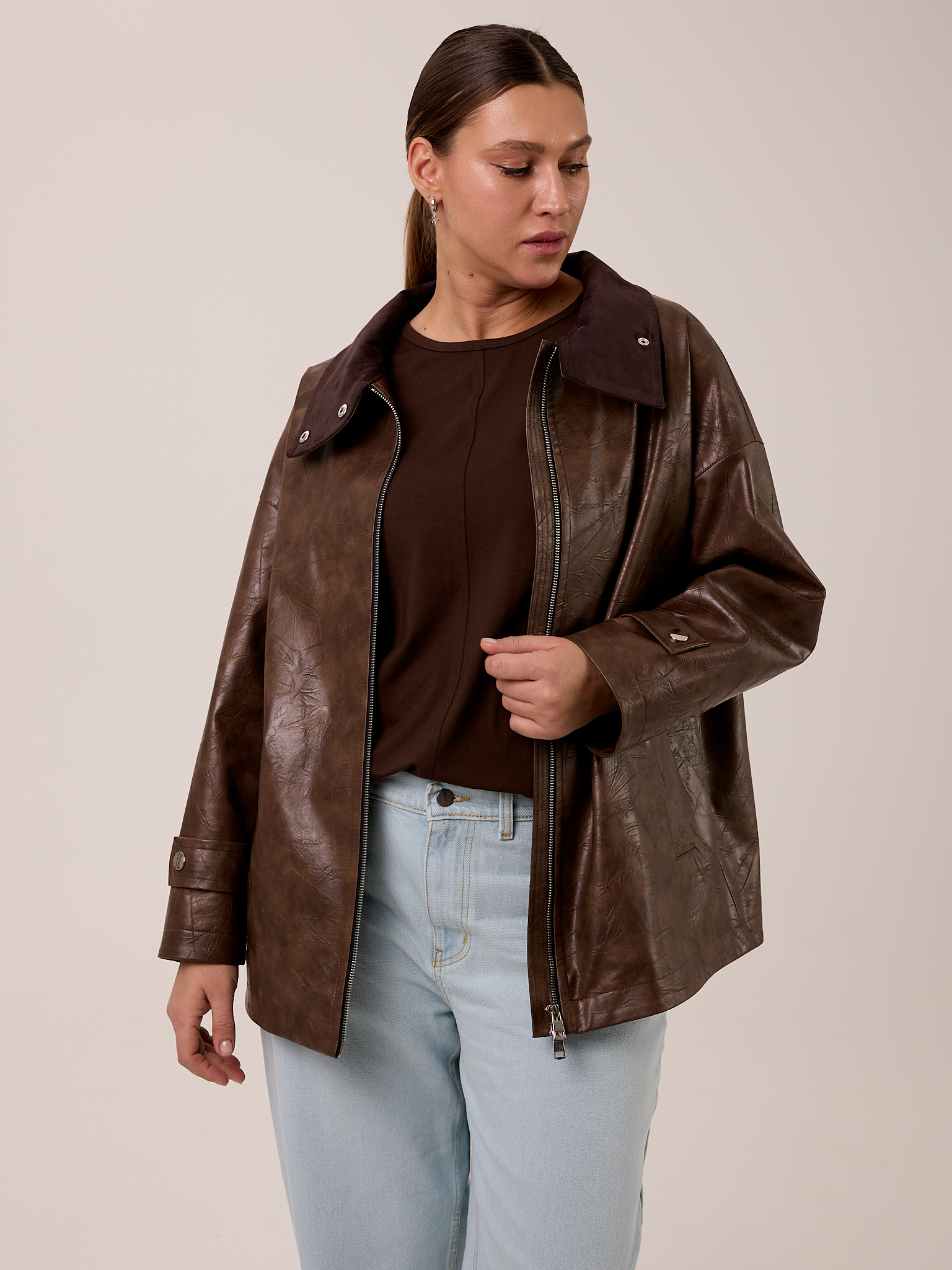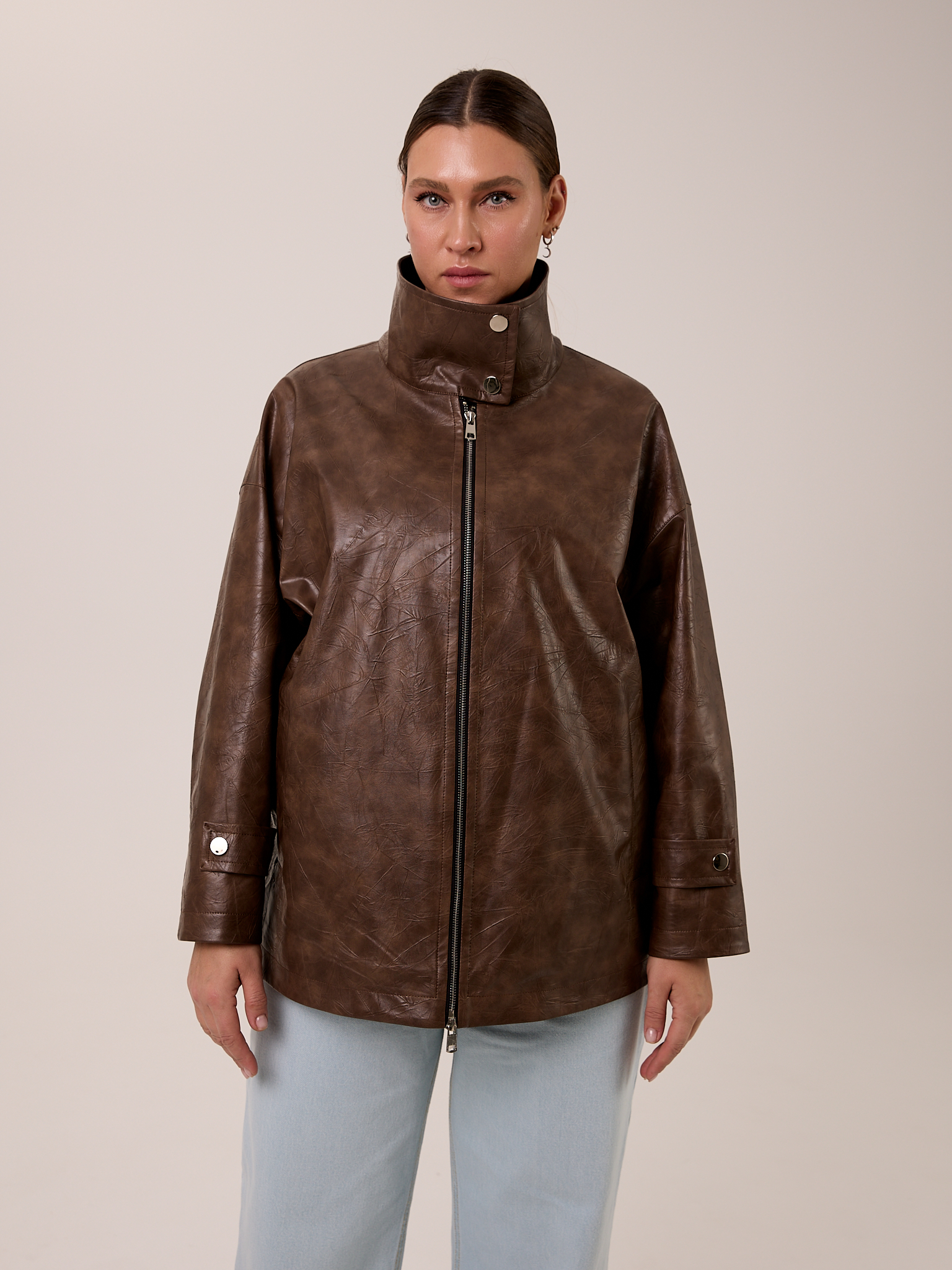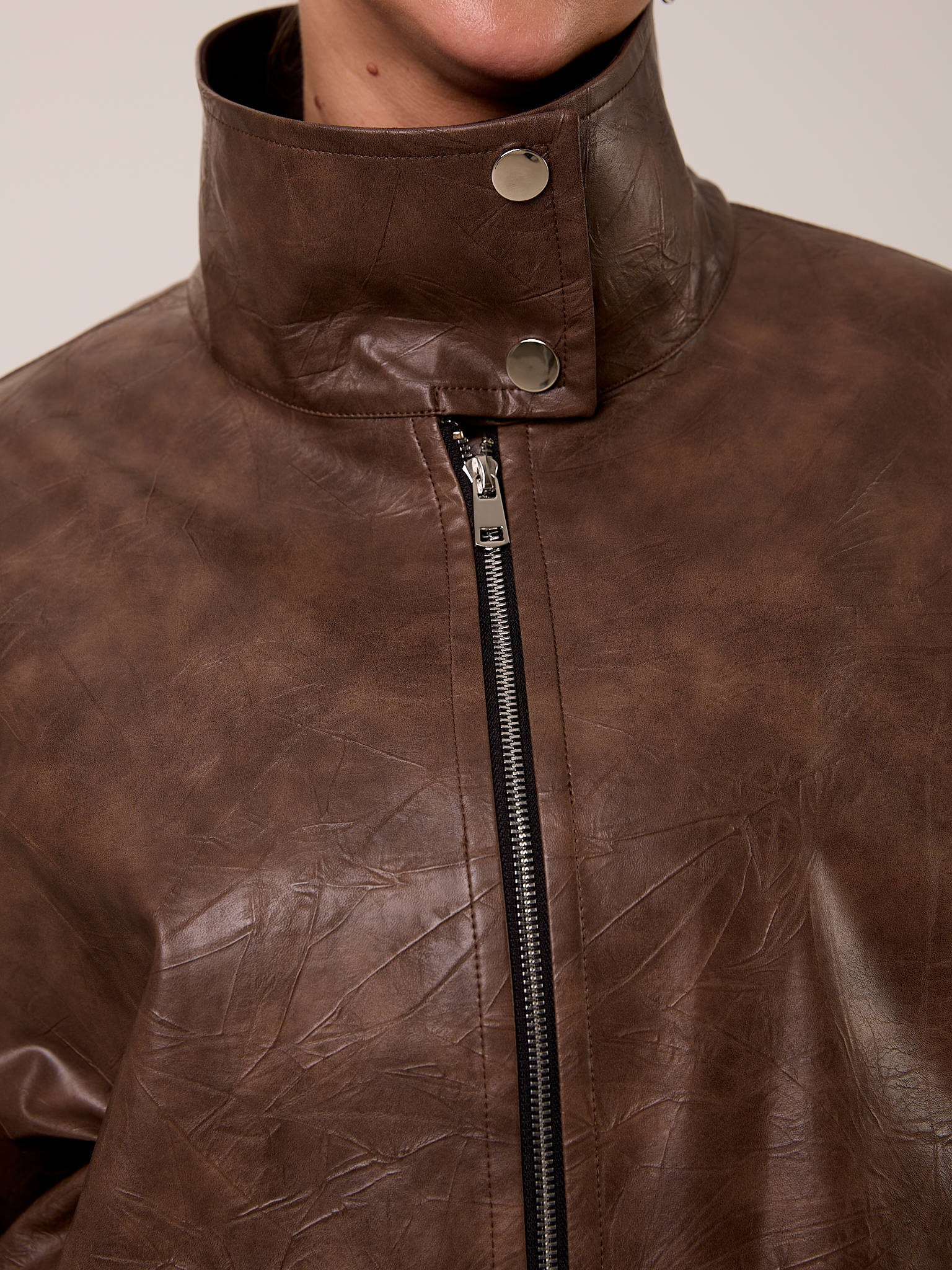 Куртка типа «бомбер», объемная, со спущенным плечевым поясом. Воротник- высокая стойка с отделкой из замши, застегивается на кнопки. Рукава широкие с патами внизу. Боковые карманы с листочками. Куртка застегивается на металлическую молнию. Изделие выполнено из искусственной кожи с утепленной подкладкой термофин 60гр/м2.